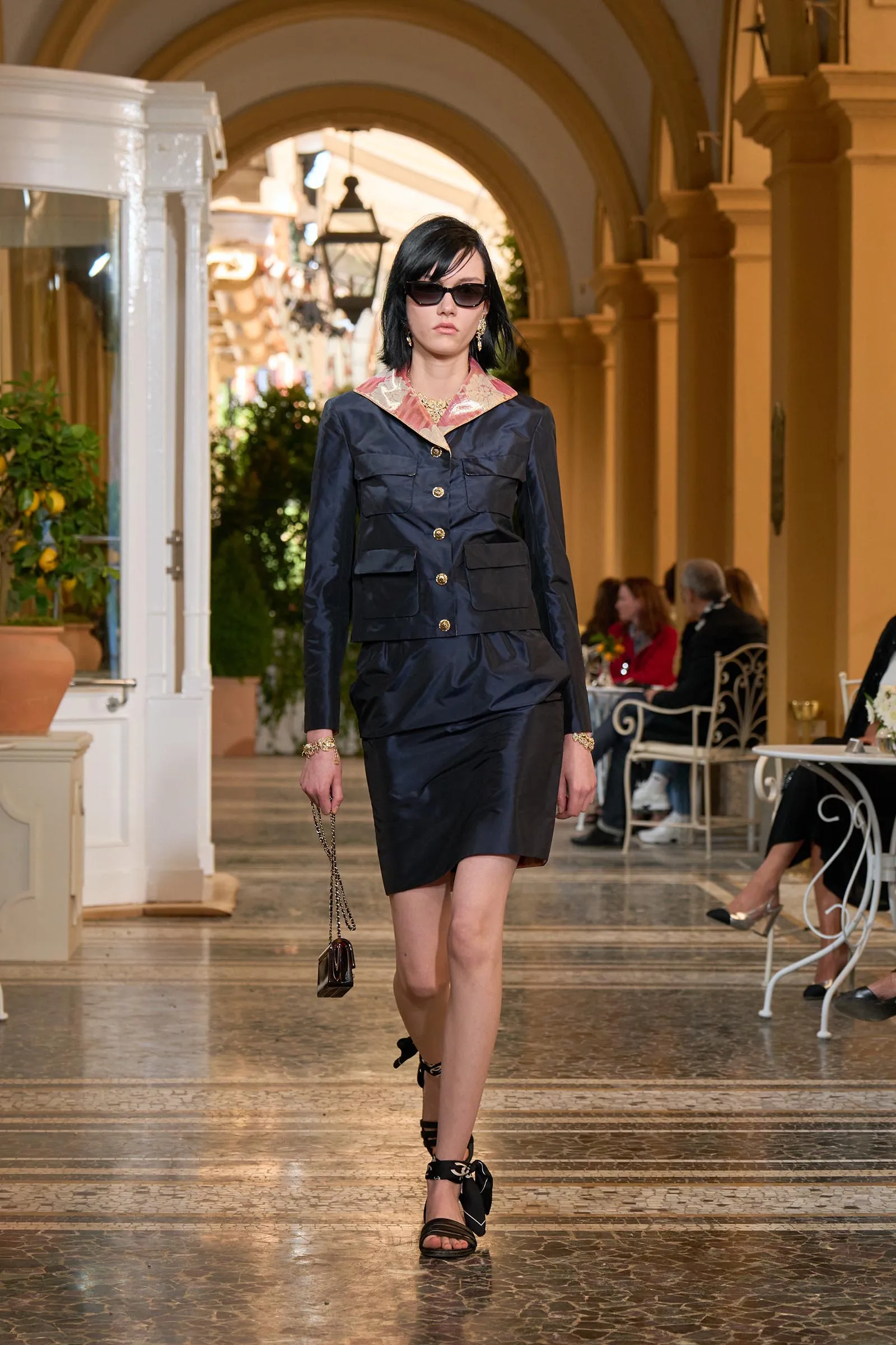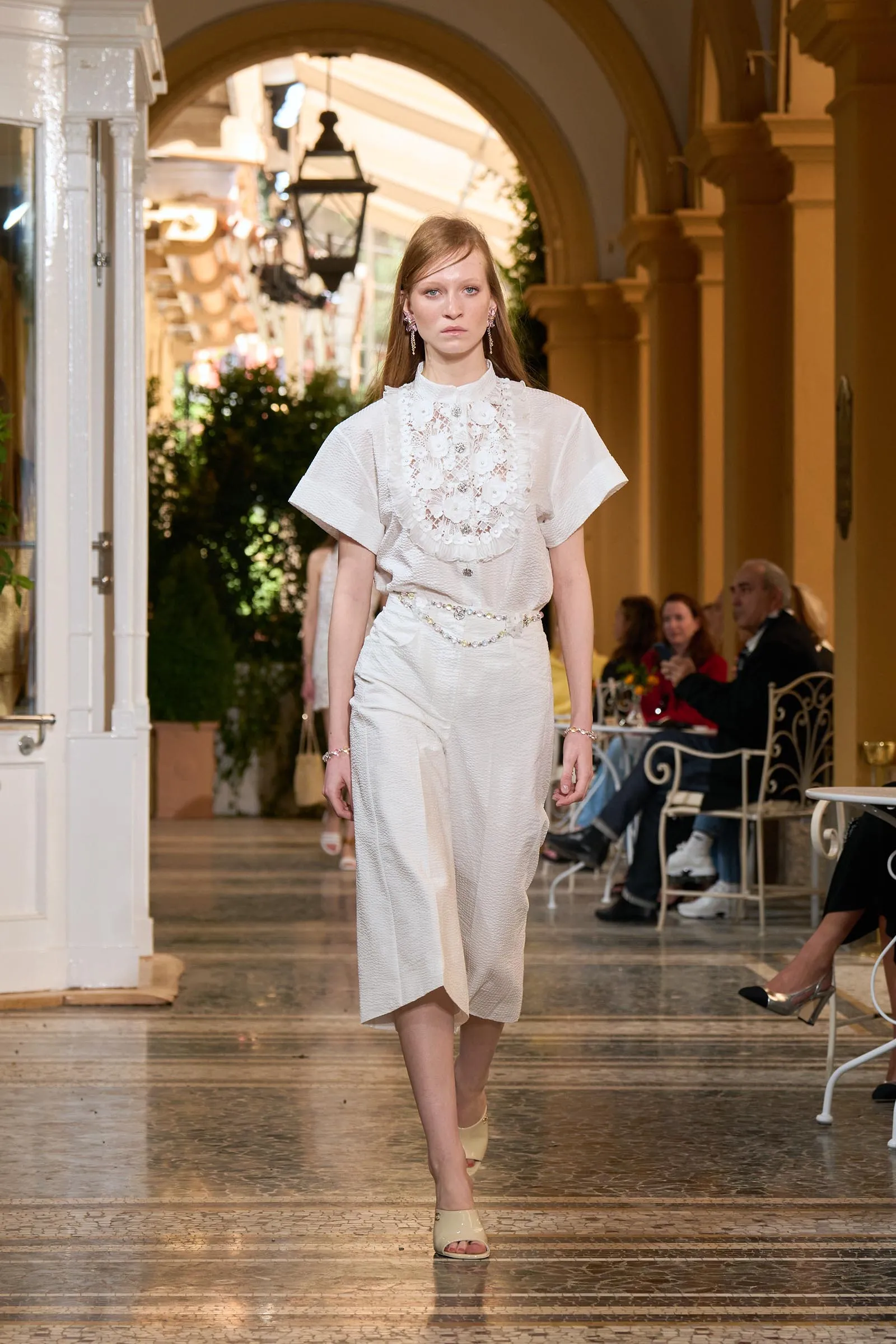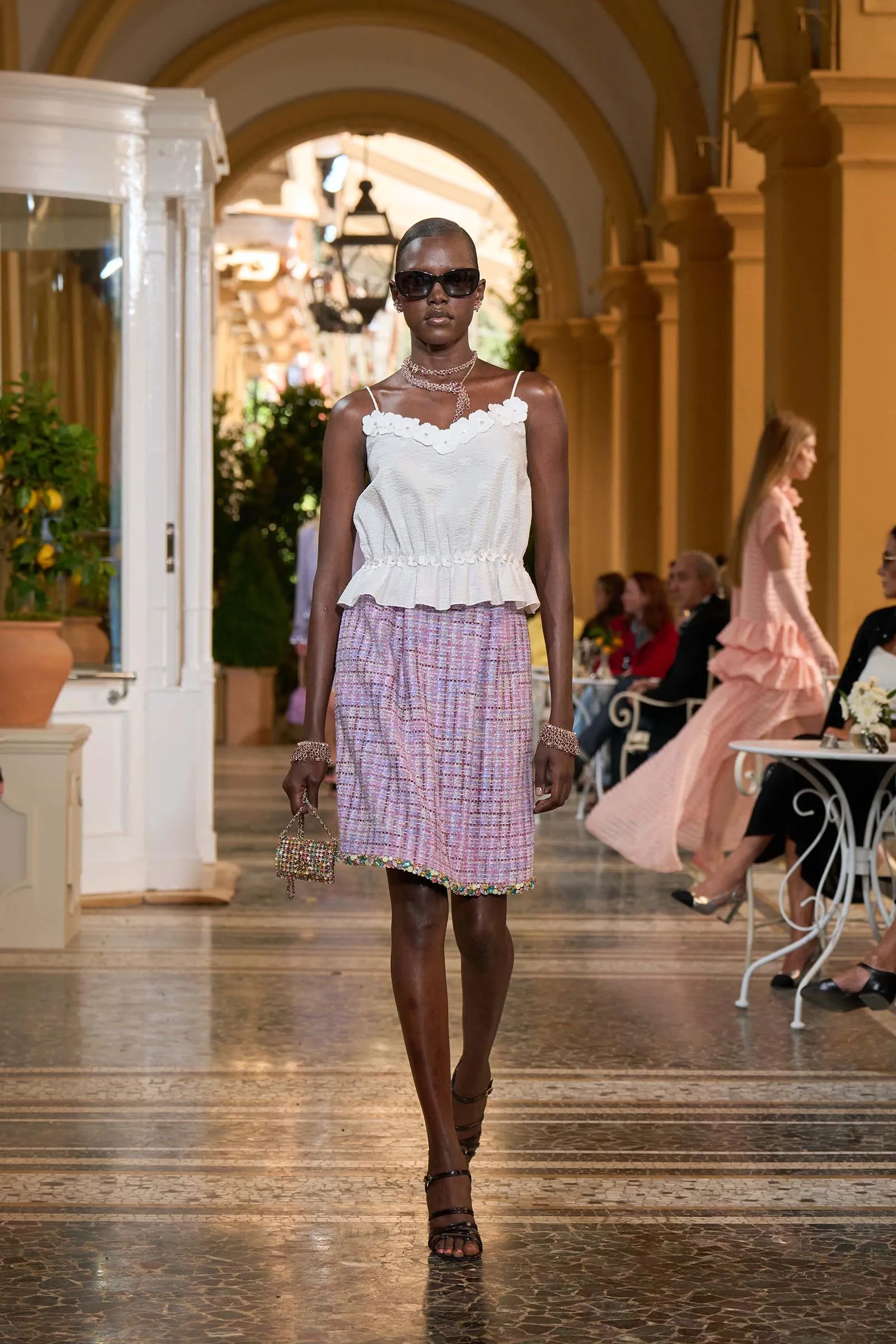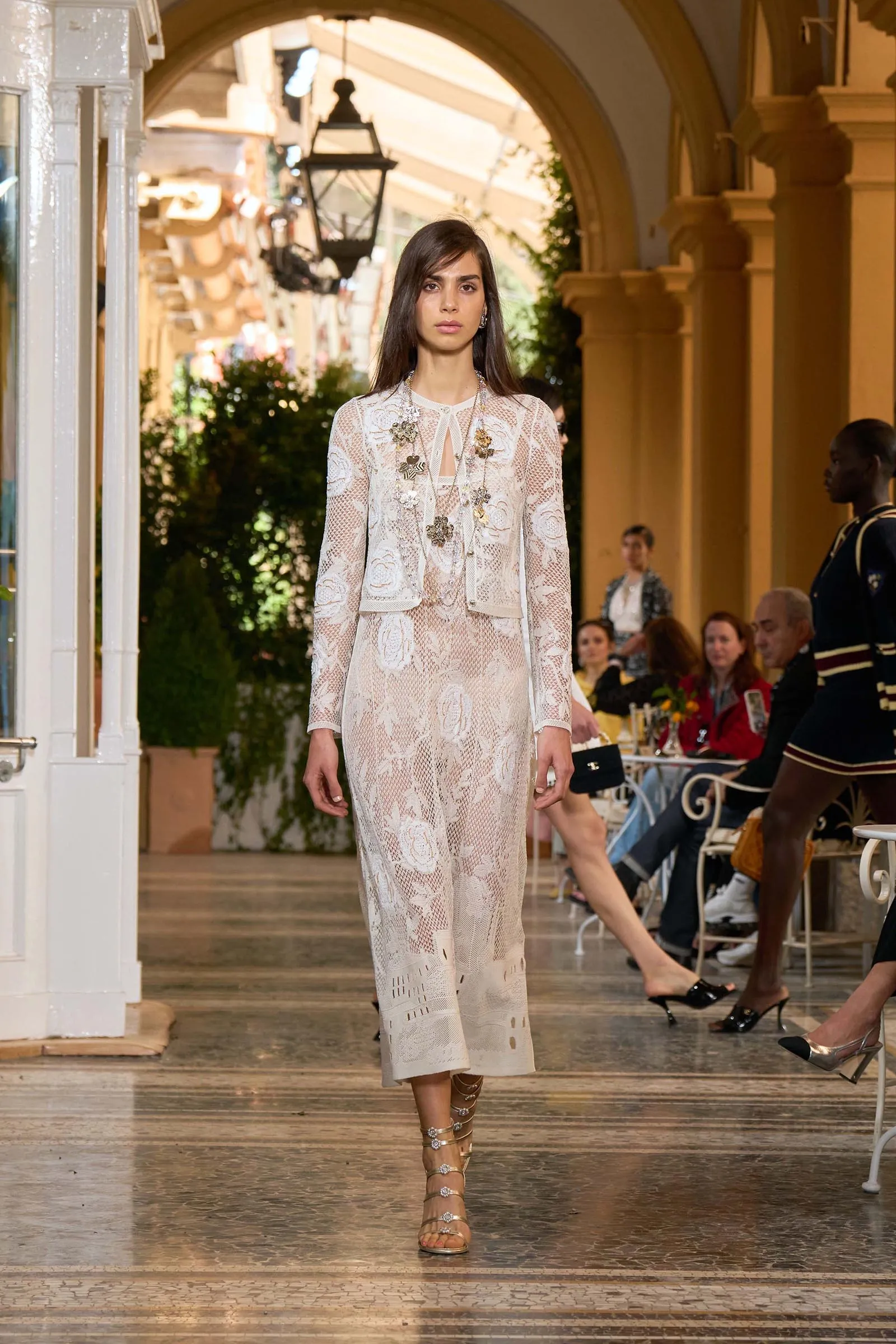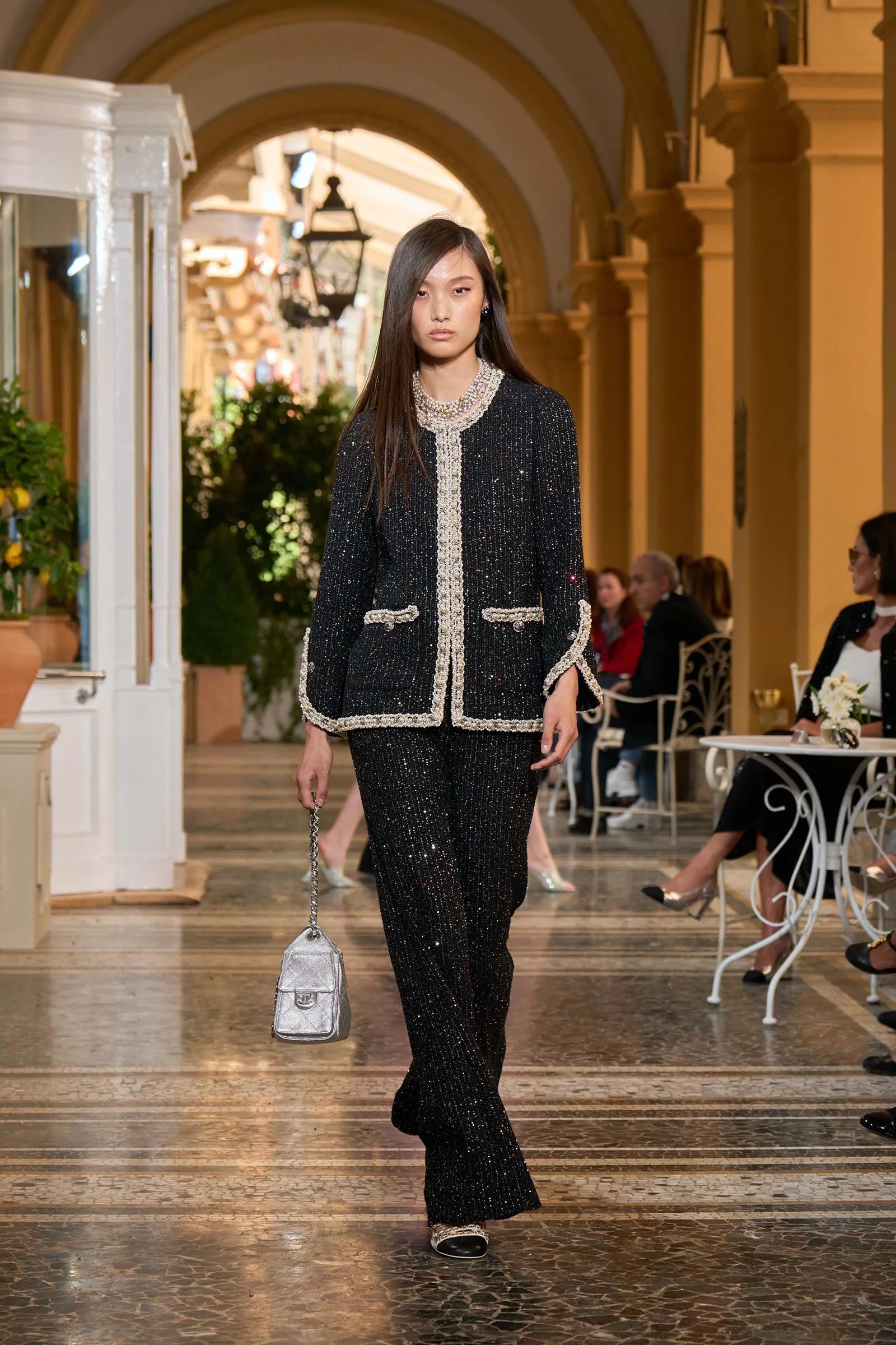 Framed by two white ensembles—a peignoir-style robe manteau ready for the beach and a sinuous evening gown in liquid satin—the lineup centered on imaginative daywear. A sun-washed palette evoked the terracotta hues of Villa D’Este’s walls and the soft pastels of wisteria festooning its spectacular gardens, with added dashes of bougainvillea and camellia. Shimmer flashed on a fluid pajama set rendered in matte-gold cloqué and in a daring backless jumpsuit of pink and orange striped lamé, layered under an entrance-making matching cape. Sequined trimmings added pizzazz to a classic lilac tweed suit, shown over a blouse with a paillette volant, while macramé, crochet, and intricate lace brought textured depth to short, svelte silhouettes of the kind Romy Schneider, dressed by Chanel in Visconti’s episode of Boccaccio ’70, once wore. The finale’s black evening gowns in rustling taffeta radiated a rather dramatic, sultry glow.