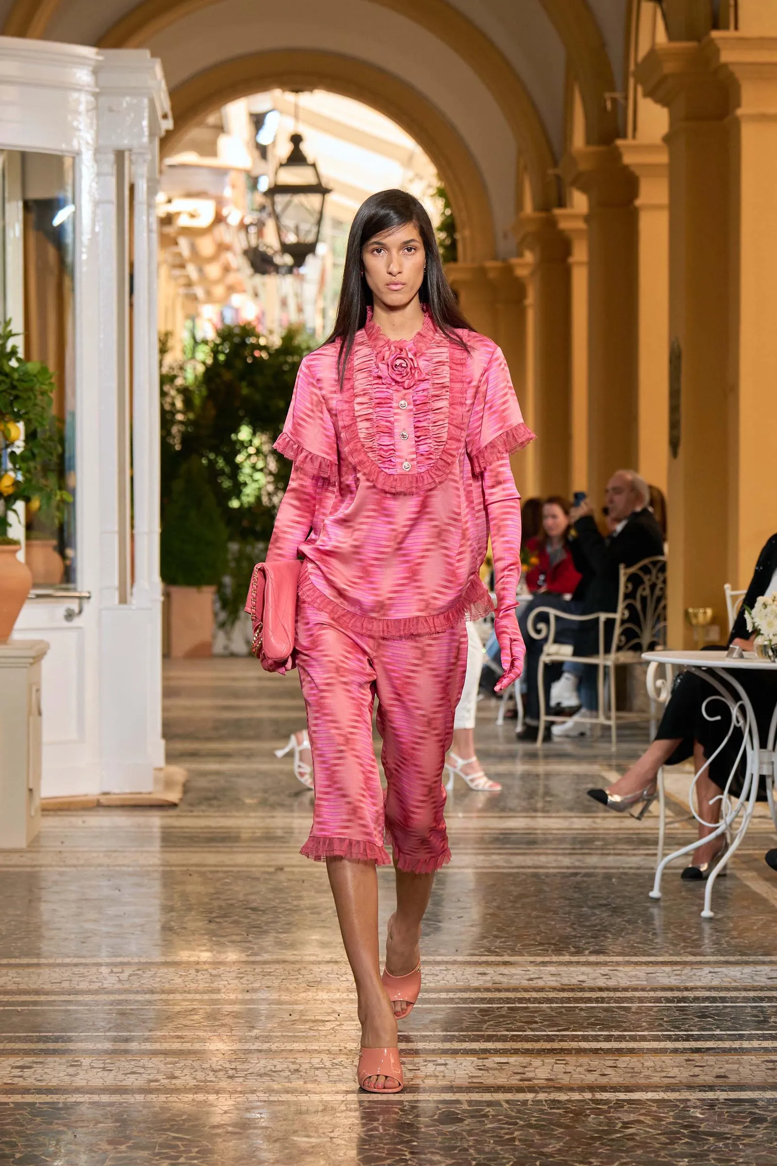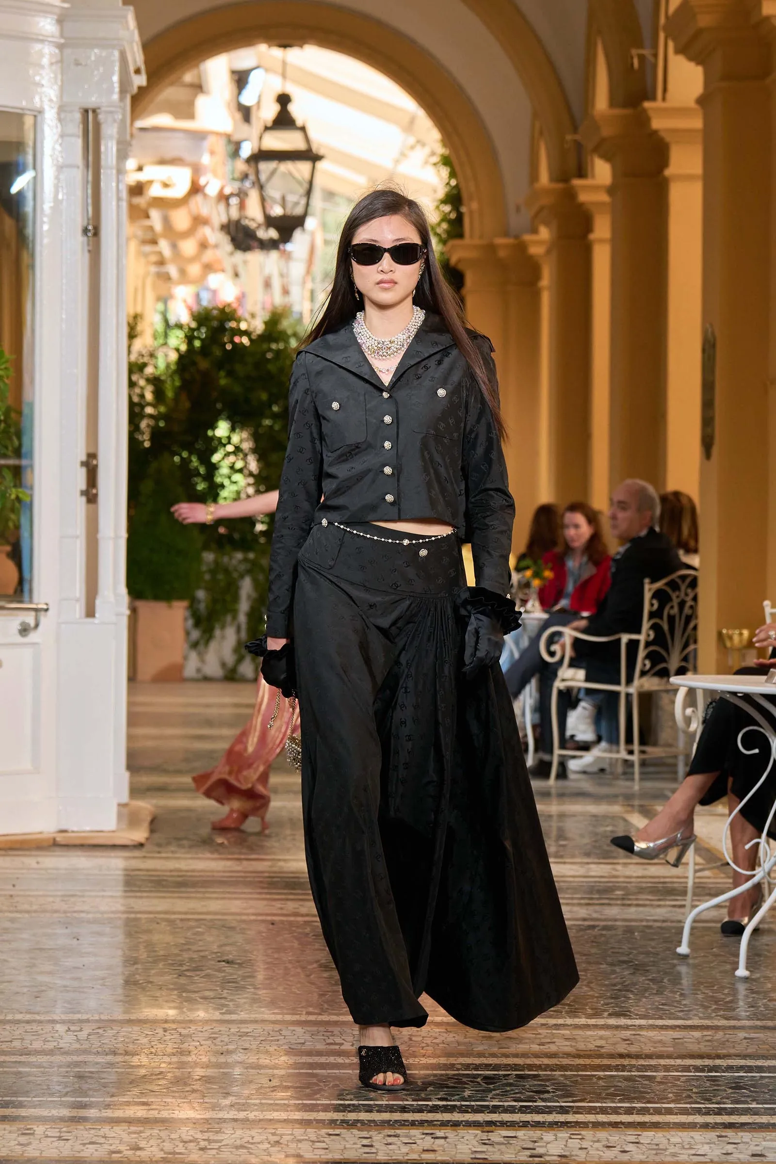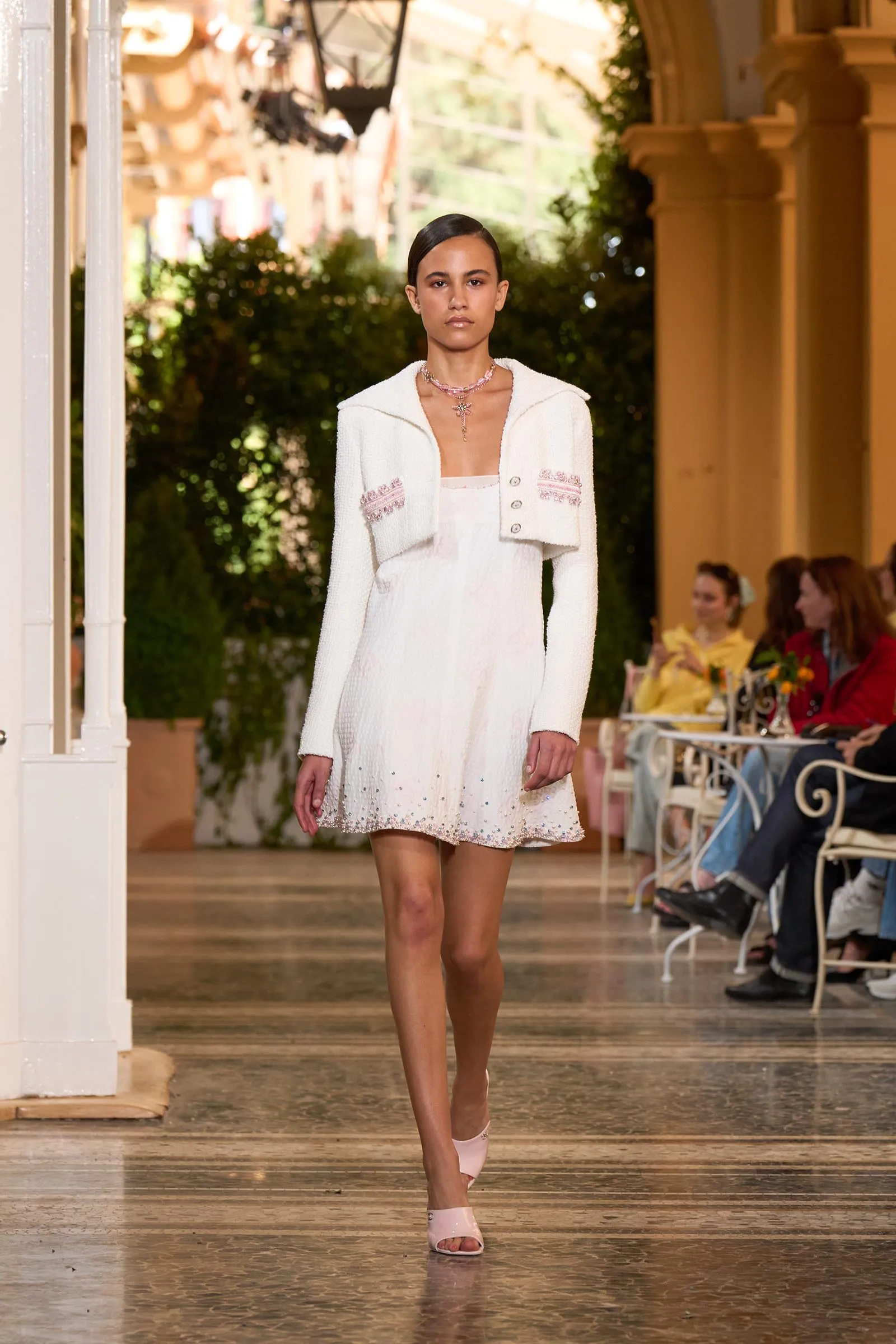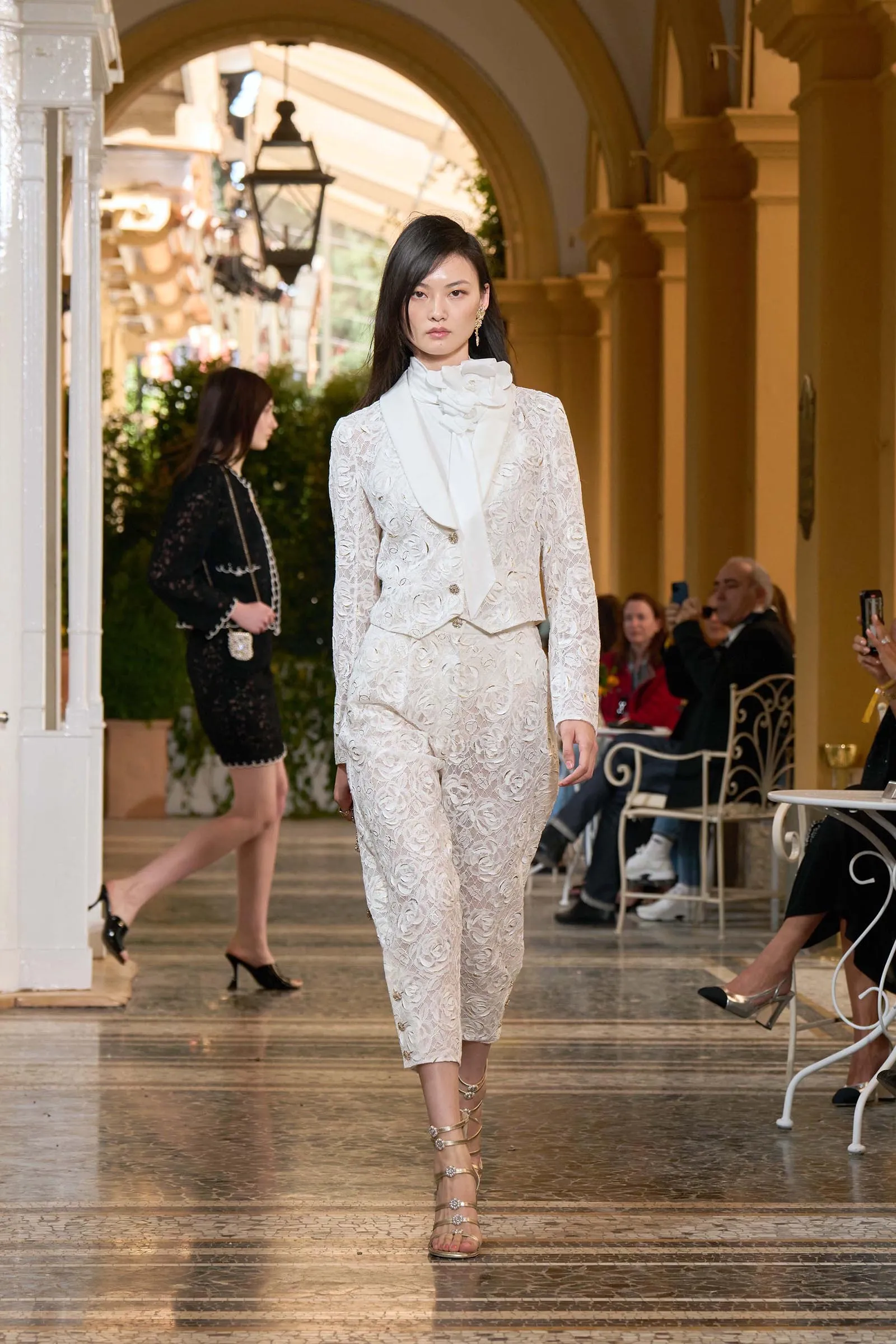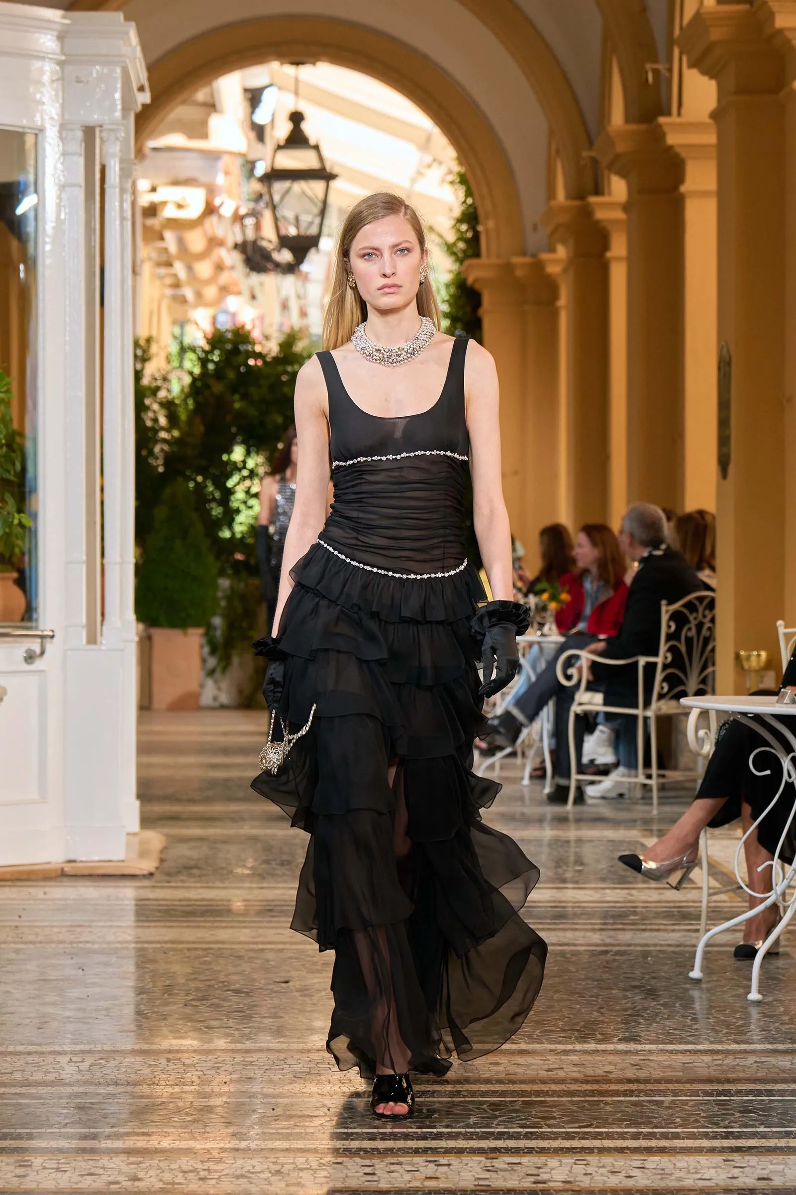 Framed by two white ensembles—a peignoir-style robe manteau ready for the beach and a sinuous evening gown in liquid satin—the lineup centered on imaginative daywear. A sun-washed palette evoked the terracotta hues of Villa D’Este’s walls and the soft pastels of wisteria festooning its spectacular gardens, with added dashes of bougainvillea and camellia. Shimmer flashed on a fluid pajama set rendered in matte-gold cloqué and in a daring backless jumpsuit of pink and orange striped lamé, layered under an entrance-making matching cape. Sequined trimmings added pizzazz to a classic lilac tweed suit, shown over a blouse with a paillette volant, while macramé, crochet, and intricate lace brought textured depth to short, svelte silhouettes of the kind Romy Schneider, dressed by Chanel in Visconti’s episode of Boccaccio ’70, once wore. The finale’s black evening gowns in rustling taffeta radiated a rather dramatic, sultry glow.