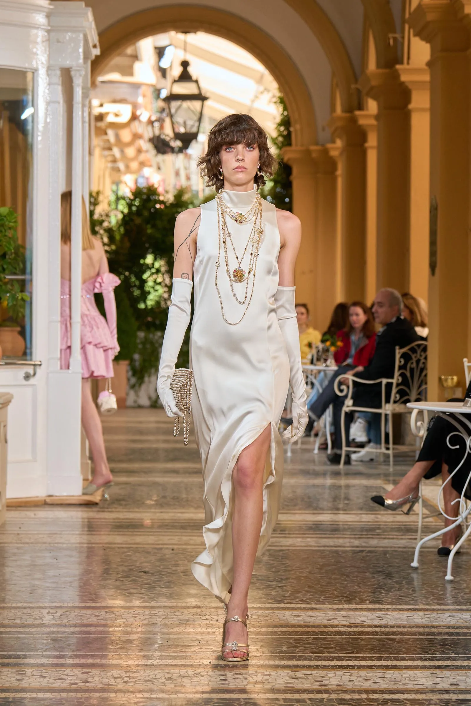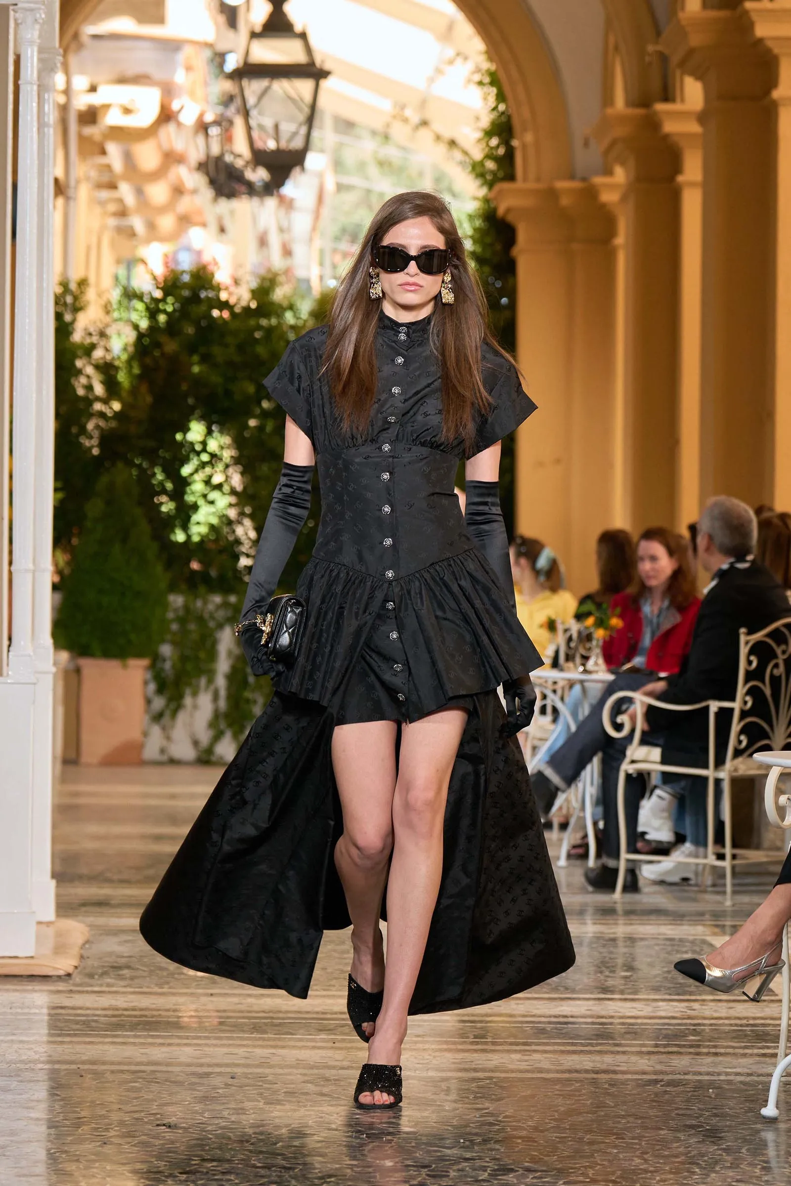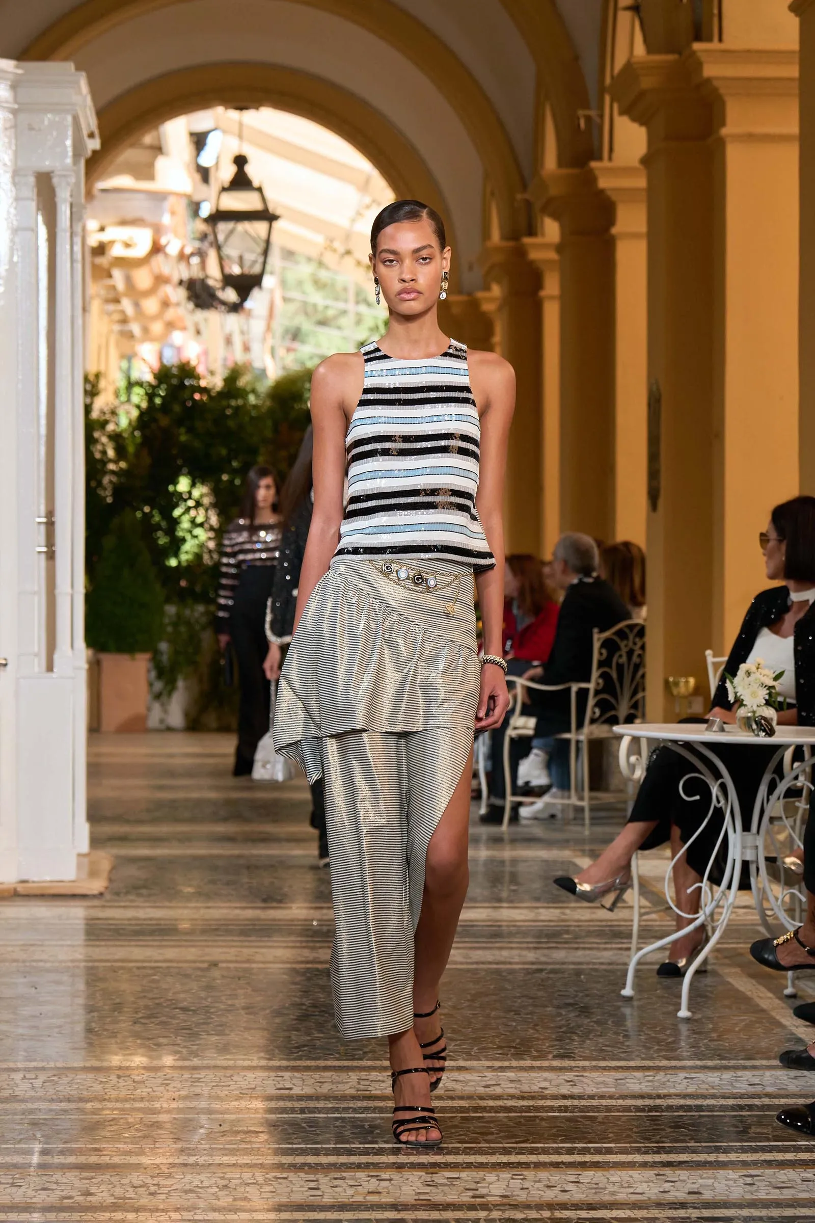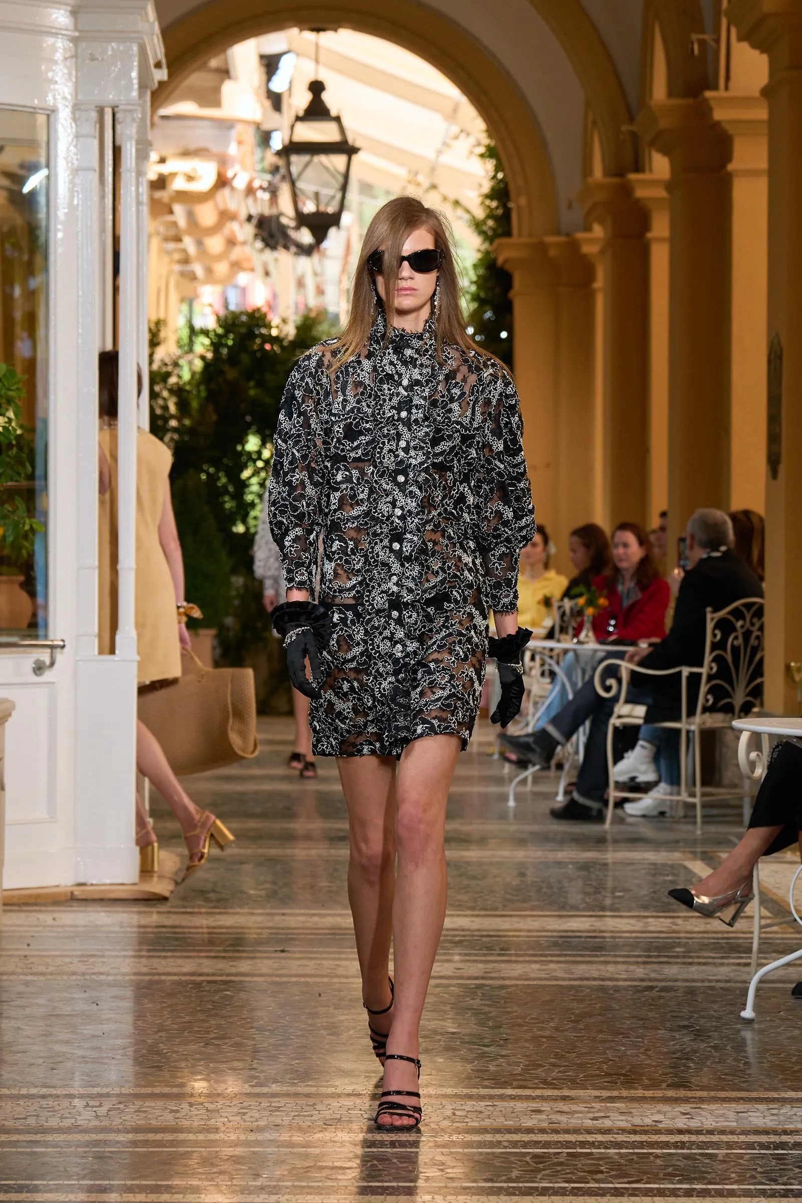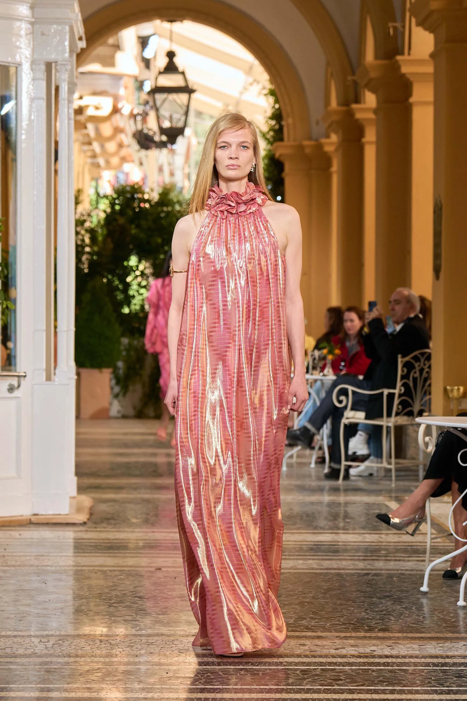 Framed by two white ensembles—a peignoir-style robe manteau ready for the beach and a sinuous evening gown in liquid satin—the lineup centered on imaginative daywear. A sun-washed palette evoked the terracotta hues of Villa D’Este’s walls and the soft pastels of wisteria festooning its spectacular gardens, with added dashes of bougainvillea and camellia. Shimmer flashed on a fluid pajama set rendered in matte-gold cloqué and in a daring backless jumpsuit of pink and orange striped lamé, layered under an entrance-making matching cape. Sequined trimmings added pizzazz to a classic lilac tweed suit, shown over a blouse with a paillette volant, while macramé, crochet, and intricate lace brought textured depth to short, svelte silhouettes of the kind Romy Schneider, dressed by Chanel in Visconti’s episode of Boccaccio ’70, once wore. The finale’s black evening gowns in rustling taffeta radiated a rather dramatic, sultry glow.