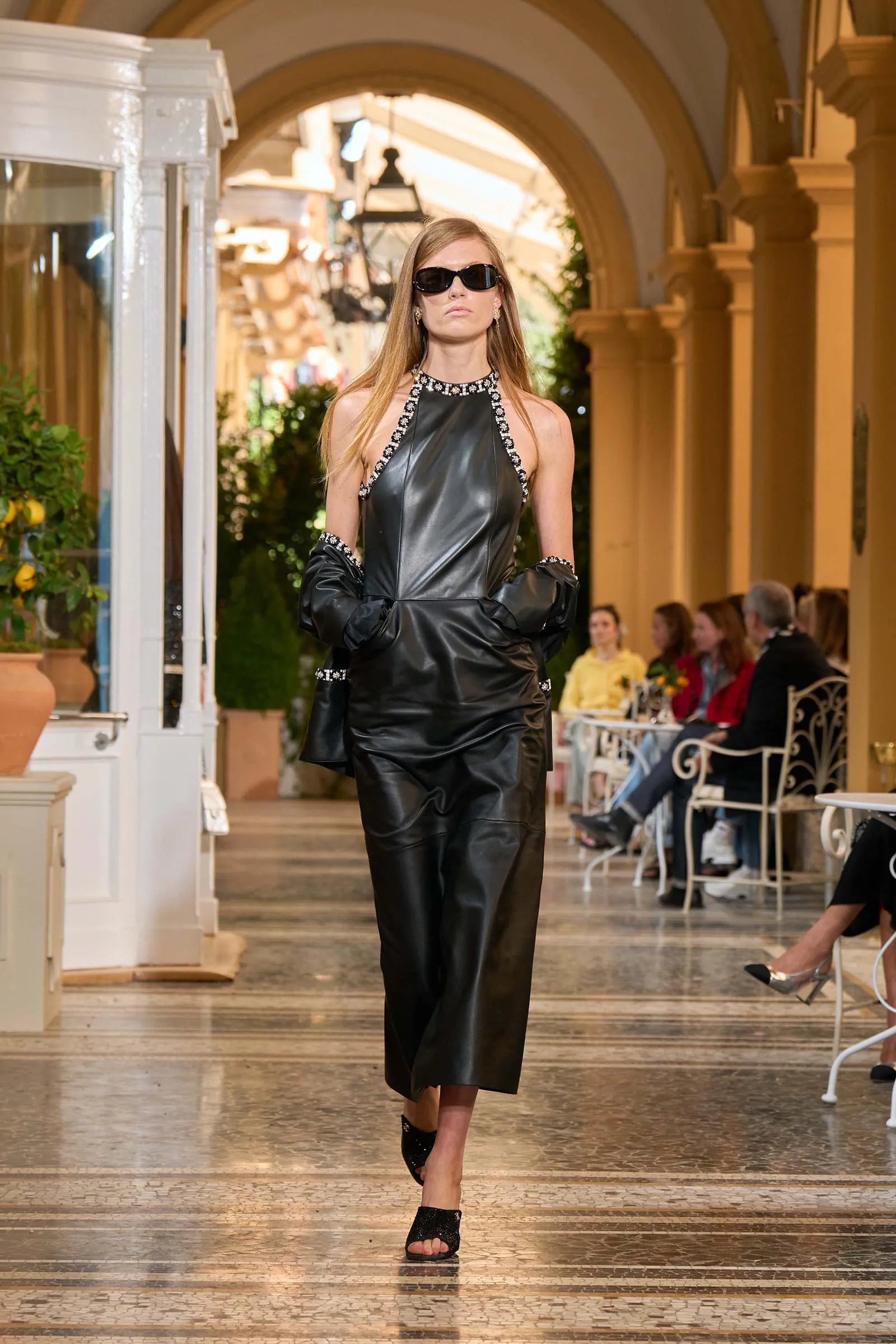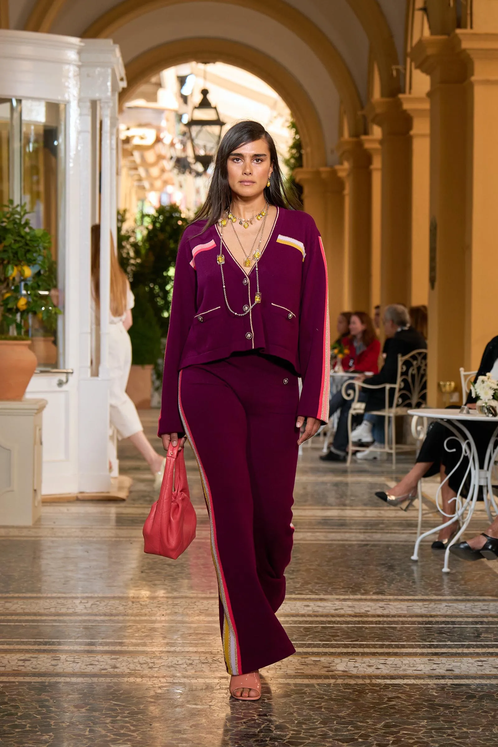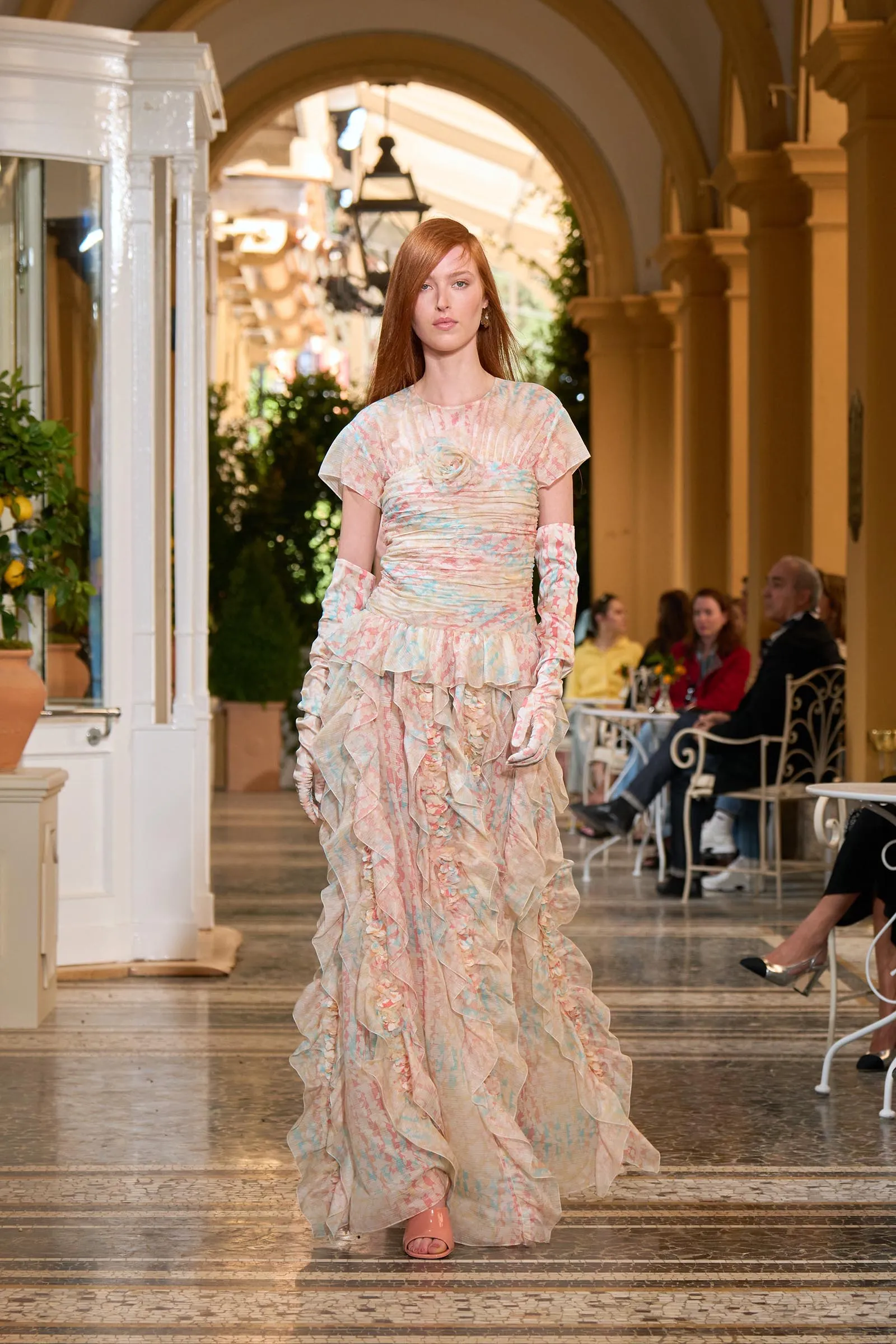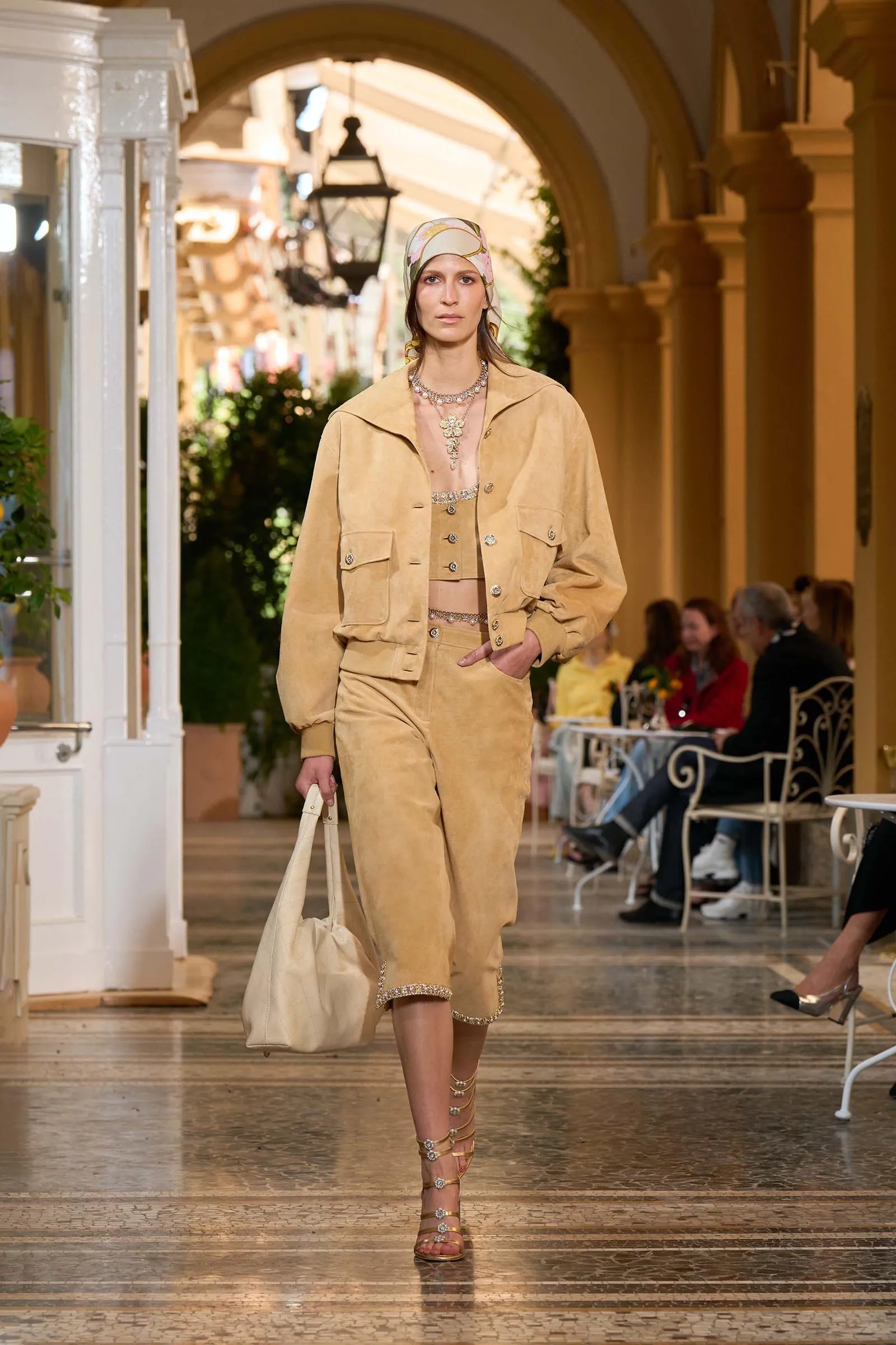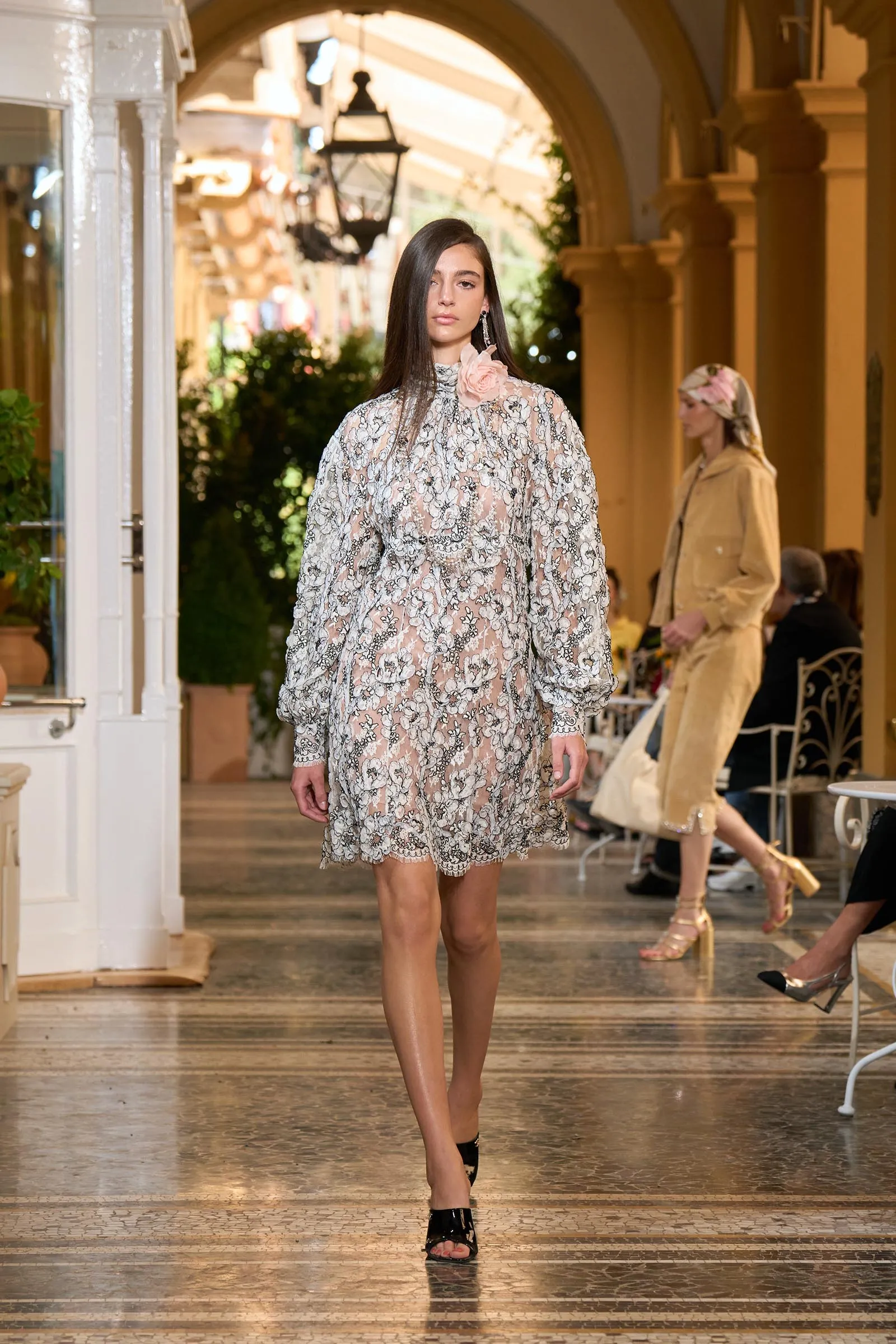 Framed by two white ensembles—a peignoir-style robe manteau ready for the beach and a sinuous evening gown in liquid satin—the lineup centered on imaginative daywear. A sun-washed palette evoked the terracotta hues of Villa D’Este’s walls and the soft pastels of wisteria festooning its spectacular gardens, with added dashes of bougainvillea and camellia. Shimmer flashed on a fluid pajama set rendered in matte-gold cloqué and in a daring backless jumpsuit of pink and orange striped lamé, layered under an entrance-making matching cape. Sequined trimmings added pizzazz to a classic lilac tweed suit, shown over a blouse with a paillette volant, while macramé, crochet, and intricate lace brought textured depth to short, svelte silhouettes of the kind Romy Schneider, dressed by Chanel in Visconti’s episode of Boccaccio ’70, once wore. The finale’s black evening gowns in rustling taffeta radiated a rather dramatic, sultry glow.