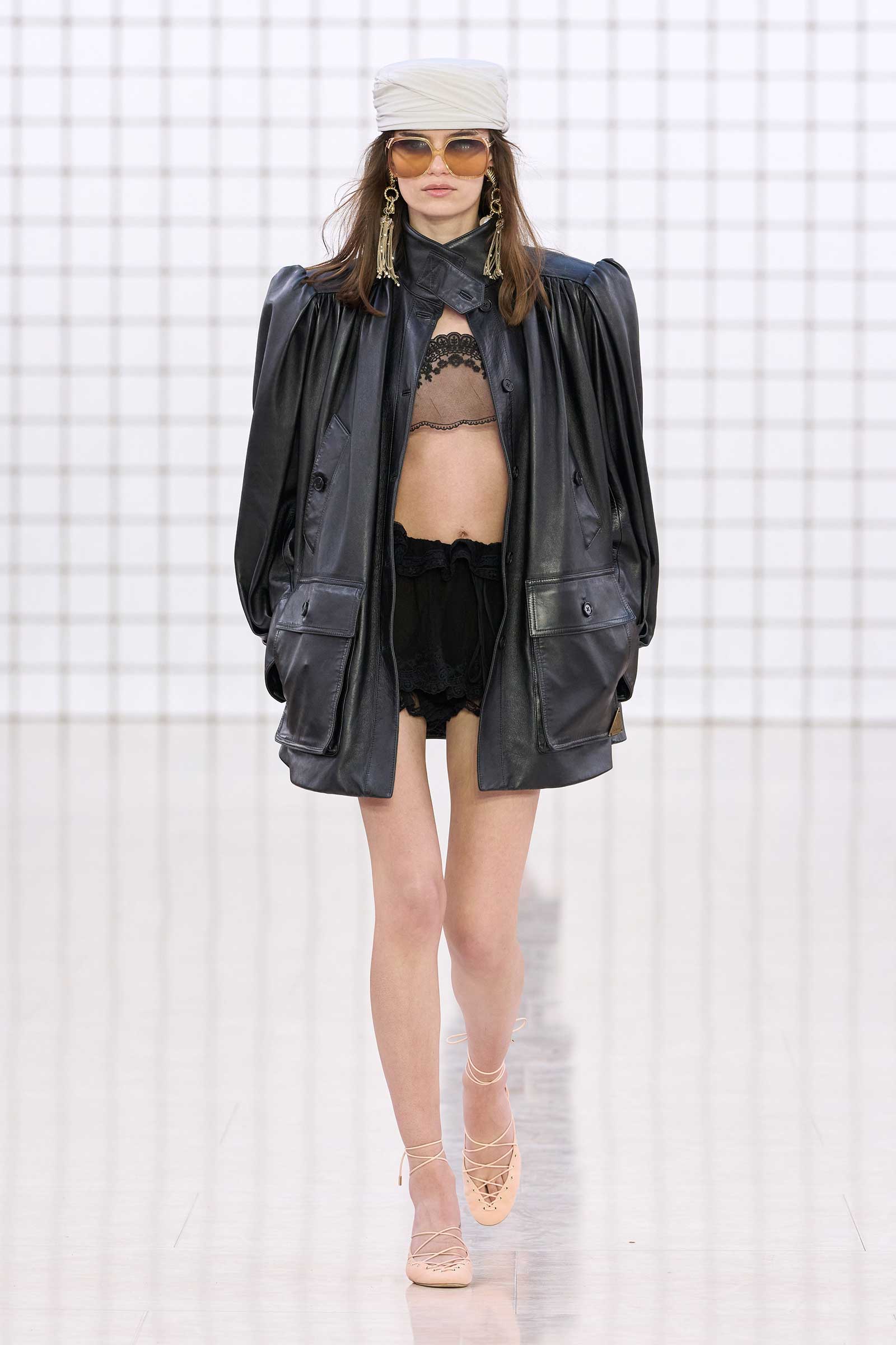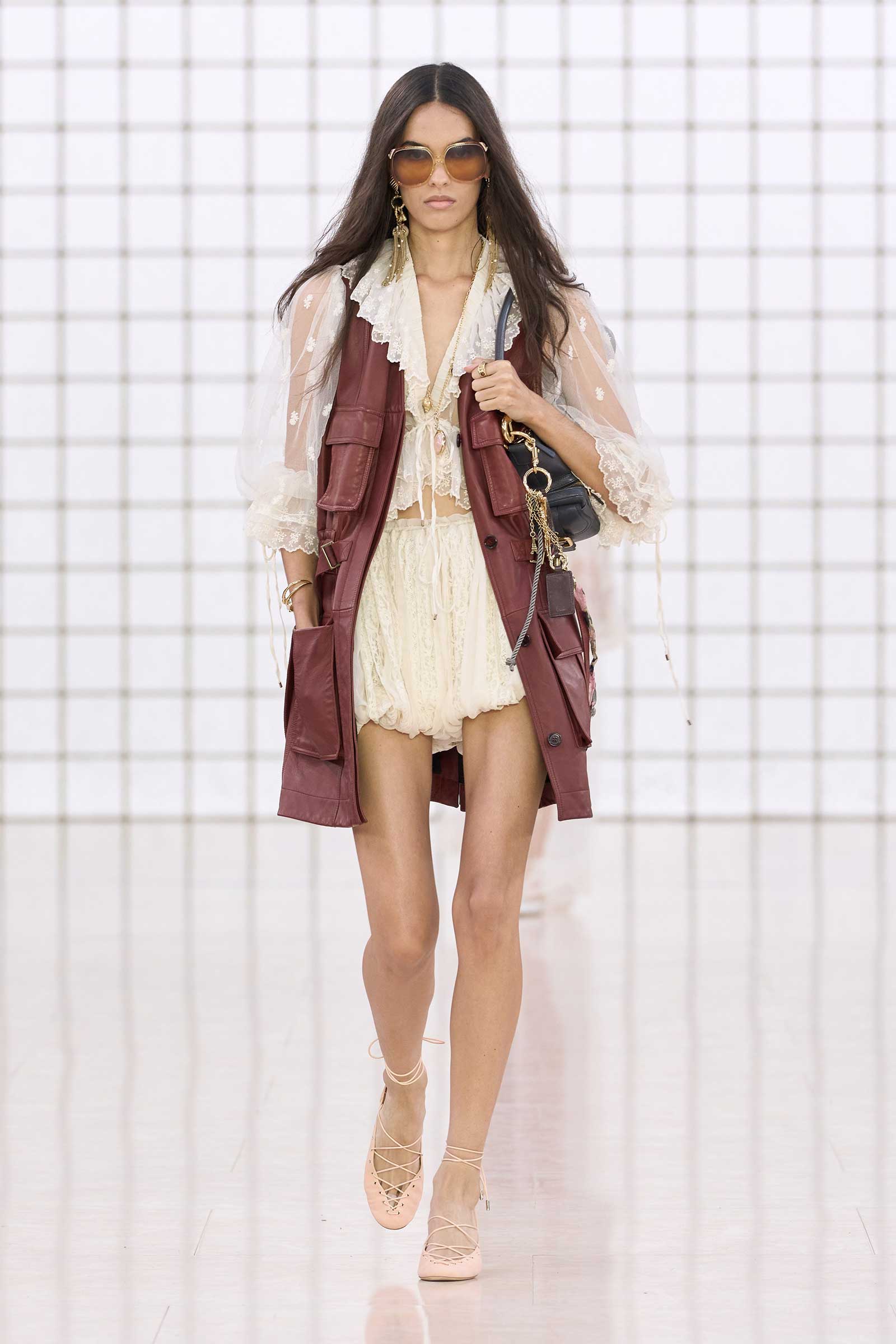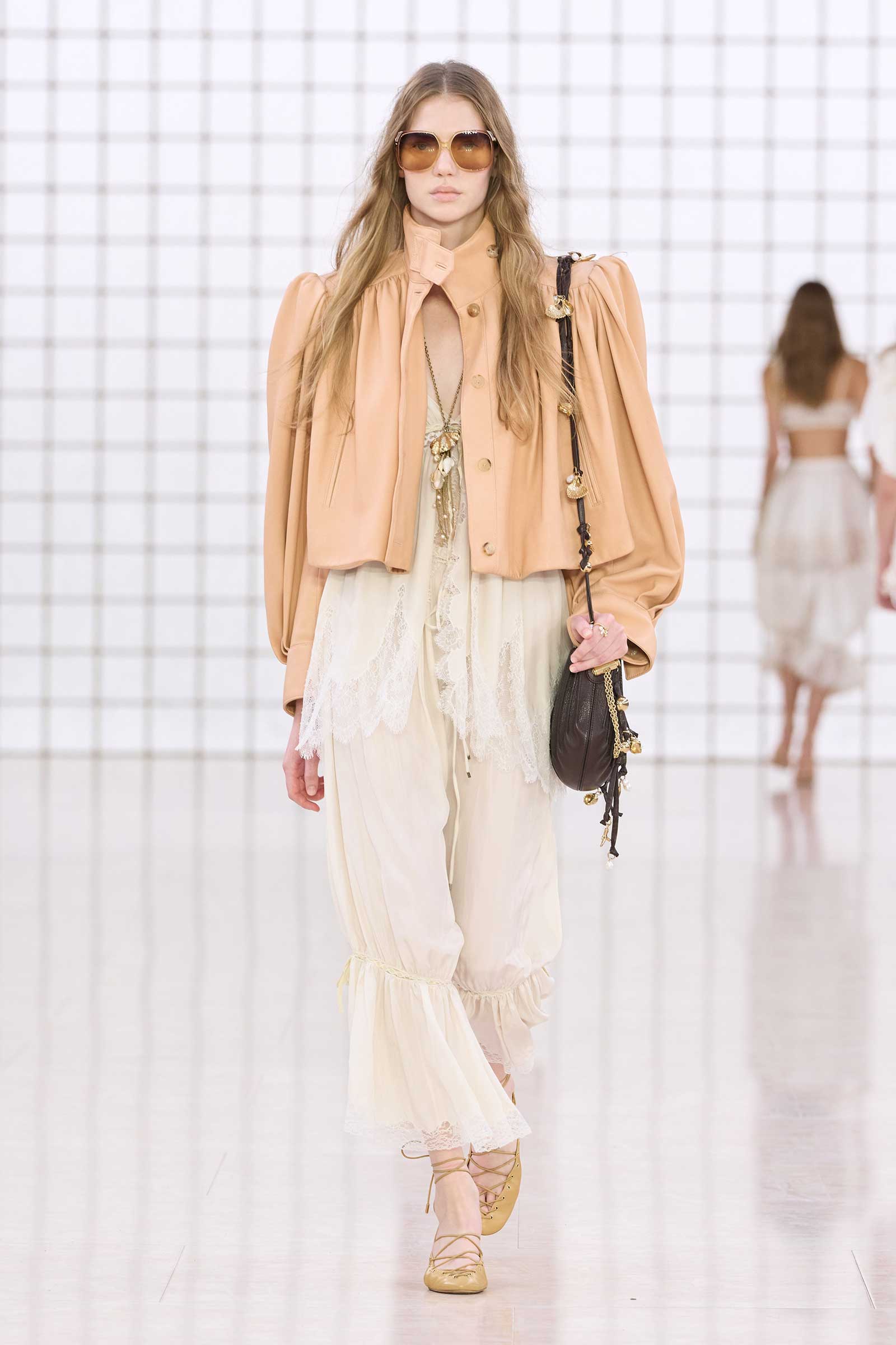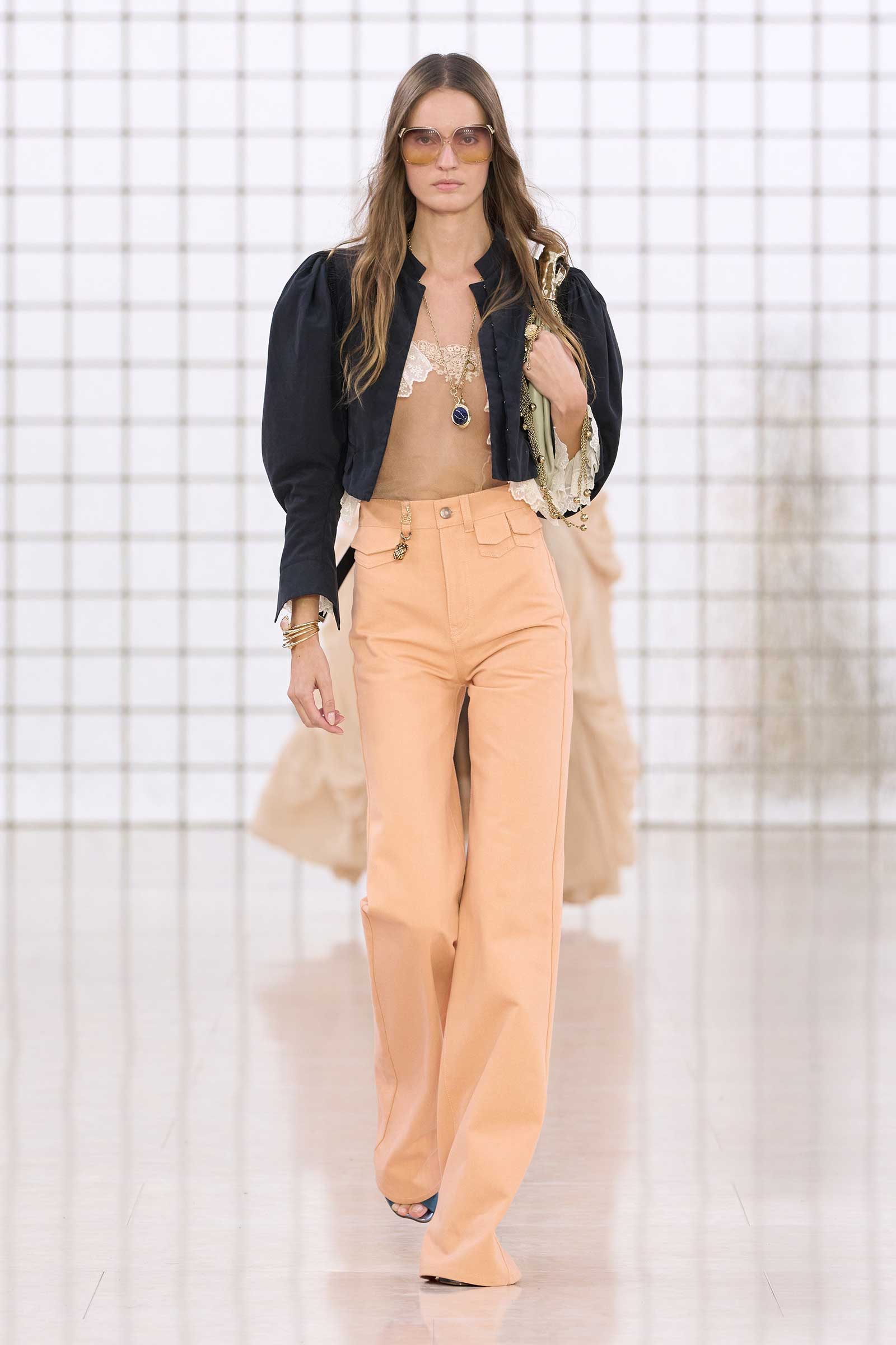 Like Kamali’s first, this collection was built on her intimate understanding of Chloé’s history. Photos of Lagerfeld-designed collections were pinned to the mood board in her studio. Two of her most inspired lifts were the waist shapers of spring ’77 and the lace bloomers of spring ’78. Both have the potential to reshape how young women think about sexy dressing in 2025. Jackets—in sturdy workwear cotton, soft suede, and leather and all built with generous gathers along their strong shoulder lines—gave the sensual lightness of these pieces some ballast, maybe just a shade too much.