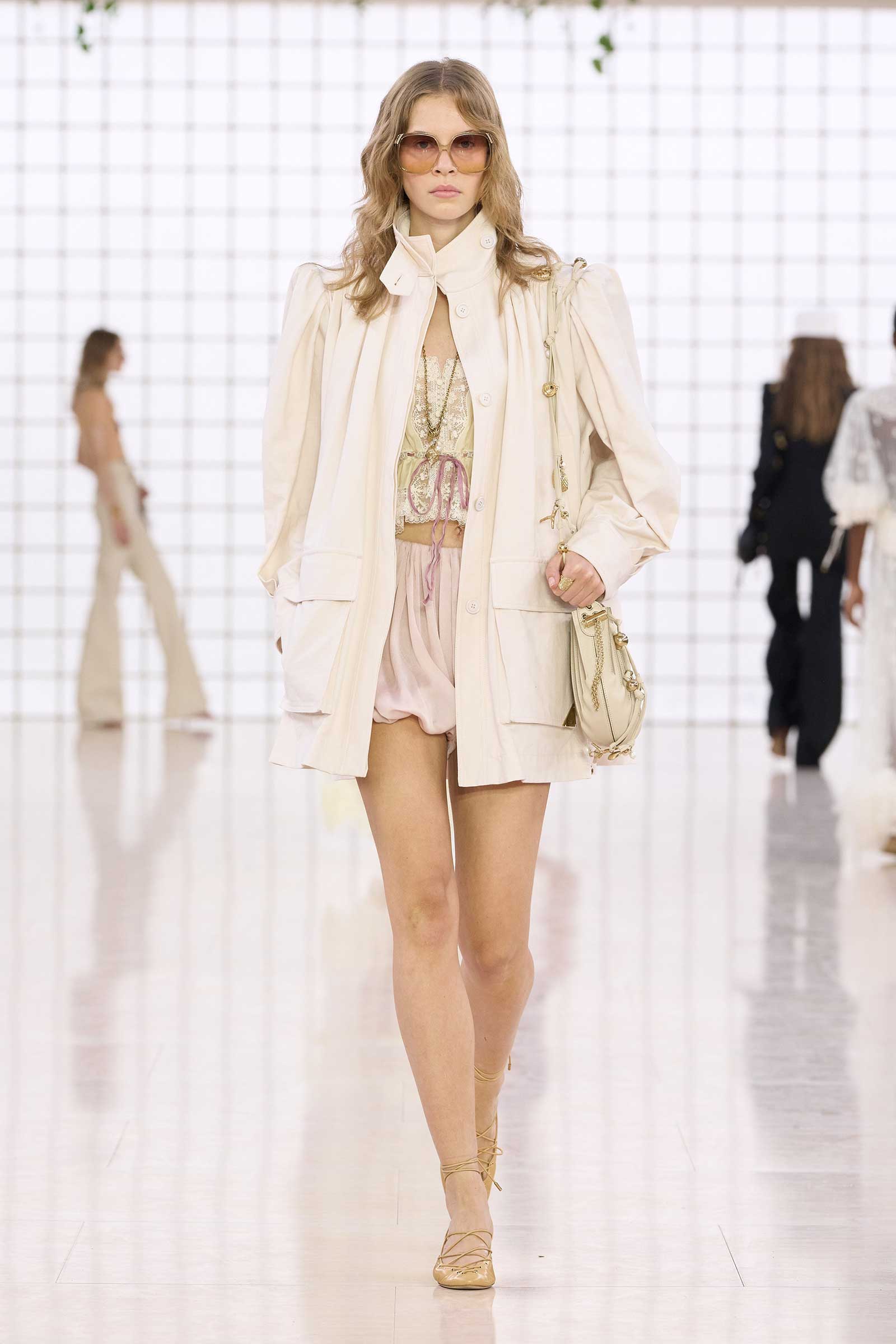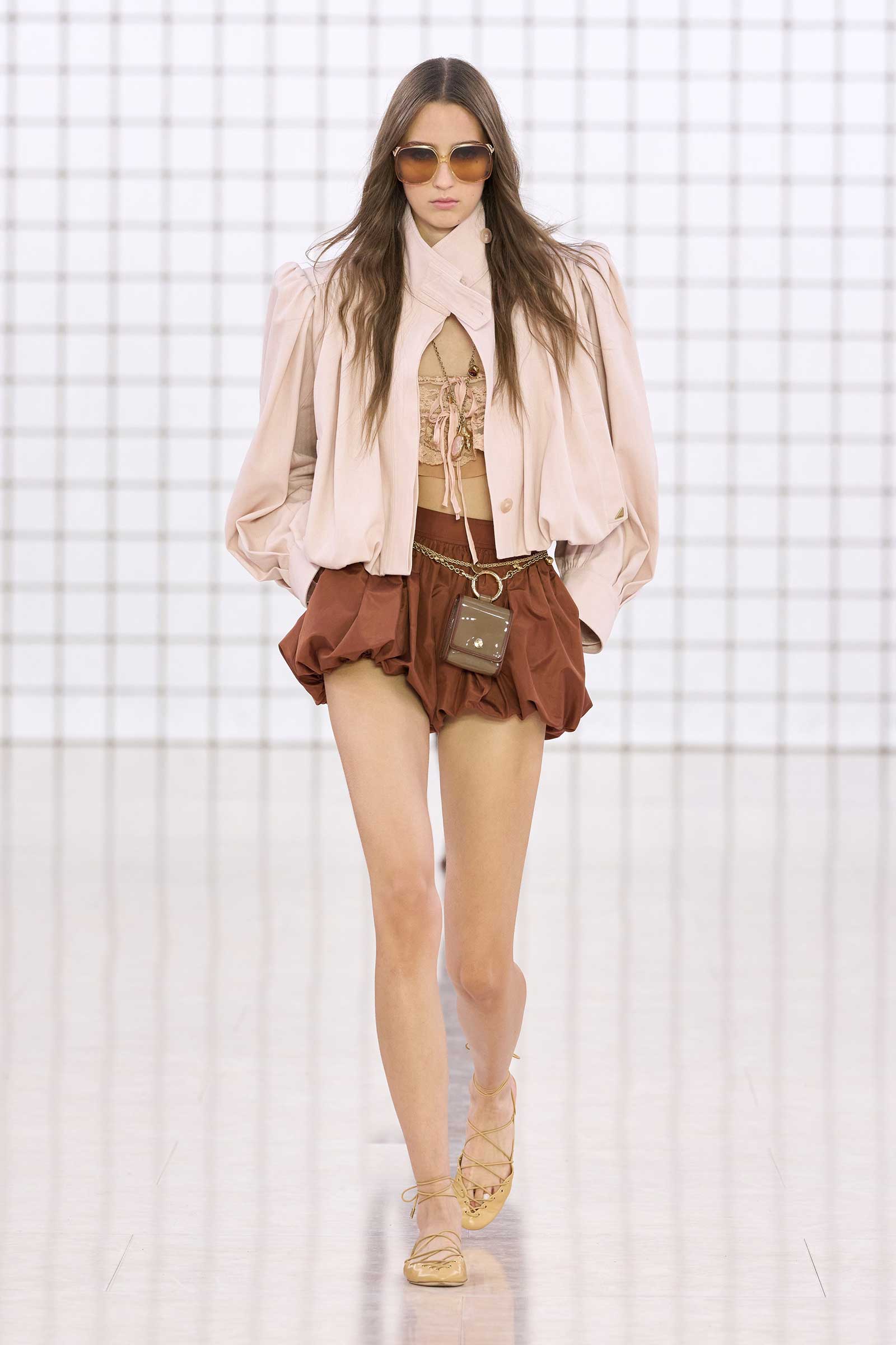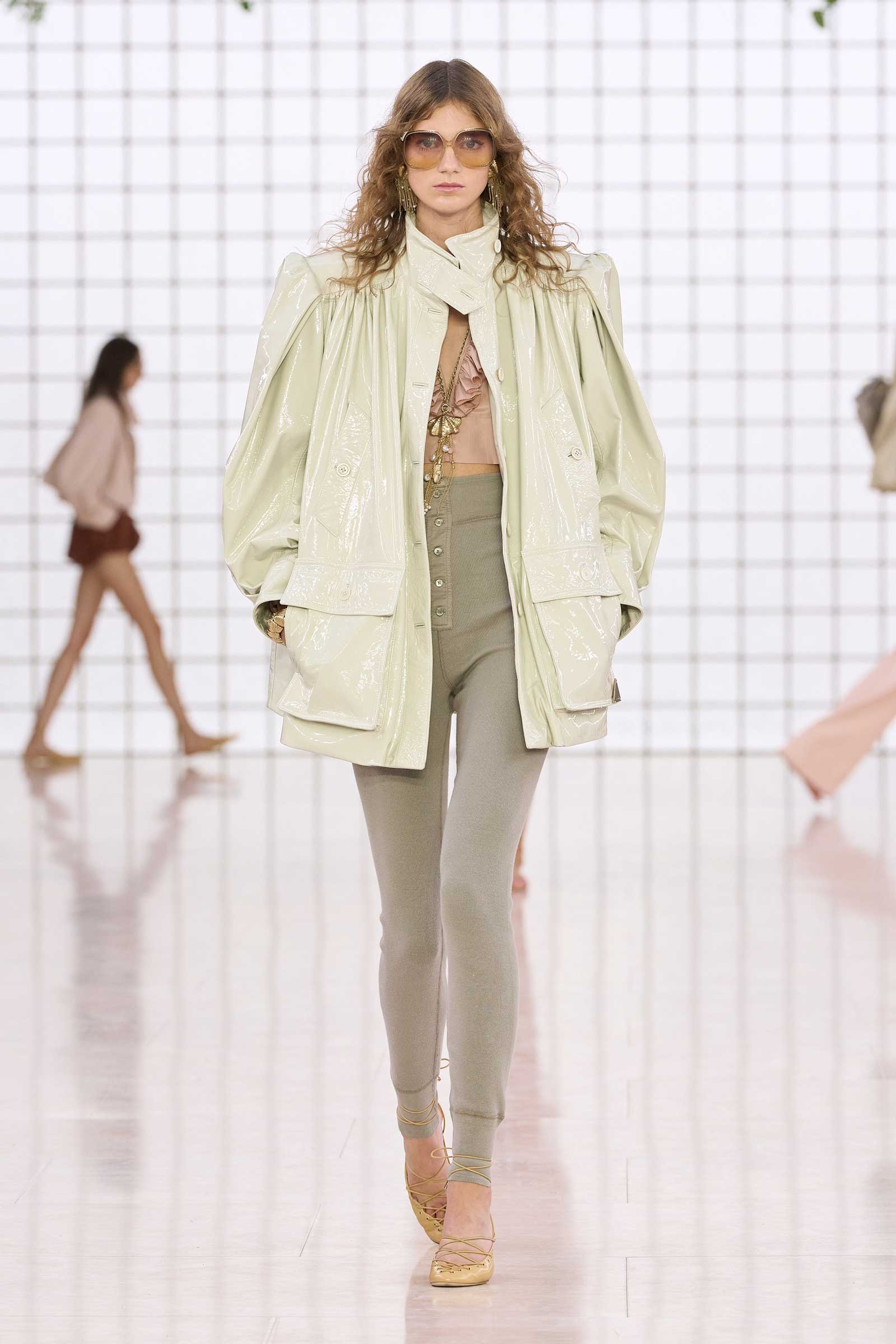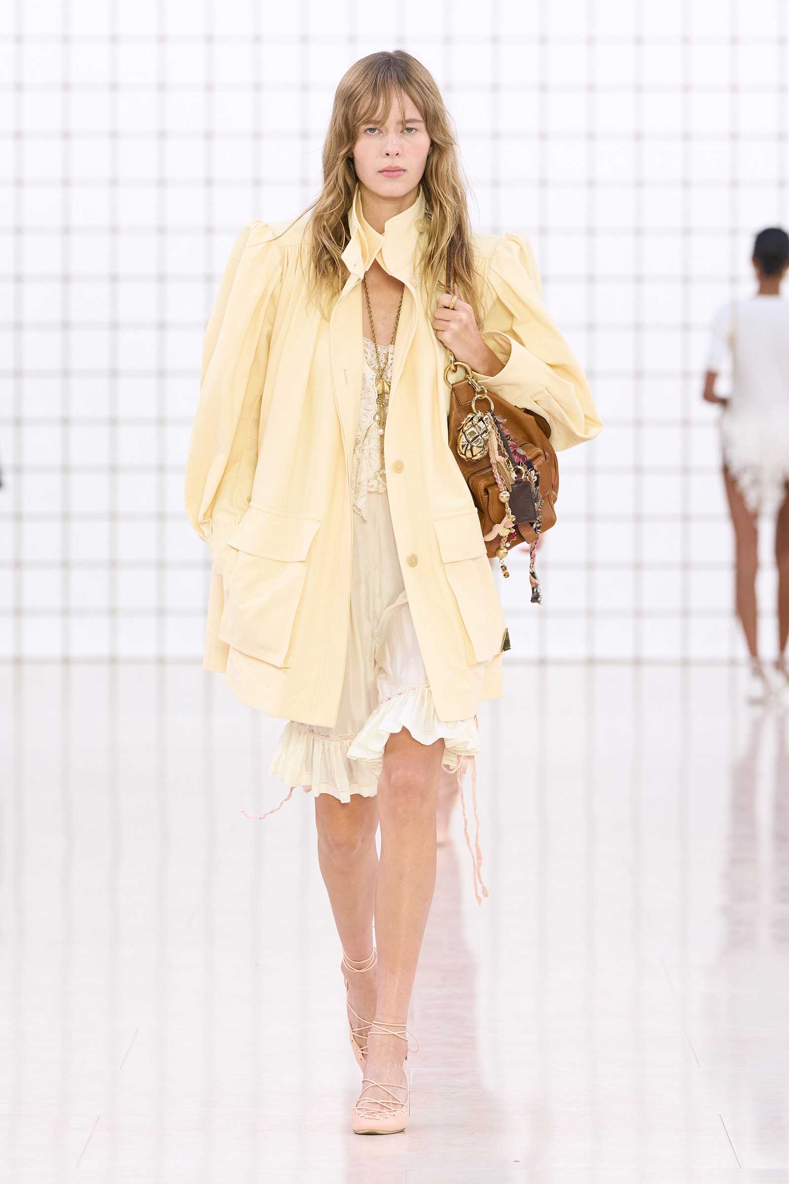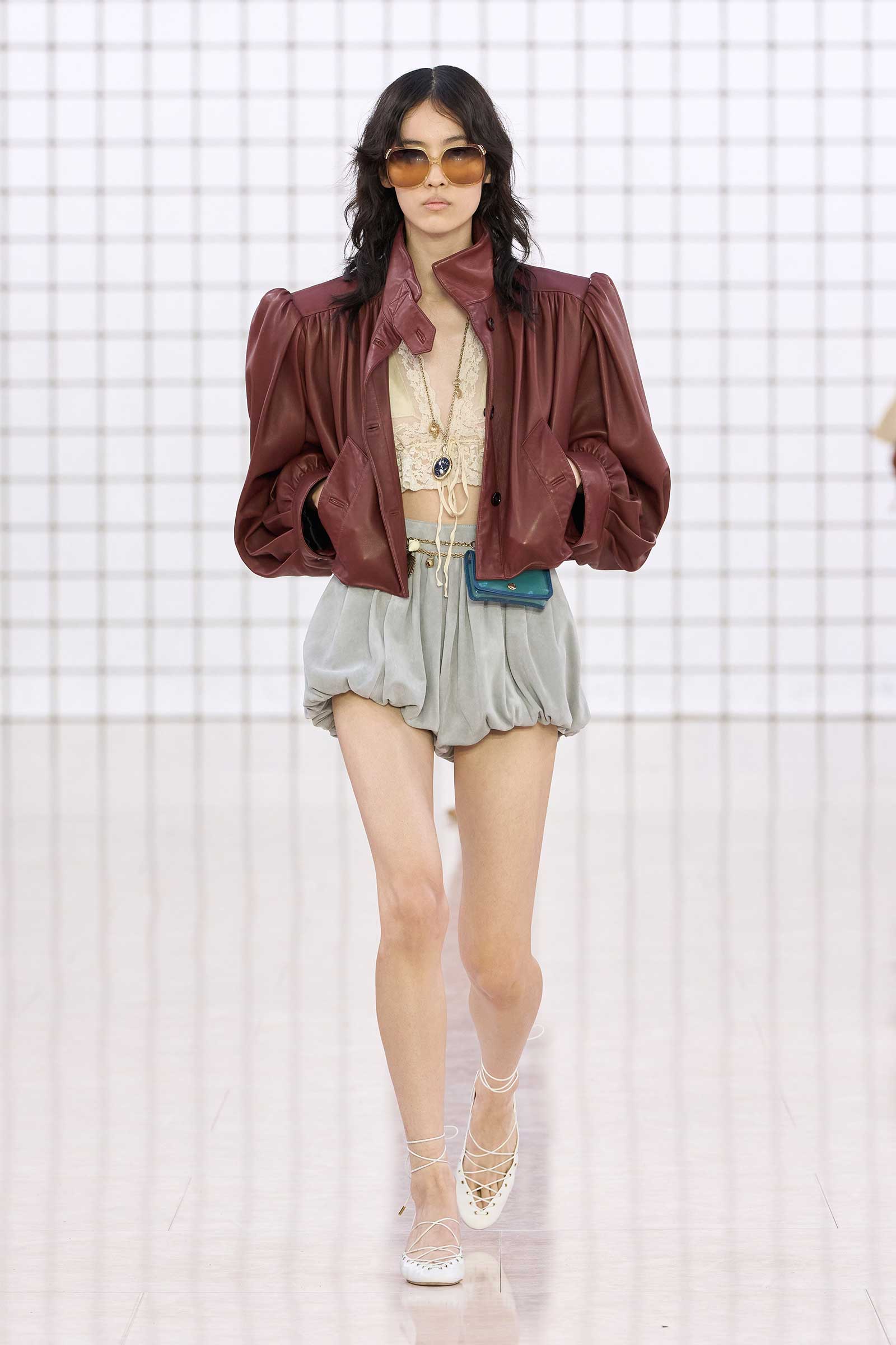 Like Kamali’s first, this collection was built on her intimate understanding of Chloé’s history. Photos of Lagerfeld-designed collections were pinned to the mood board in her studio. Two of her most inspired lifts were the waist shapers of spring ’77 and the lace bloomers of spring ’78. Both have the potential to reshape how young women think about sexy dressing in 2025. Jackets—in sturdy workwear cotton, soft suede, and leather and all built with generous gathers along their strong shoulder lines—gave the sensual lightness of these pieces some ballast, maybe just a shade too much.