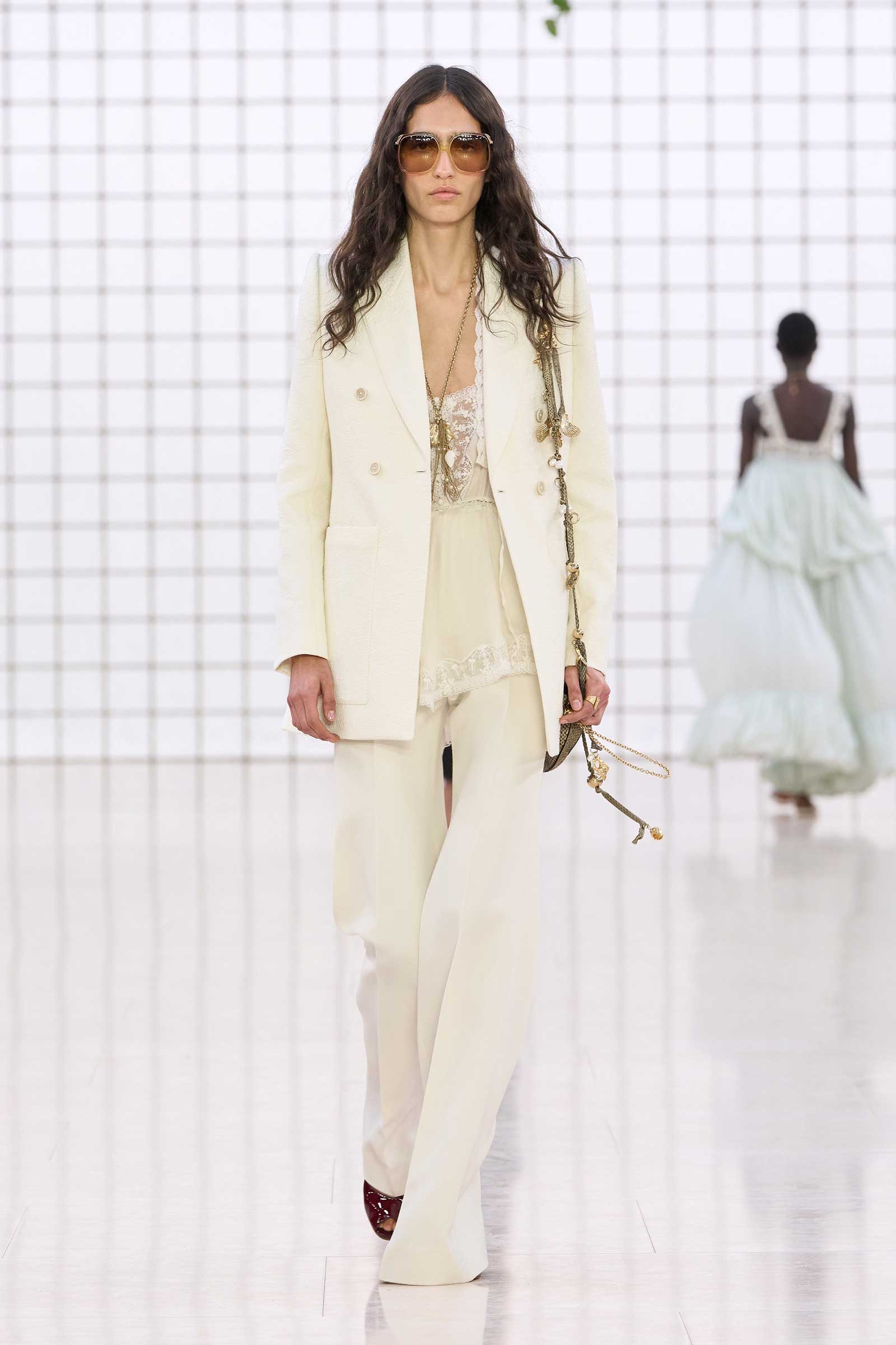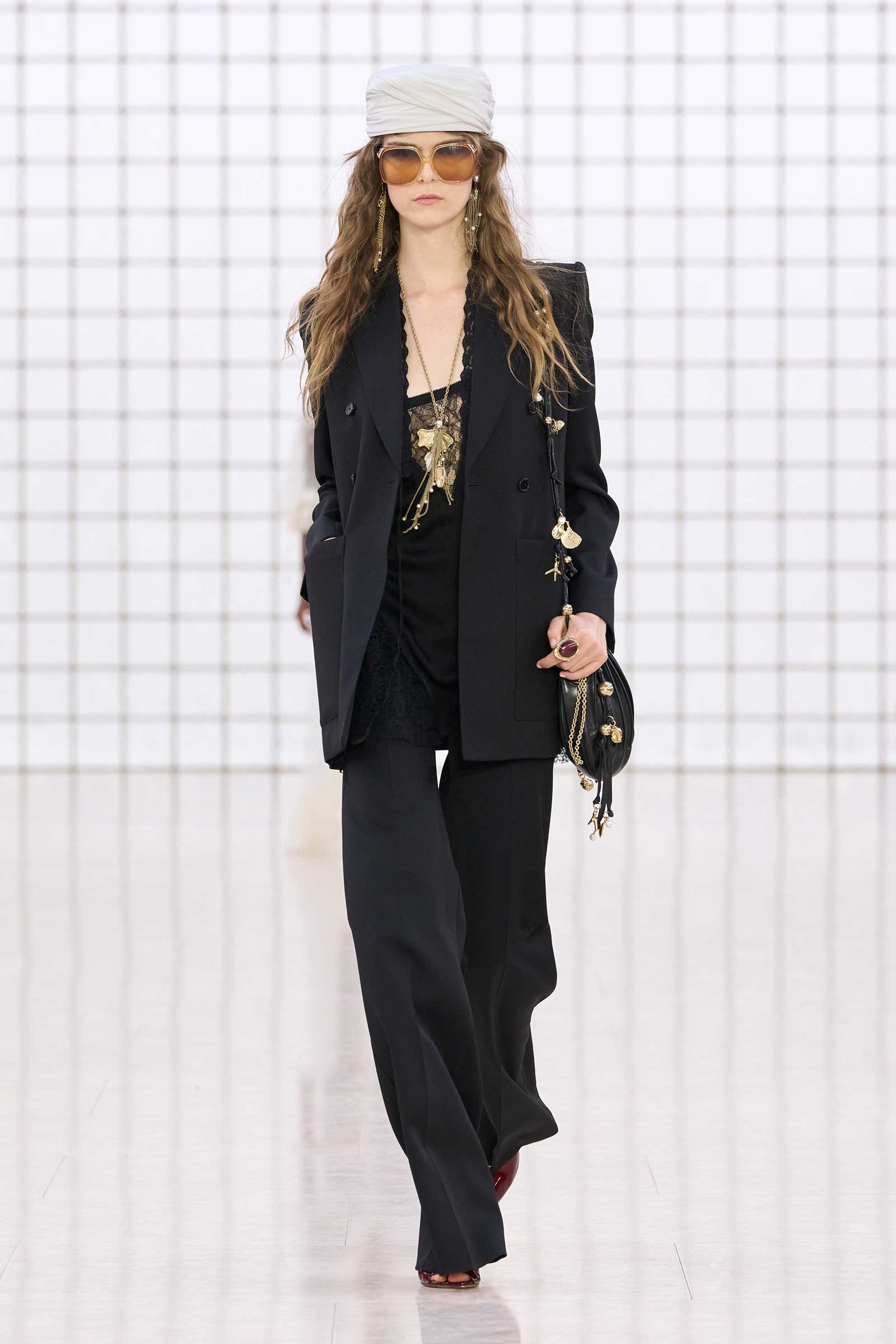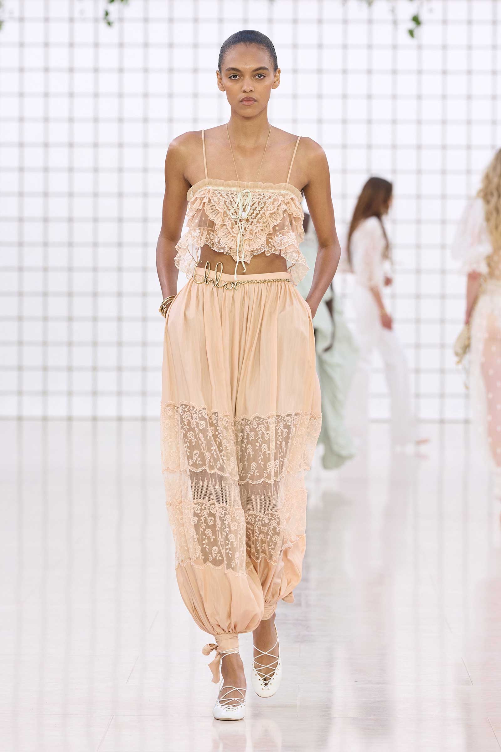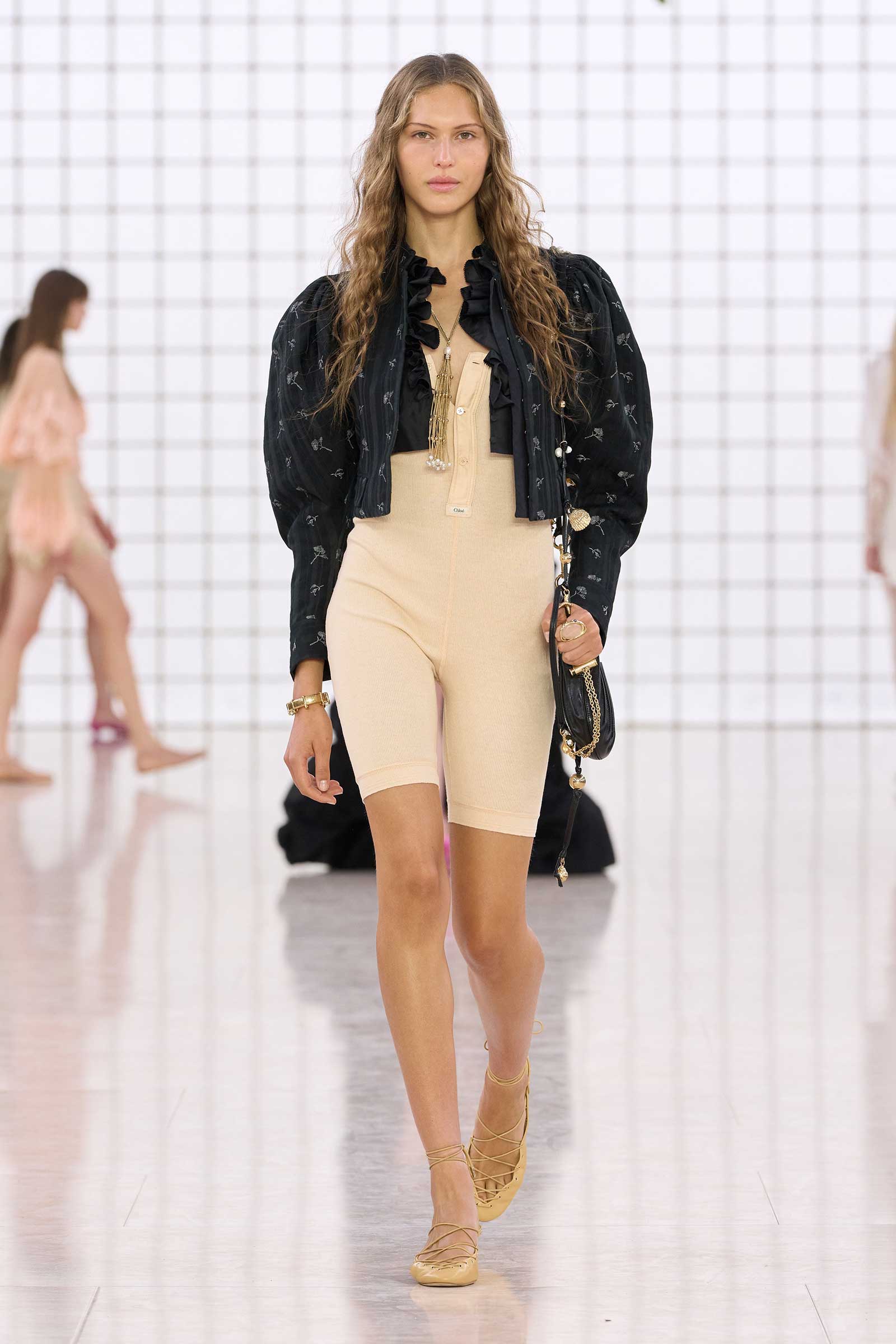 Like Kamali’s first, this collection was built on her intimate understanding of Chloé’s history. Photos of Lagerfeld-designed collections were pinned to the mood board in her studio. Two of her most inspired lifts were the waist shapers of spring ’77 and the lace bloomers of spring ’78. Both have the potential to reshape how young women think about sexy dressing in 2025. Jackets—in sturdy workwear cotton, soft suede, and leather and all built with generous gathers along their strong shoulder lines—gave the sensual lightness of these pieces some ballast, maybe just a shade too much.