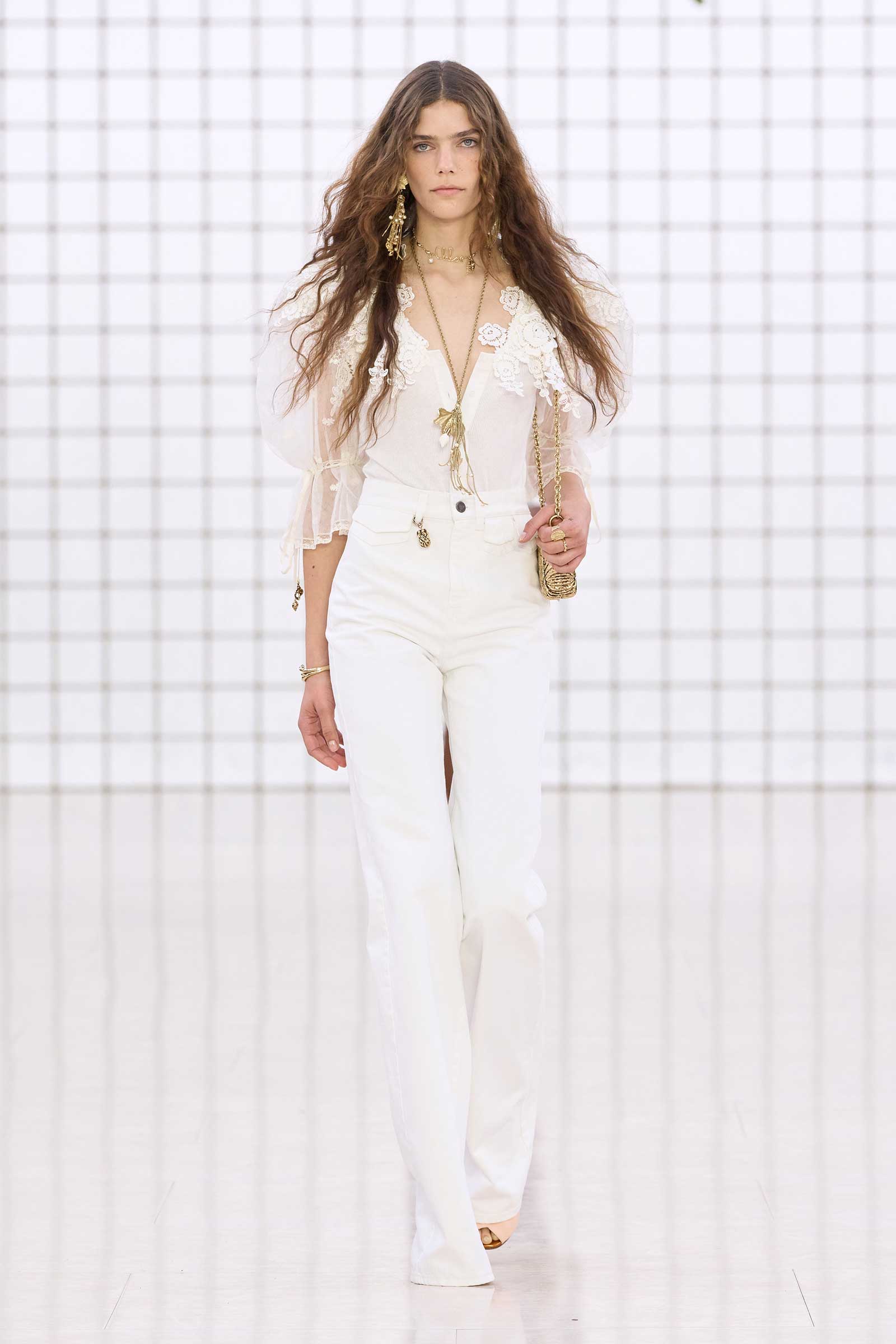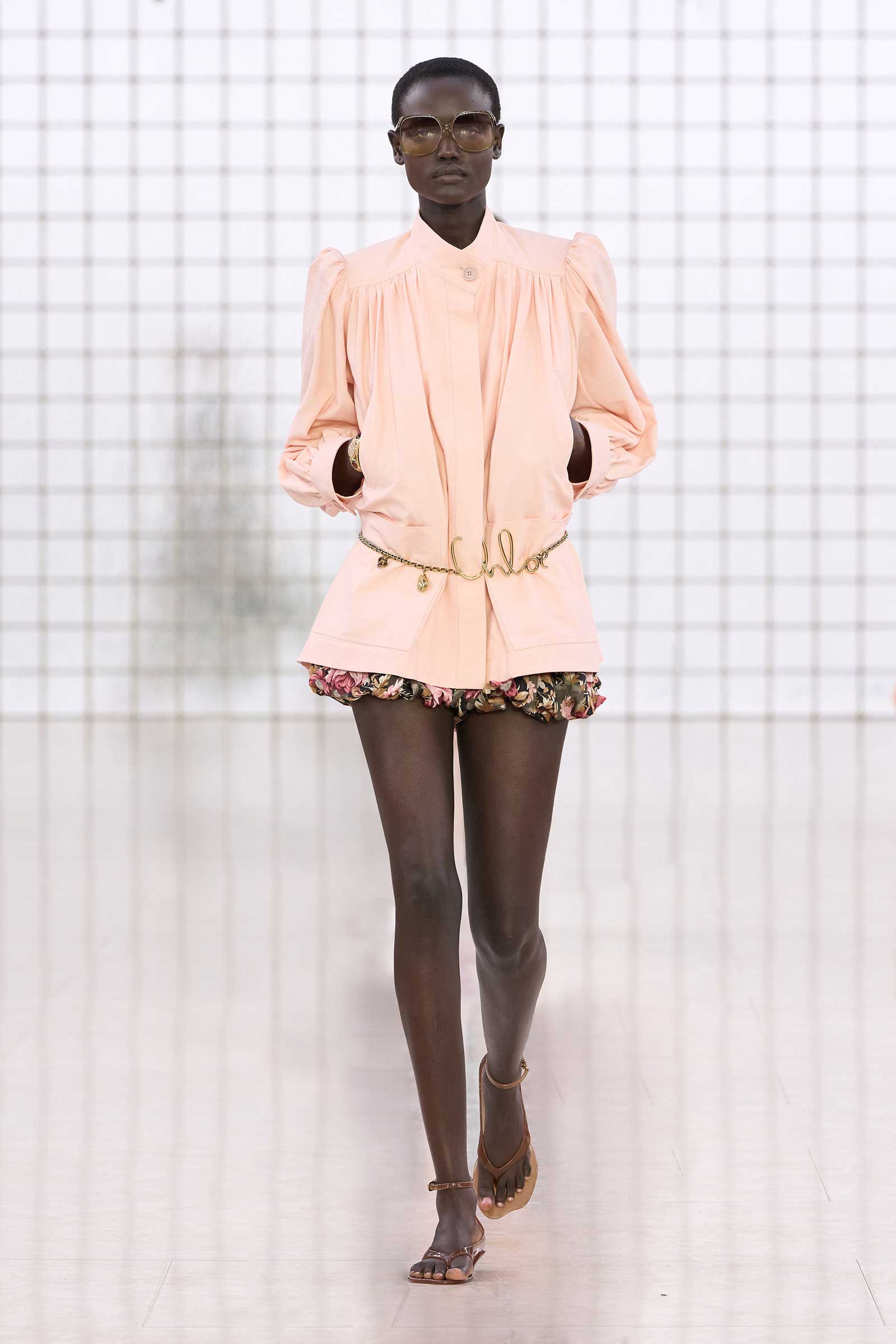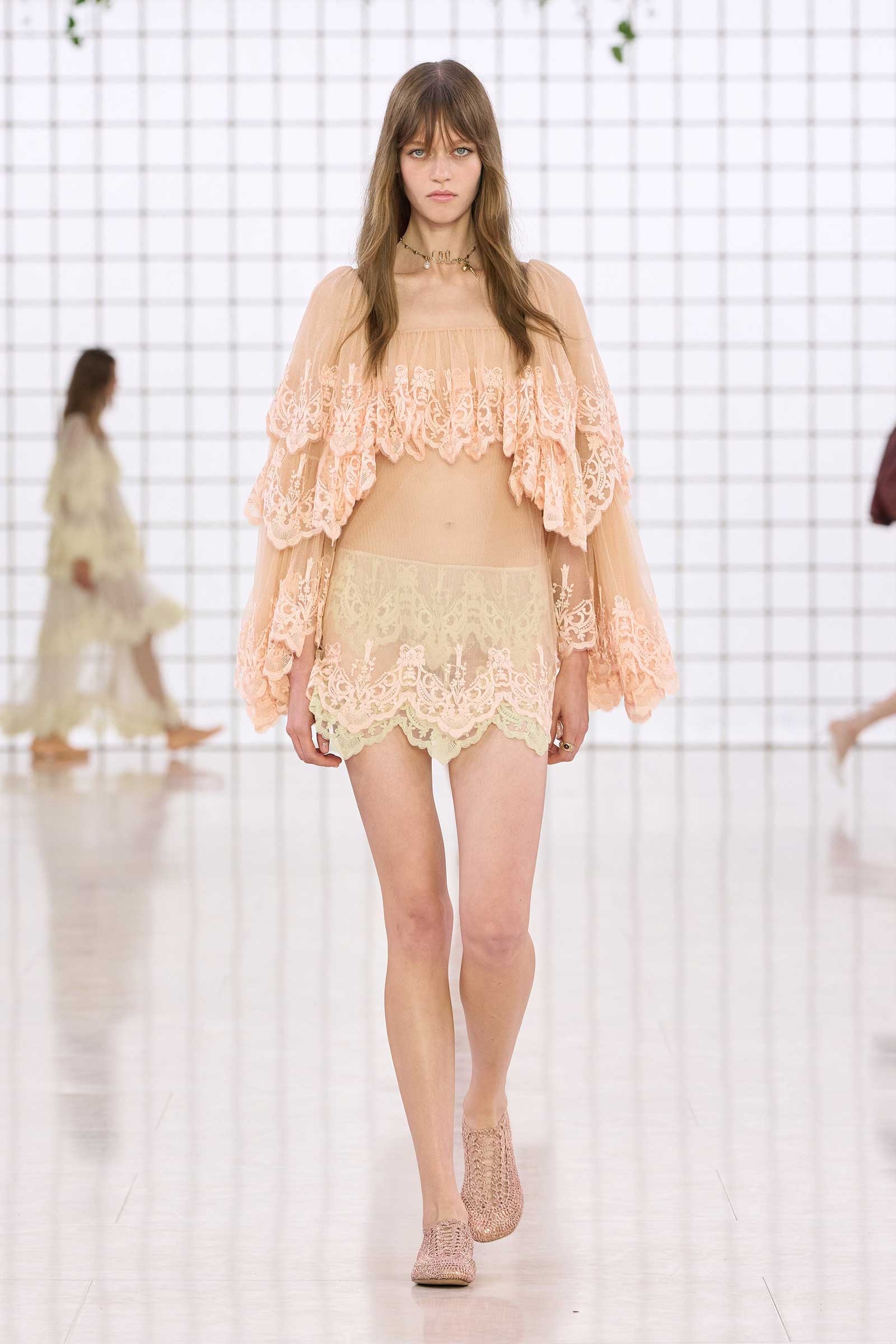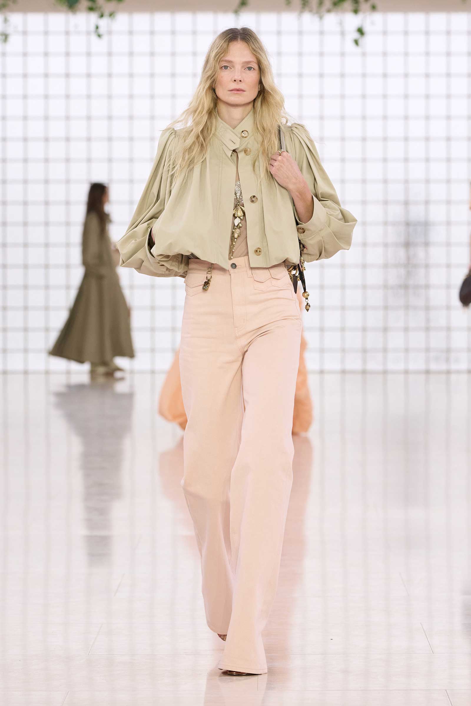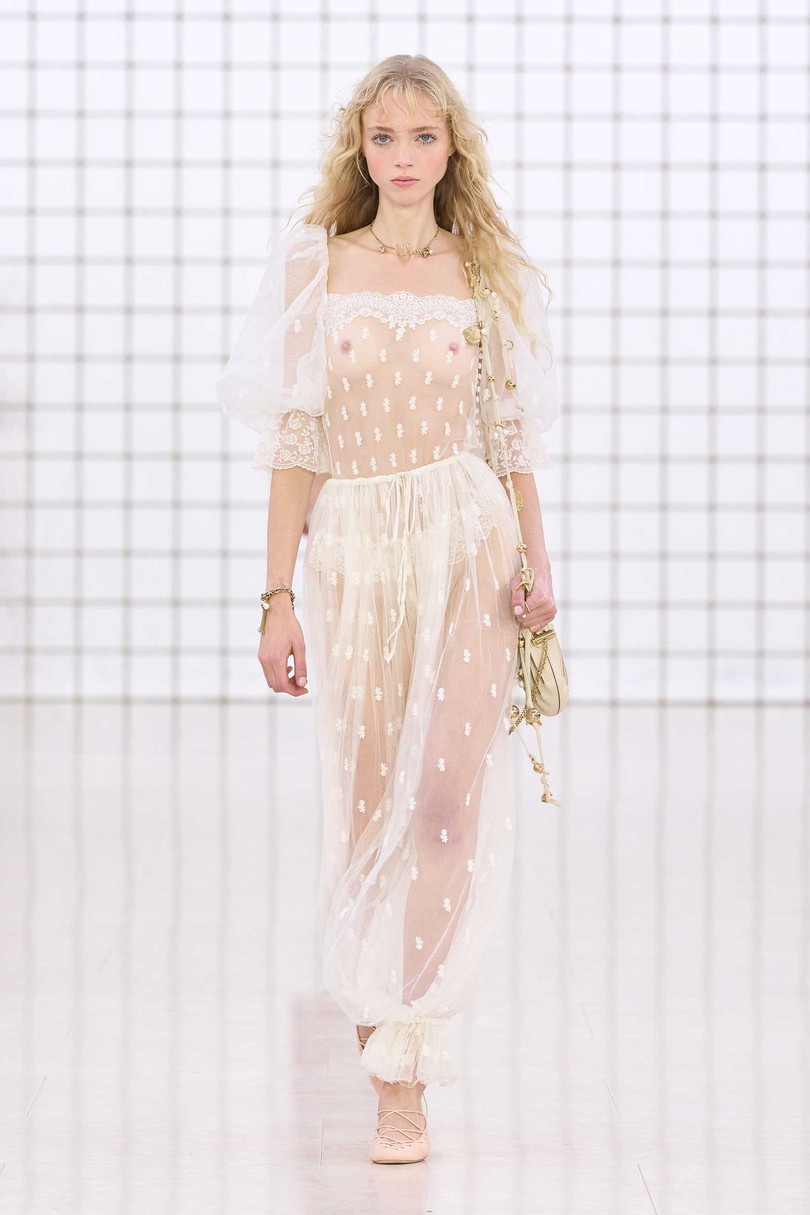 Like Kamali’s first, this collection was built on her intimate understanding of Chloé’s history. Photos of Lagerfeld-designed collections were pinned to the mood board in her studio. Two of her most inspired lifts were the waist shapers of spring ’77 and the lace bloomers of spring ’78. Both have the potential to reshape how young women think about sexy dressing in 2025. Jackets—in sturdy workwear cotton, soft suede, and leather and all built with generous gathers along their strong shoulder lines—gave the sensual lightness of these pieces some ballast, maybe just a shade too much.