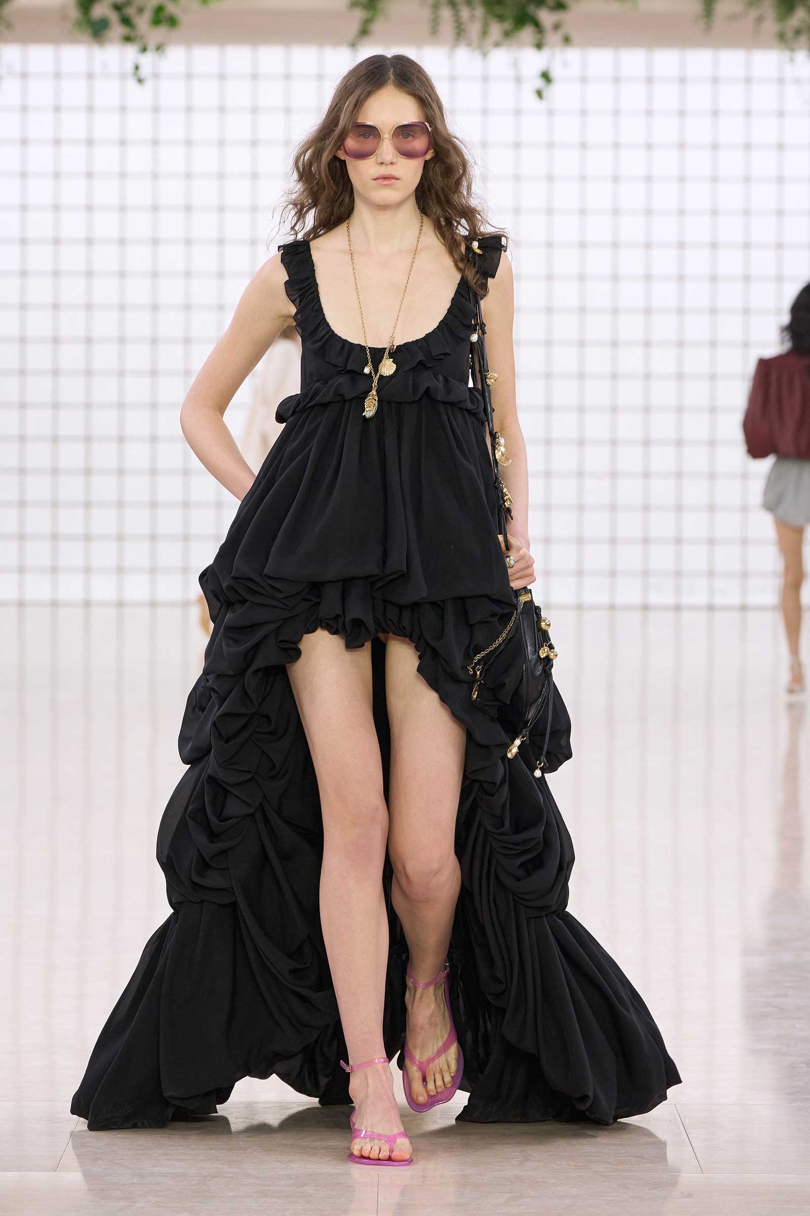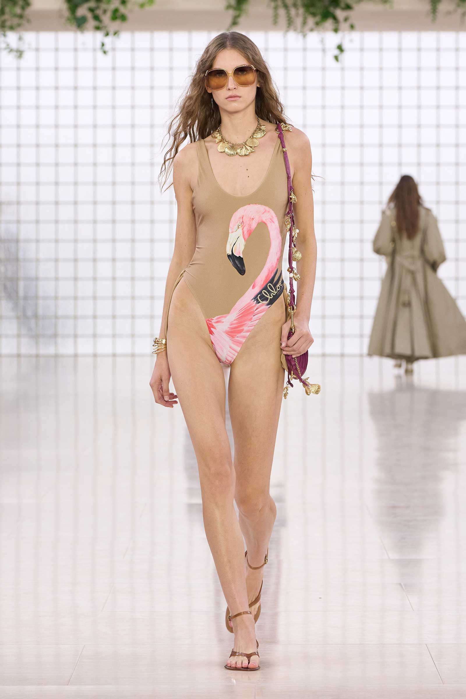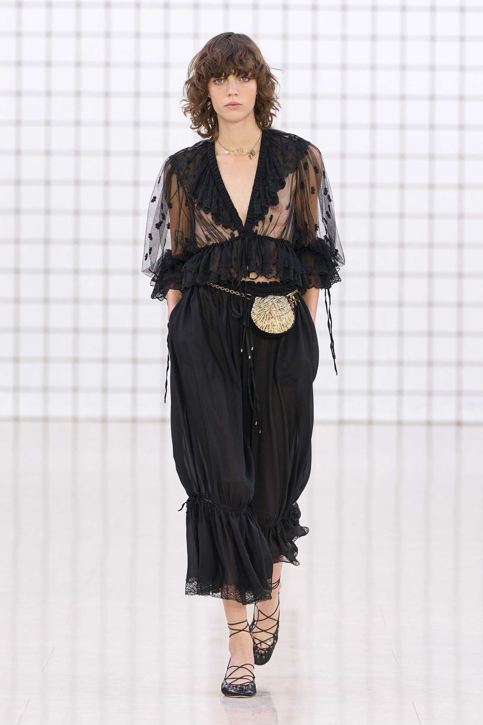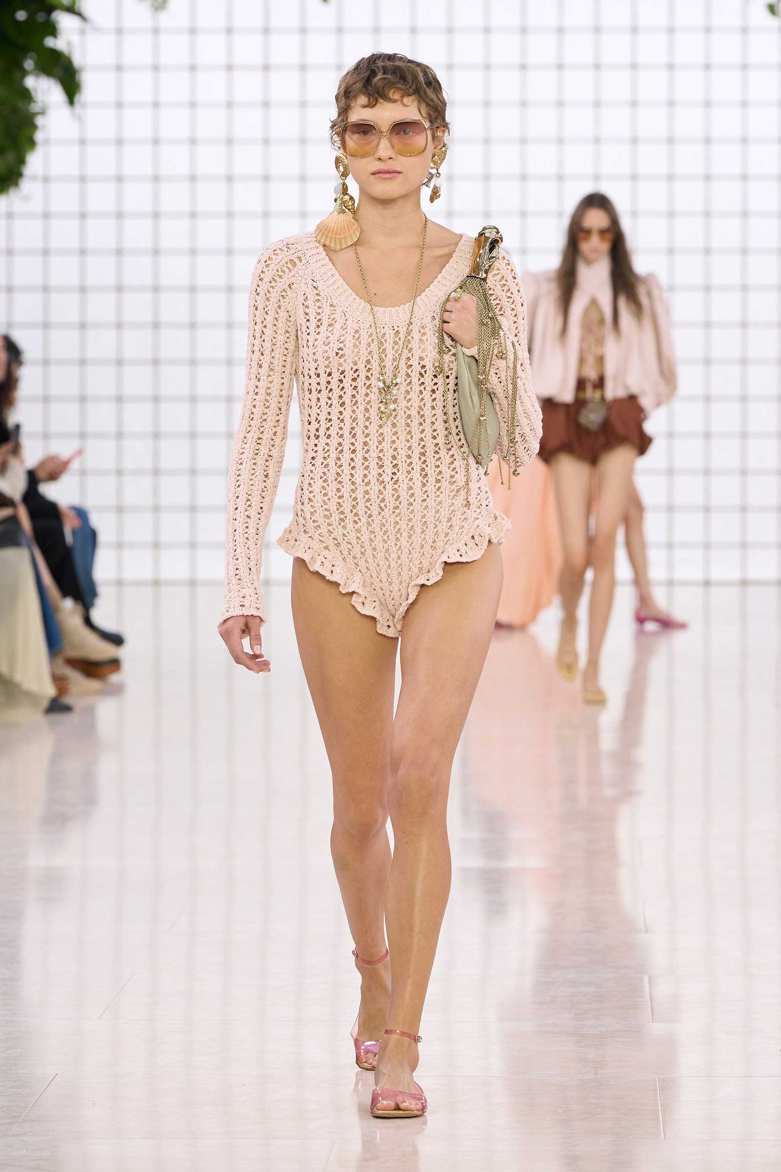 The collection was a confident evolution of her first outing, with more casual elements—like high-waist, flared jeans recalling Phoebe Philo’s for the brand circa spring 2004 and a pink flamingo bathing suit channeling the cheekiness of the Stella McCartney era—that may be easier access points for the brand than the ruffles and laces worn by the celebrities and models in the front row today. On that note, the little kitten-heel jelly sandals will also be a popular hit.
