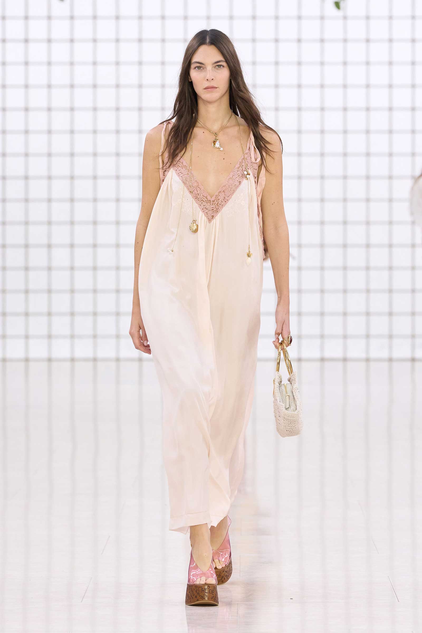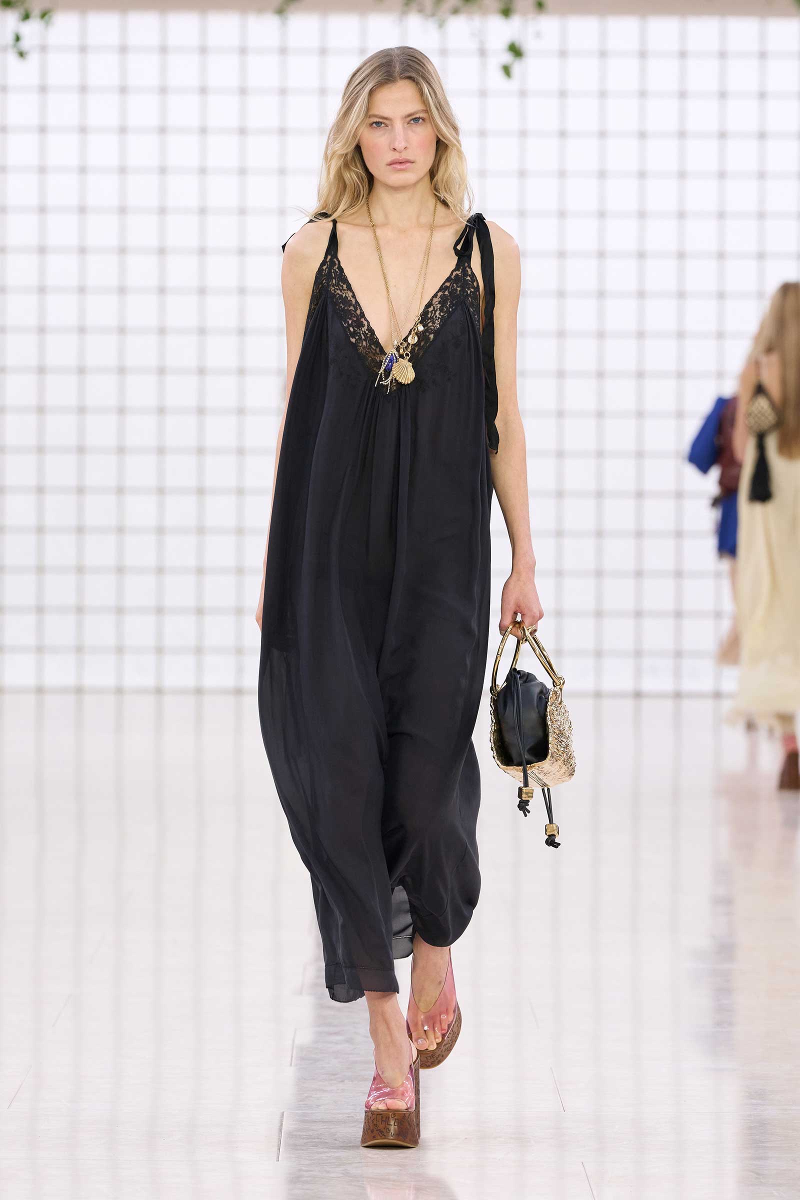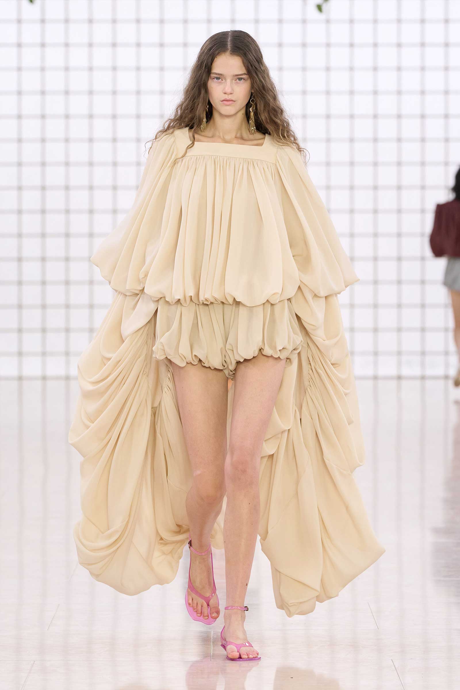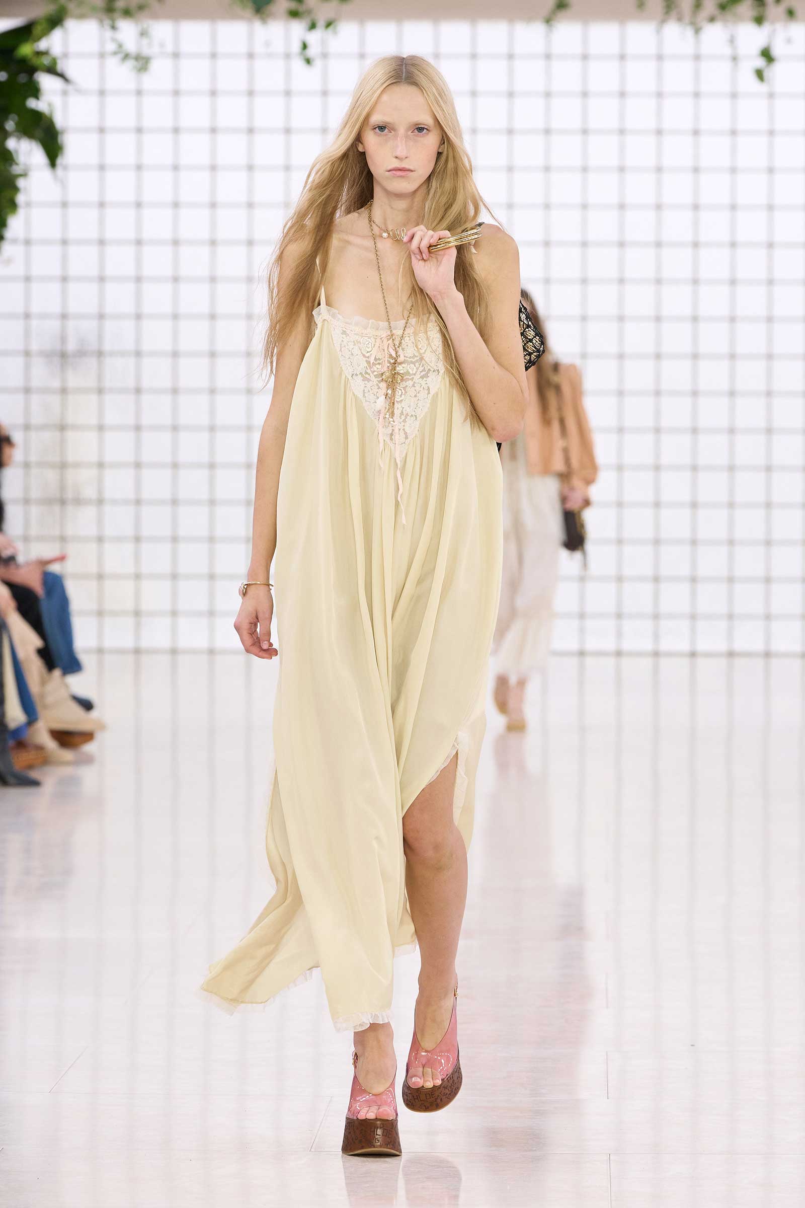 The collection was a confident evolution of her first outing, with more casual elements—like high-waist, flared jeans recalling Phoebe Philo’s for the brand circa spring 2004 and a pink flamingo bathing suit channeling the cheekiness of the Stella McCartney era—that may be easier access points for the brand than the ruffles and laces worn by the celebrities and models in the front row today. On that note, the little kitten-heel jelly sandals will also be a popular hit.