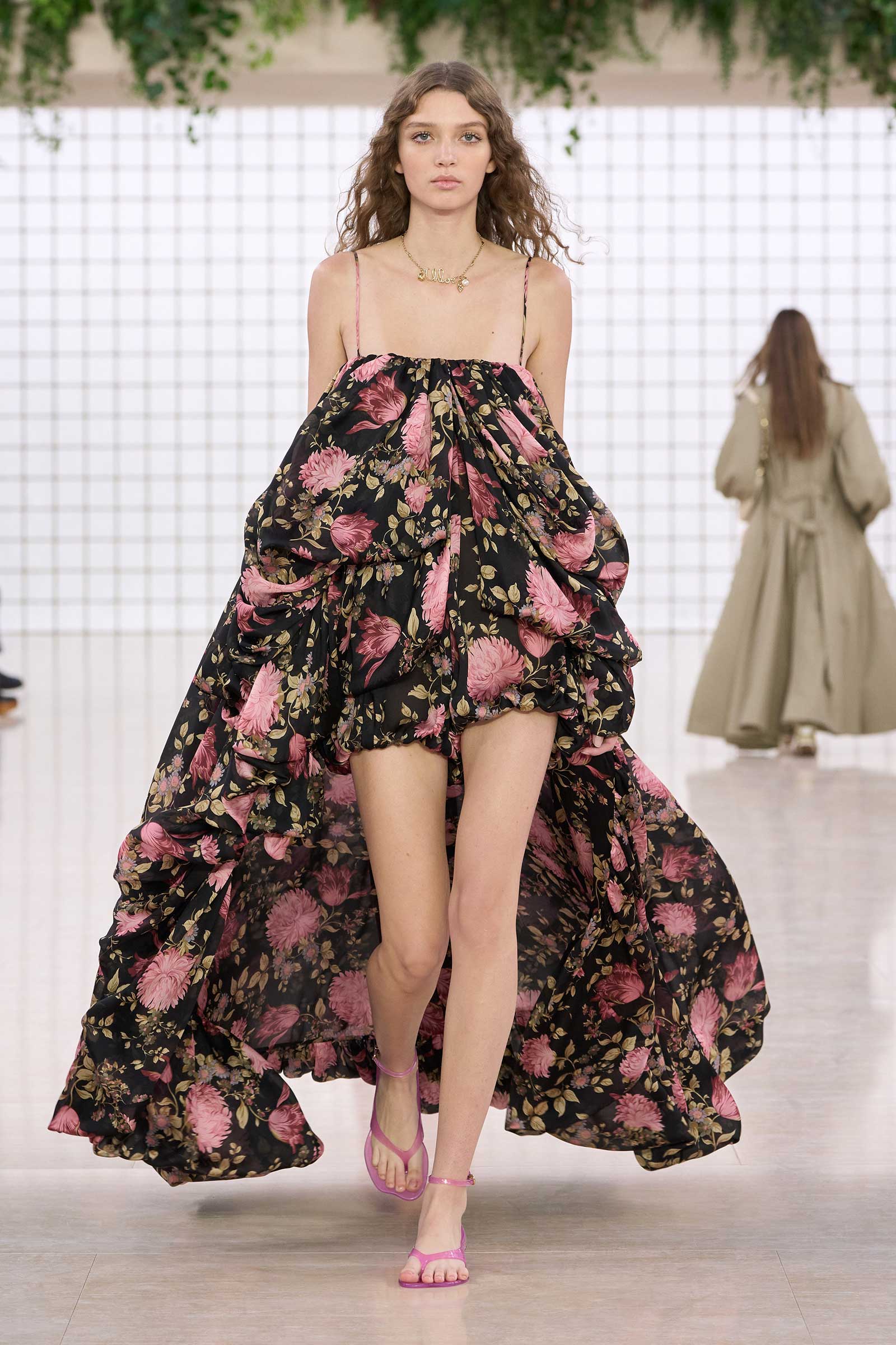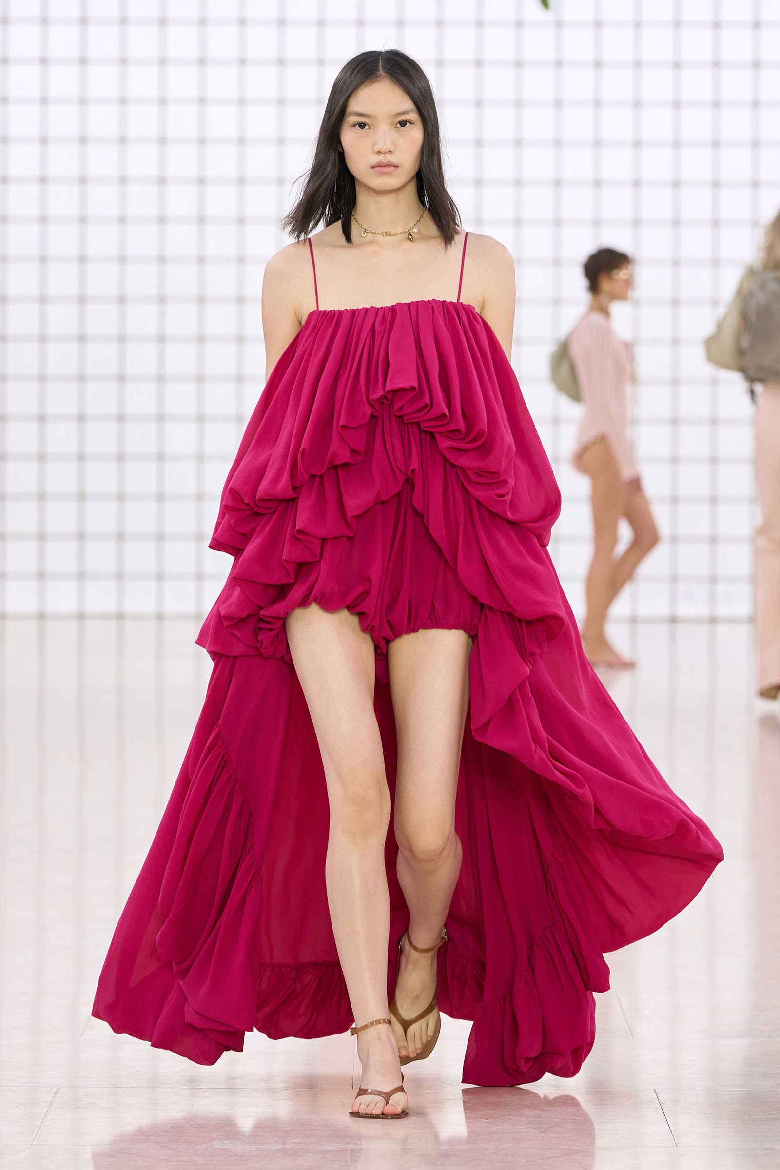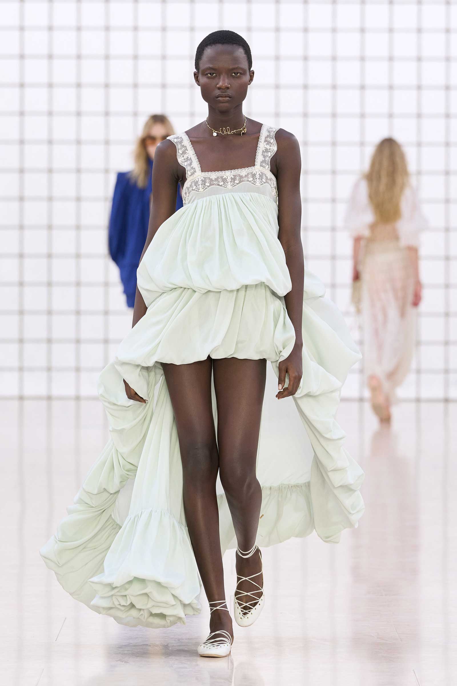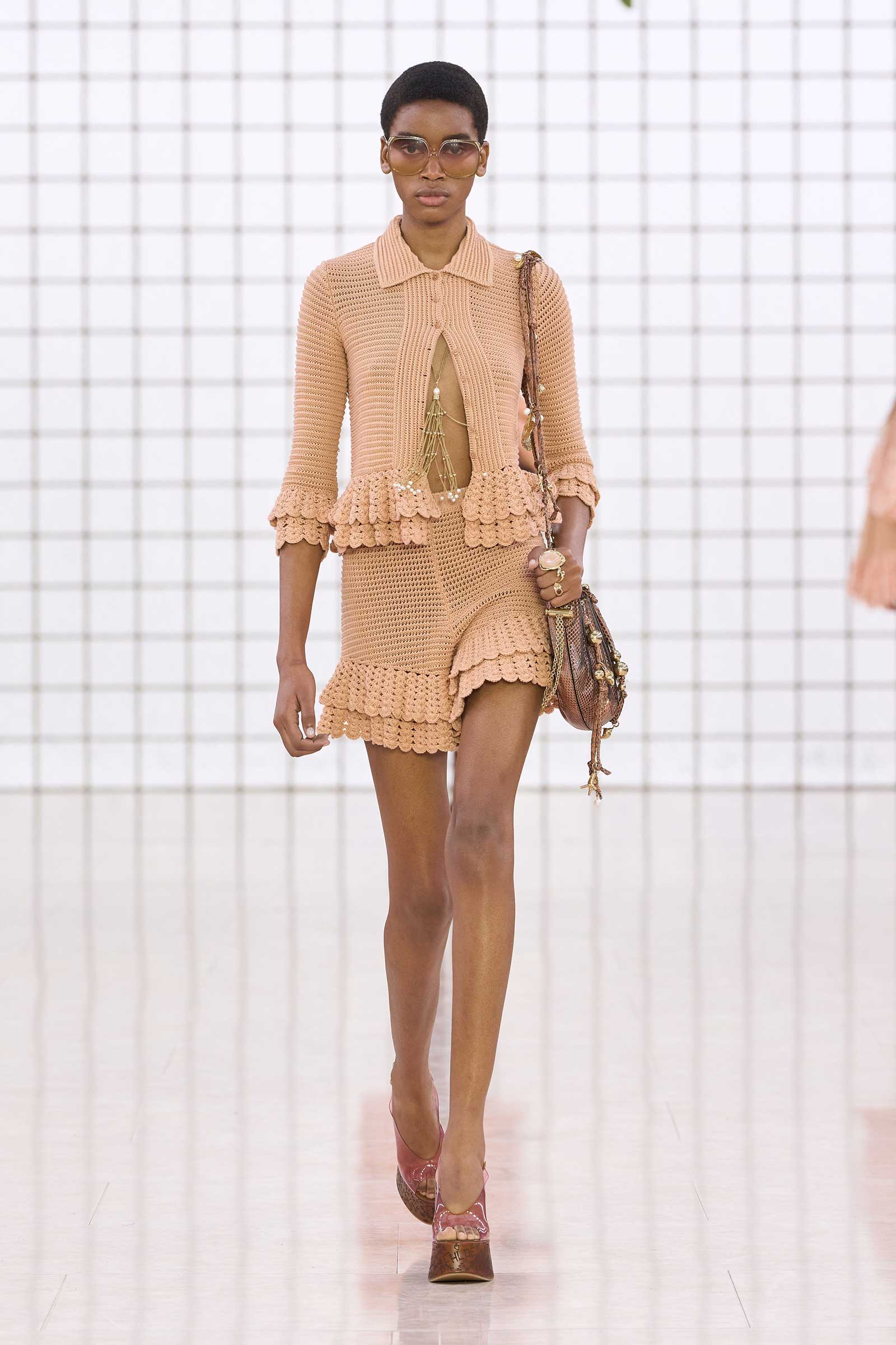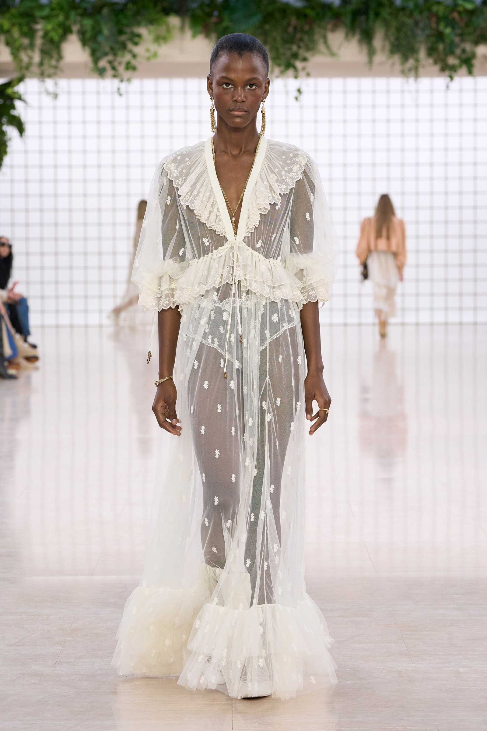 The collection was a confident evolution of her first outing, with more casual elements—like high-waist, flared jeans recalling Phoebe Philo’s for the brand circa spring 2004 and a pink flamingo bathing suit channeling the cheekiness of the Stella McCartney era—that may be easier access points for the brand than the ruffles and laces worn by the celebrities and models in the front row today. On that note, the little kitten-heel jelly sandals will also be a popular hit.
