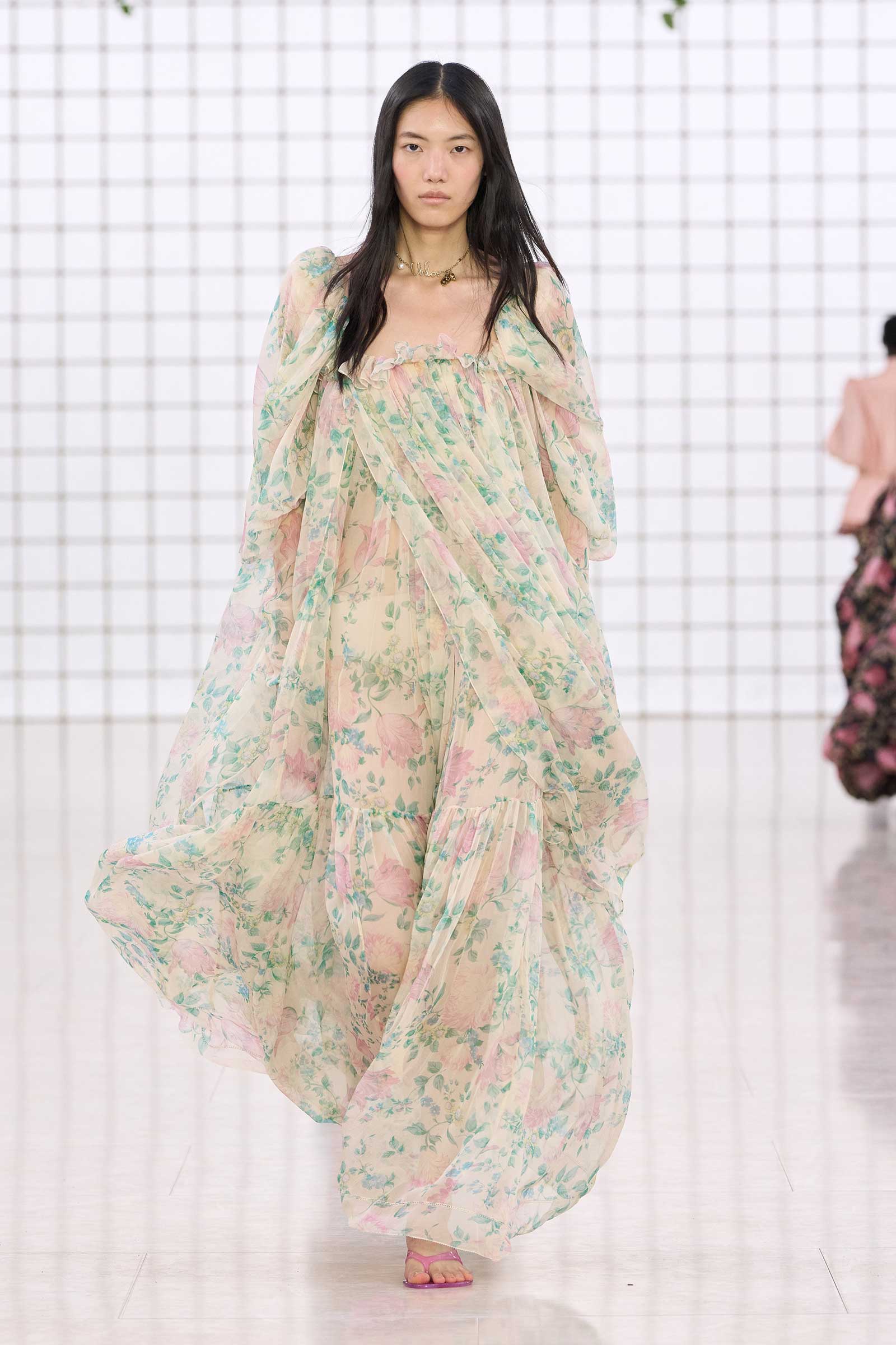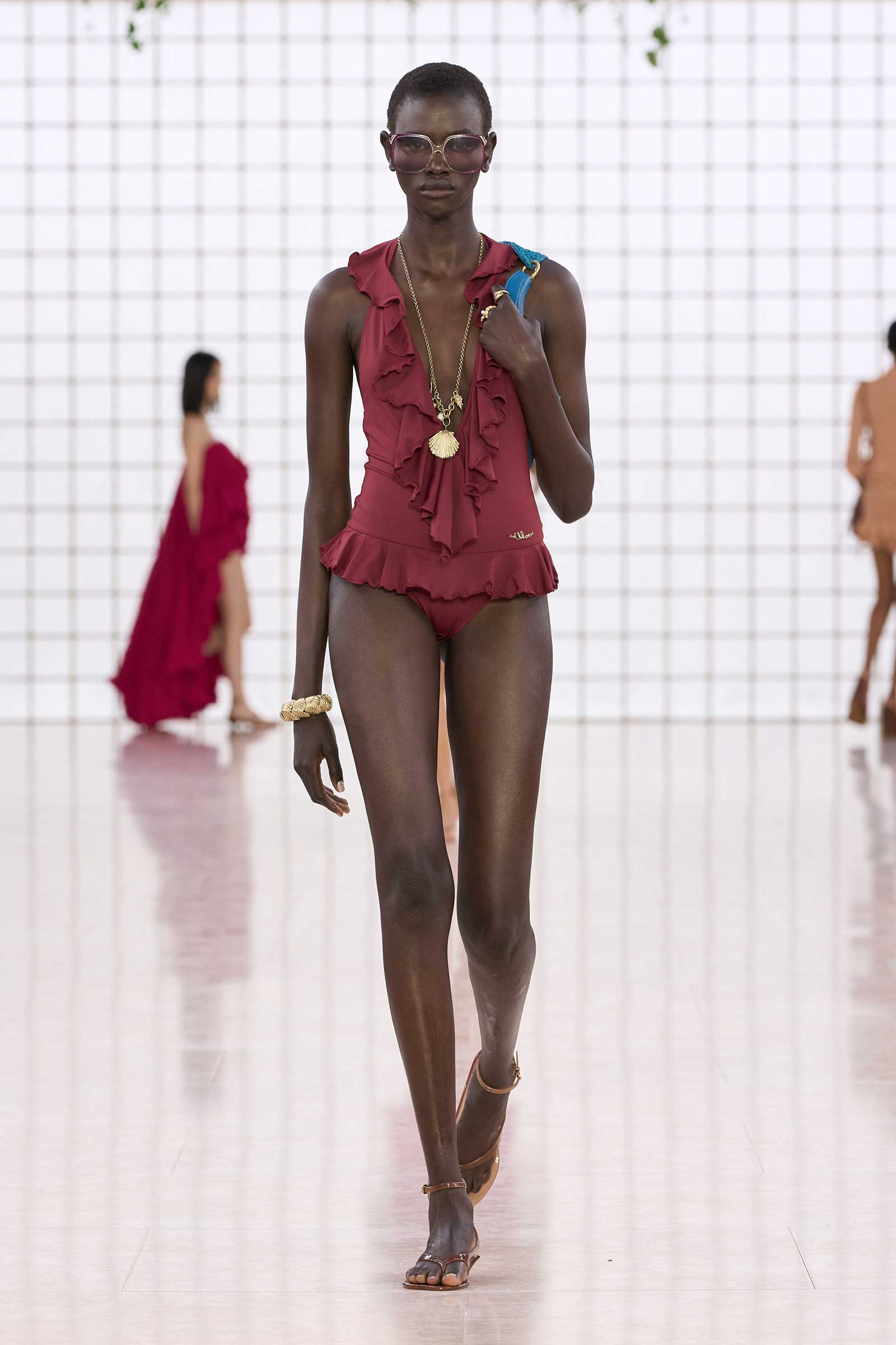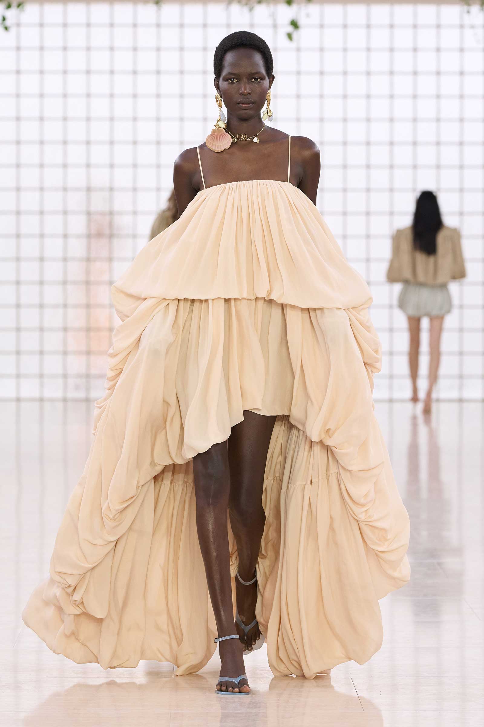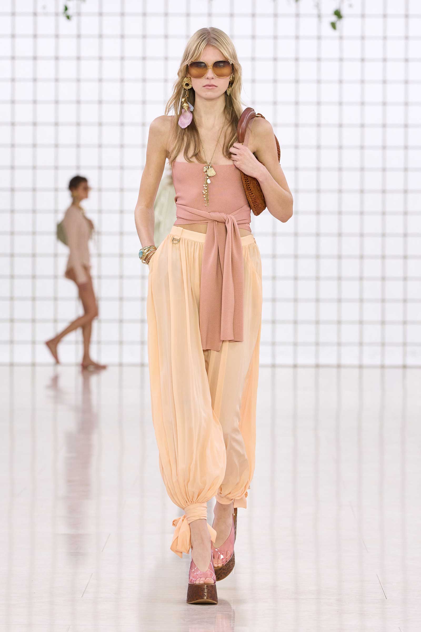 The collection was a confident evolution of her first outing, with more casual elements—like high-waist, flared jeans recalling Phoebe Philo’s for the brand circa spring 2004 and a pink flamingo bathing suit channeling the cheekiness of the Stella McCartney era—that may be easier access points for the brand than the ruffles and laces worn by the celebrities and models in the front row today. On that note, the little kitten-heel jelly sandals will also be a popular hit.