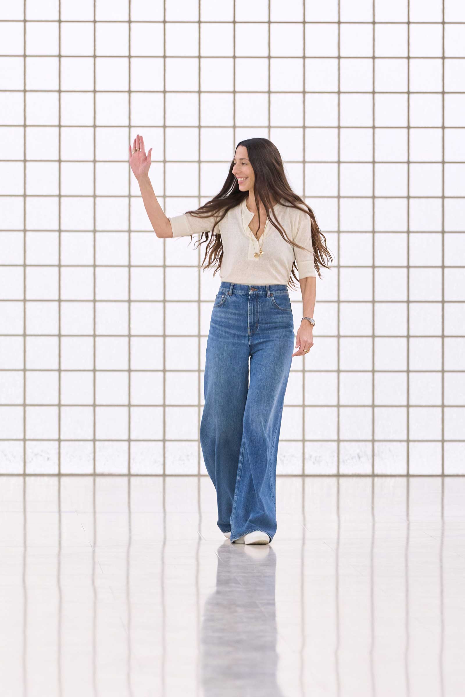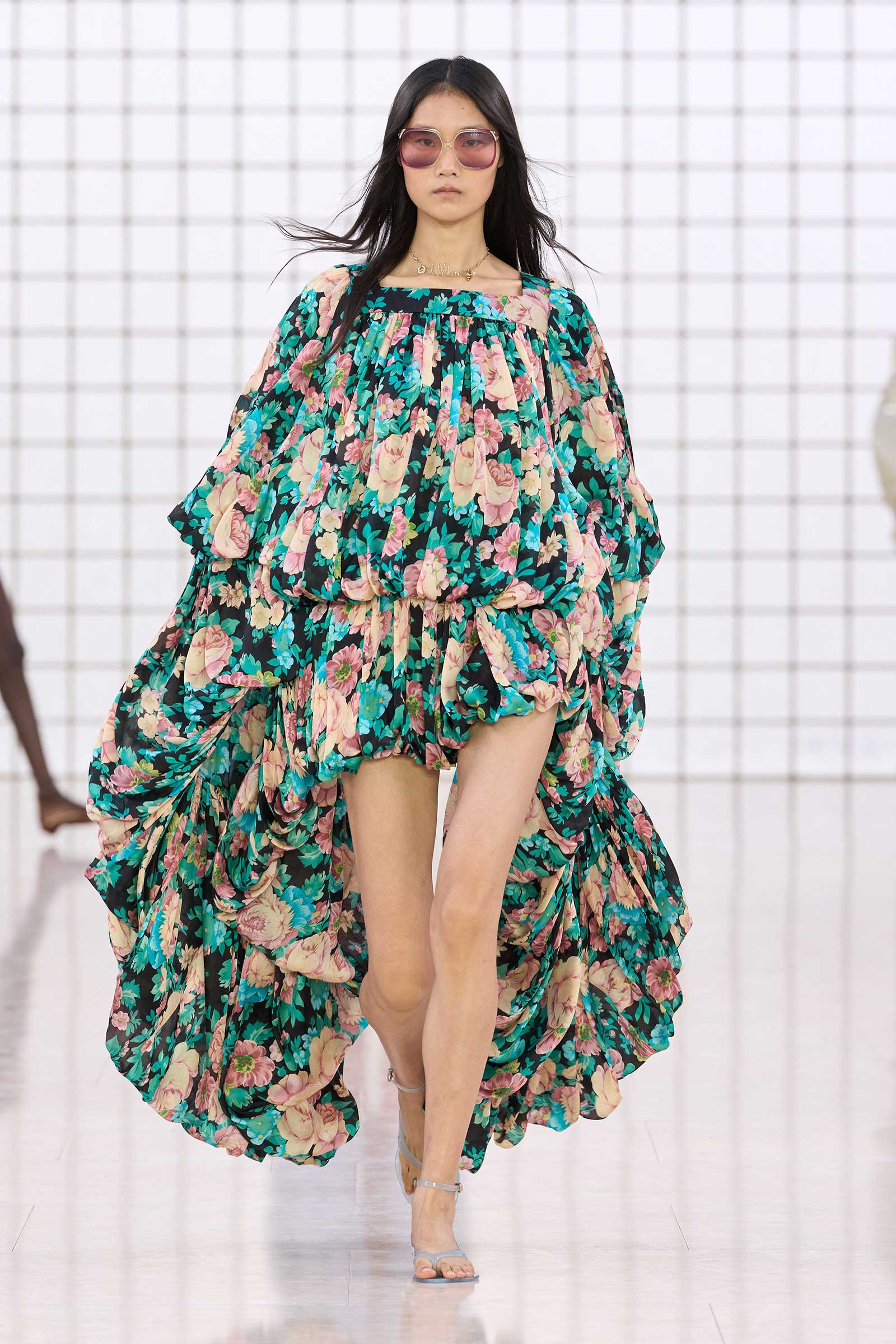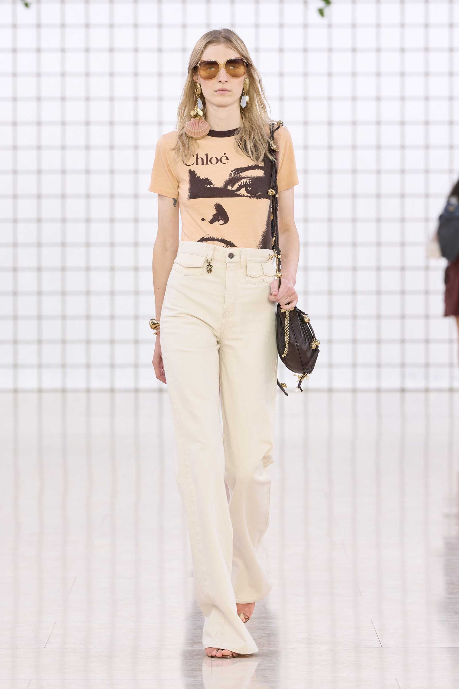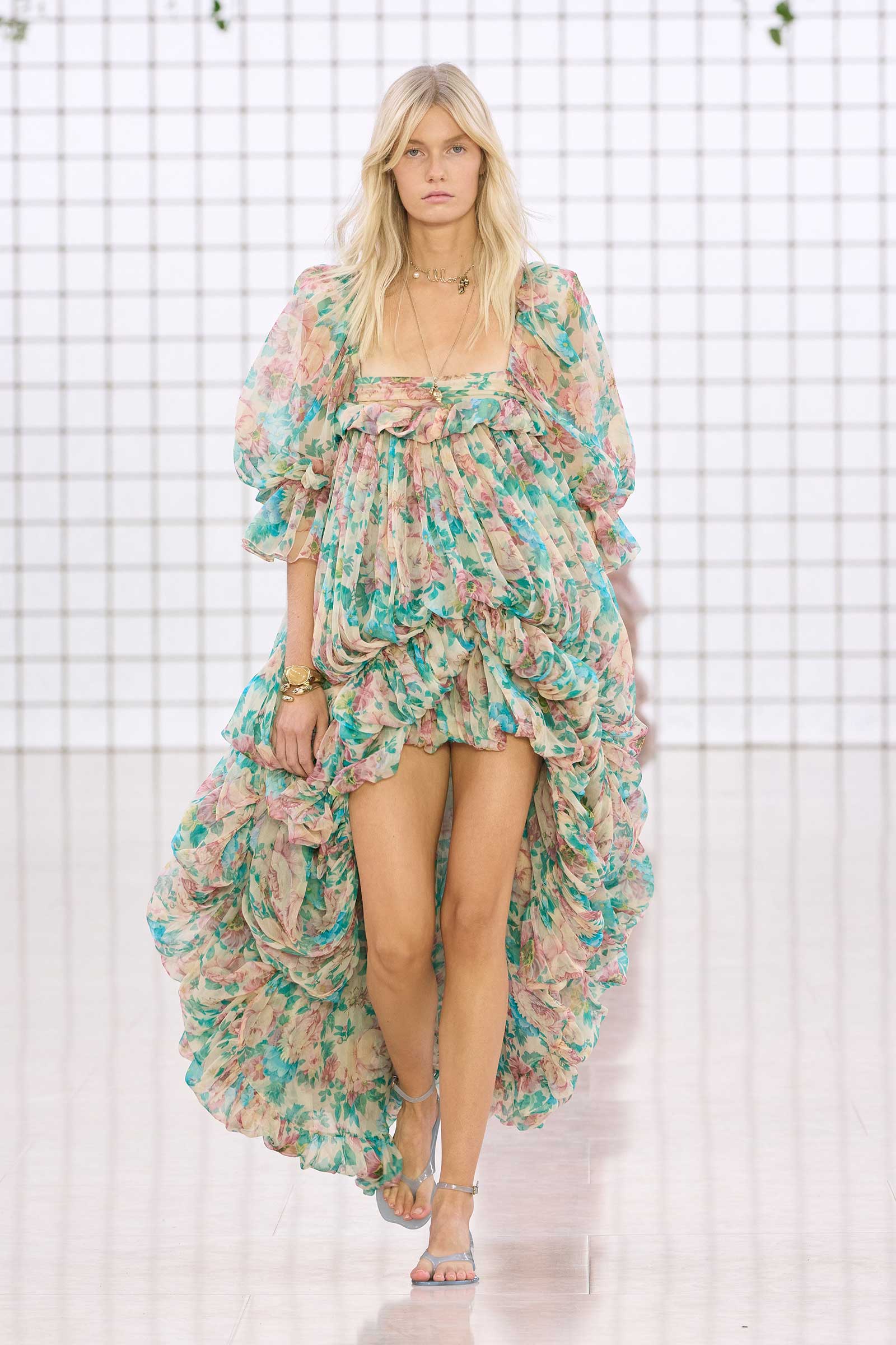 The collection was a confident evolution of her first outing, with more casual elements—like high-waist, flared jeans recalling Phoebe Philo’s for the brand circa spring 2004 and a pink flamingo bathing suit channeling the cheekiness of the Stella McCartney era—that may be easier access points for the brand than the ruffles and laces worn by the celebrities and models in the front row today. On that note, the little kitten-heel jelly sandals will also be a popular hit.