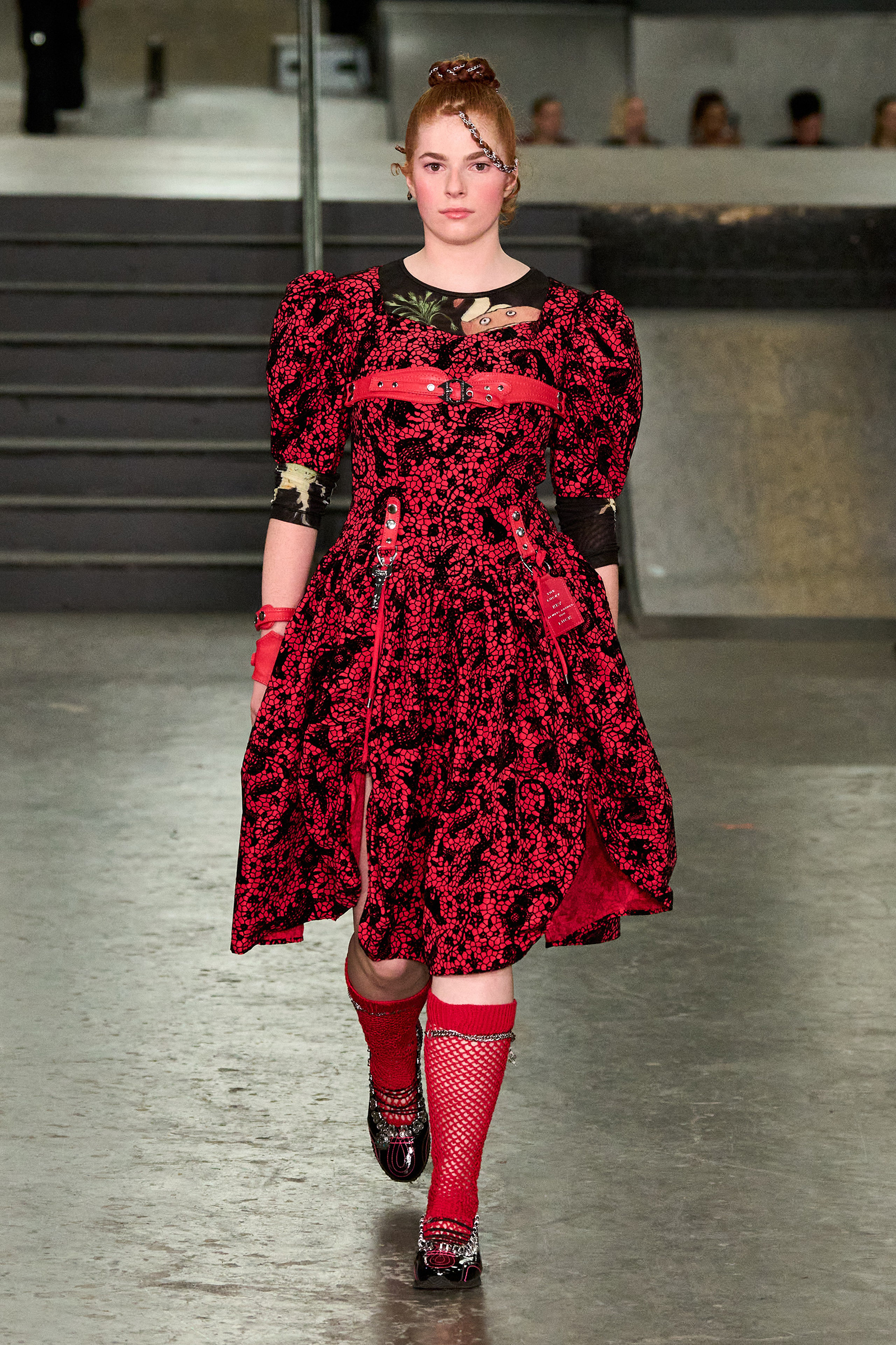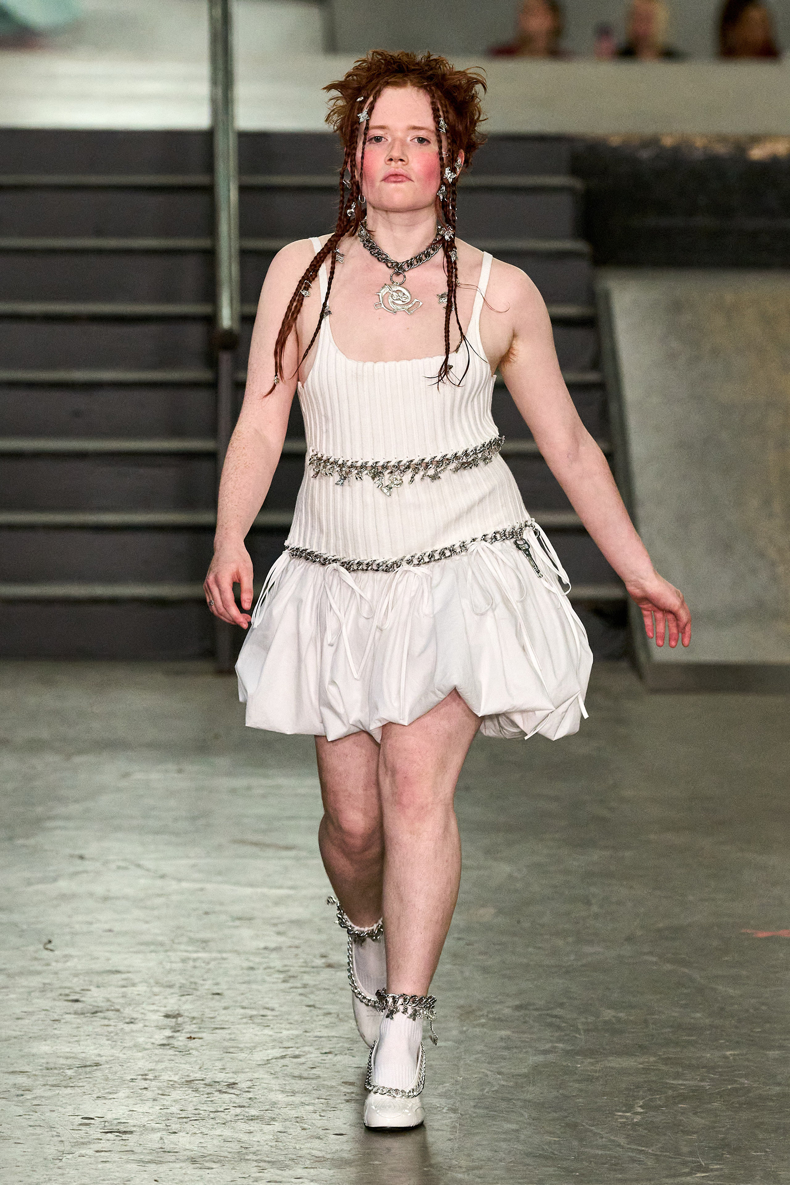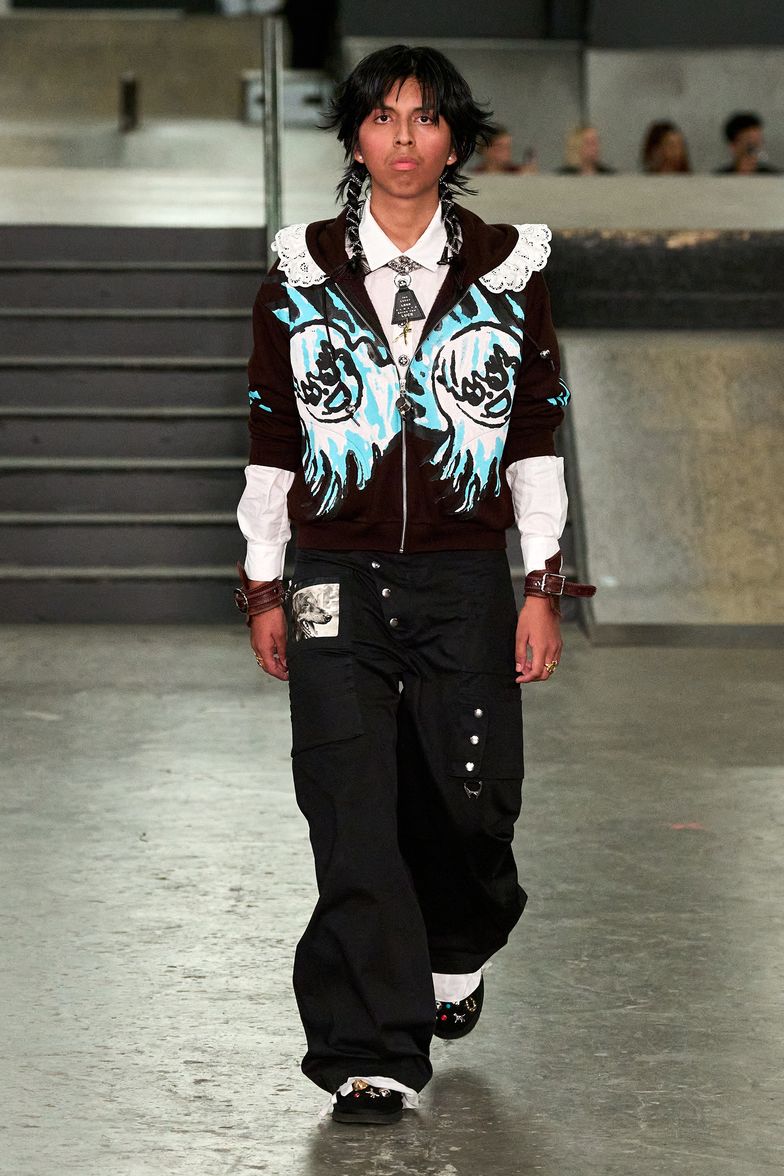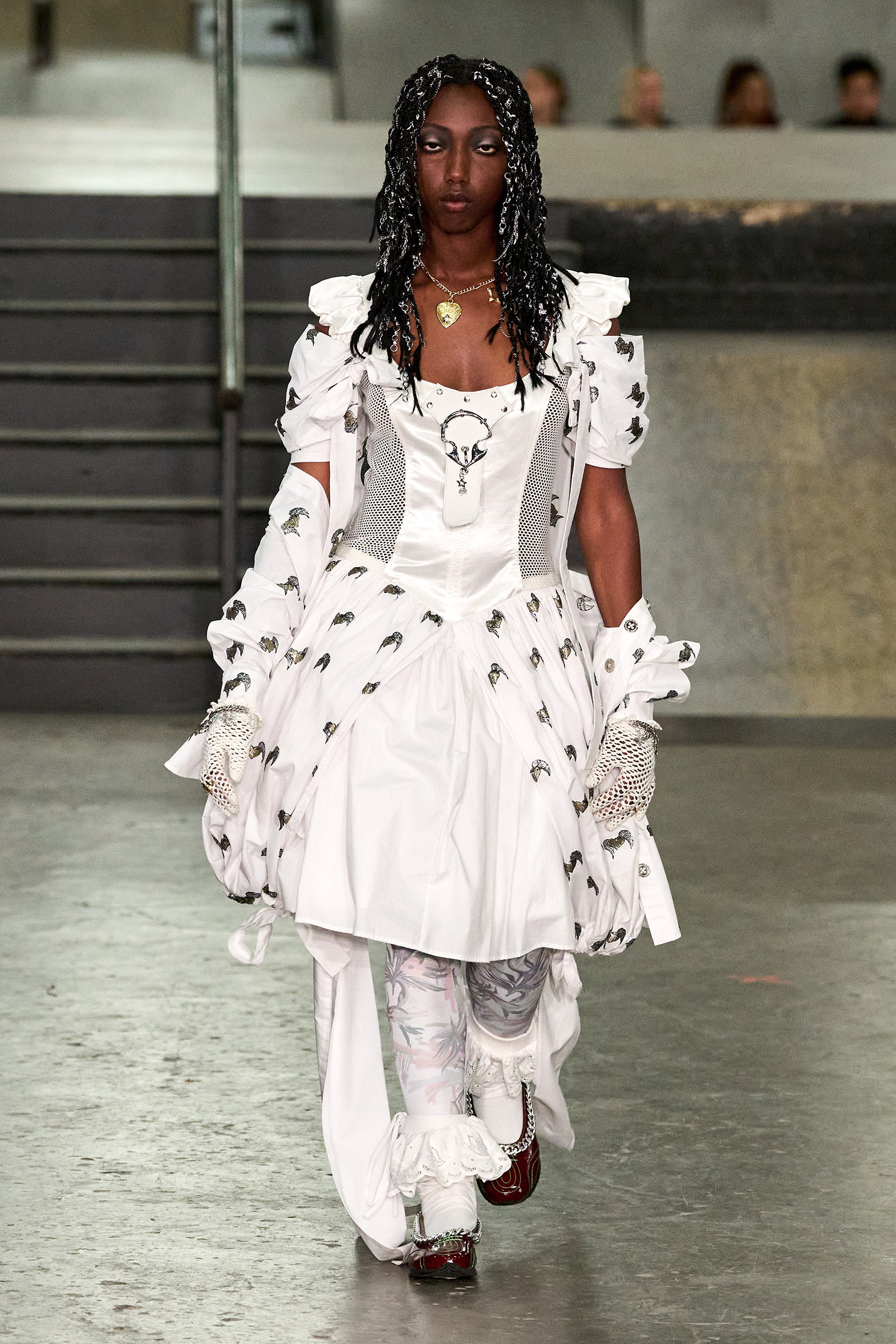 The designers had chosen the skatepark as an homage to the “skater boy you love” (that’s Bulgaria-born, New Jersey-raised Chopova) “or the boy you want to be” (Somerset-raised tomboy Lowena-Irons). Tony Hawk made his presence felt in plaid pajama pants, graphic zip-up hoodies, board shorts and studded Ugg boots, part of a collaboration with the brand. The rest referenced the ancient Flora Day festival, held every May in the village of Helston in Cornwall, on England’s wild south-west coast. Comprising numerous processions and dances, including mermaids and maidens, angels and devils (this reporter was sat in the ‘Devil Girl Block,’ which makes a change from ‘Block C’), it manifested in hand-embroidered broderie anglaise dresses, thick leather belts and a pair of knickers adorned with hundreds of beads and charms, and a particularly fabulous jacket made of white crispy ribbons like those you’d see on draped across a wedding car.