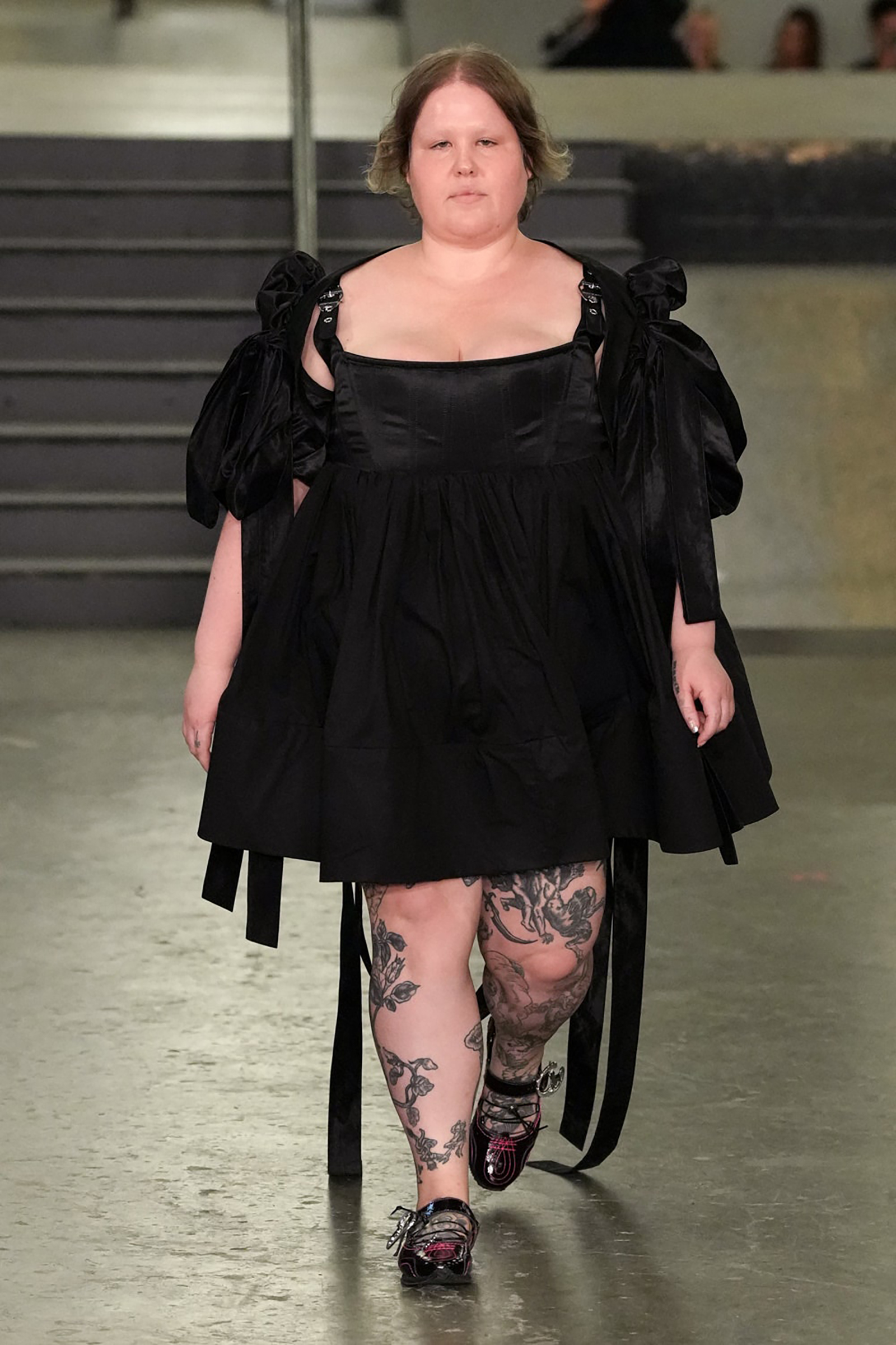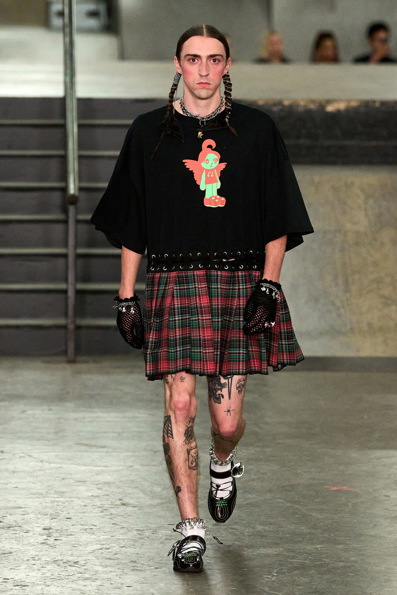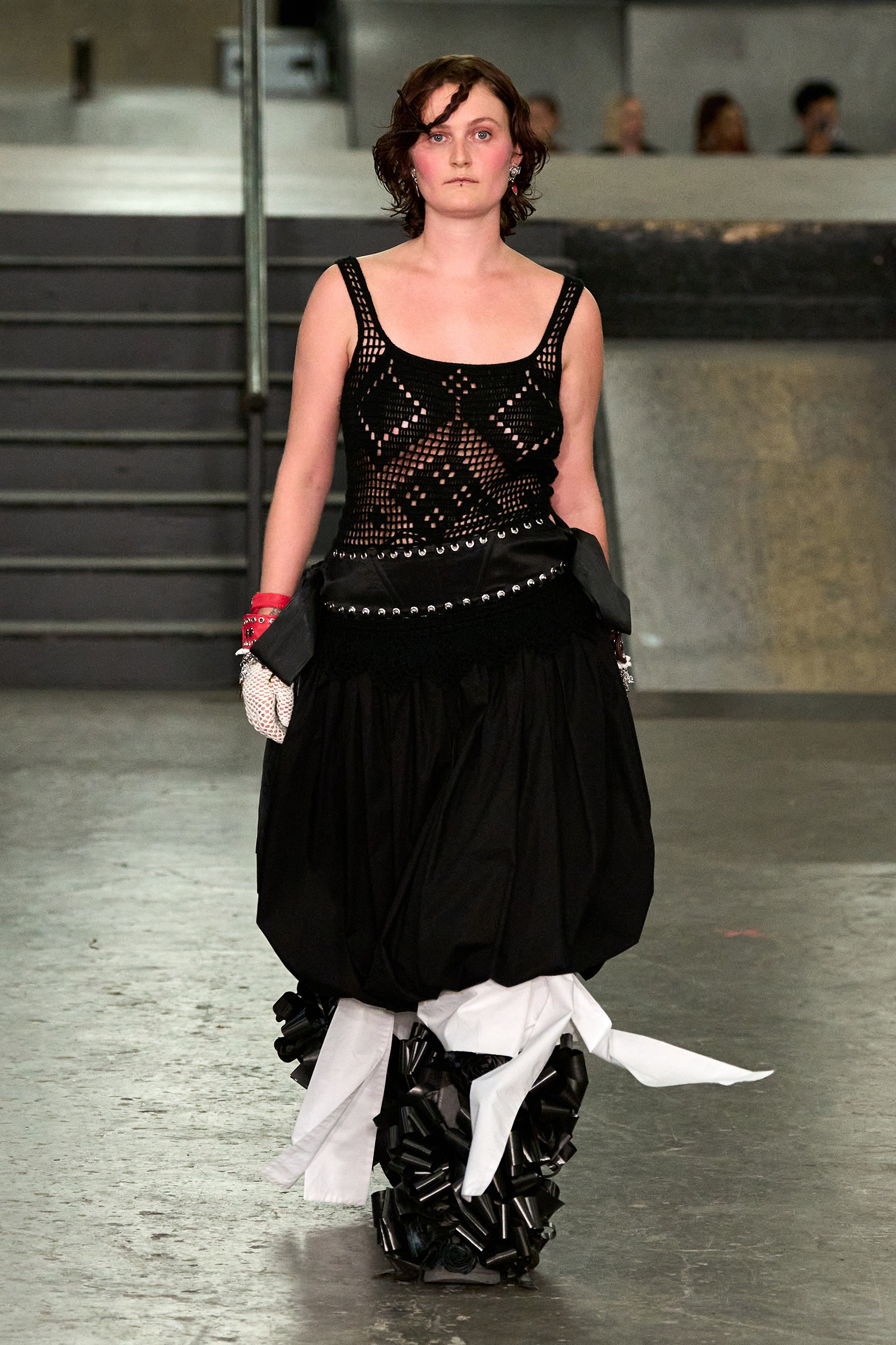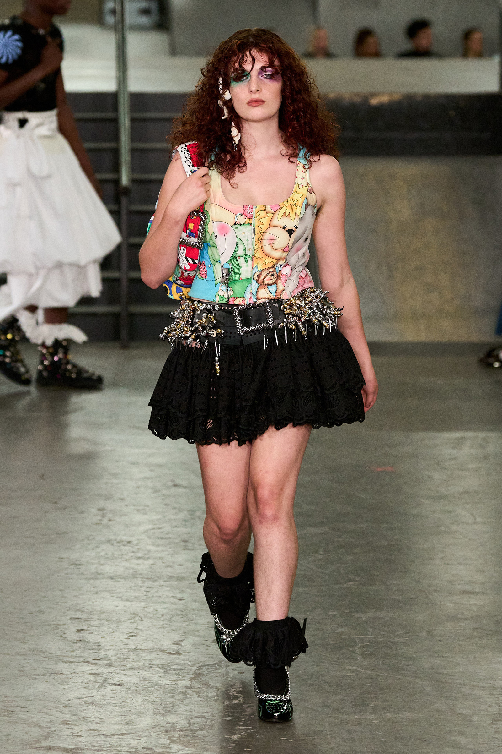 The designers had chosen the skatepark as an homage to the “skater boy you love” (that’s Bulgaria-born, New Jersey-raised Chopova) “or the boy you want to be” (Somerset-raised tomboy Lowena-Irons). Tony Hawk made his presence felt in plaid pajama pants, graphic zip-up hoodies, board shorts and studded Ugg boots, part of a collaboration with the brand. The rest referenced the ancient Flora Day festival, held every May in the village of Helston in Cornwall, on England’s wild south-west coast. Comprising numerous processions and dances, including mermaids and maidens, angels and devils (this reporter was sat in the ‘Devil Girl Block,’ which makes a change from ‘Block C’), it manifested in hand-embroidered broderie anglaise dresses, thick leather belts and a pair of knickers adorned with hundreds of beads and charms, and a particularly fabulous jacket made of white crispy ribbons like those you’d see on draped across a wedding car.