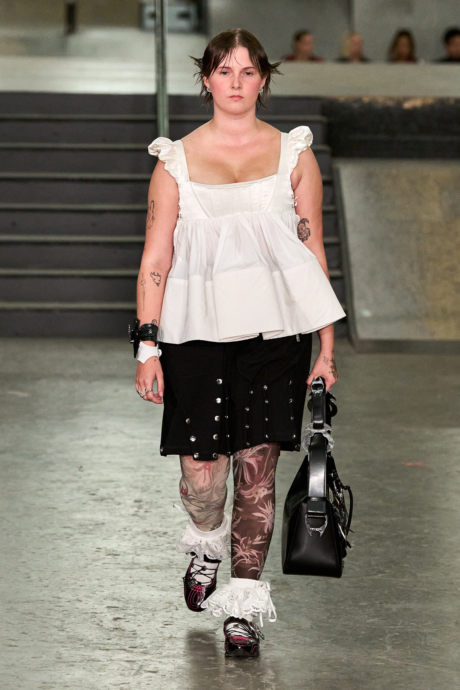 To a concrete skatepark under the Westway for Chopova Lowena’s sophomore show, on a balmy Friday night one year on from a runway debut that many dubbed the highlight of London’s spring 2023 schedule. The duo behind the brand, Emma Chopova and Laura Lowena-Irons, could have been forgiven for feeling the nerves—expectations were running high after that joyful first outing. But these two are nothing if not prepared. Plus, as Chopova pointed out in a preview two days before the show: “It feels like maybe this collection is better than that one was, because we’ve grown or something.”