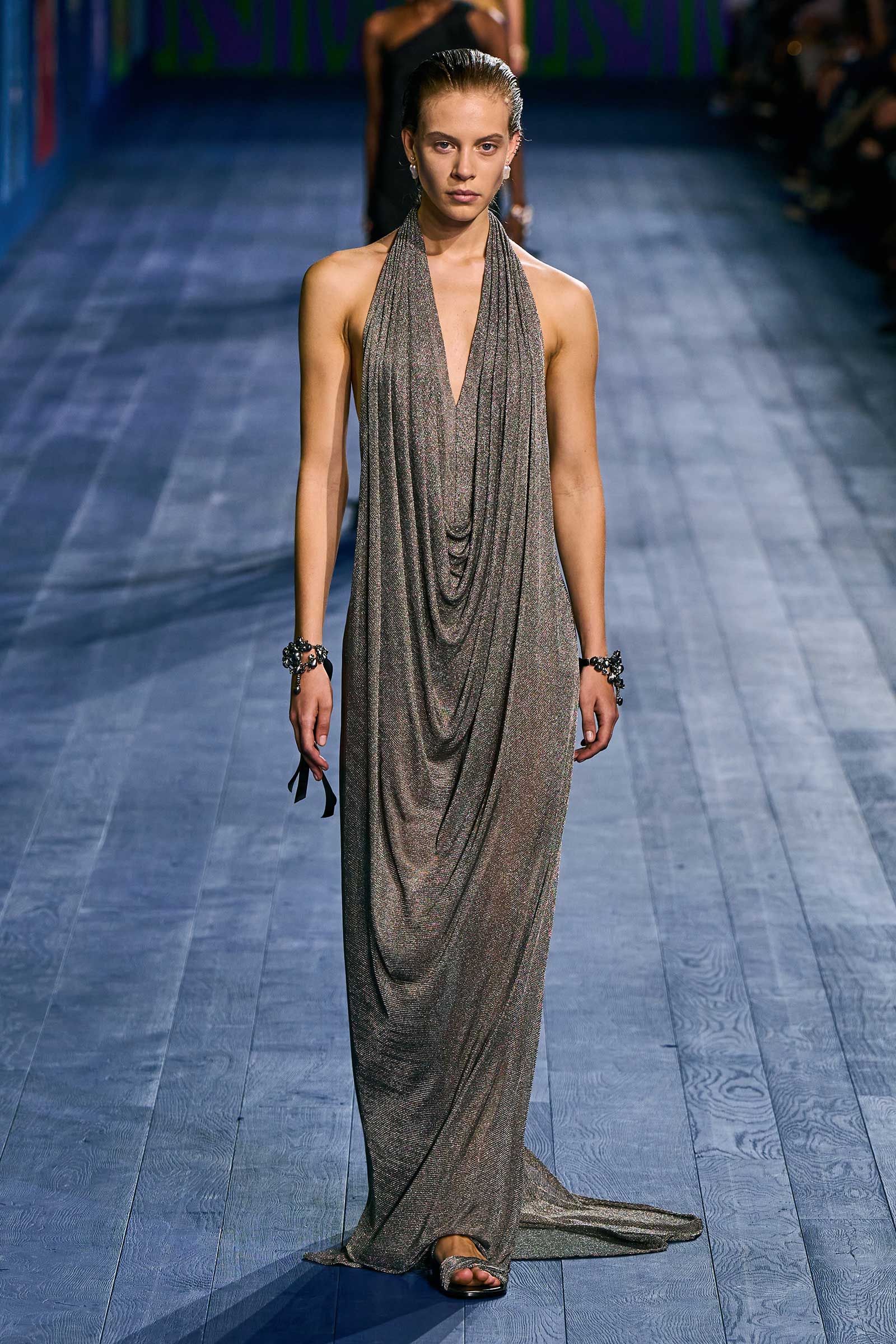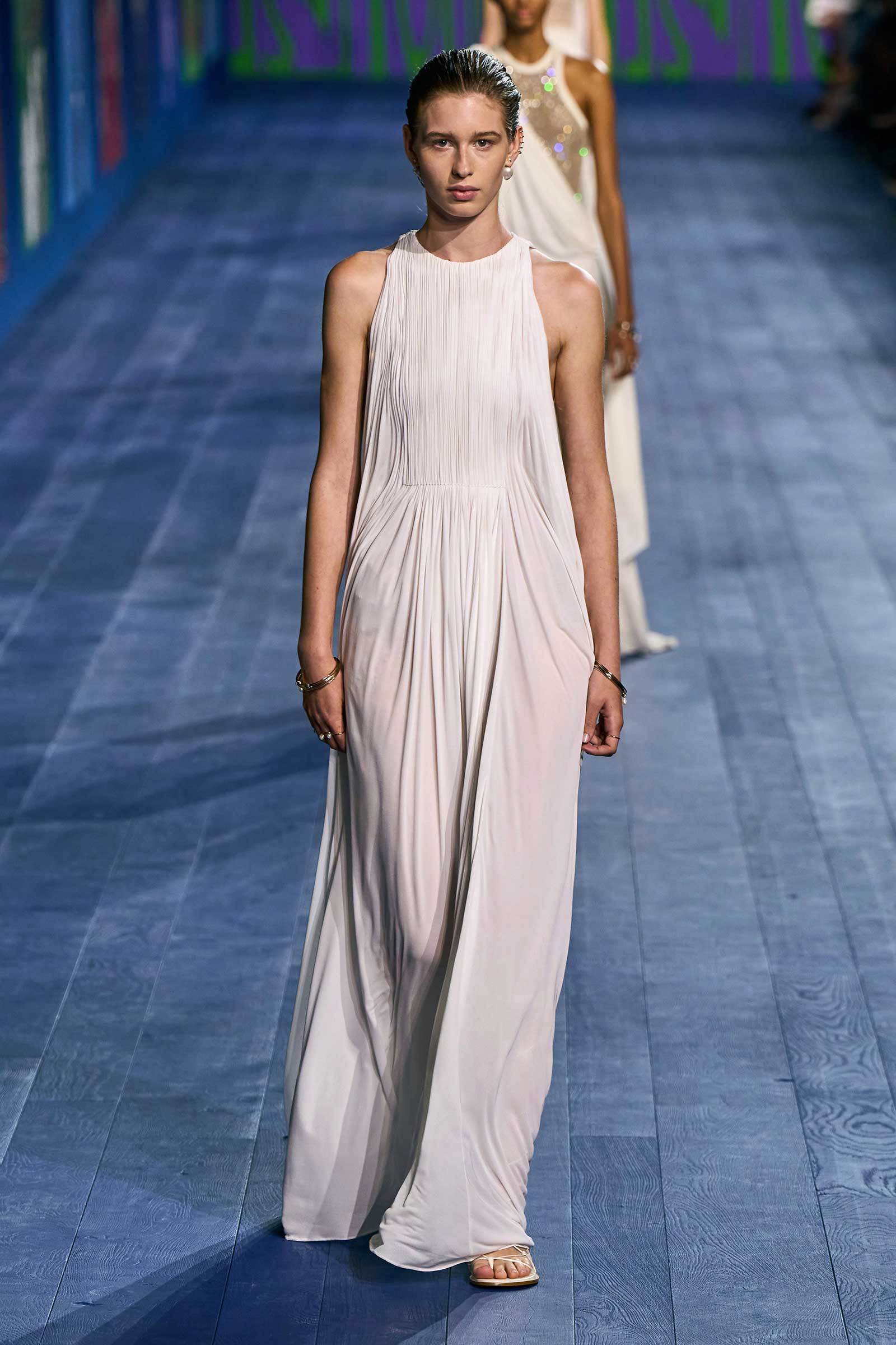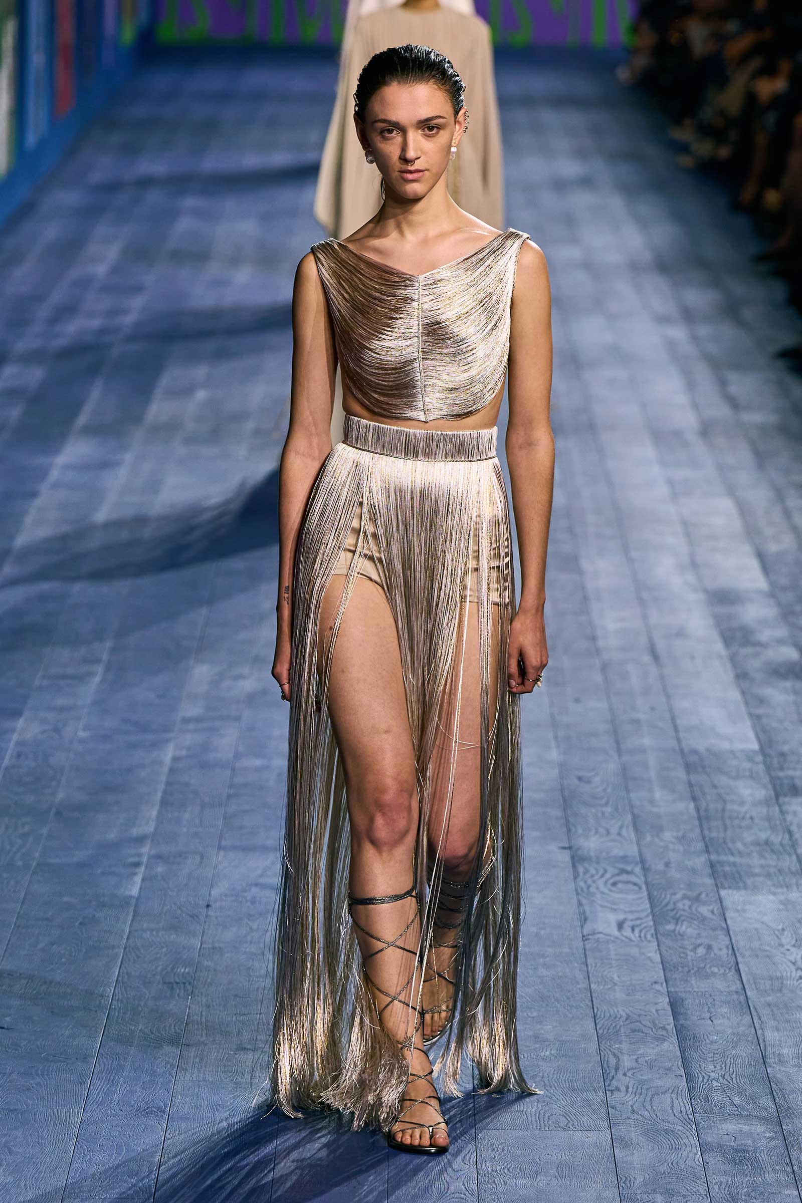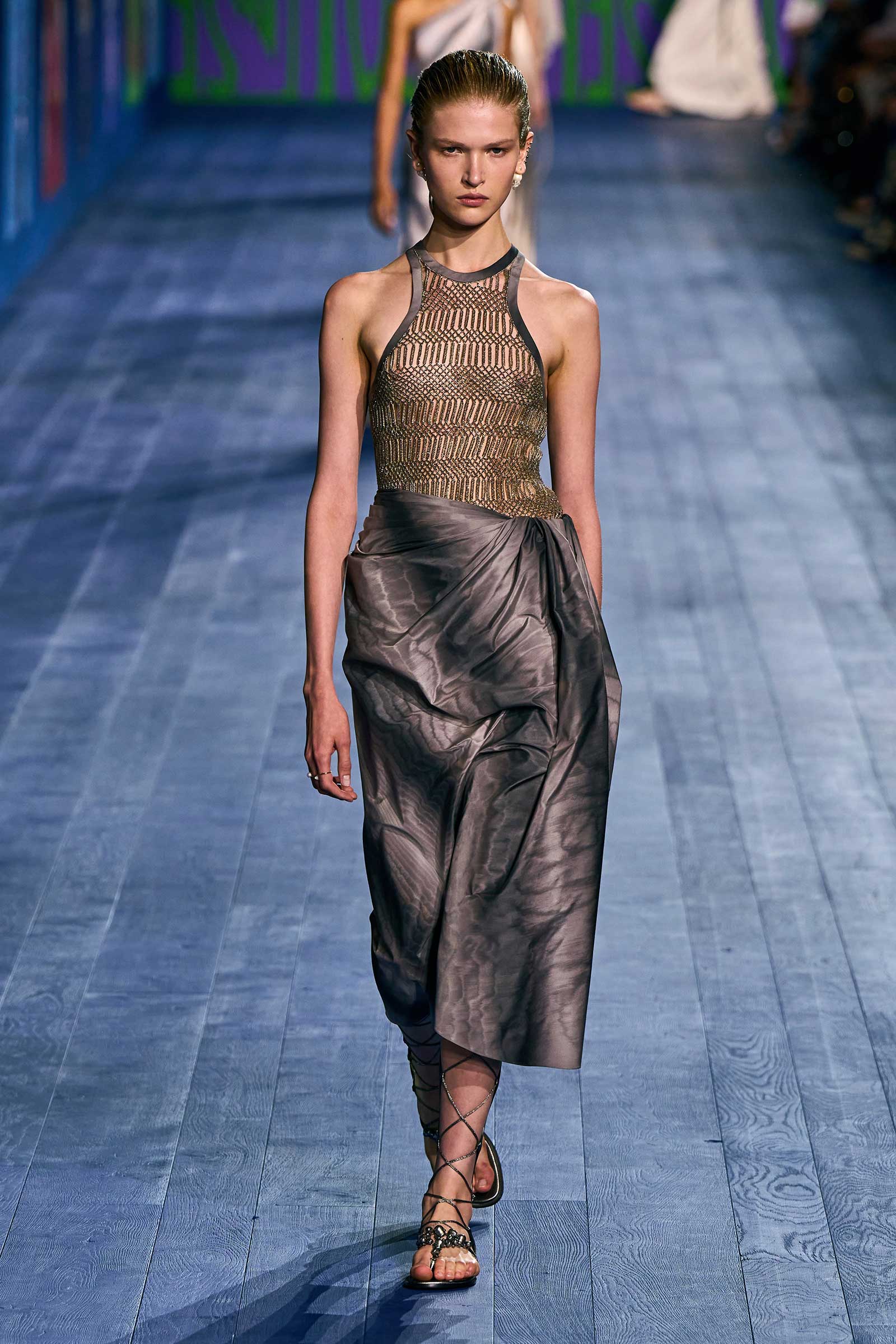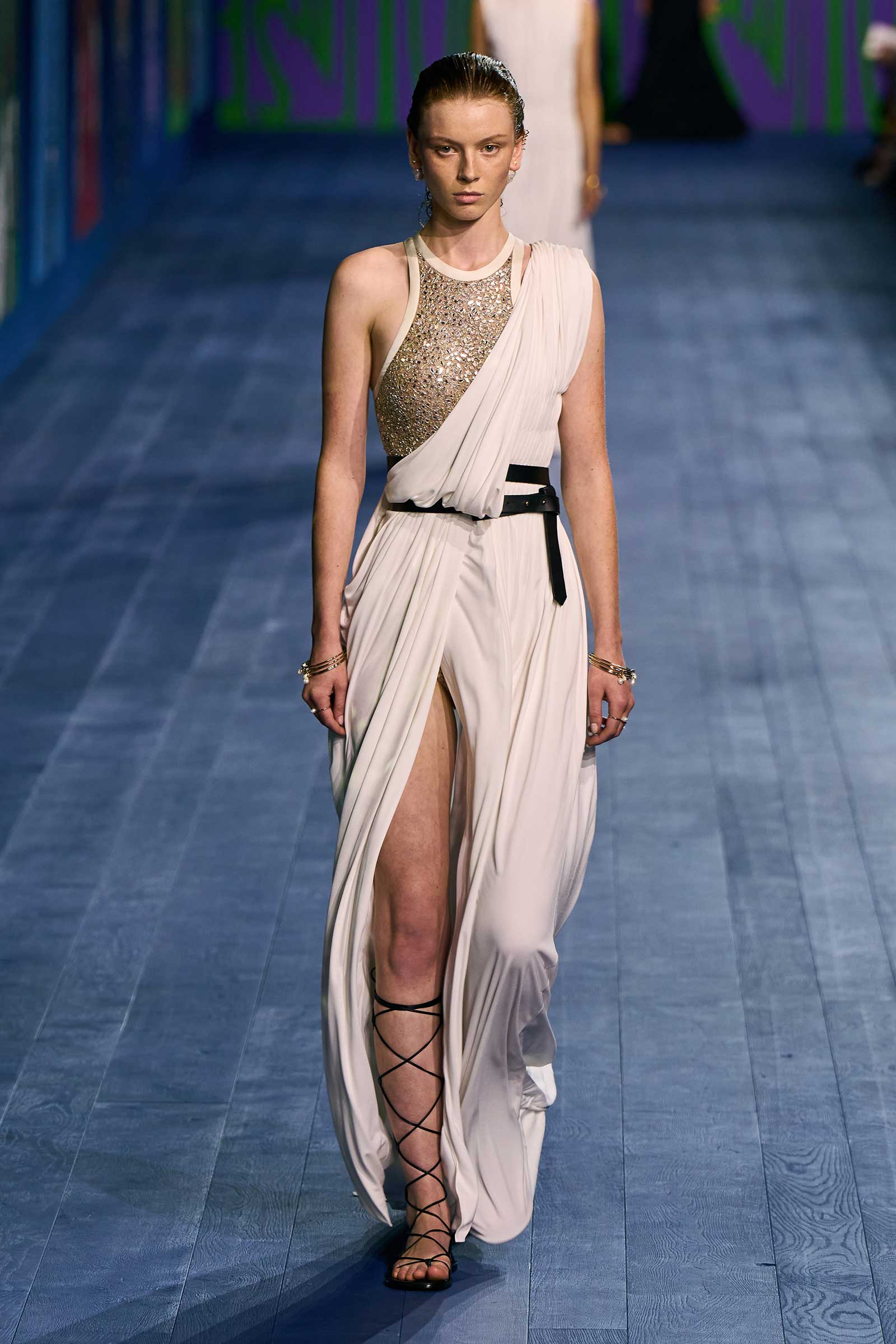 She returned to the peplos, a traditional draped garment Dior himself cut in chiffon; Chiuri pointed to a ravishing photograph of just such a dress from 1948. Hers were constructed in silk jersey or metal jersey, and instead of anchoring them to a corset, she used embroidered tank tops and bodysuits that utterly changed the attitude. Though they remained formal, they looked free, a quality enhanced by the models’ strappy skimmer sandals. Maybe you couldn’t wear them for the high jump—one of the track and field competitions added in 1928—but I bet you could throw the javelin, a sport that was only added to official competition later.
