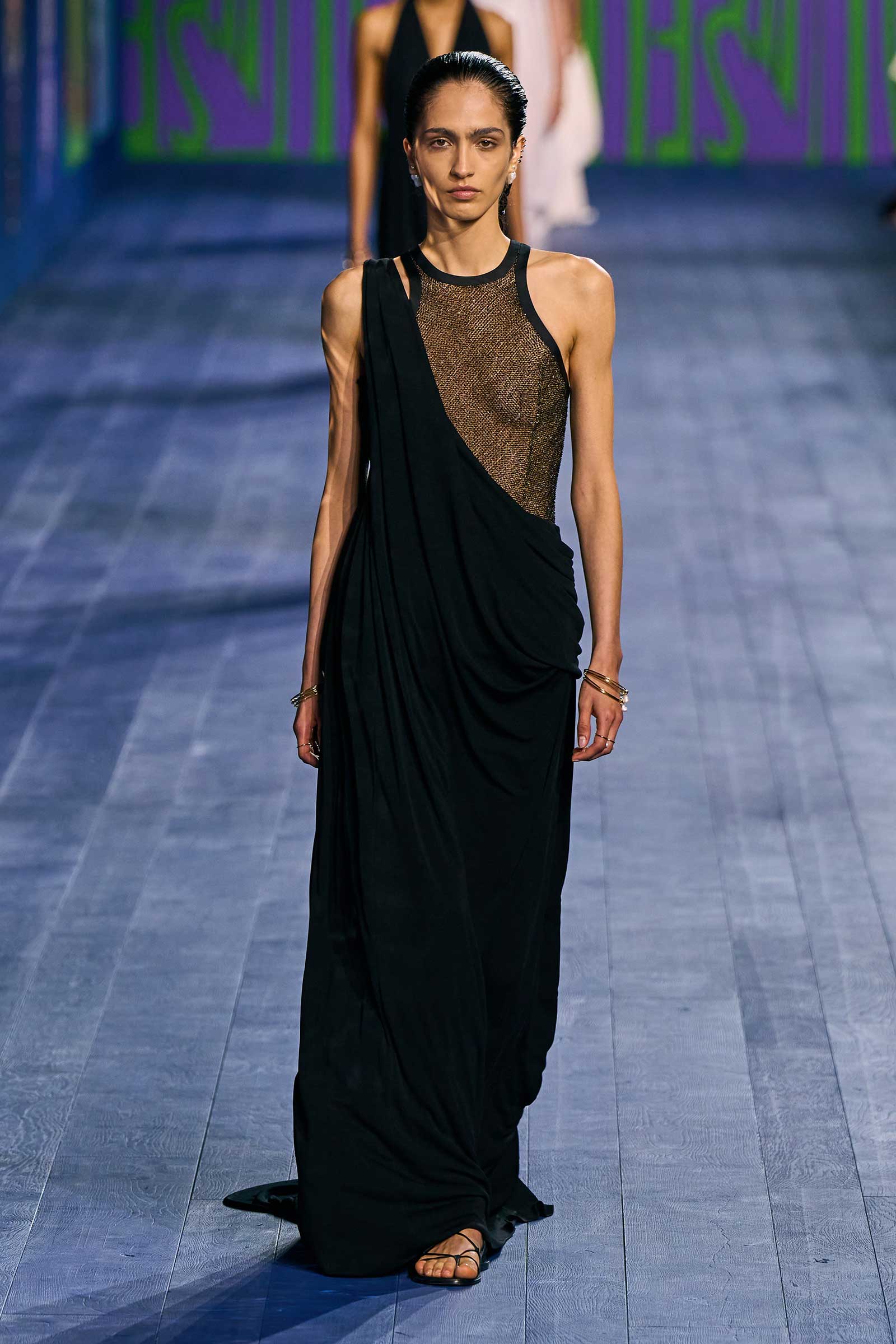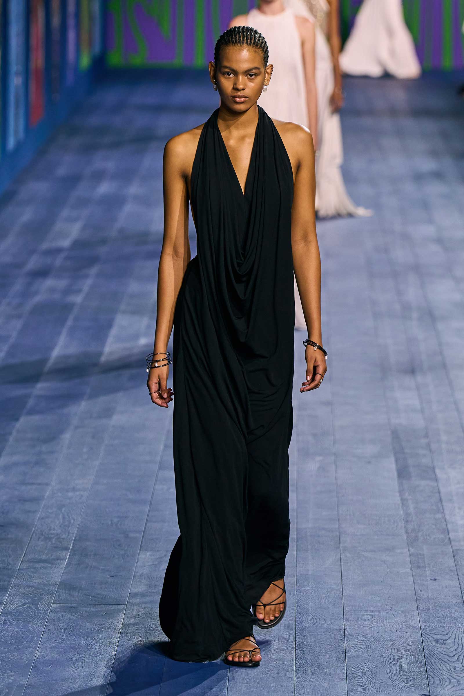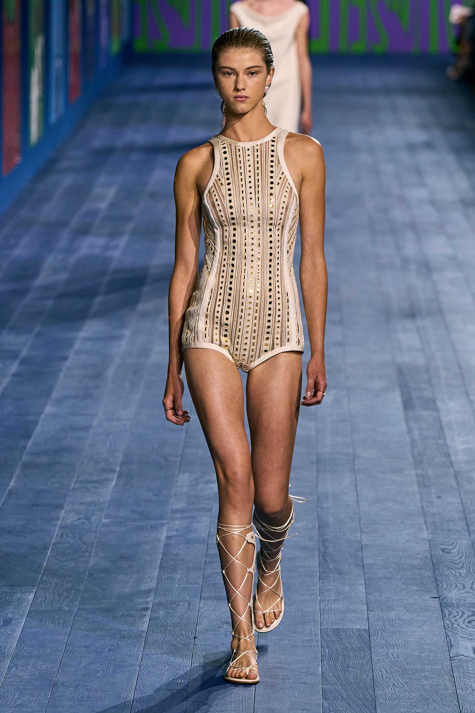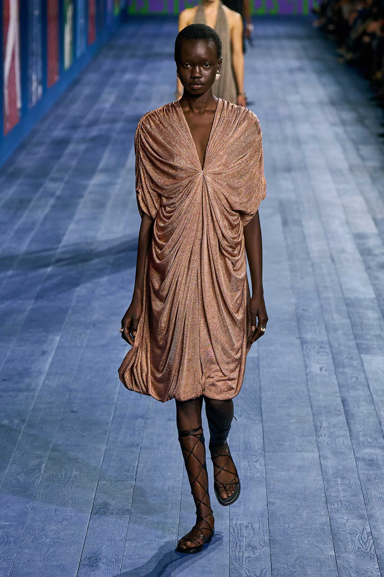 She returned to the peplos, a traditional draped garment Dior himself cut in chiffon; Chiuri pointed to a ravishing photograph of just such a dress from 1948. Hers were constructed in silk jersey or metal jersey, and instead of anchoring them to a corset, she used embroidered tank tops and bodysuits that utterly changed the attitude. Though they remained formal, they looked free, a quality enhanced by the models’ strappy skimmer sandals. Maybe you couldn’t wear them for the high jump—one of the track and field competitions added in 1928—but I bet you could throw the javelin, a sport that was only added to official competition later.