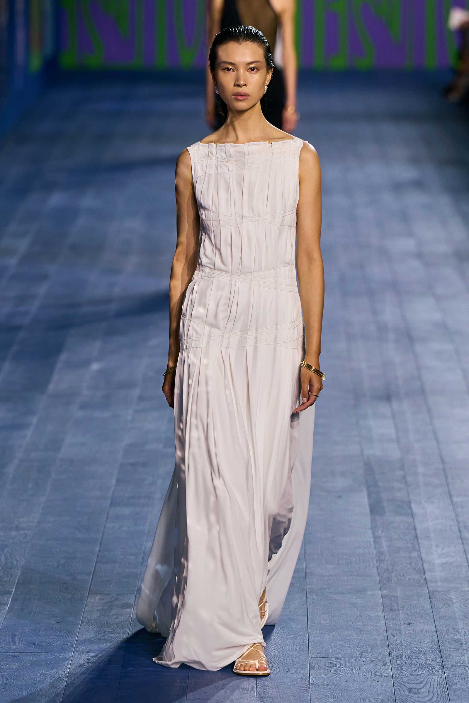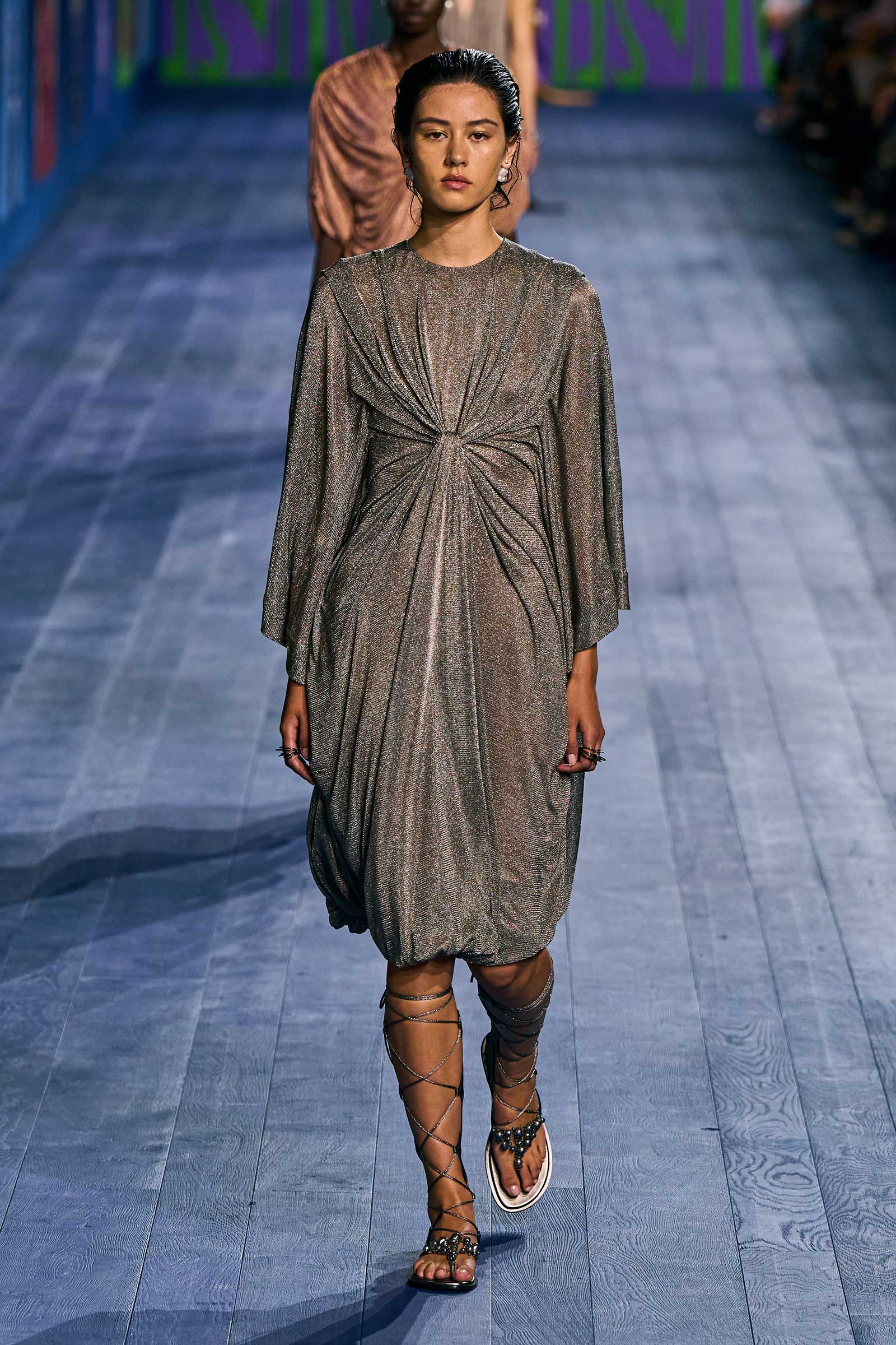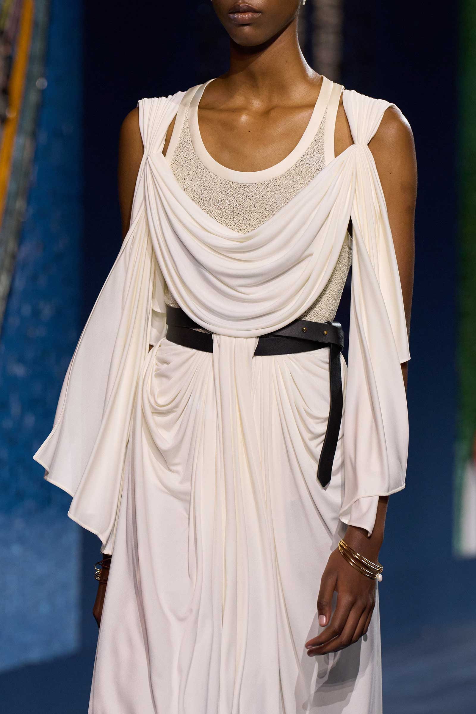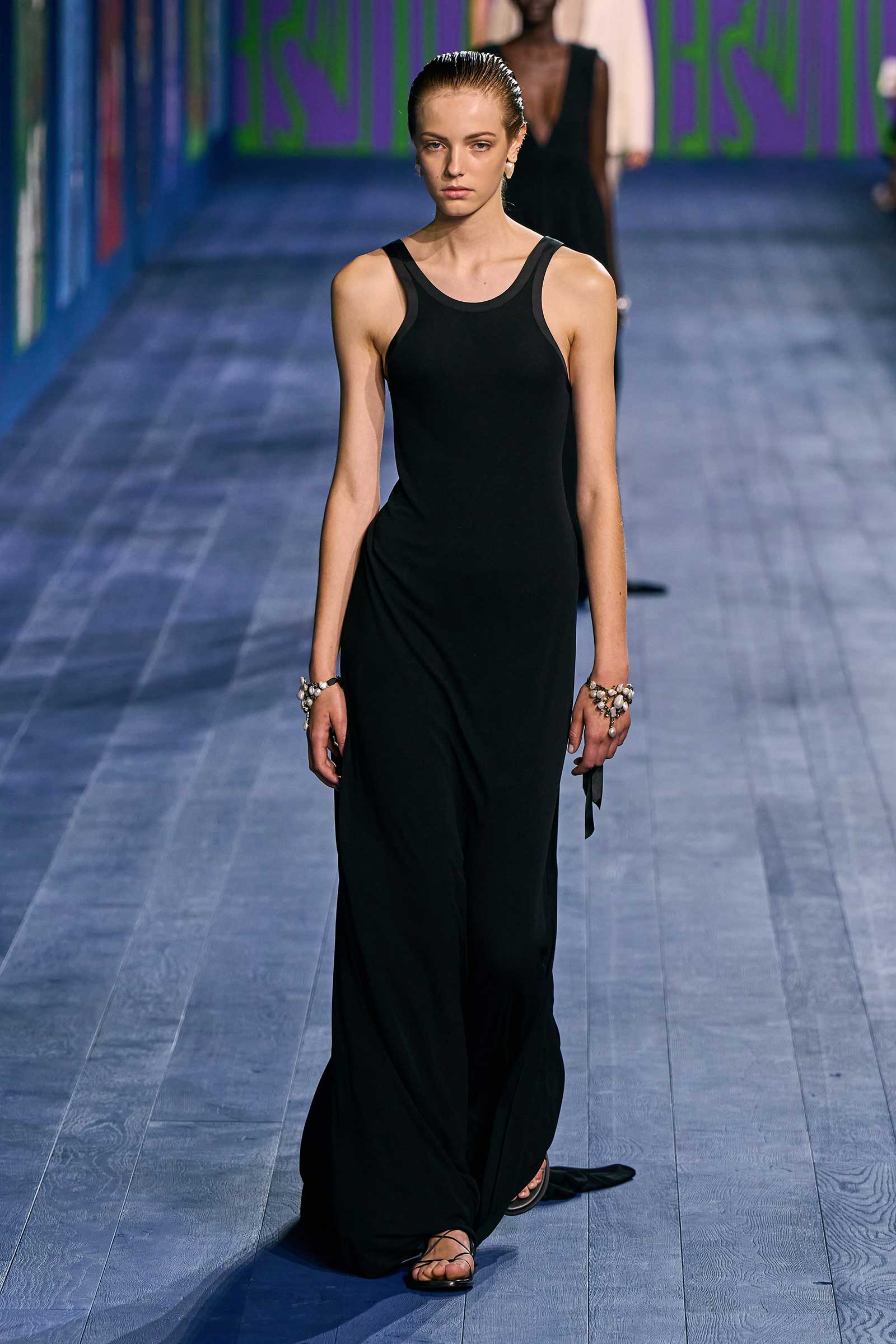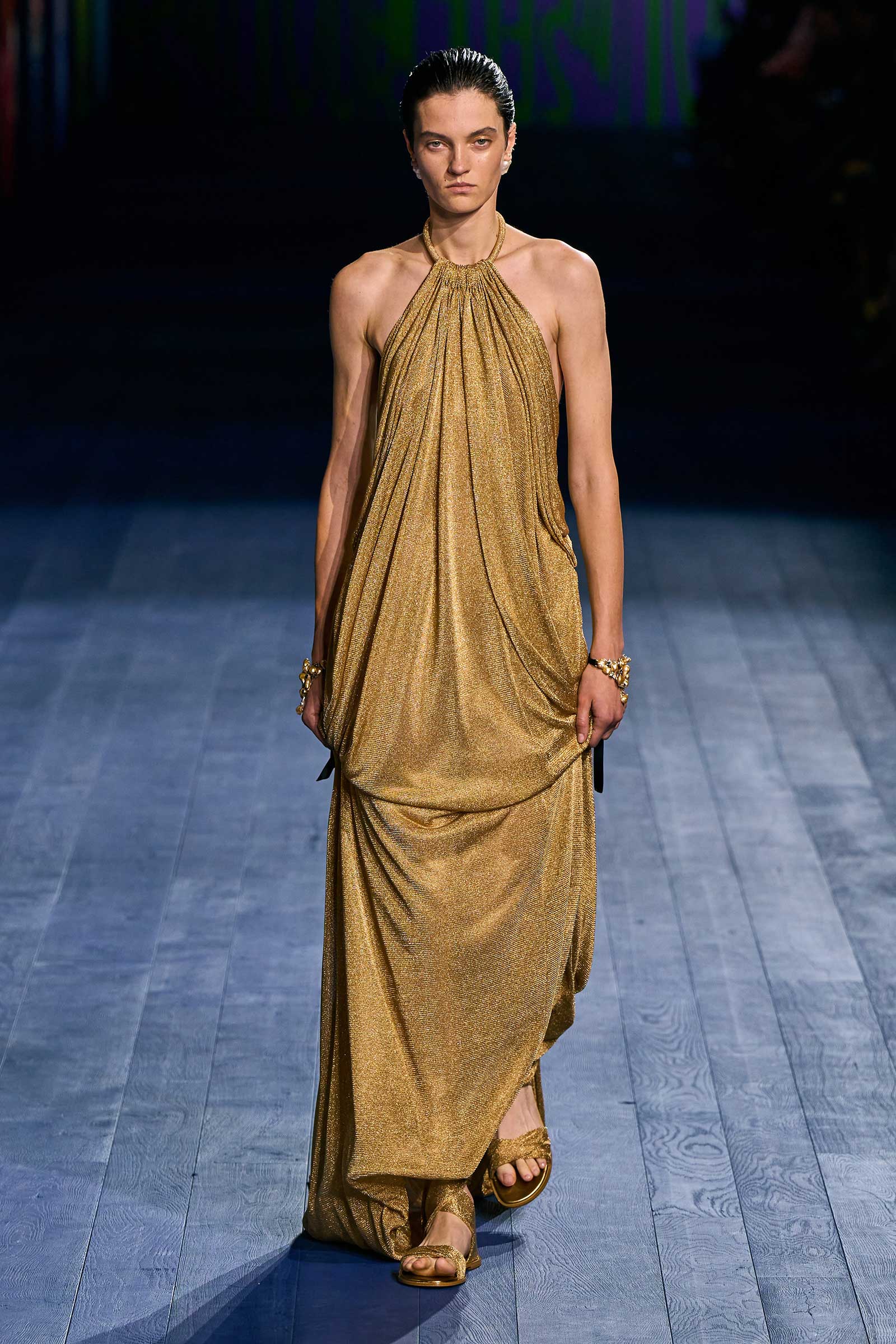 She returned to the peplos, a traditional draped garment Dior himself cut in chiffon; Chiuri pointed to a ravishing photograph of just such a dress from 1948. Hers were constructed in silk jersey or metal jersey, and instead of anchoring them to a corset, she used embroidered tank tops and bodysuits that utterly changed the attitude. Though they remained formal, they looked free, a quality enhanced by the models’ strappy skimmer sandals. Maybe you couldn’t wear them for the high jump—one of the track and field competitions added in 1928—but I bet you could throw the javelin, a sport that was only added to official competition later.