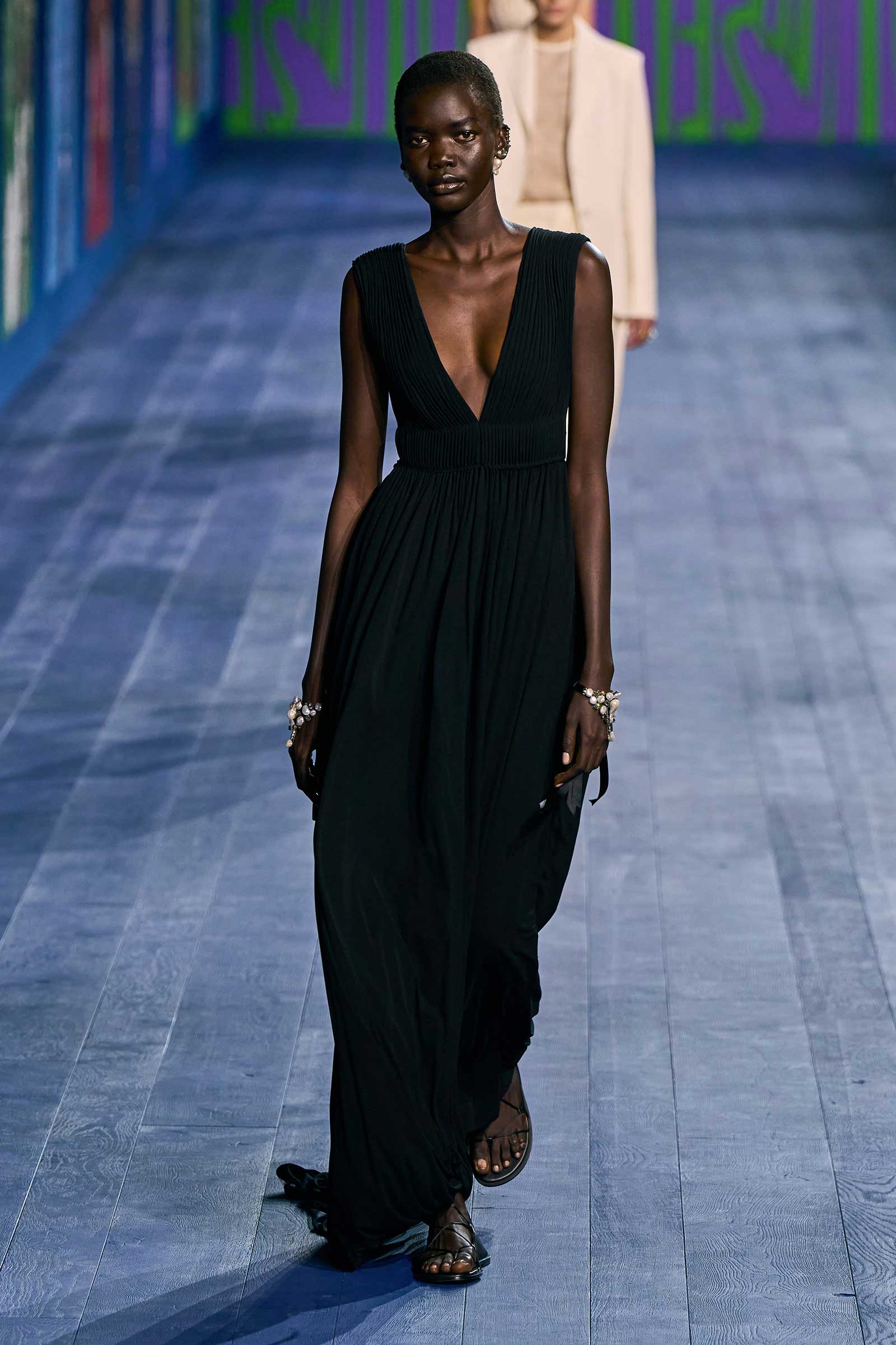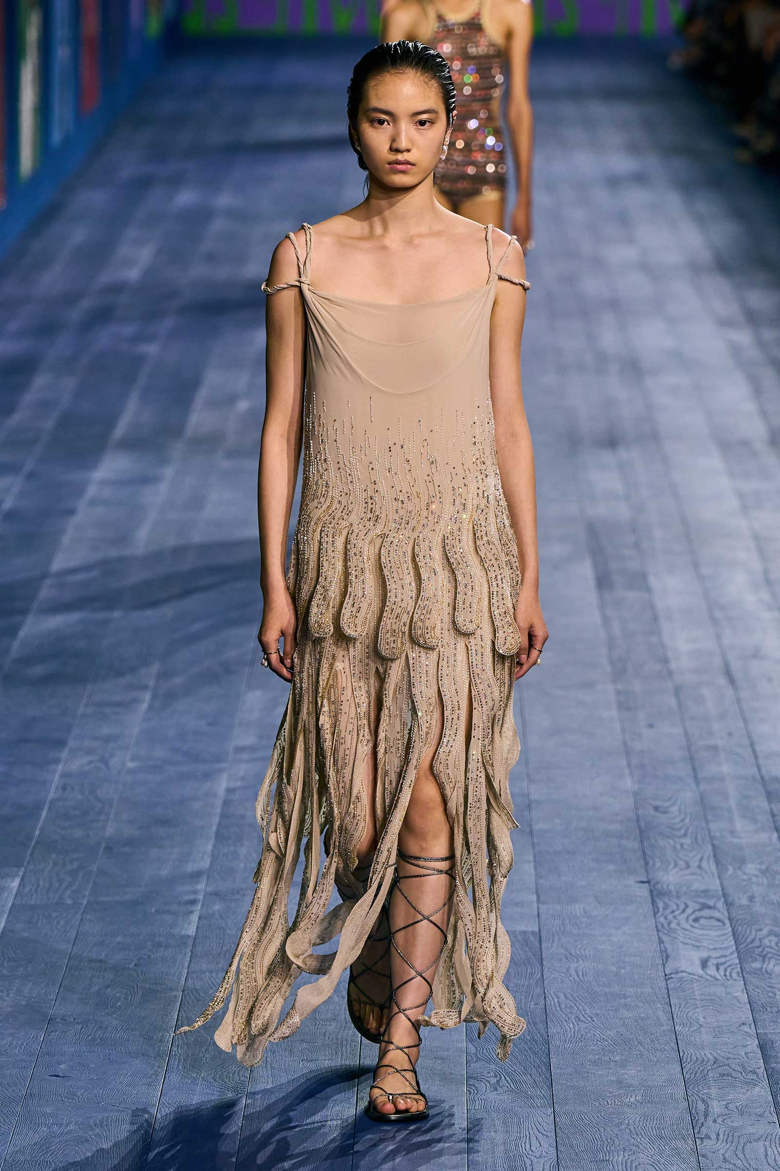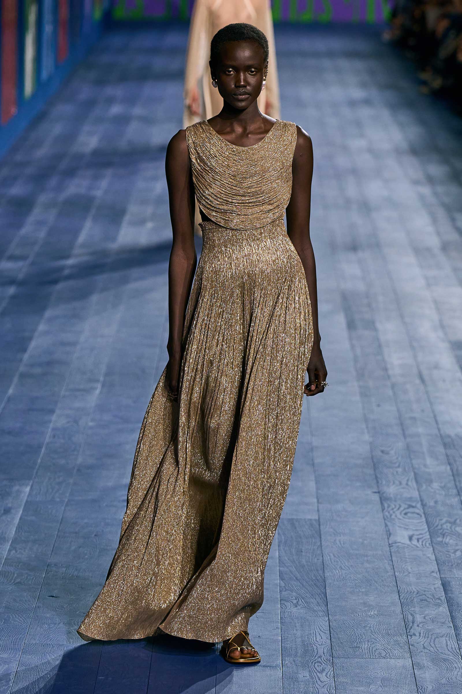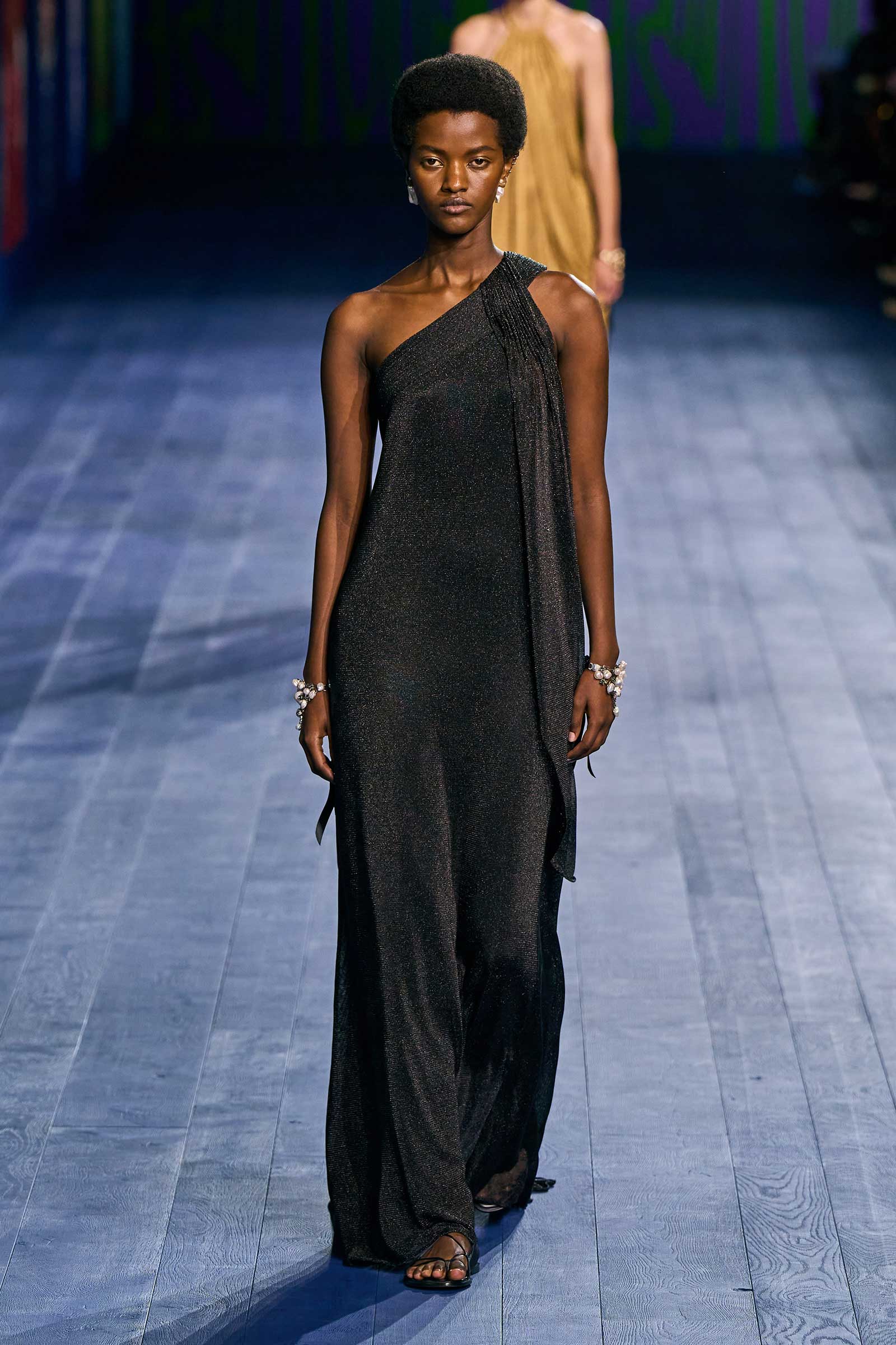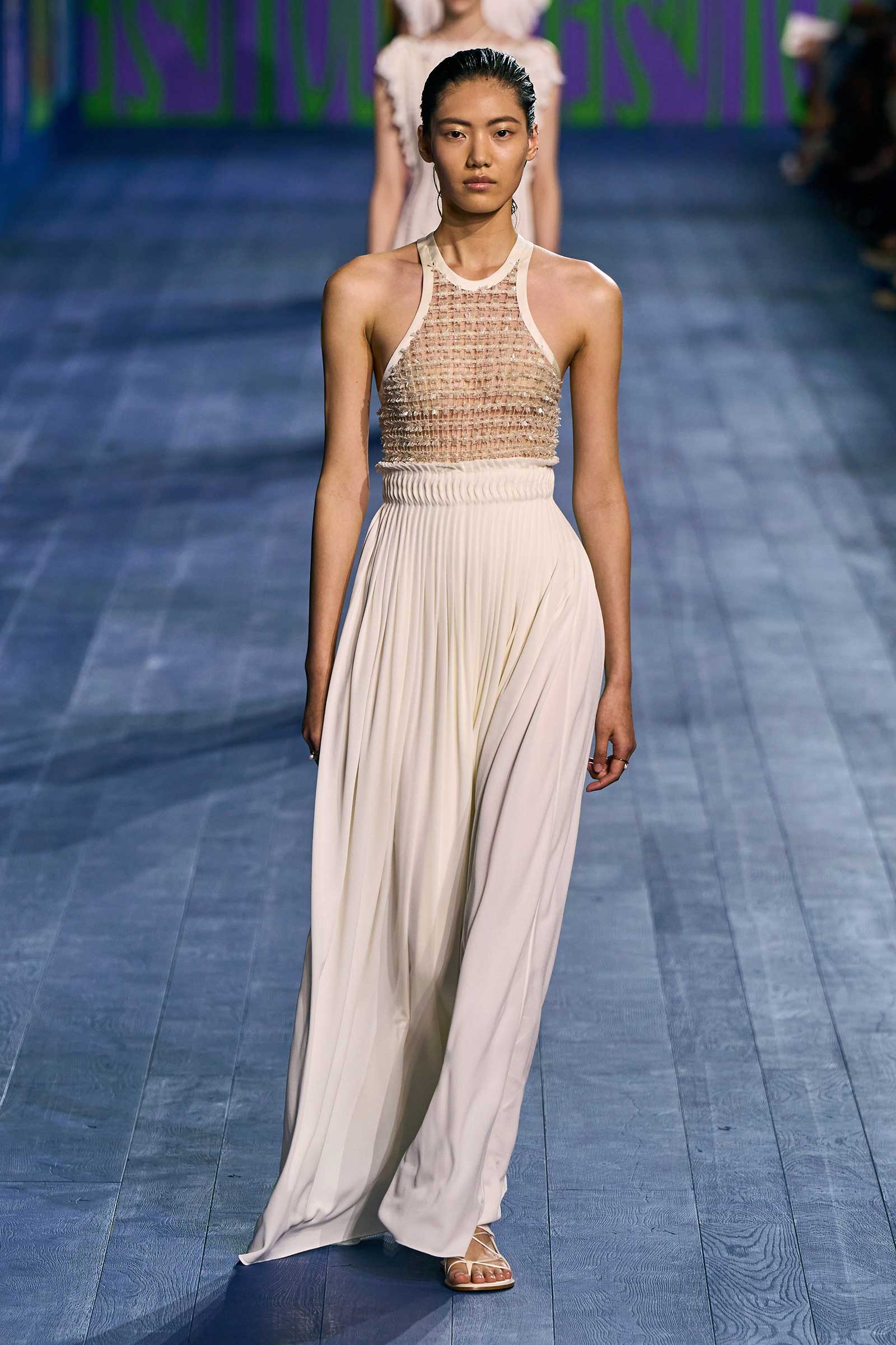 She returned to the peplos, a traditional draped garment Dior himself cut in chiffon; Chiuri pointed to a ravishing photograph of just such a dress from 1948. Hers were constructed in silk jersey or metal jersey, and instead of anchoring them to a corset, she used embroidered tank tops and bodysuits that utterly changed the attitude. Though they remained formal, they looked free, a quality enhanced by the models’ strappy skimmer sandals. Maybe you couldn’t wear them for the high jump—one of the track and field competitions added in 1928—but I bet you could throw the javelin, a sport that was only added to official competition later.