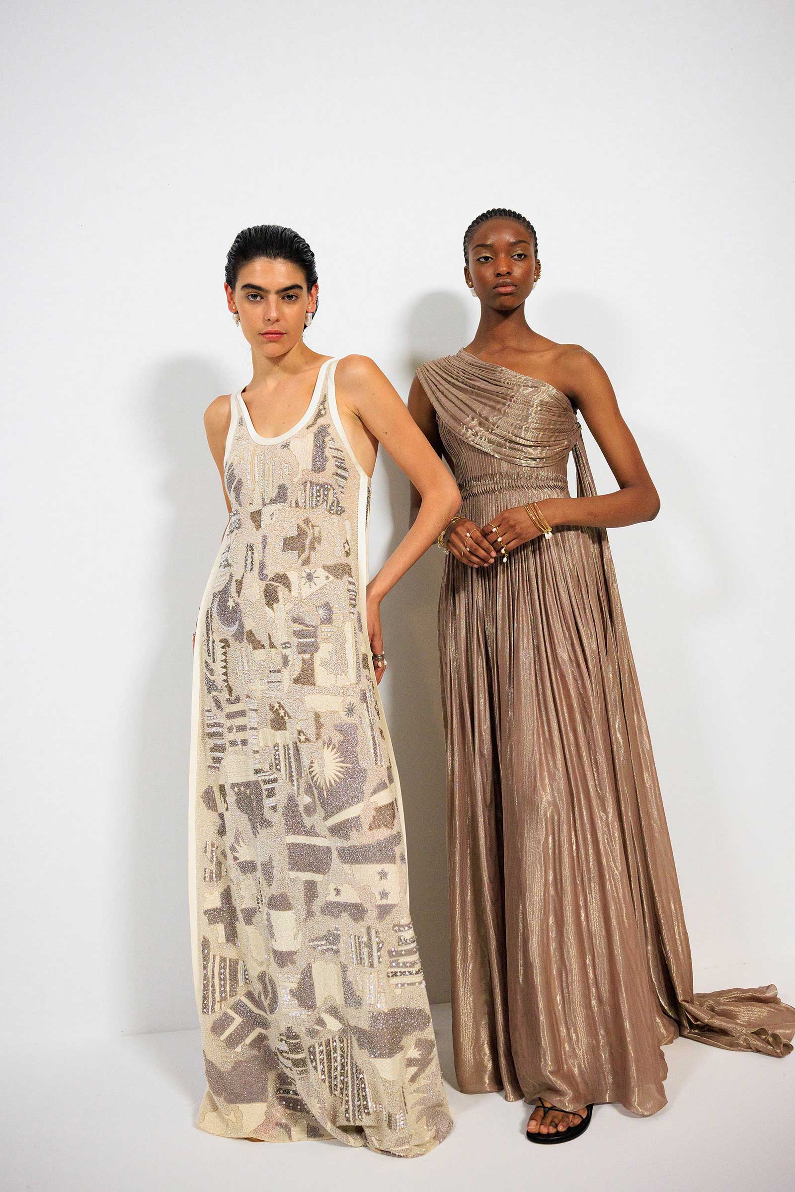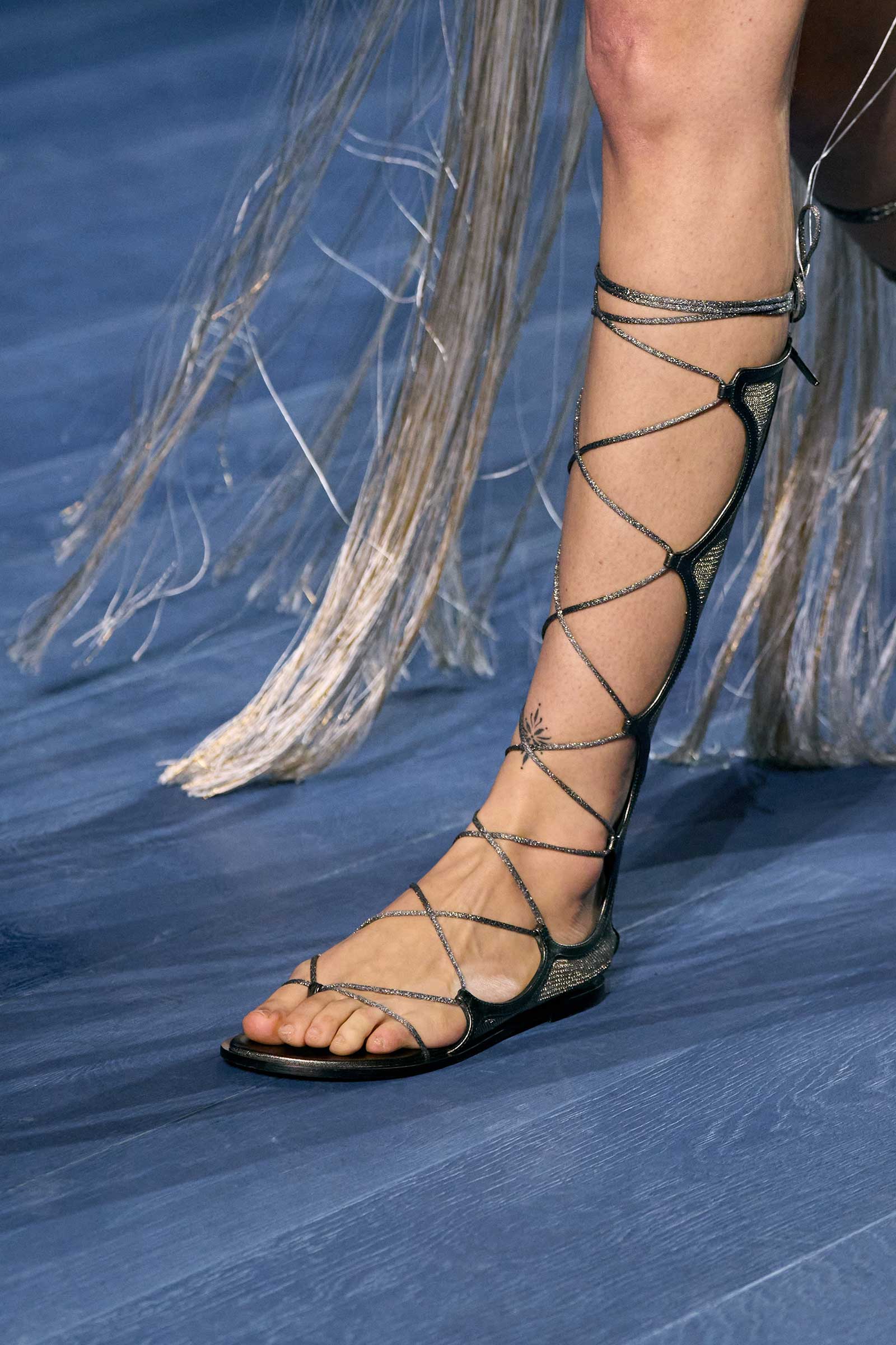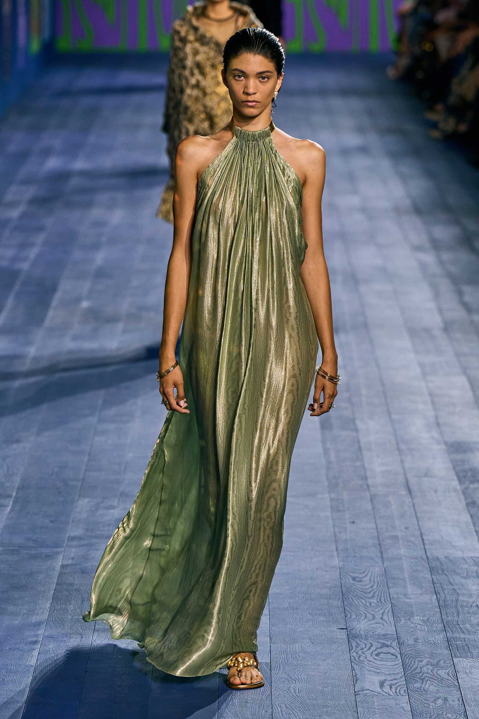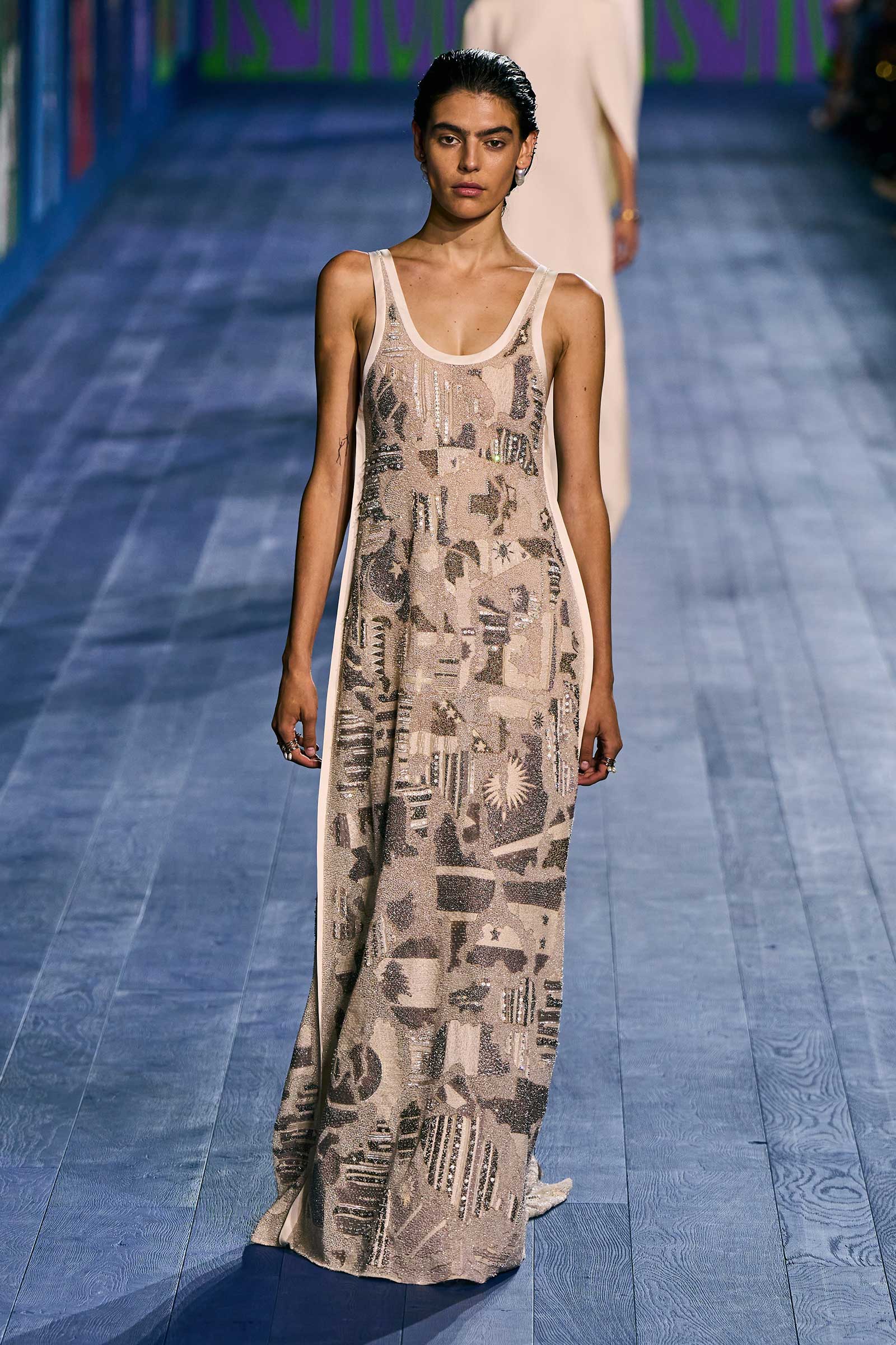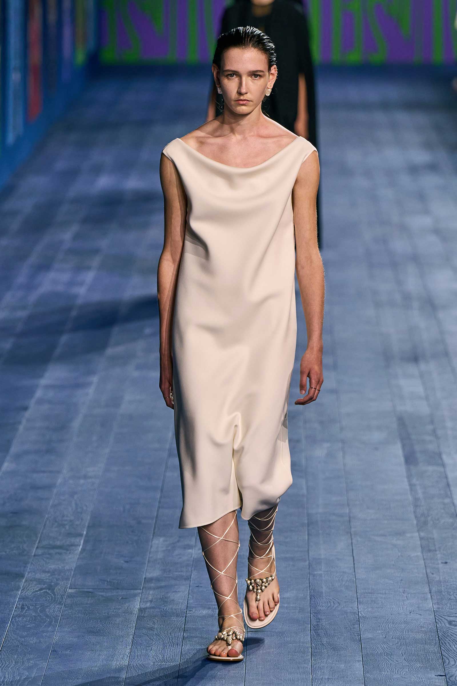 She returned to the peplos, a traditional draped garment Dior himself cut in chiffon; Chiuri pointed to a ravishing photograph of just such a dress from 1948. Hers were constructed in silk jersey or metal jersey, and instead of anchoring them to a corset, she used embroidered tank tops and bodysuits that utterly changed the attitude. Though they remained formal, they looked free, a quality enhanced by the models’ strappy skimmer sandals. Maybe you couldn’t wear them for the high jump—one of the track and field competitions added in 1928—but I bet you could throw the javelin, a sport that was only added to official competition later.