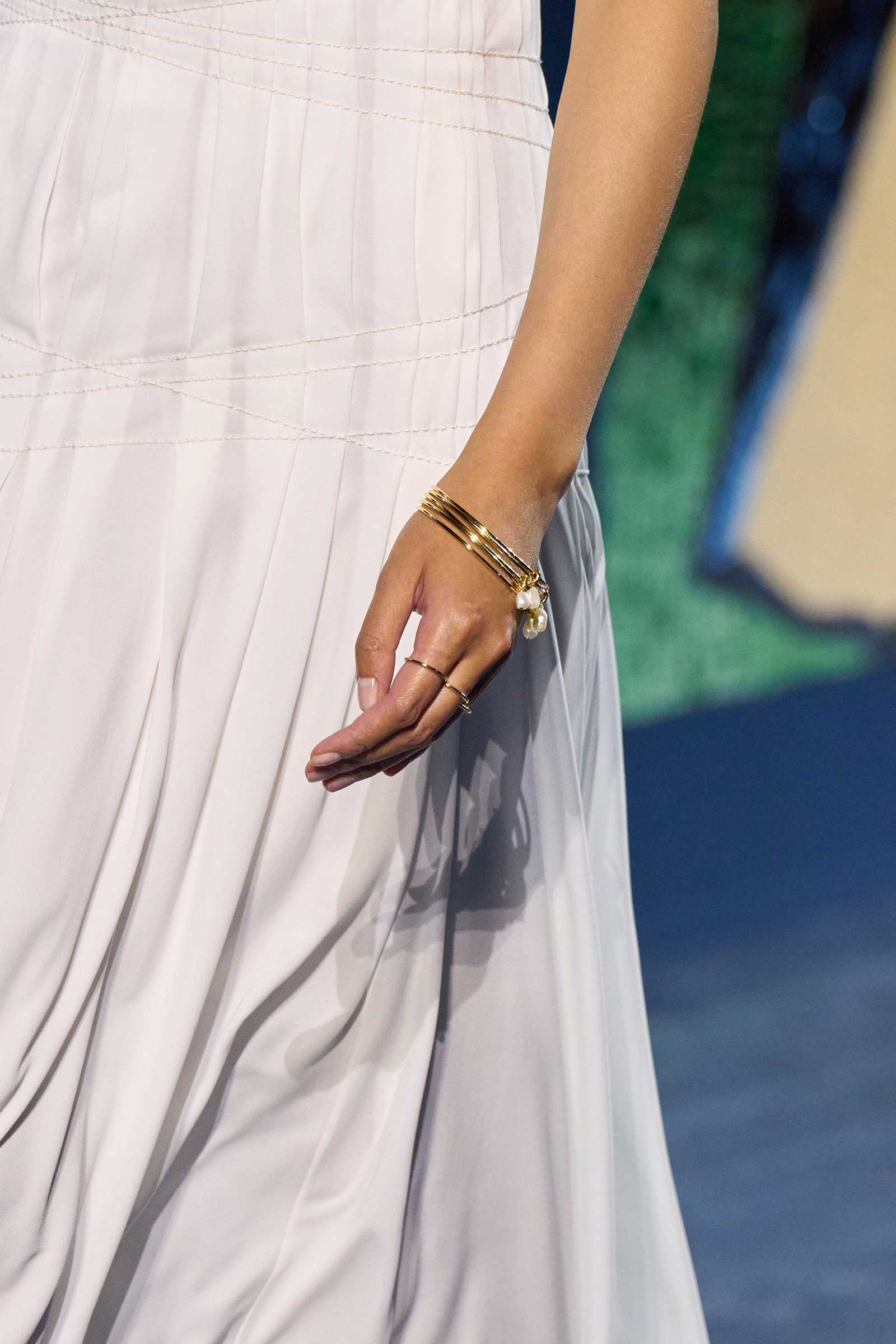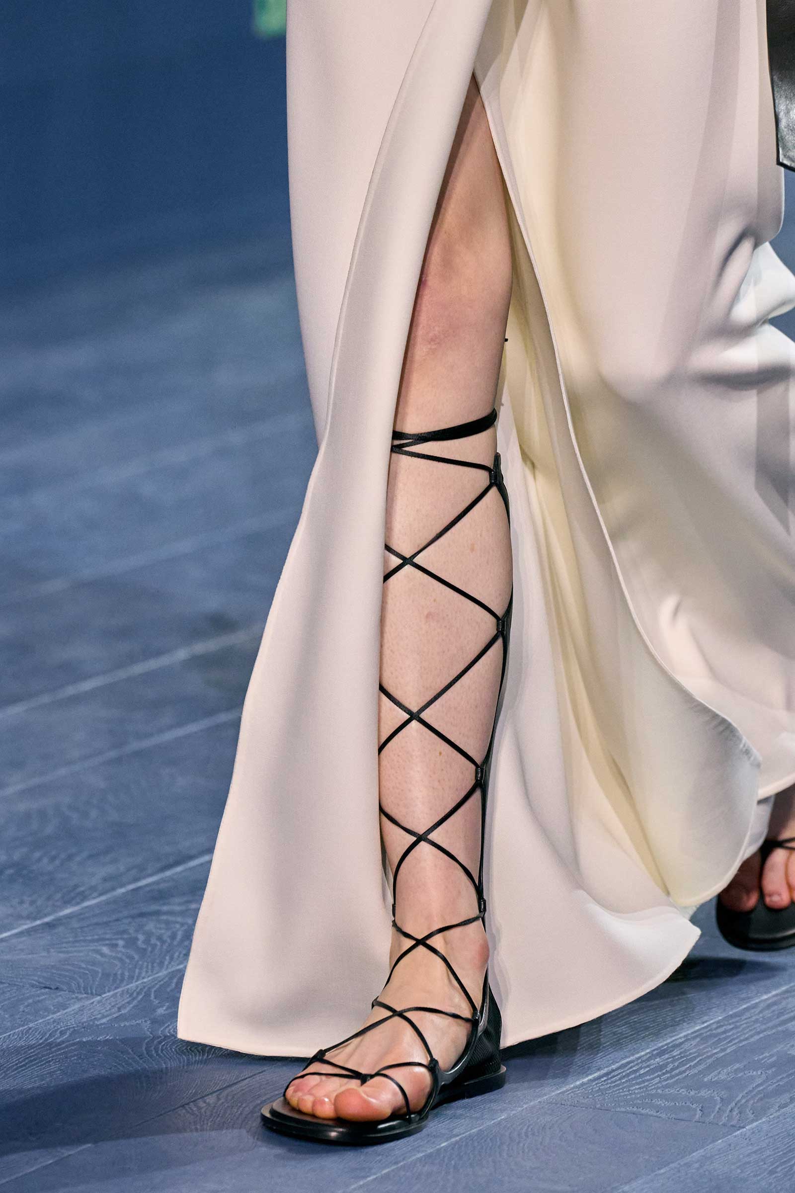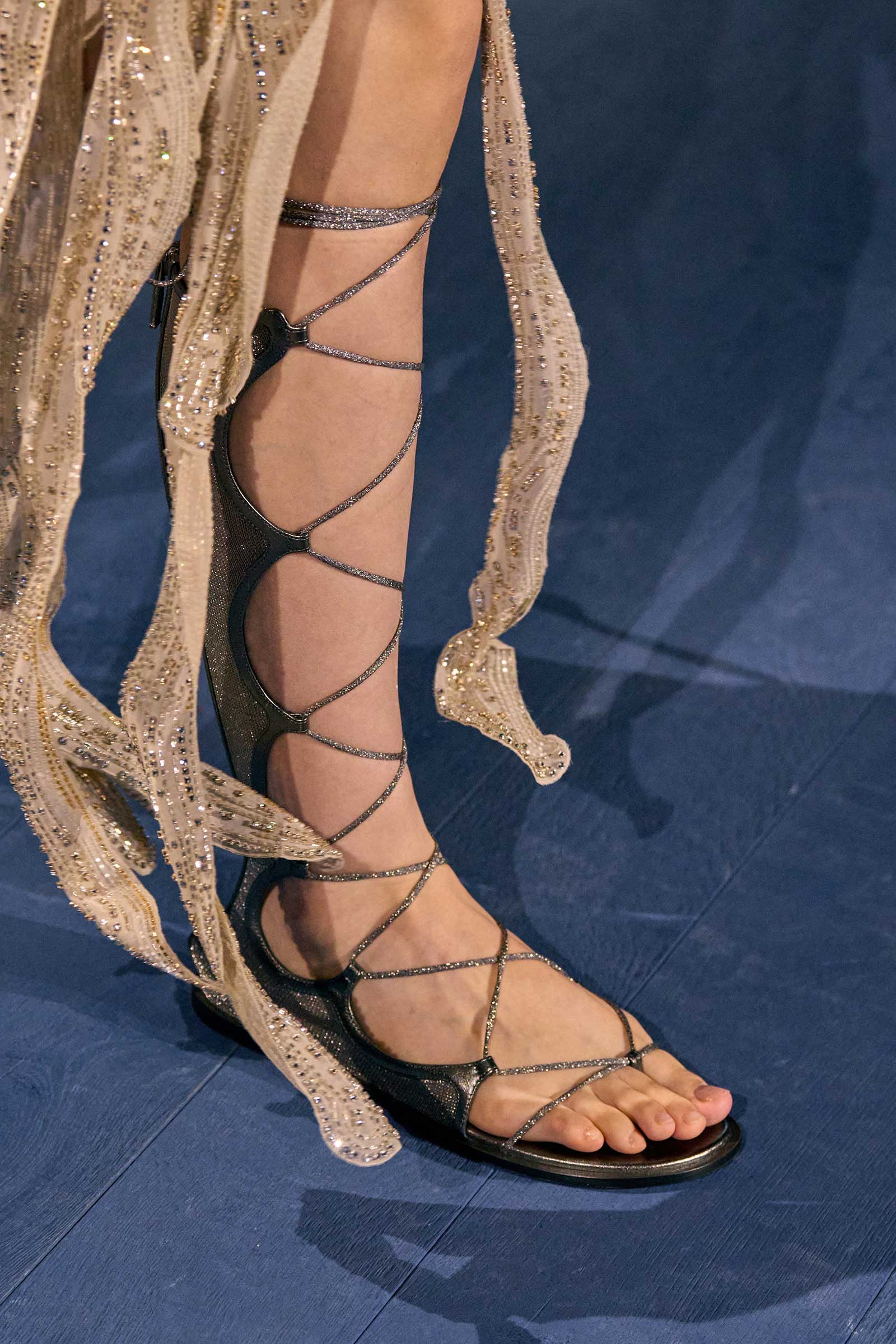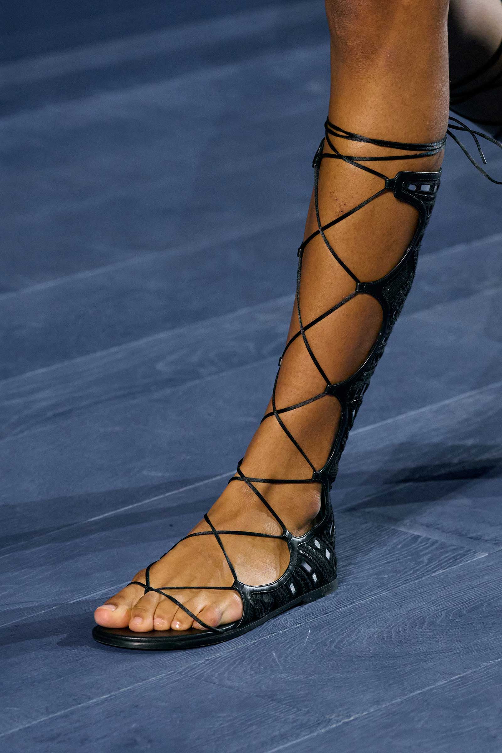 She returned to the peplos, a traditional draped garment Dior himself cut in chiffon; Chiuri pointed to a ravishing photograph of just such a dress from 1948. Hers were constructed in silk jersey or metal jersey, and instead of anchoring them to a corset, she used embroidered tank tops and bodysuits that utterly changed the attitude. Though they remained formal, they looked free, a quality enhanced by the models’ strappy skimmer sandals. Maybe you couldn’t wear them for the high jump—one of the track and field competitions added in 1928—but I bet you could throw the javelin, a sport that was only added to official competition later.