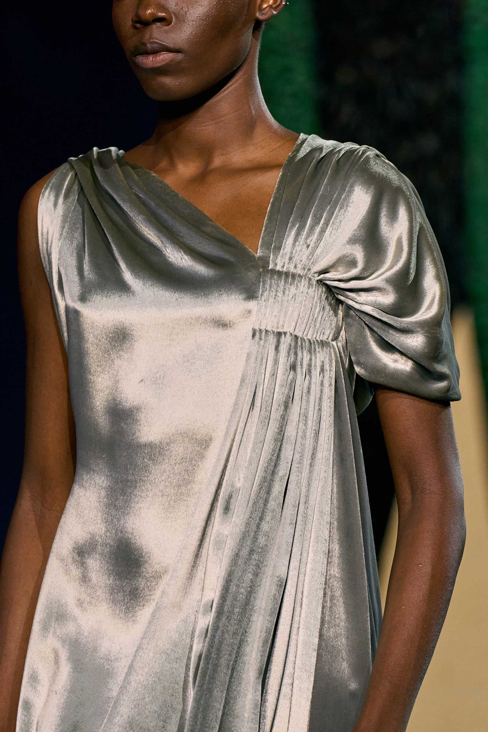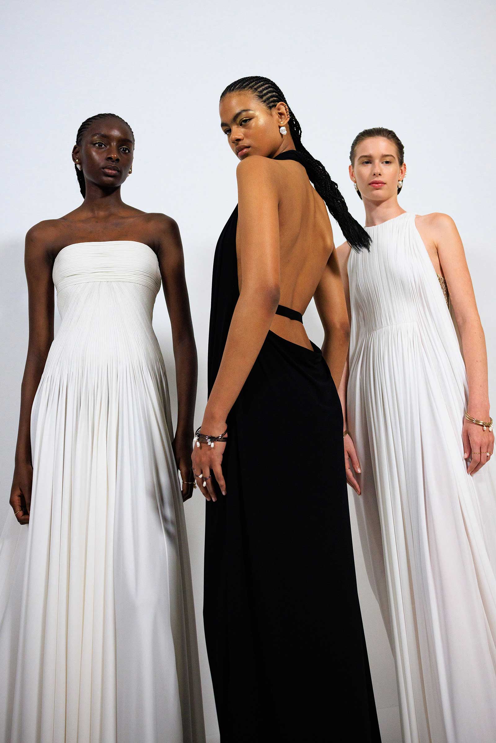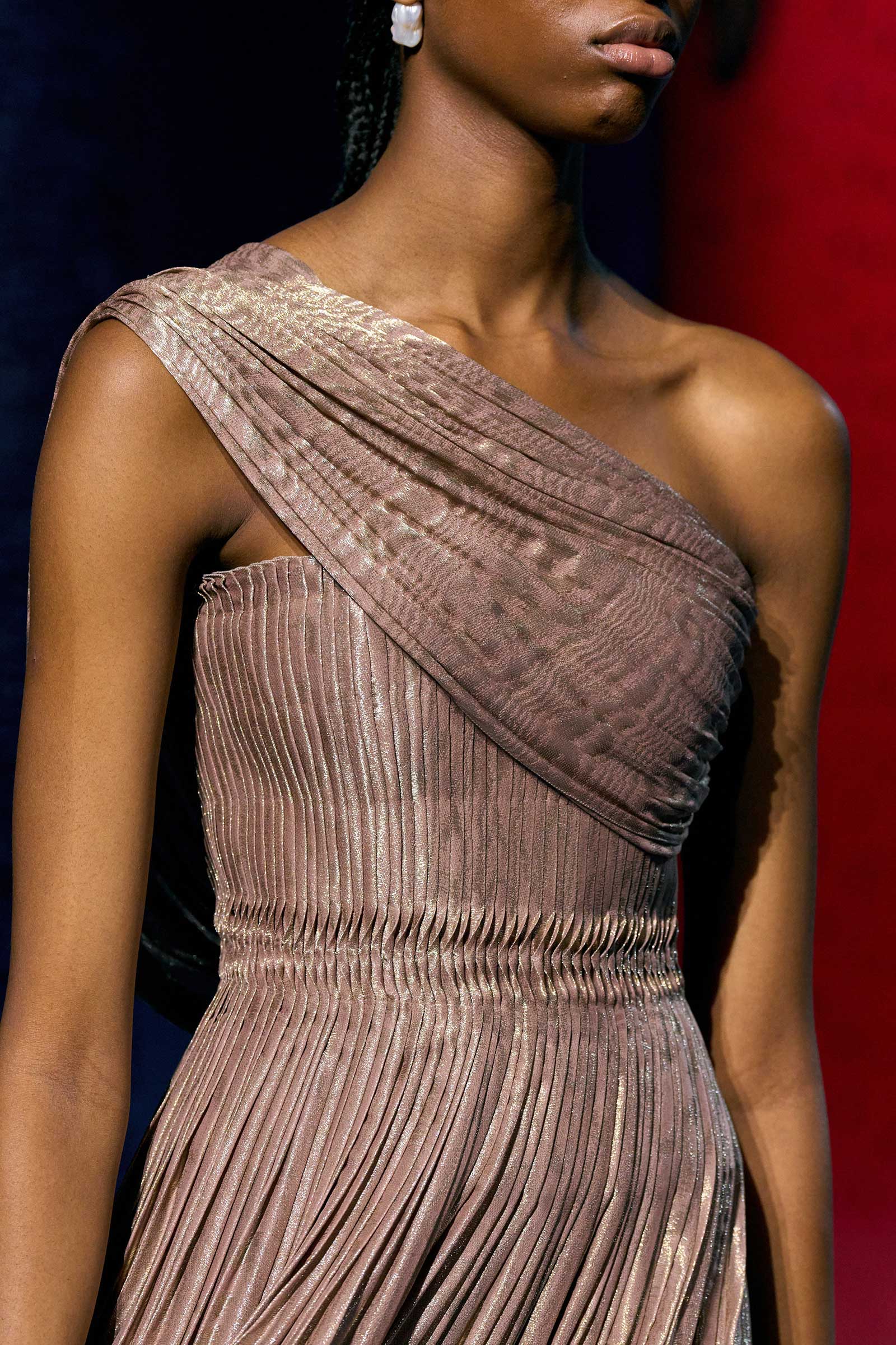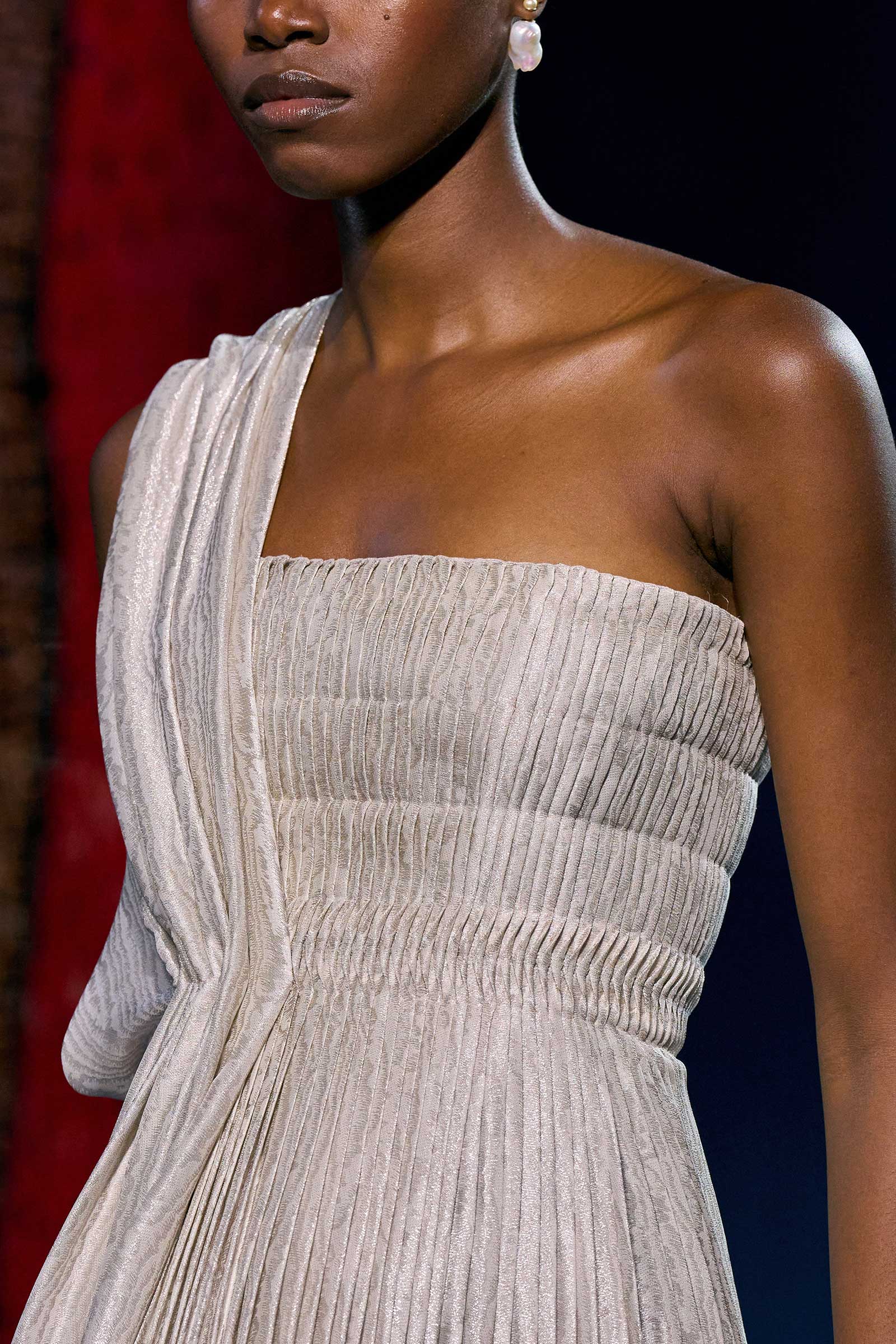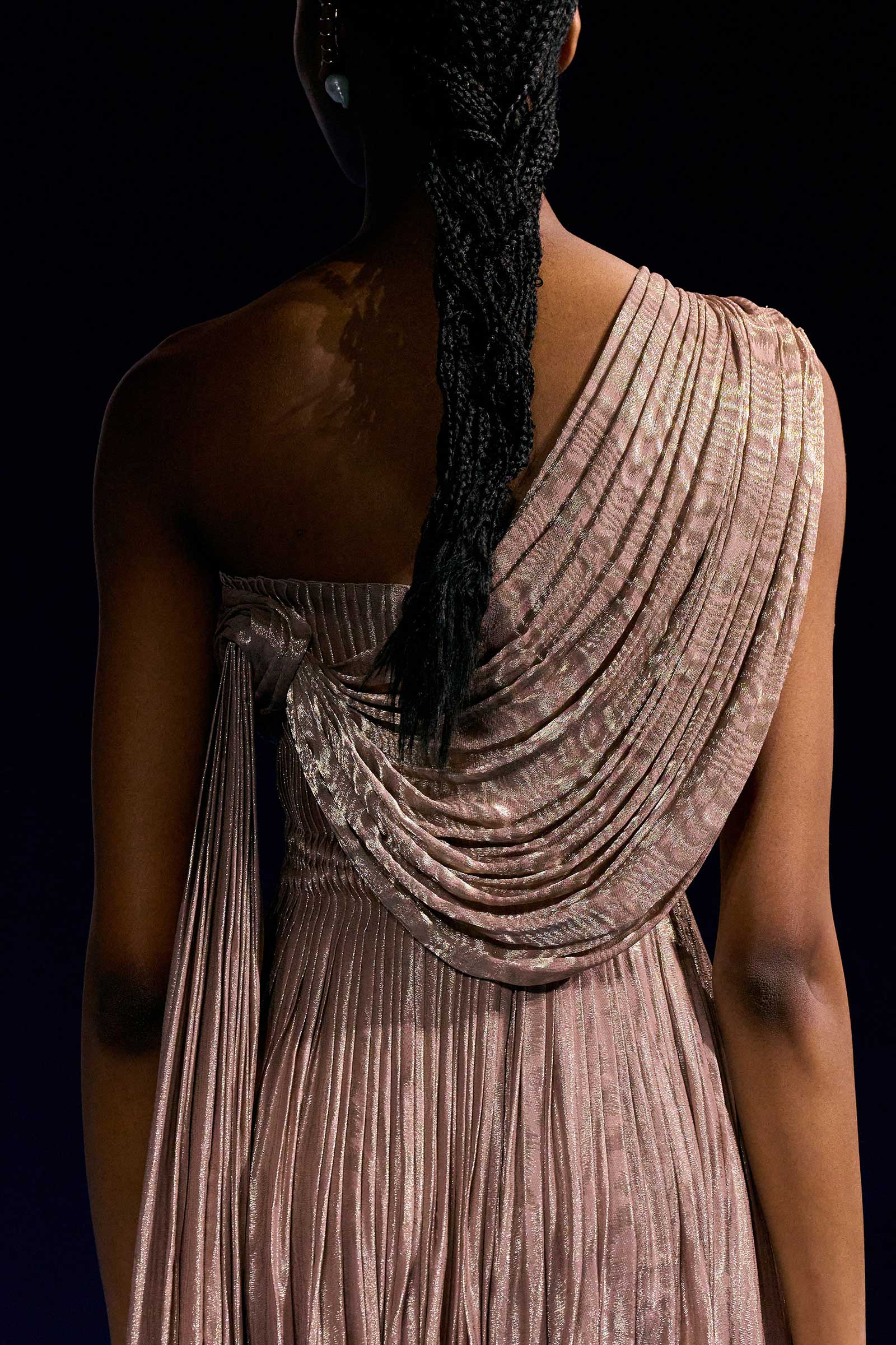 Pantsuits in white moiré and black velvet with a peplos suspended from the waistband of the trousers caught some of that relaxed but still polished vibe, as did a day dress in black silk cady with a hand-scalloped bib. But the evening dresses were the thing here. An asymmetrical dress in gold lamé pleated by hand and suspended from a leather strap gets the collection’s gold medal.