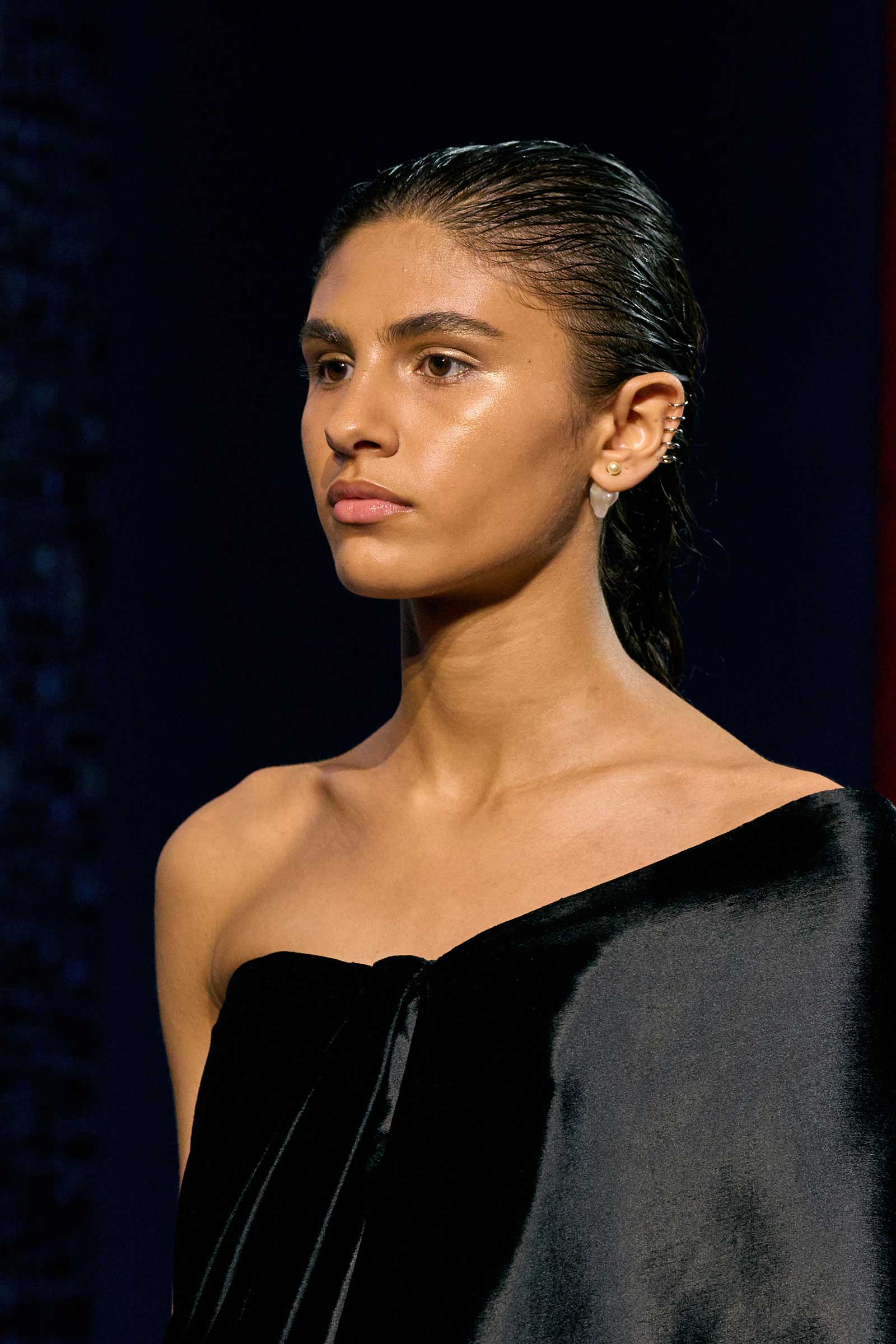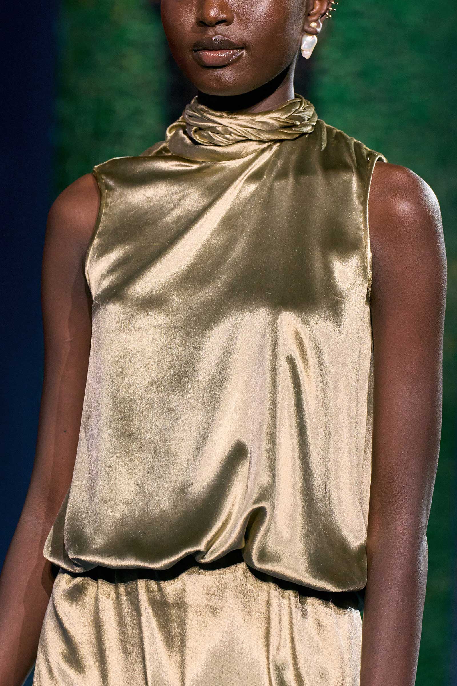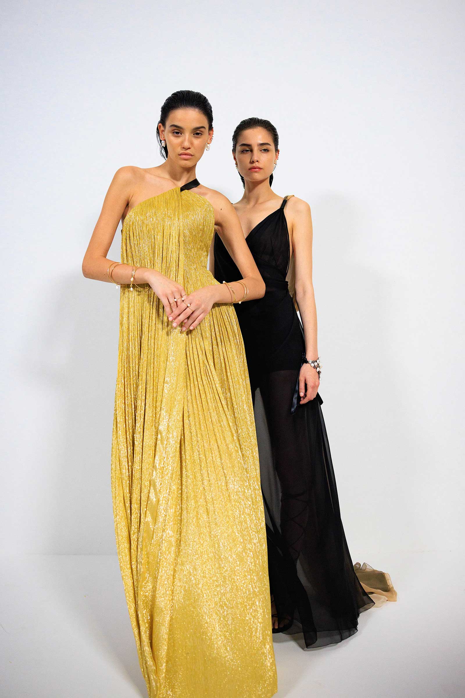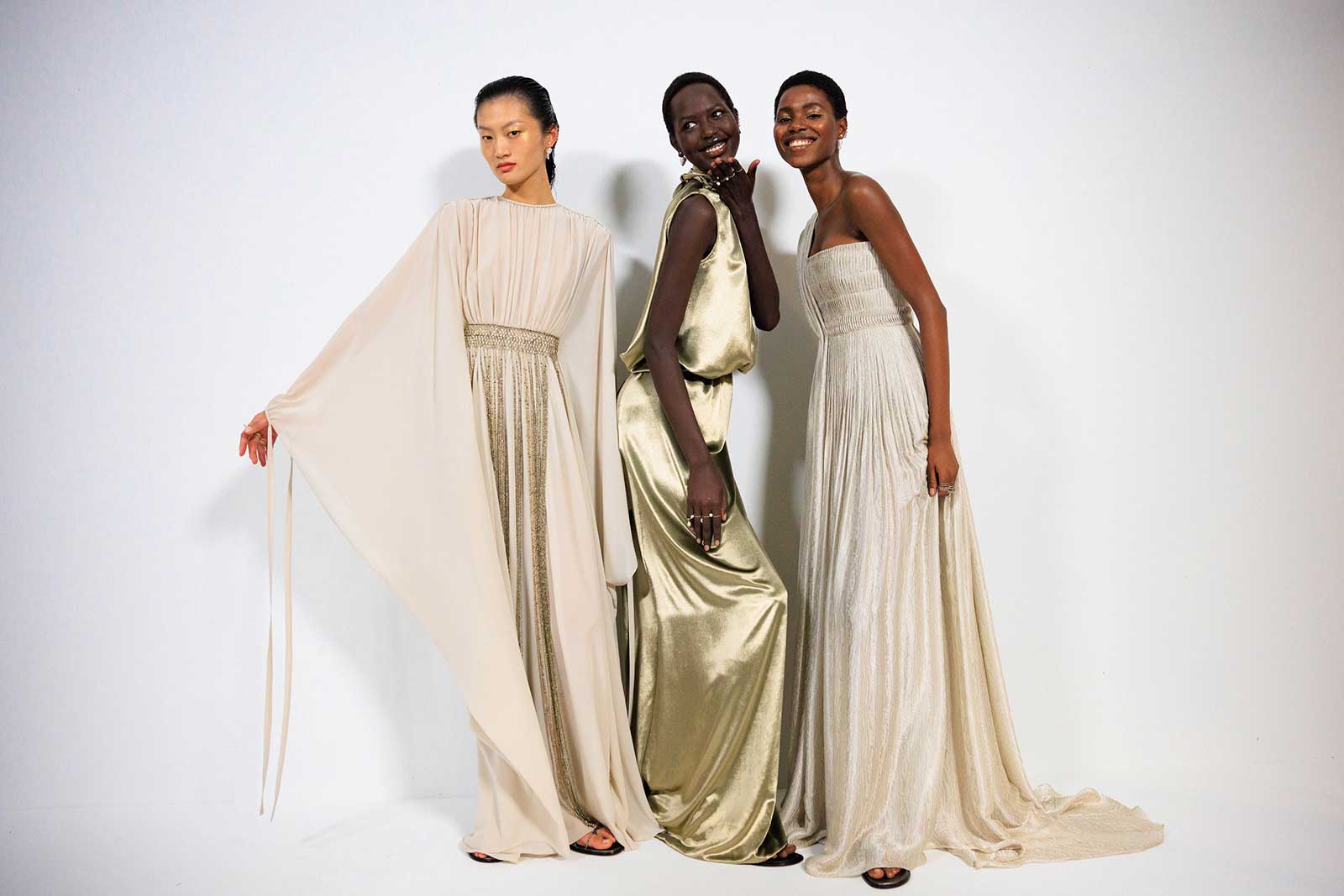 Pantsuits in white moiré and black velvet with a peplos suspended from the waistband of the trousers caught some of that relaxed but still polished vibe, as did a day dress in black silk cady with a hand-scalloped bib. But the evening dresses were the thing here. An asymmetrical dress in gold lamé pleated by hand and suspended from a leather strap gets the collection’s gold medal.