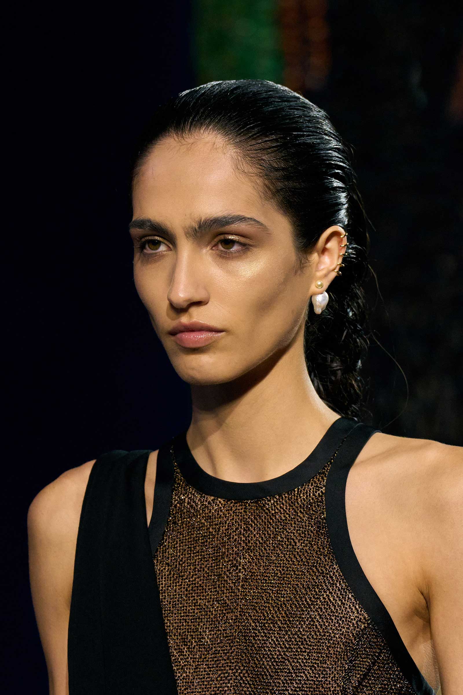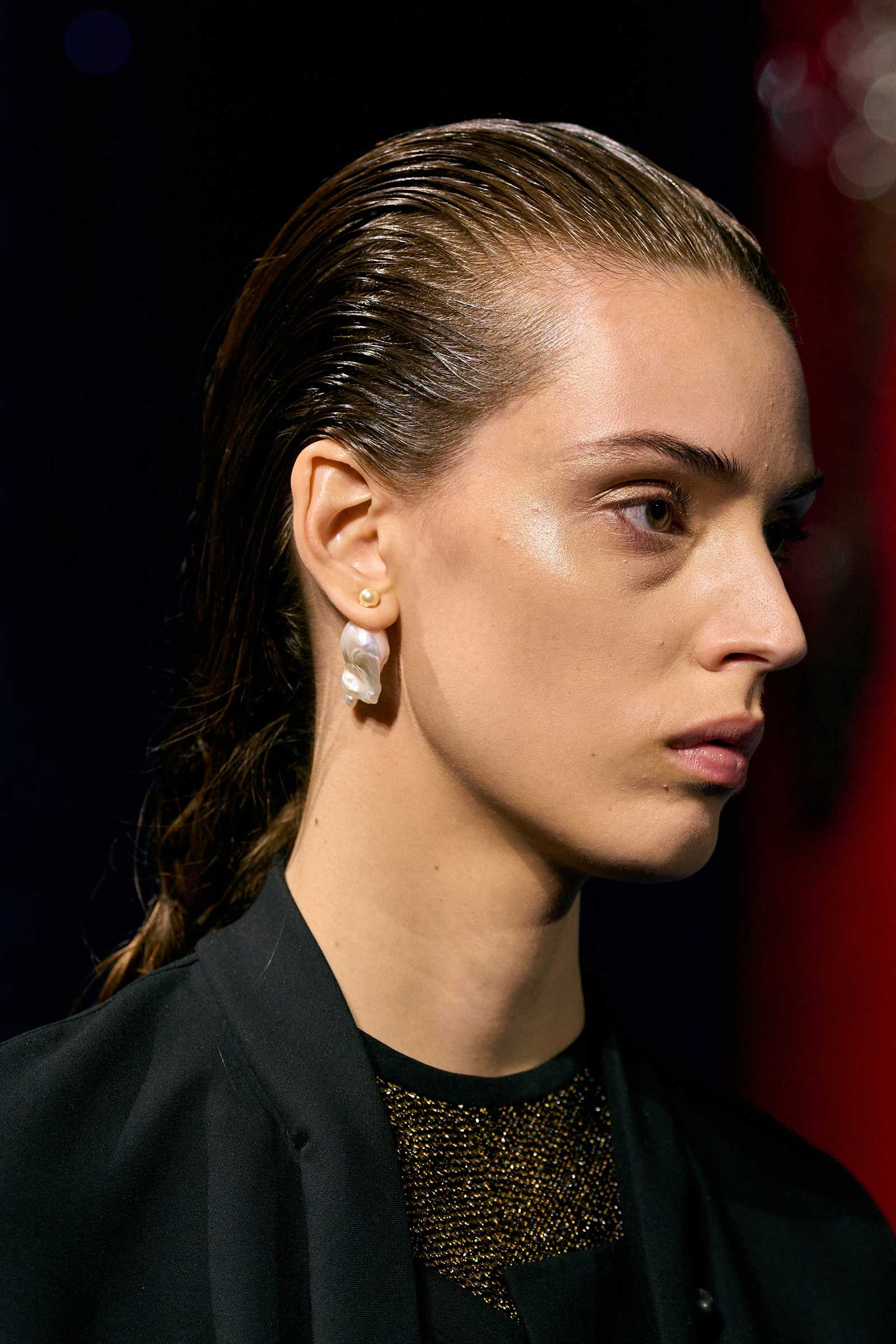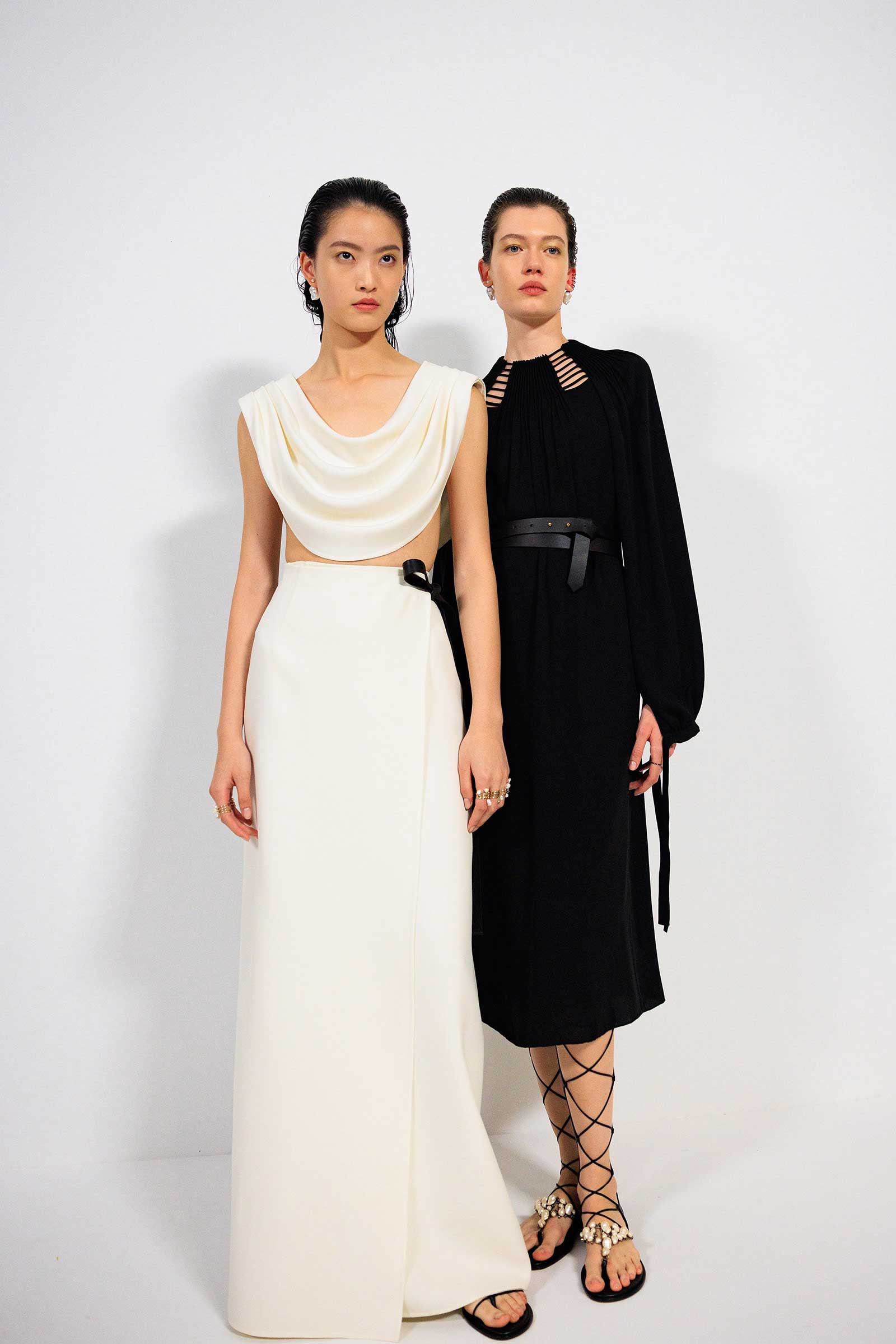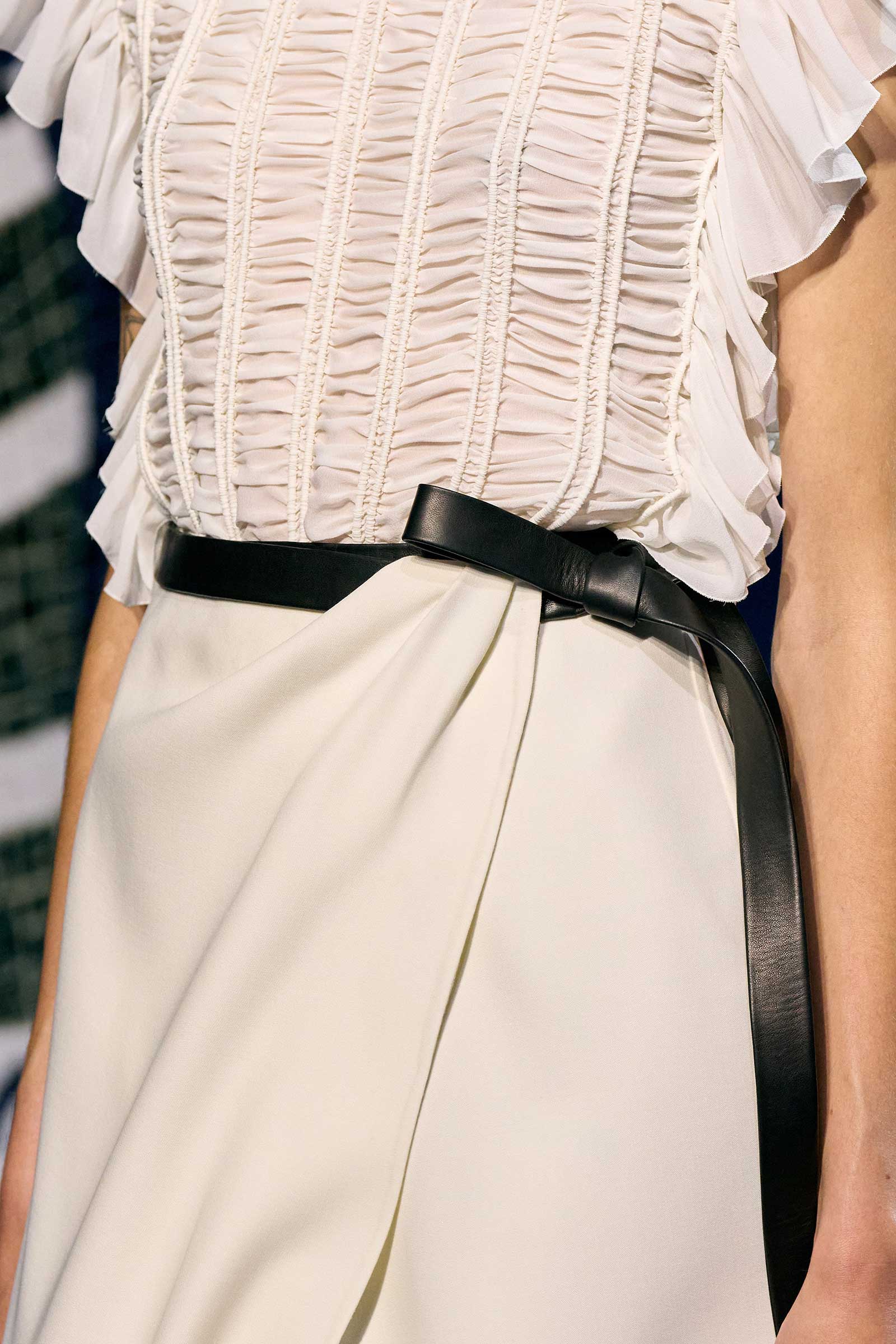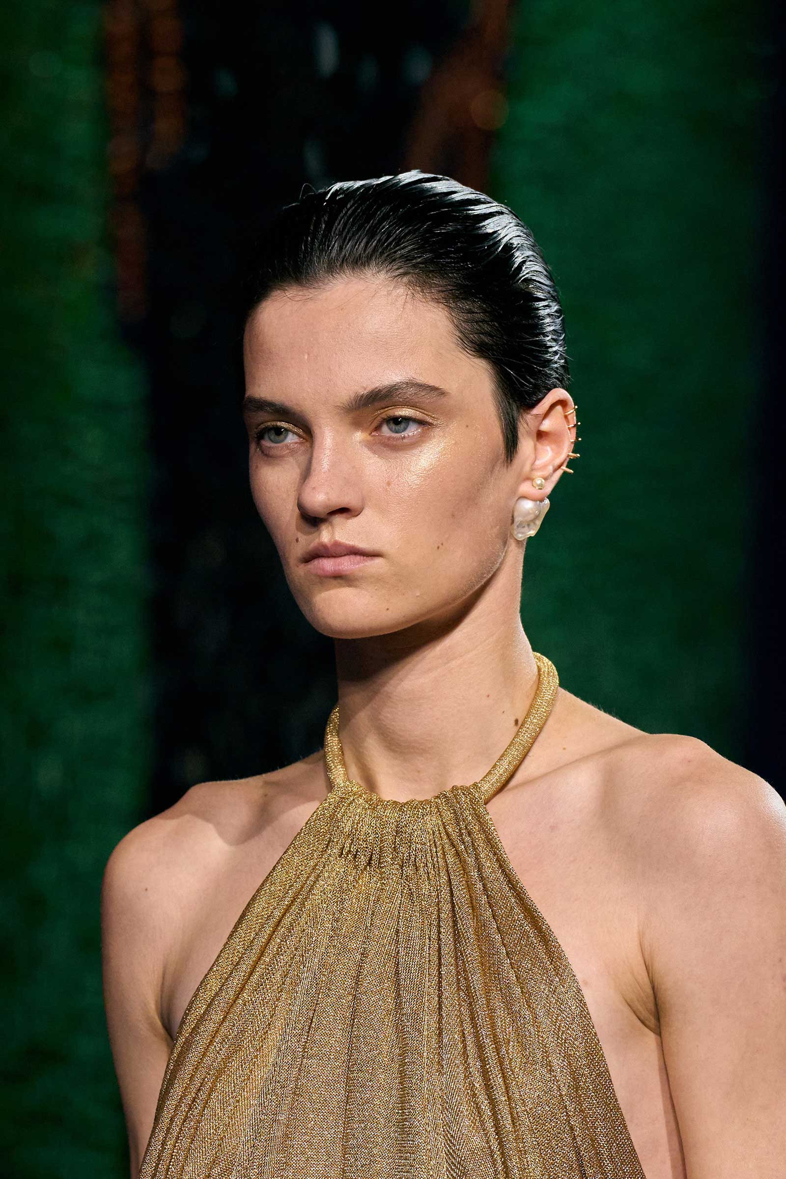 Pantsuits in white moiré and black velvet with a peplos suspended from the waistband of the trousers caught some of that relaxed but still polished vibe, as did a day dress in black silk cady with a hand-scalloped bib. But the evening dresses were the thing here. An asymmetrical dress in gold lamé pleated by hand and suspended from a leather strap gets the collection’s gold medal.