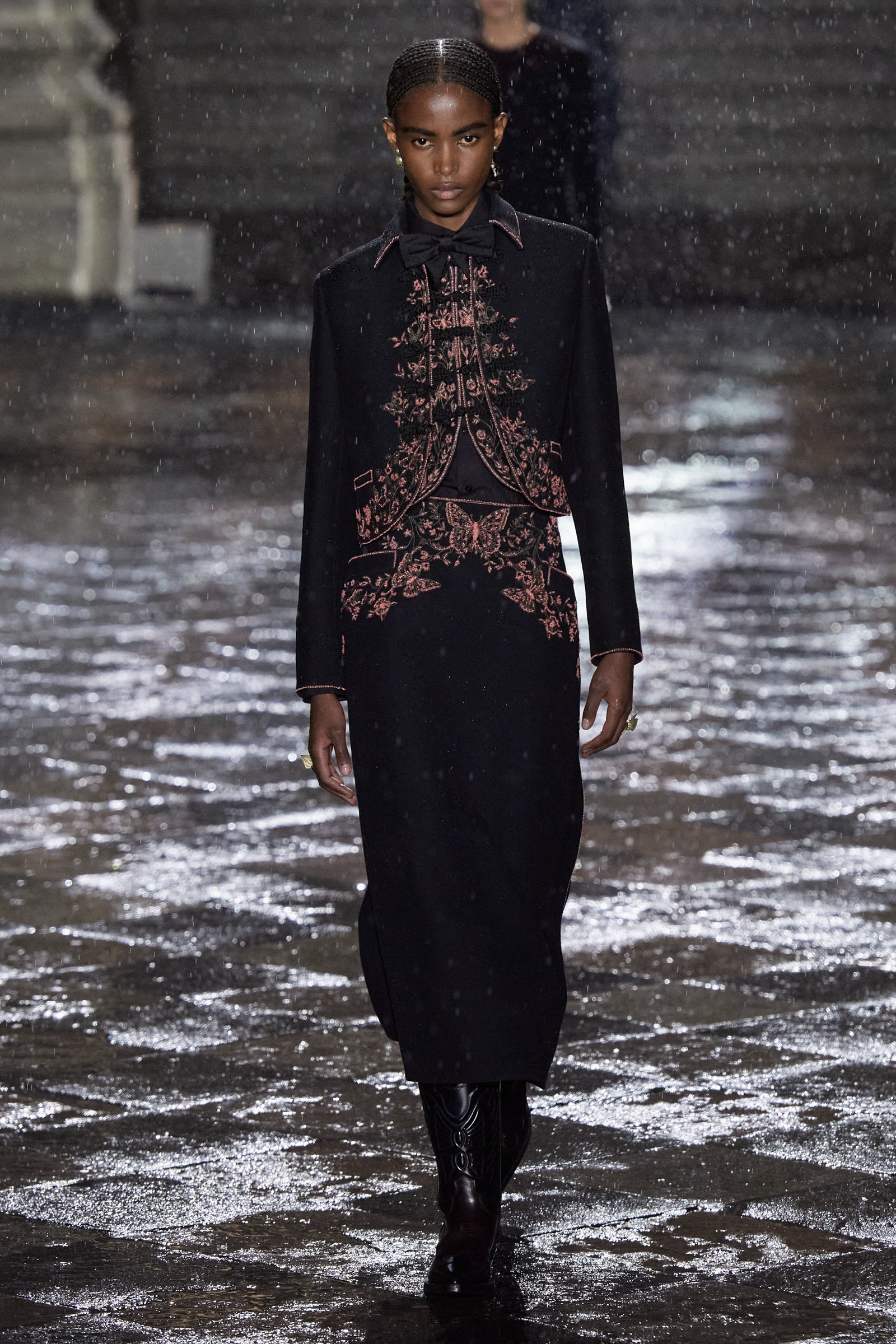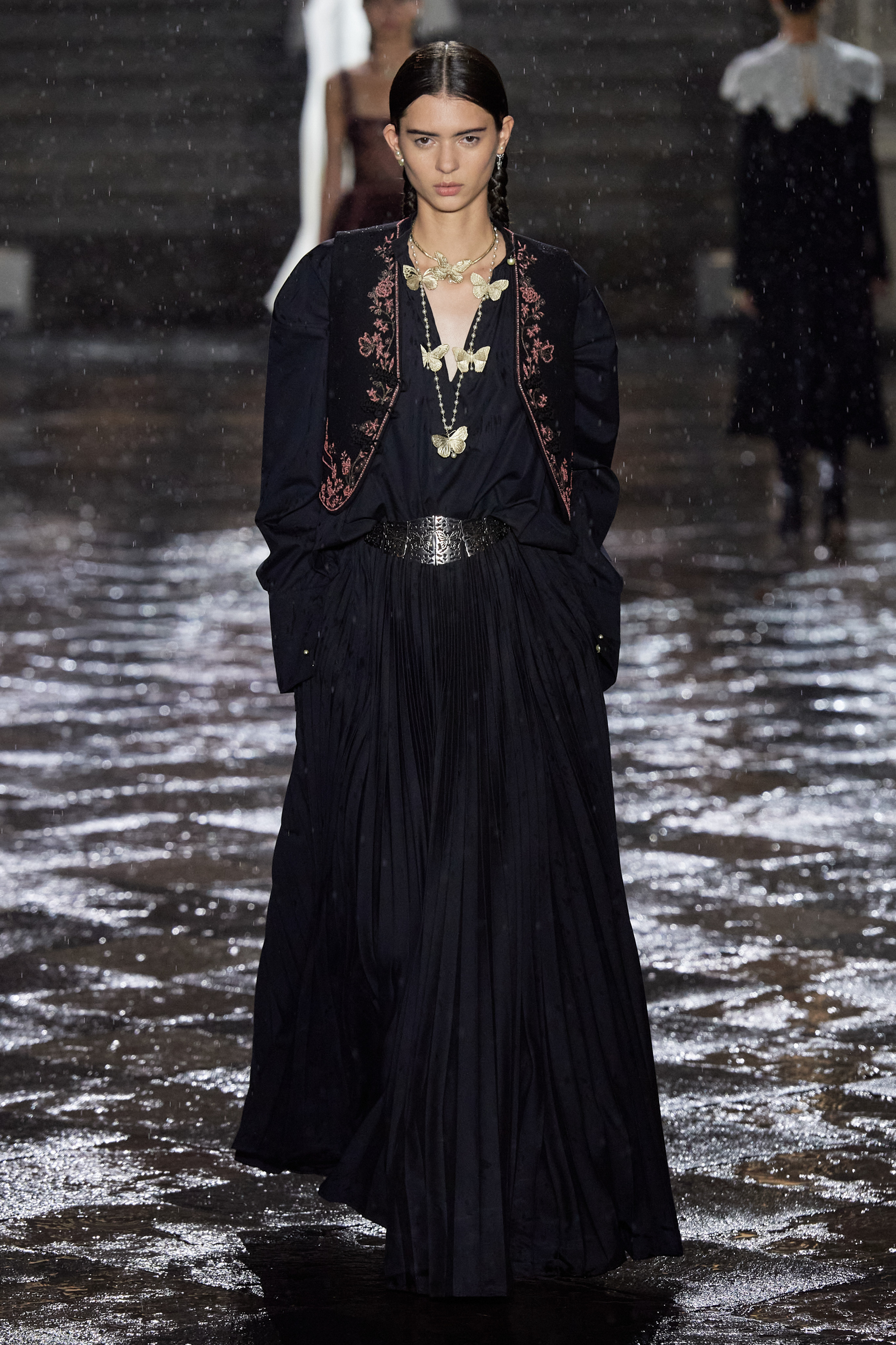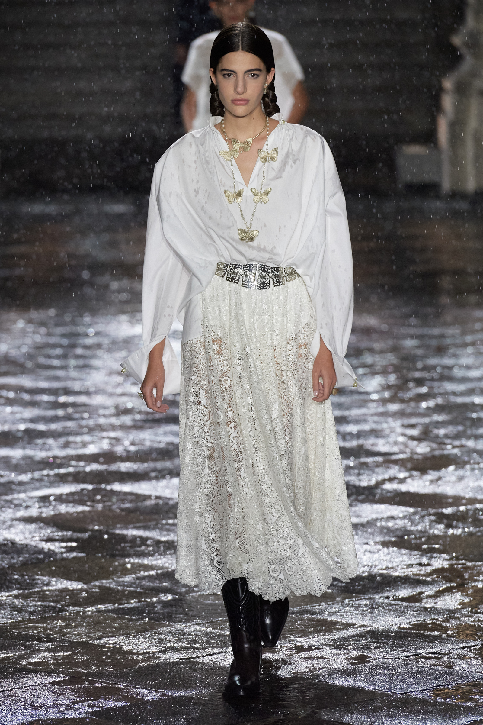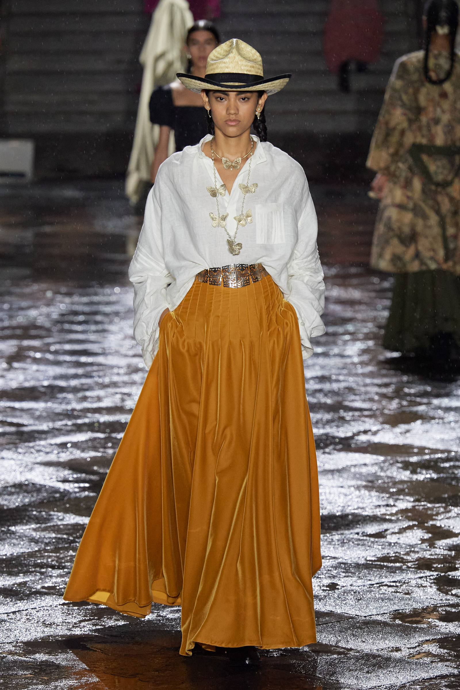 On the global whirligig that is the 2024 resort season, next stop: Mexico City. We are here to see Maria Grazia Chiuri of Dior’s ode to Mexico, which is full of airy shirting casually tucked into long pleated or tiered skirts swishing the floor, traditional huipil tops unexpectedly and youthfully worn with denim cut with a healthy amount of slouchy attitude, and the nipped-waist, house-classic Bar jacket, only NOW faced with velvet, or scrolled with embroideries. All of this was given a little glint and gleam courtesy of gold strand necklaces or hefty silver belt buckles with butterfly motifs (the butterfly was a constant visual refrain here) and with plenty of substantial leather cowboy boots in the local vernacular, swirled with stitching and, in some cases, flecked with tiny coral beads.