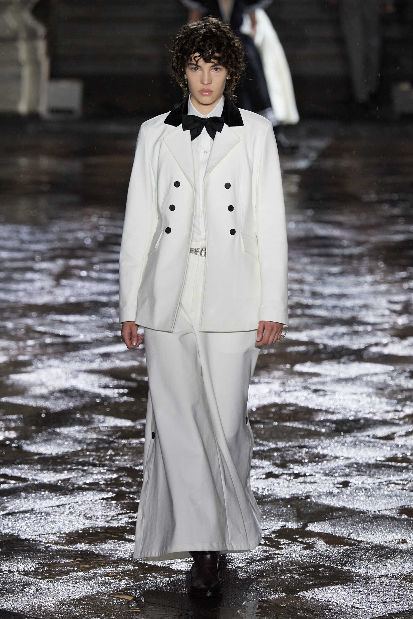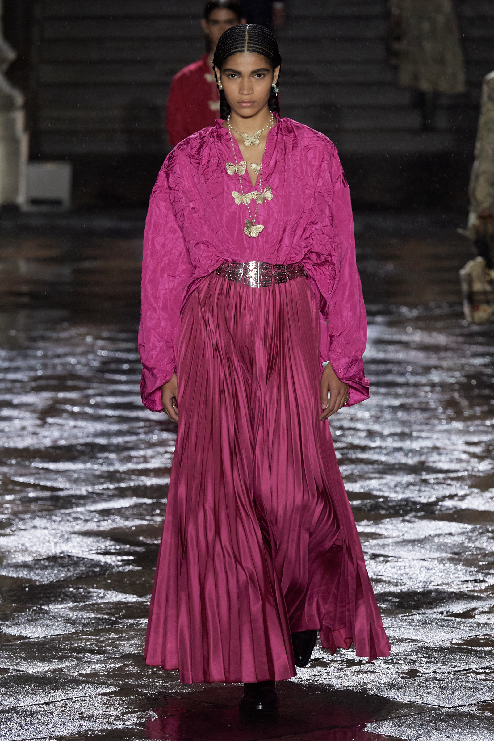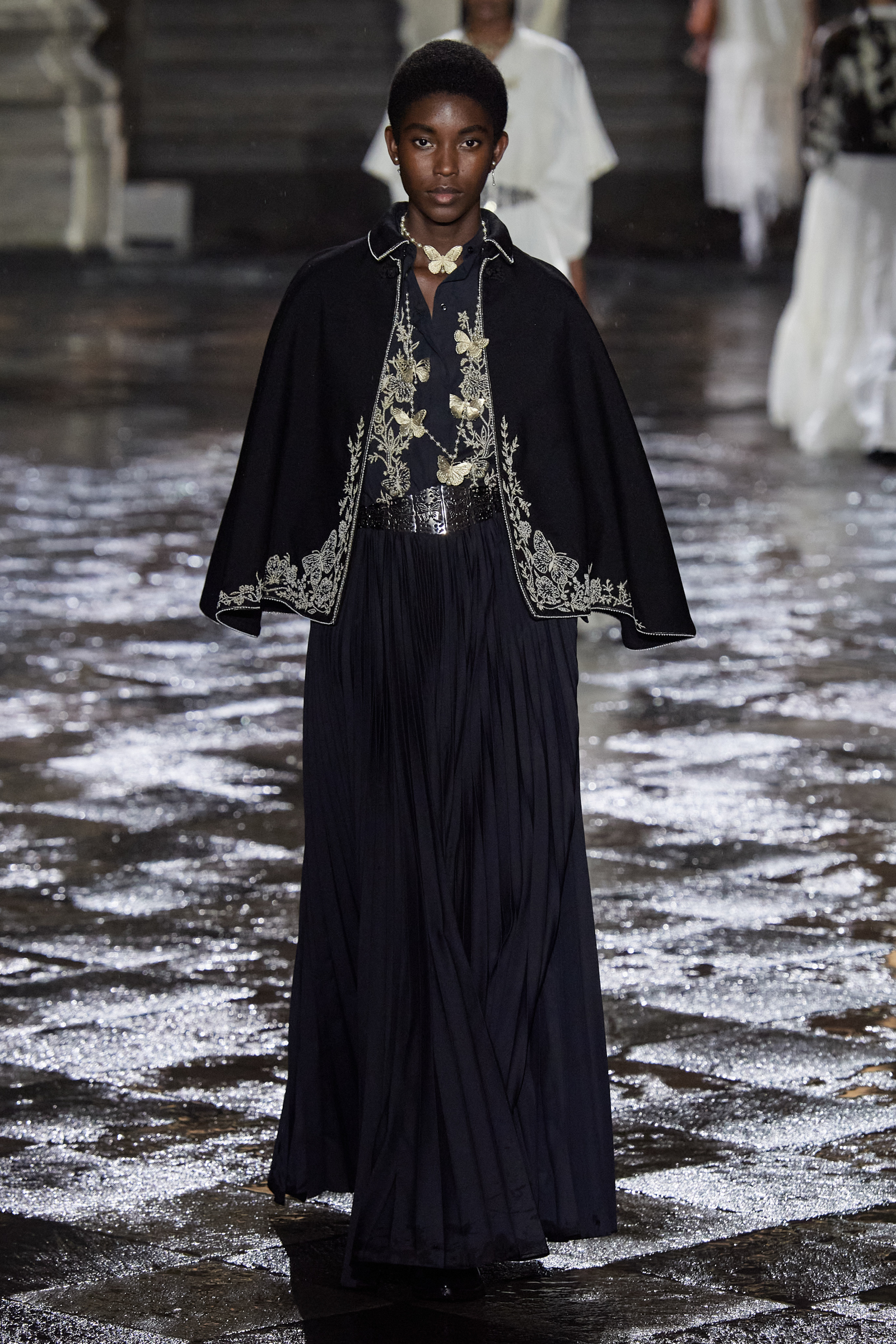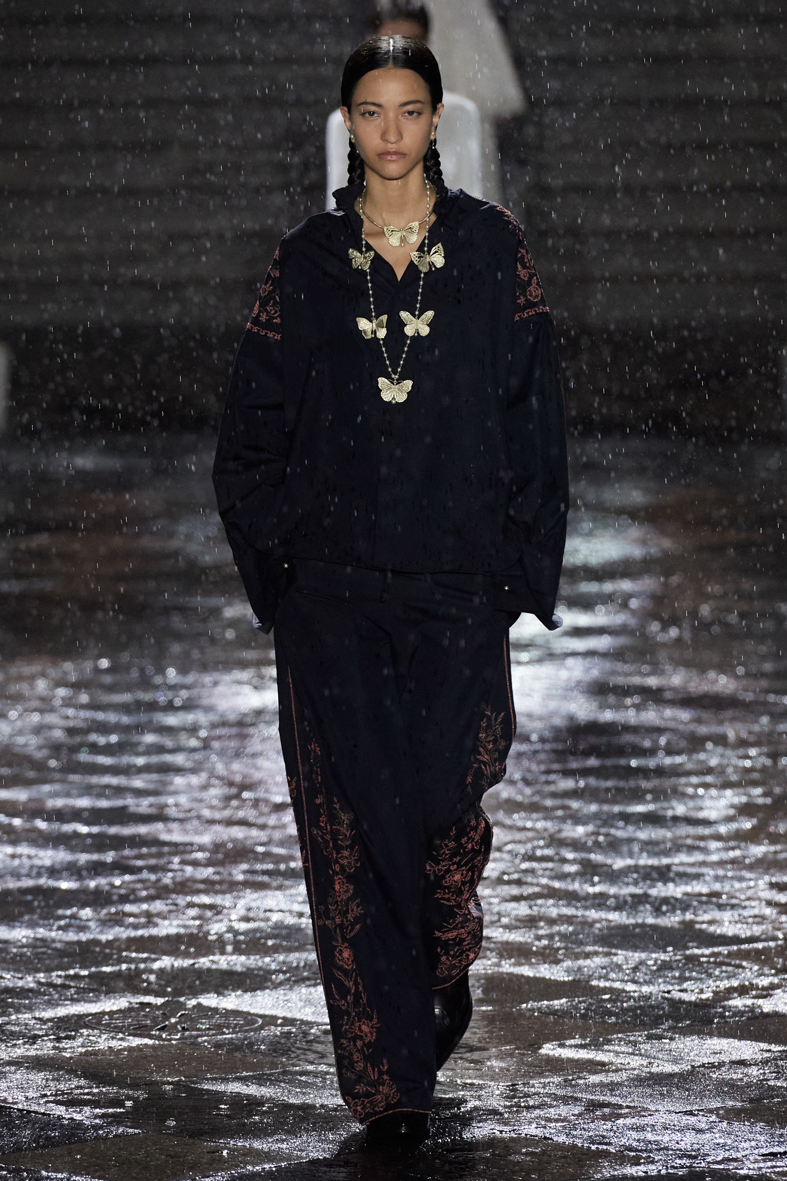 On the global whirligig that is the 2024 resort season, next stop: Mexico City. We are here to see Maria Grazia Chiuri of Dior’s ode to Mexico, which is full of airy shirting casually tucked into long pleated or tiered skirts swishing the floor, traditional huipil tops unexpectedly and youthfully worn with denim cut with a healthy amount of slouchy attitude, and the nipped-waist, house-classic Bar jacket, only NOW faced with velvet, or scrolled with embroideries. All of this was given a little glint and gleam courtesy of gold strand necklaces or hefty silver belt buckles with butterfly motifs (the butterfly was a constant visual refrain here) and with plenty of substantial leather cowboy boots in the local vernacular, swirled with stitching and, in some cases, flecked with tiny coral beads.