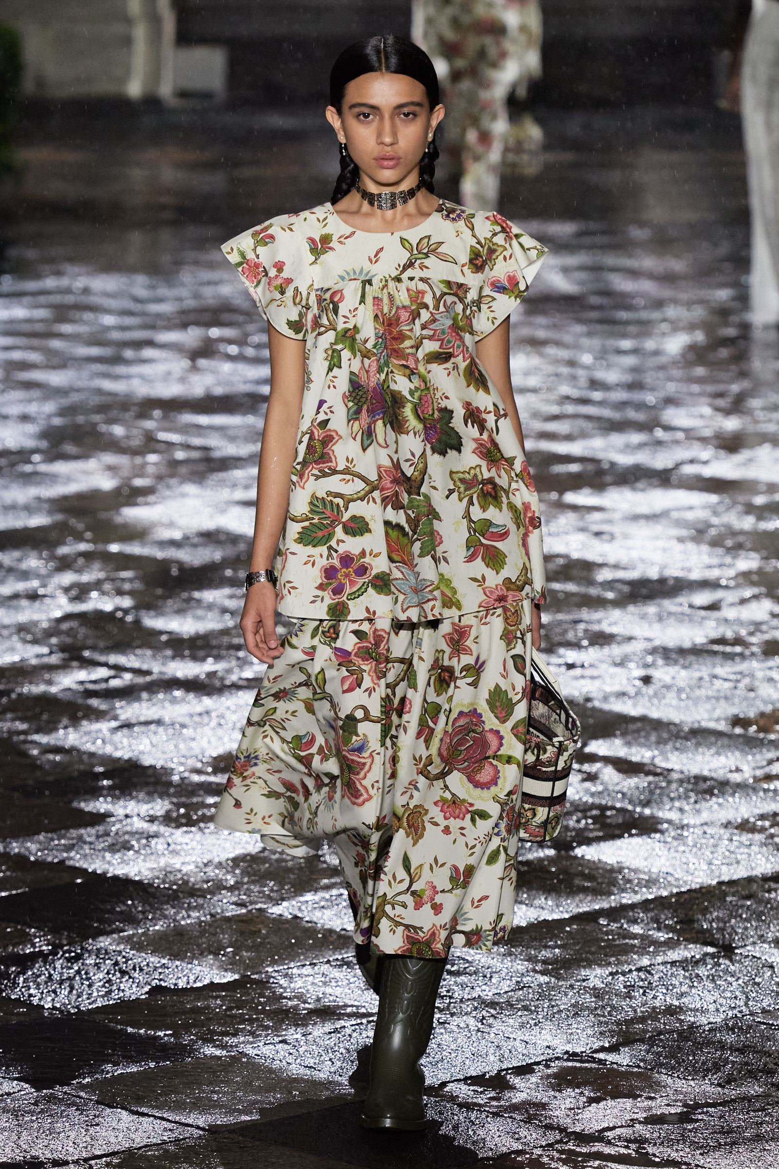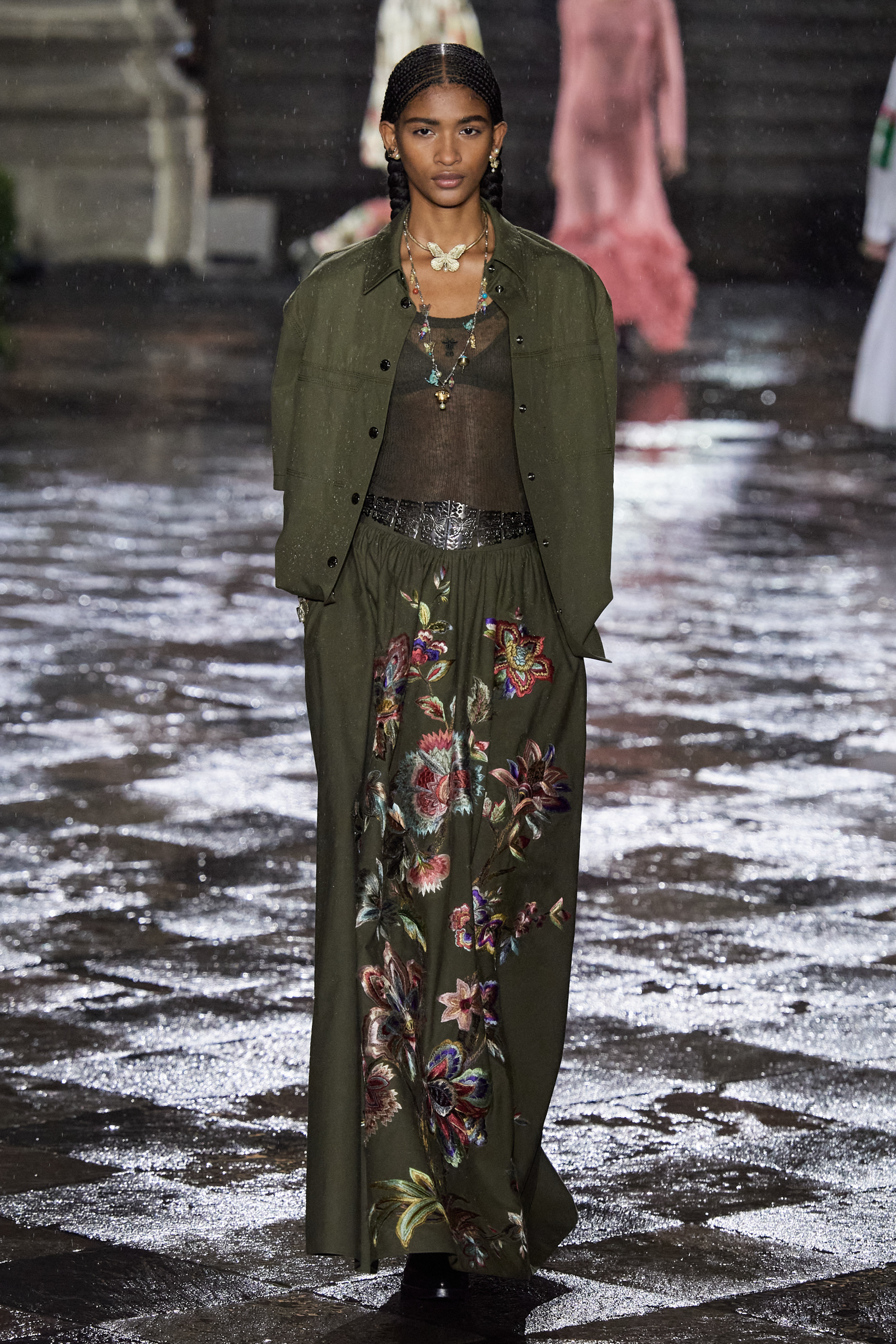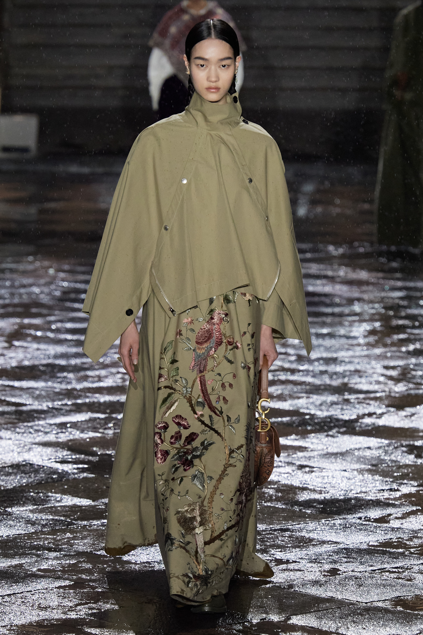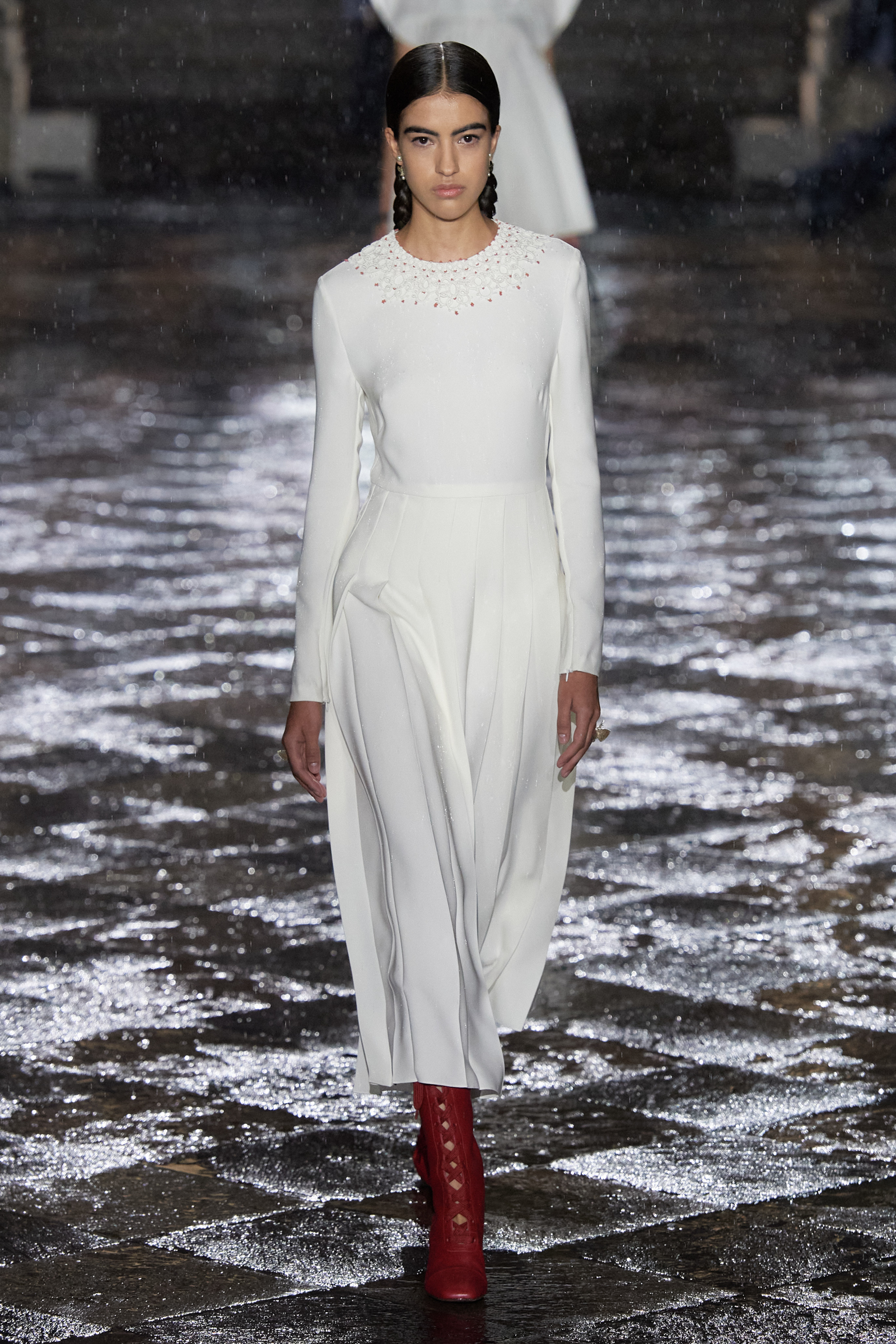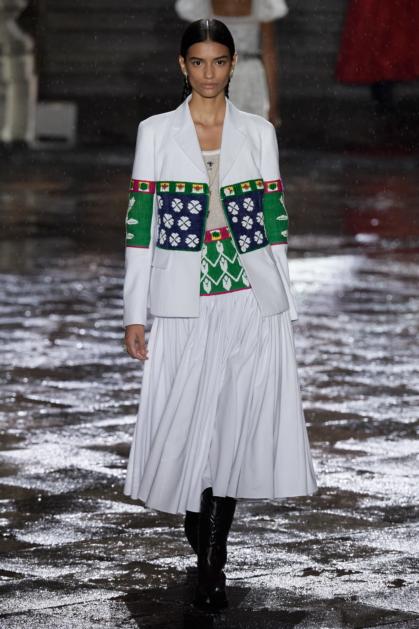 It was Morales and Rocinante who was responsible for reworking the Dior New Look suit from 1947 with vivid red, indigo, and green embroideries. It looked gorgeous, yet the cross cultural dialog is pure Chiuri: Offer up the most iconic and revered of Dior’s oeuvre, and let others interpret it to make it their own as an act of collective creative ownership. Elsewhere, Chiuri worked with the Moreno family, who are traditional hat makers, and Rafael Villa Rojas, who has jewelry workshops in Mexico City. Meanwhile, it was the Mexican Elina Chauvet, an artist and activist, who joined forces with a collective of female artisans to create the red embroideries on the absolutely exquisite group of white cotton dresses that closed the show, a sight made all the more charged by the rain that gently (though persistently) fell during the entire course of the proceedings.
