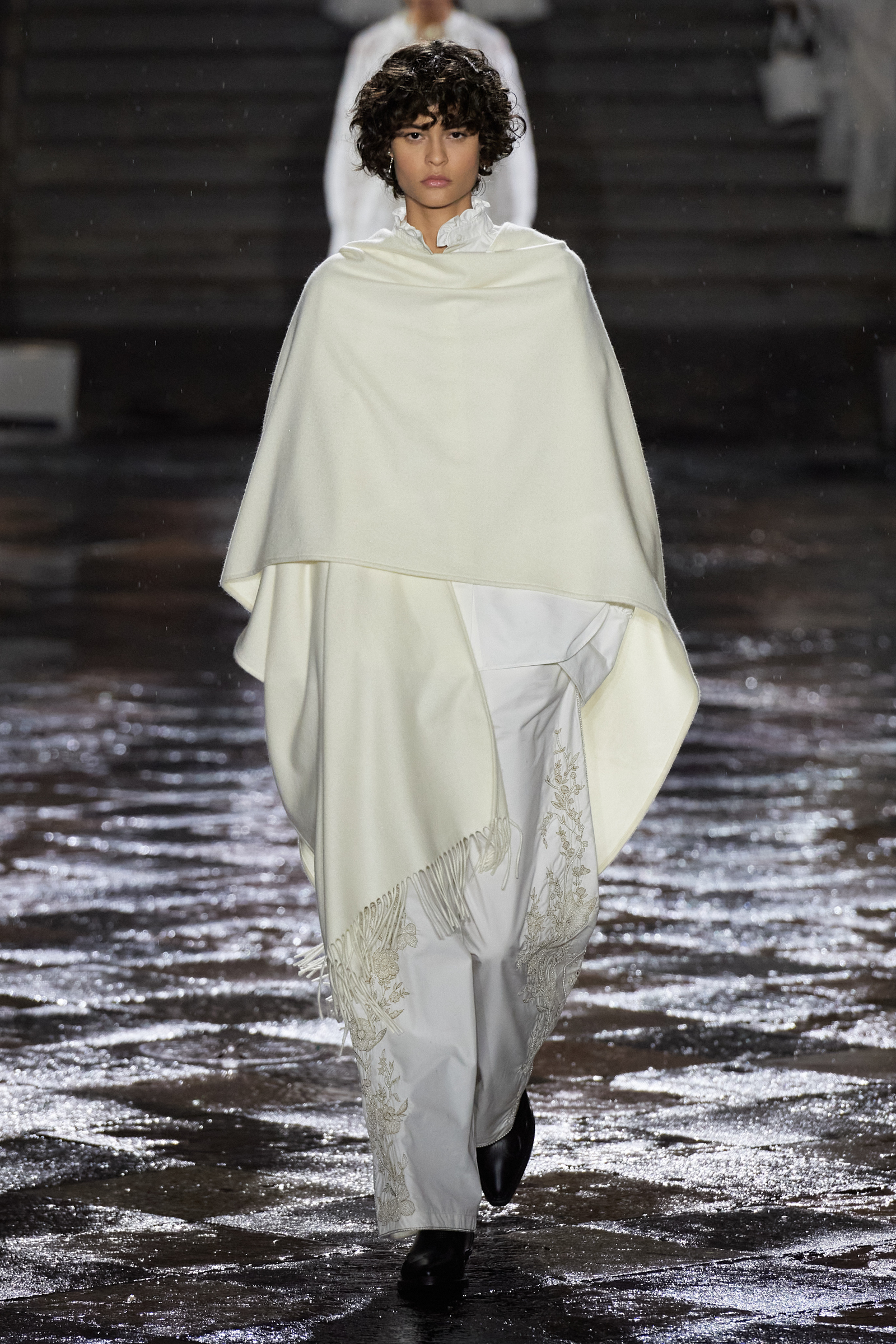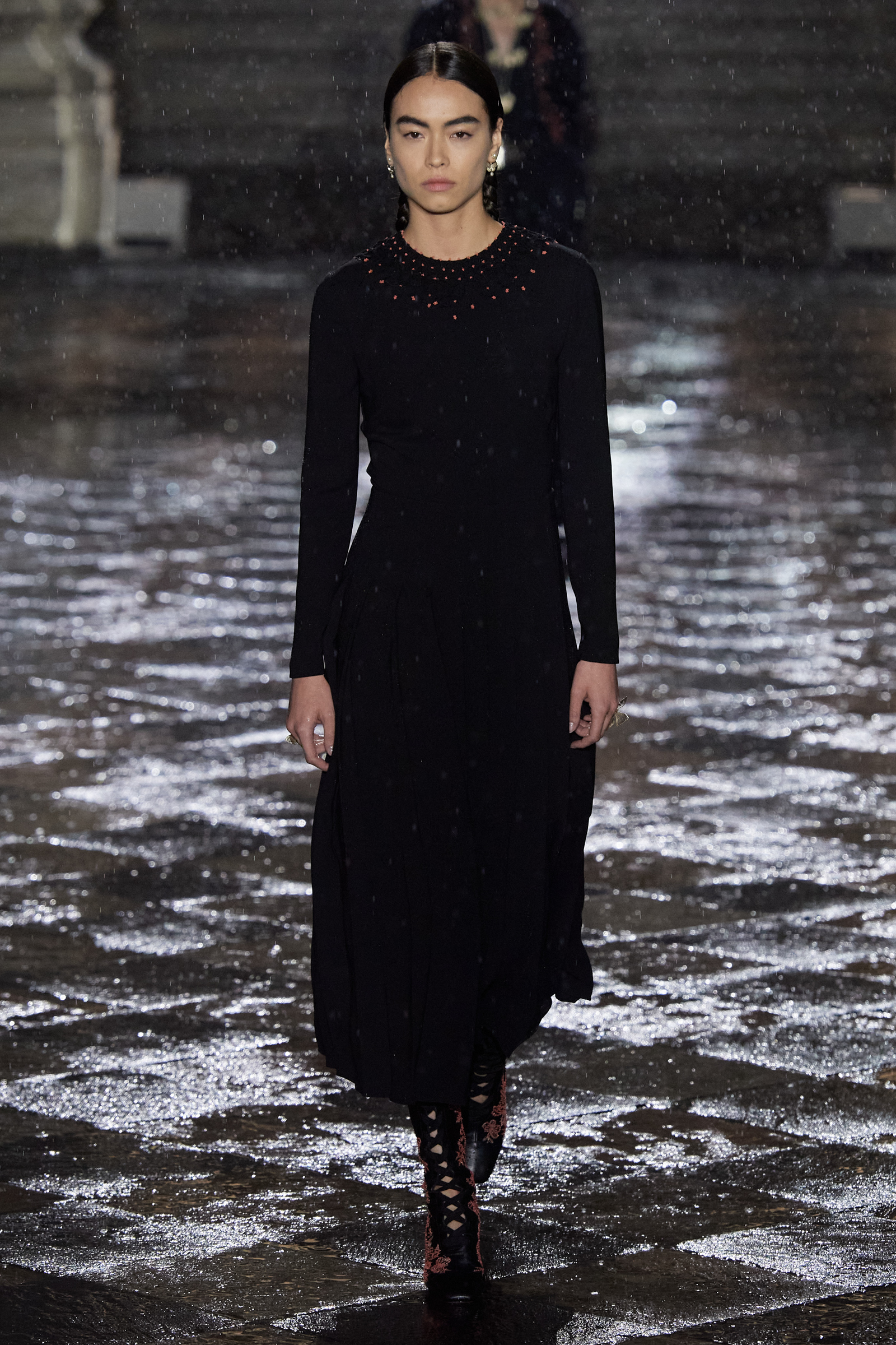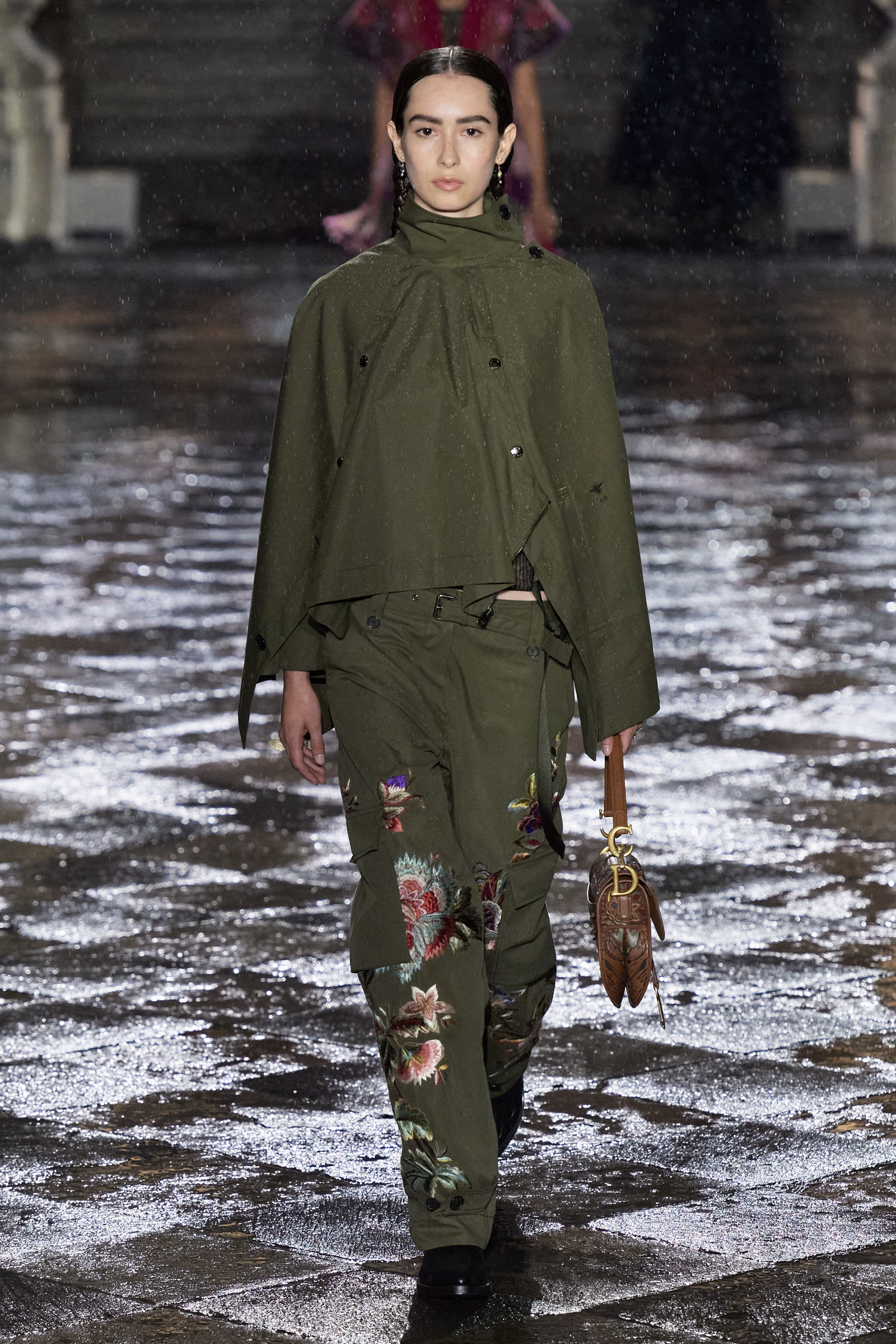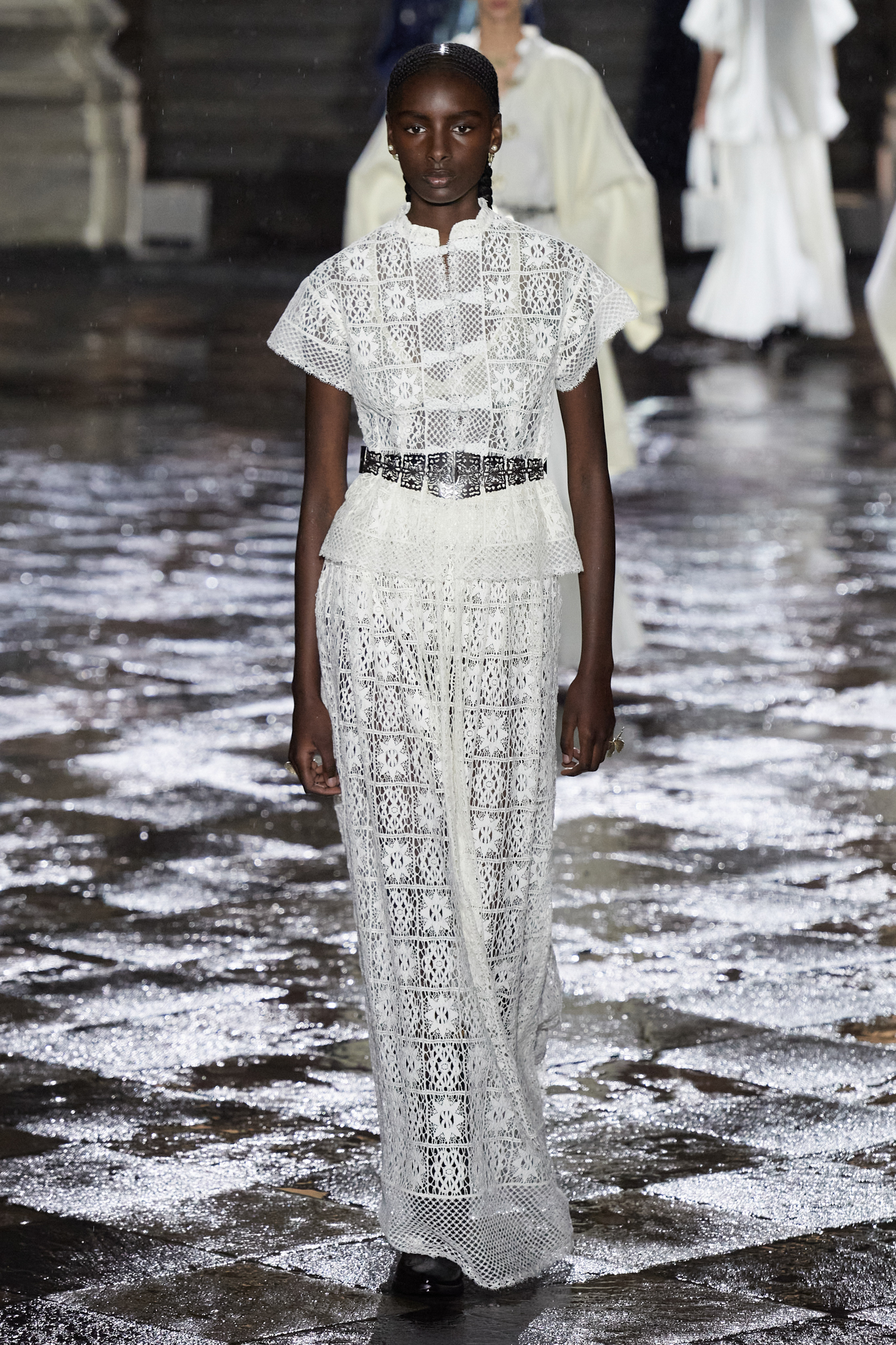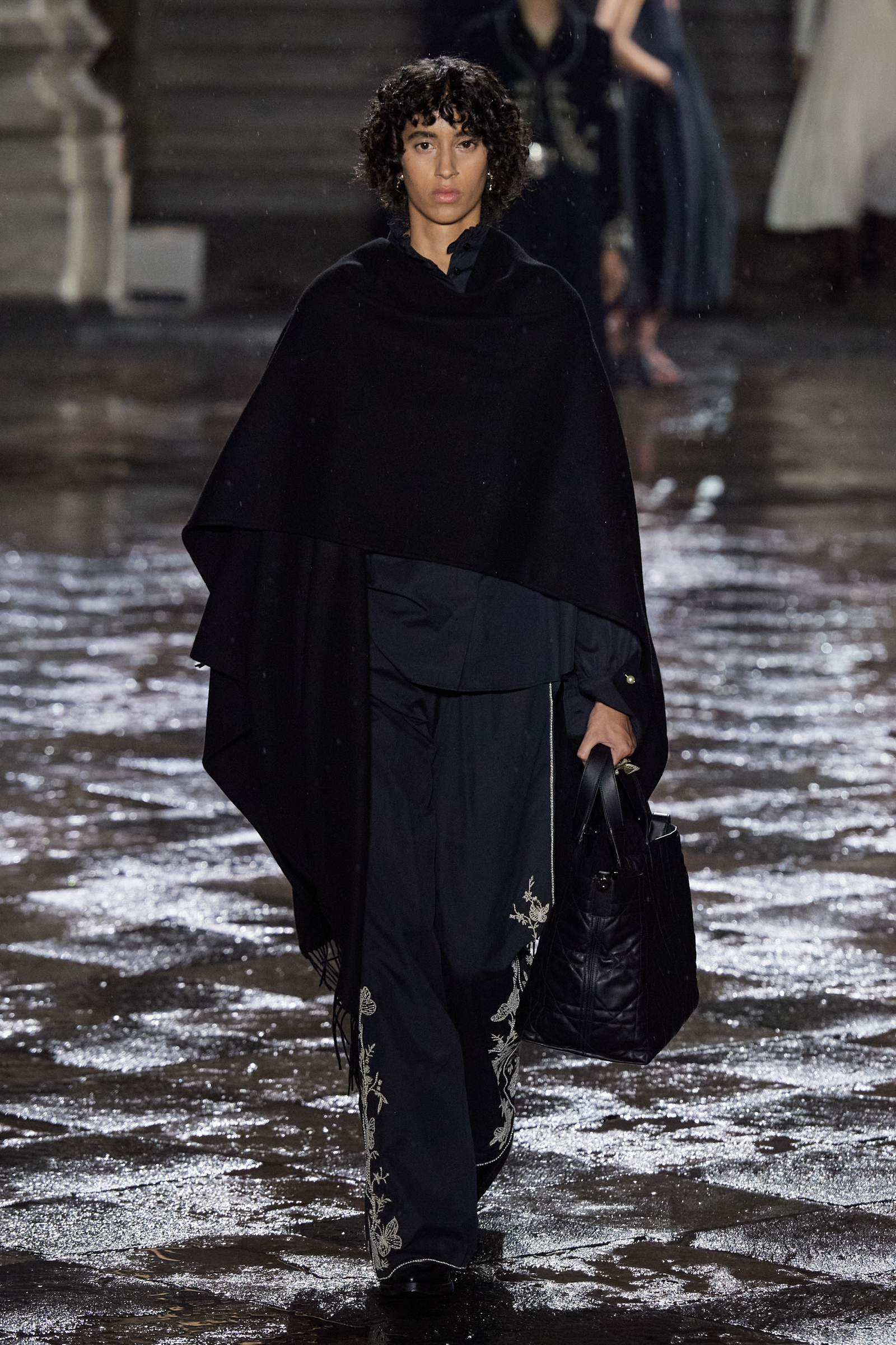 It was Morales and Rocinante who was responsible for reworking the Dior New Look suit from 1947 with vivid red, indigo, and green embroideries. It looked gorgeous, yet the cross cultural dialog is pure Chiuri: Offer up the most iconic and revered of Dior’s oeuvre, and let others interpret it to make it their own as an act of collective creative ownership. Elsewhere, Chiuri worked with the Moreno family, who are traditional hat makers, and Rafael Villa Rojas, who has jewelry workshops in Mexico City. Meanwhile, it was the Mexican Elina Chauvet, an artist and activist, who joined forces with a collective of female artisans to create the red embroideries on the absolutely exquisite group of white cotton dresses that closed the show, a sight made all the more charged by the rain that gently (though persistently) fell during the entire course of the proceedings.