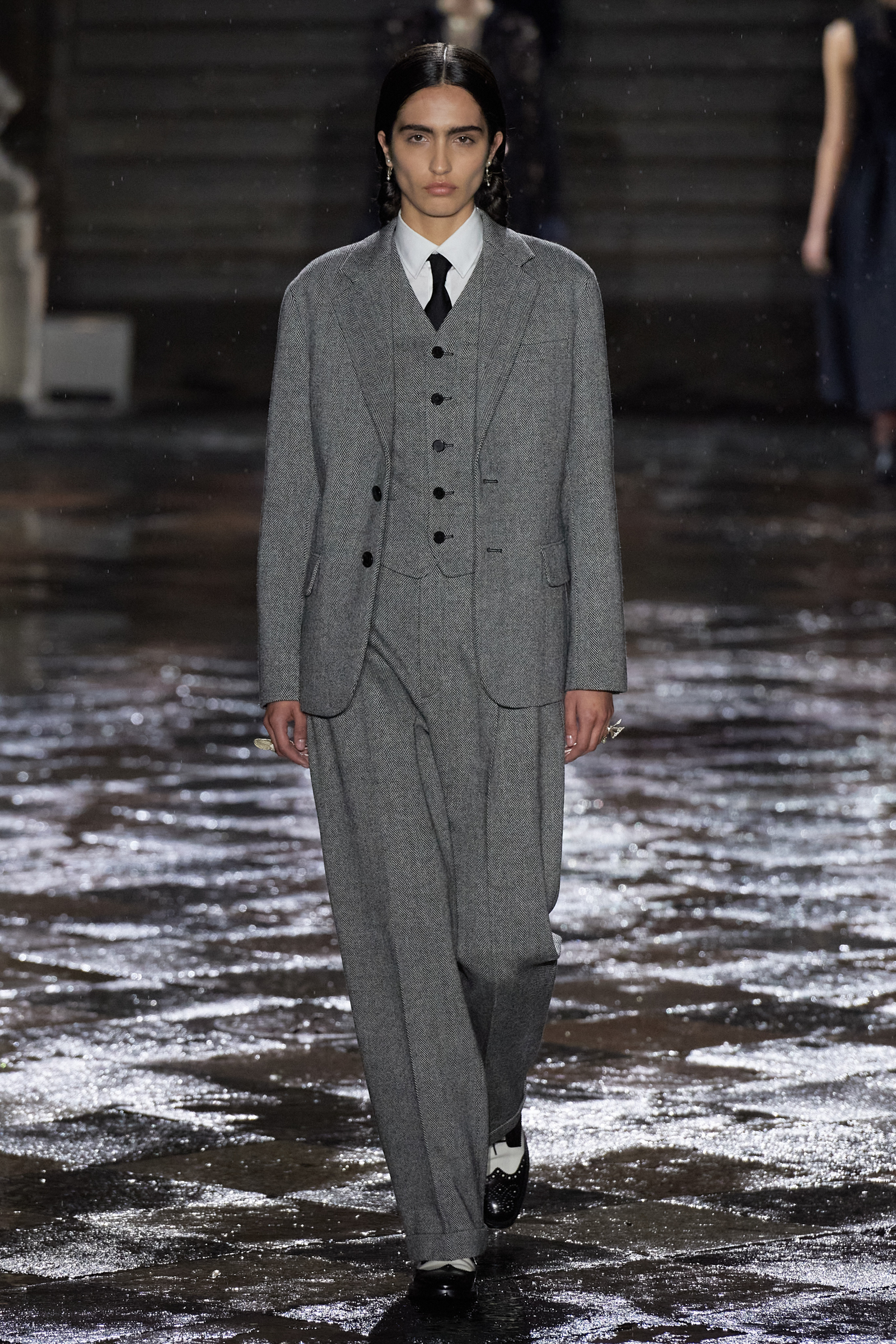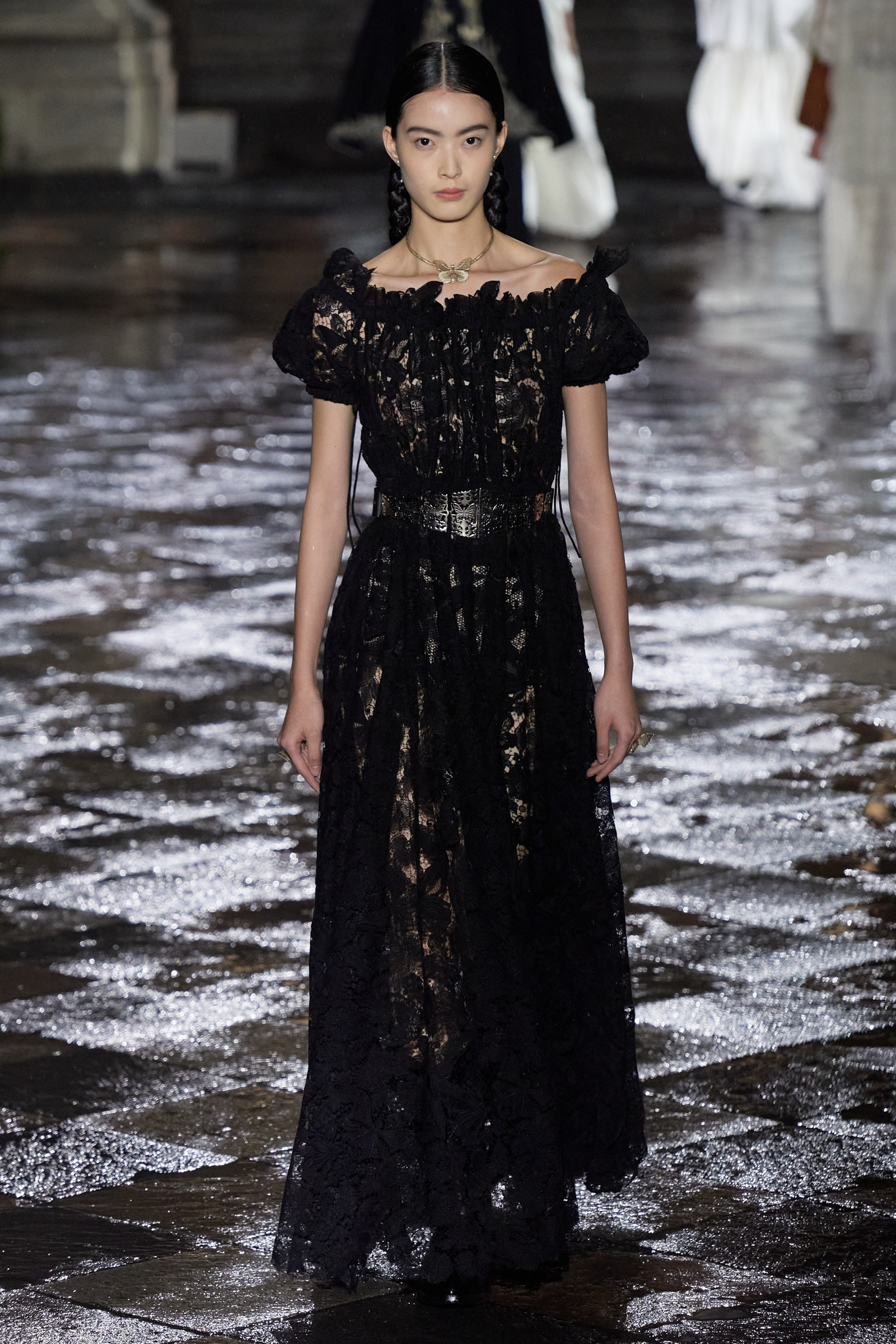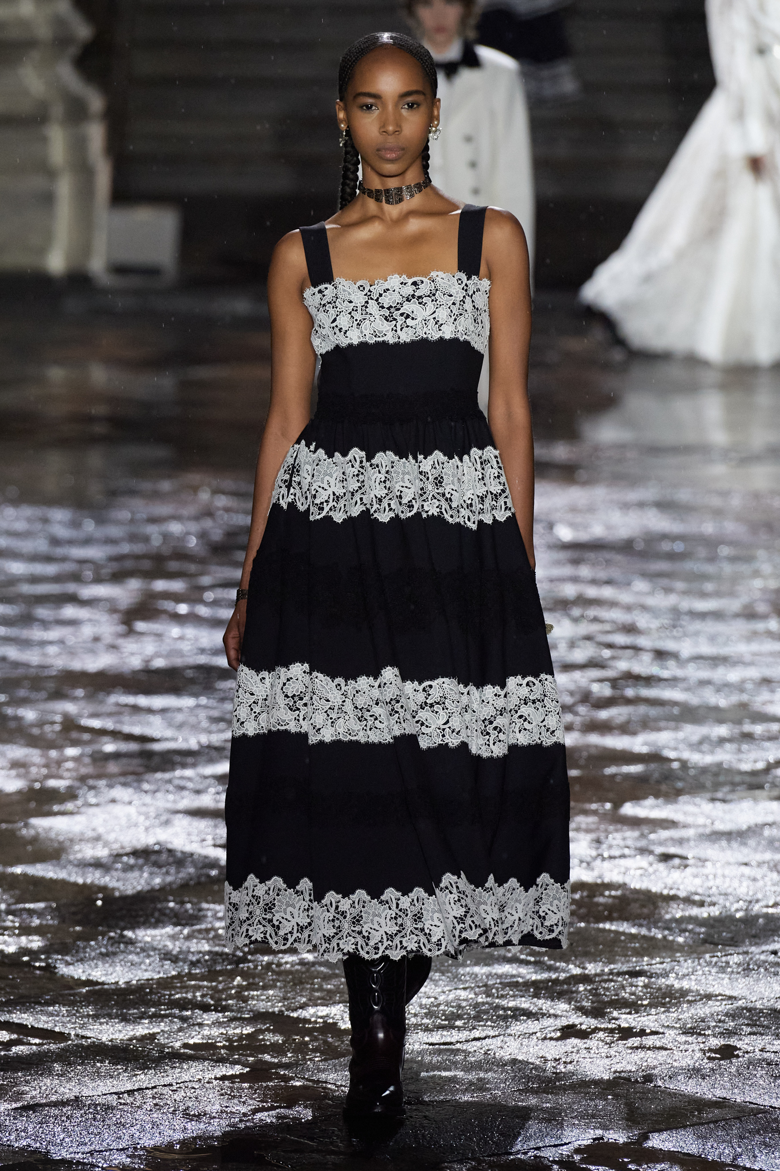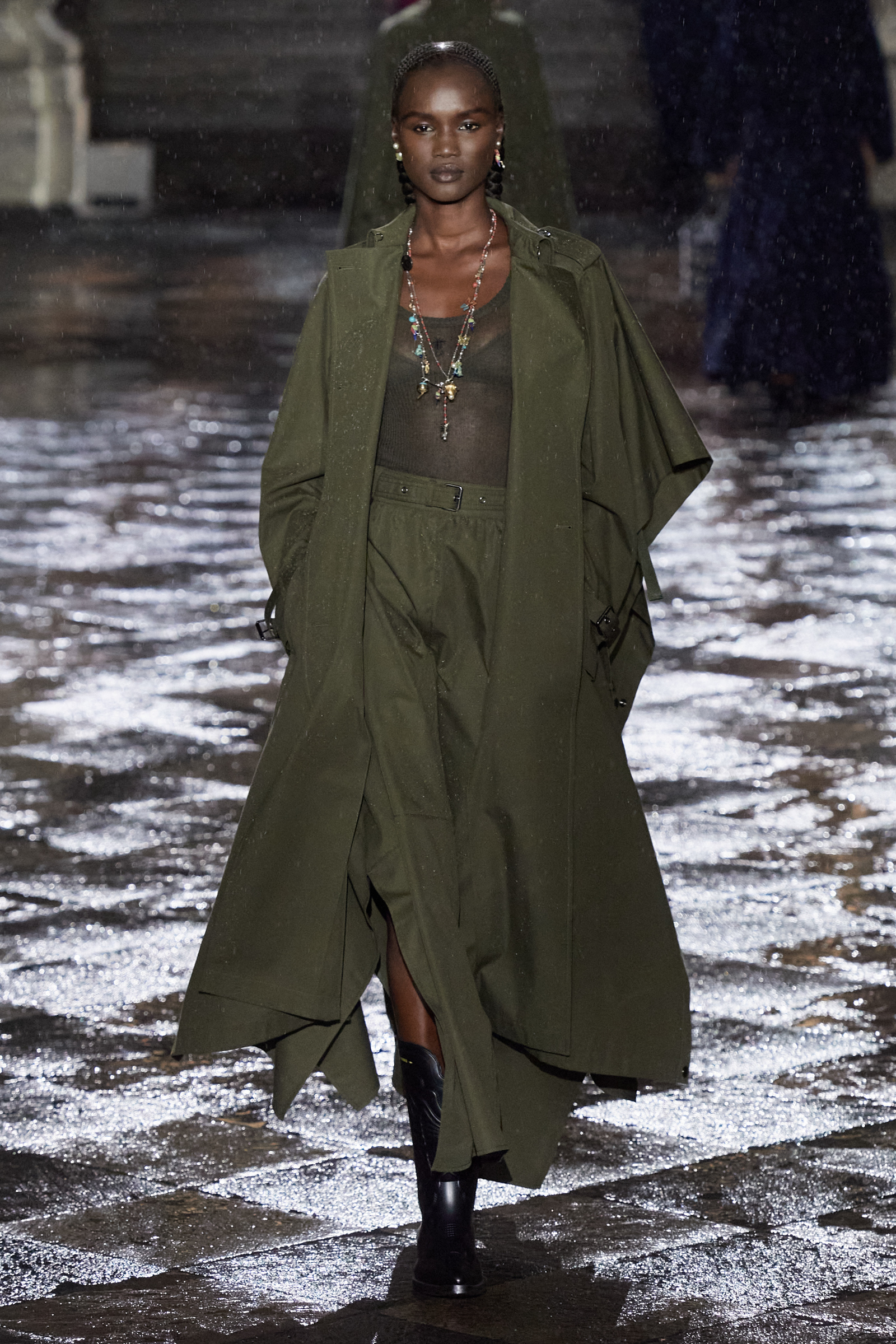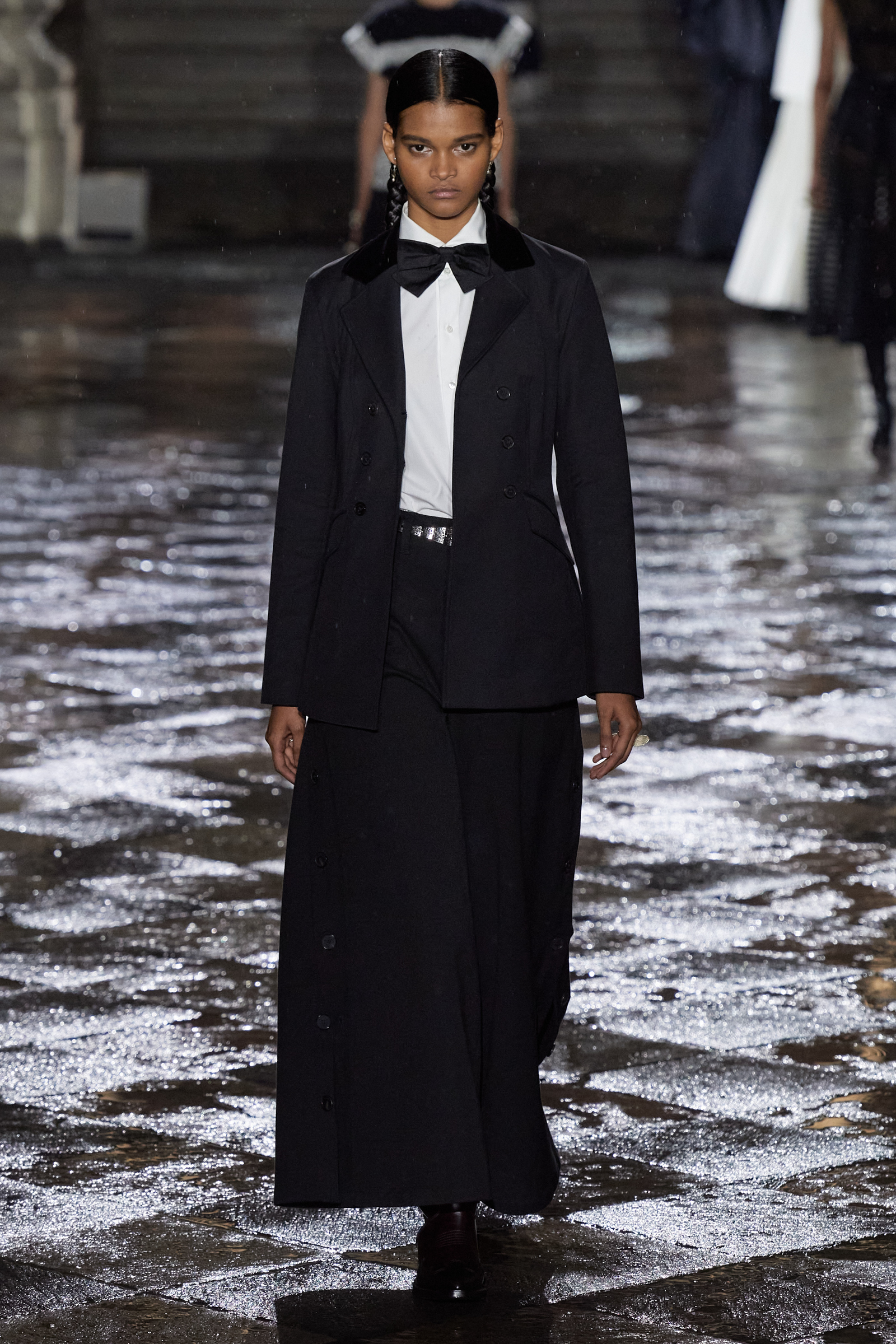 It was Morales and Rocinante who was responsible for reworking the Dior New Look suit from 1947 with vivid red, indigo, and green embroideries. It looked gorgeous, yet the cross cultural dialog is pure Chiuri: Offer up the most iconic and revered of Dior’s oeuvre, and let others interpret it to make it their own as an act of collective creative ownership. Elsewhere, Chiuri worked with the Moreno family, who are traditional hat makers, and Rafael Villa Rojas, who has jewelry workshops in Mexico City. Meanwhile, it was the Mexican Elina Chauvet, an artist and activist, who joined forces with a collective of female artisans to create the red embroideries on the absolutely exquisite group of white cotton dresses that closed the show, a sight made all the more charged by the rain that gently (though persistently) fell during the entire course of the proceedings.