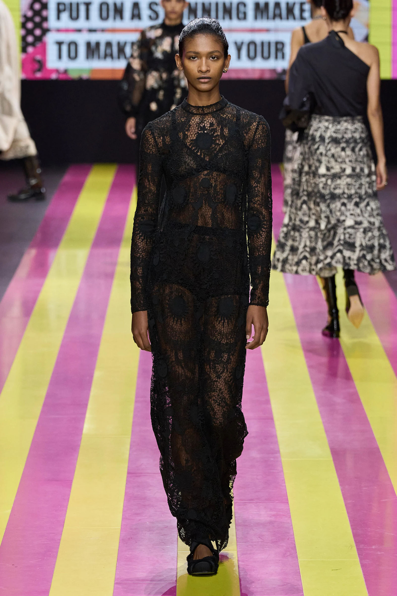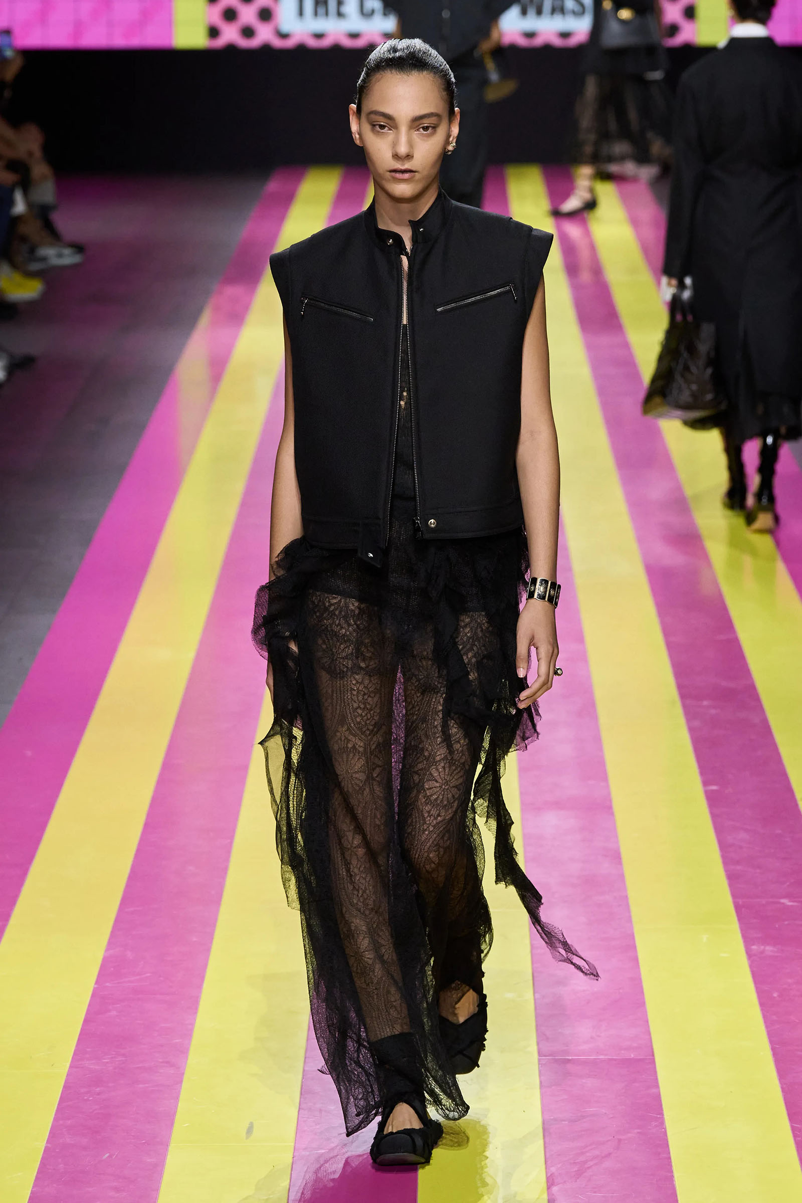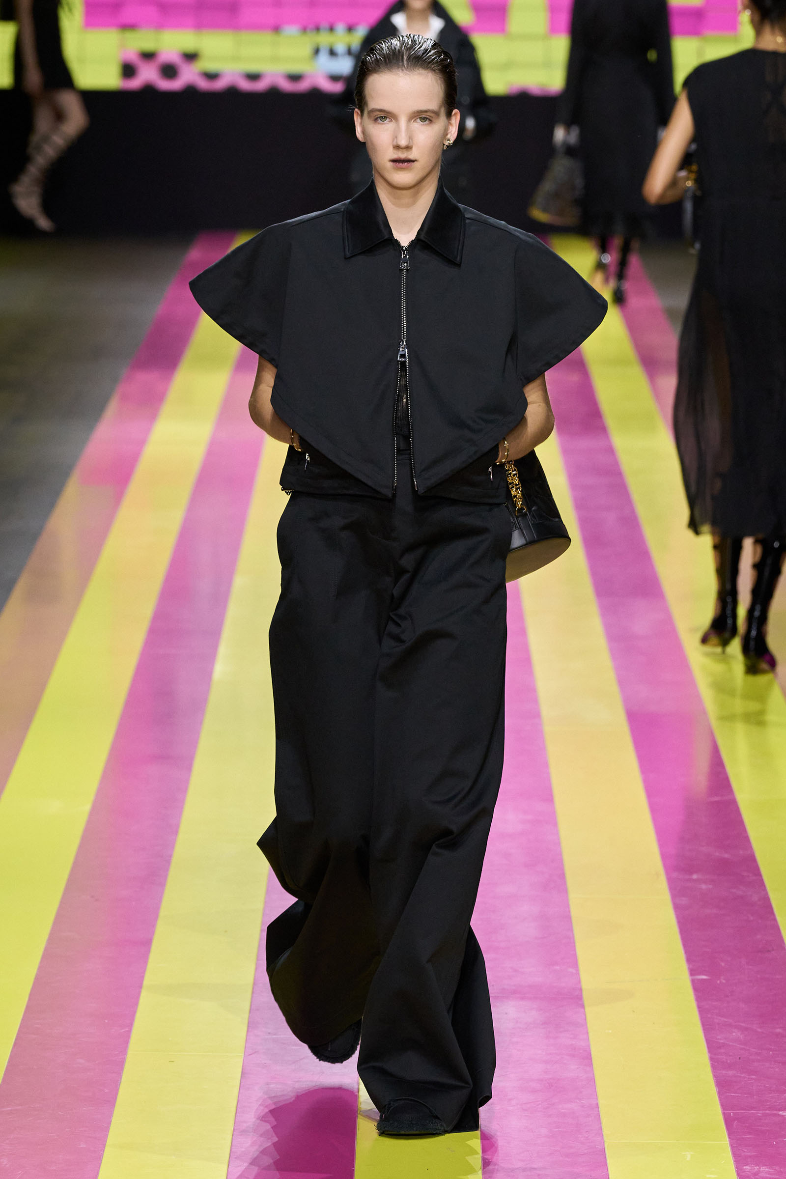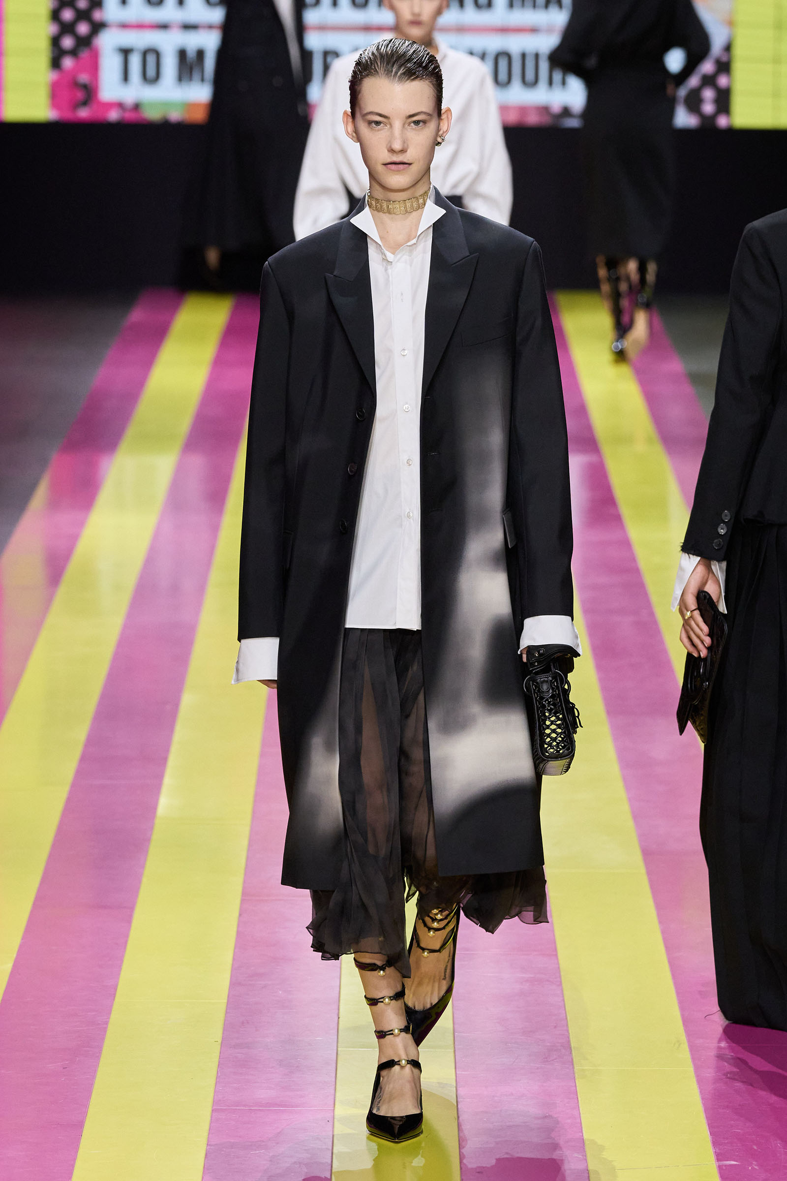 She’s persisted in pursuing that anti-stereotyping principle even more strongly. In this collection there were multiple threads and subtexts both woven together and physically unraveling in the clothes, and a blindingly obvious feminist art statement on the walls. In a post-Barbie world, the irony of the neon pink and yellow highlighting and rebutting sexist advertising (by the Italian artist Elena Bellantoni) wouldn’t be lost on a young audience. Nor would the contrasting darkness—a bit furious, a chic variety of Parisian neo-grunge, really—that came out on the runway.