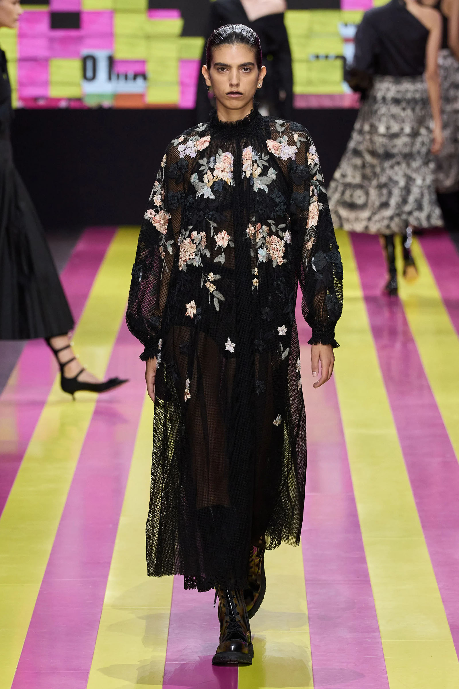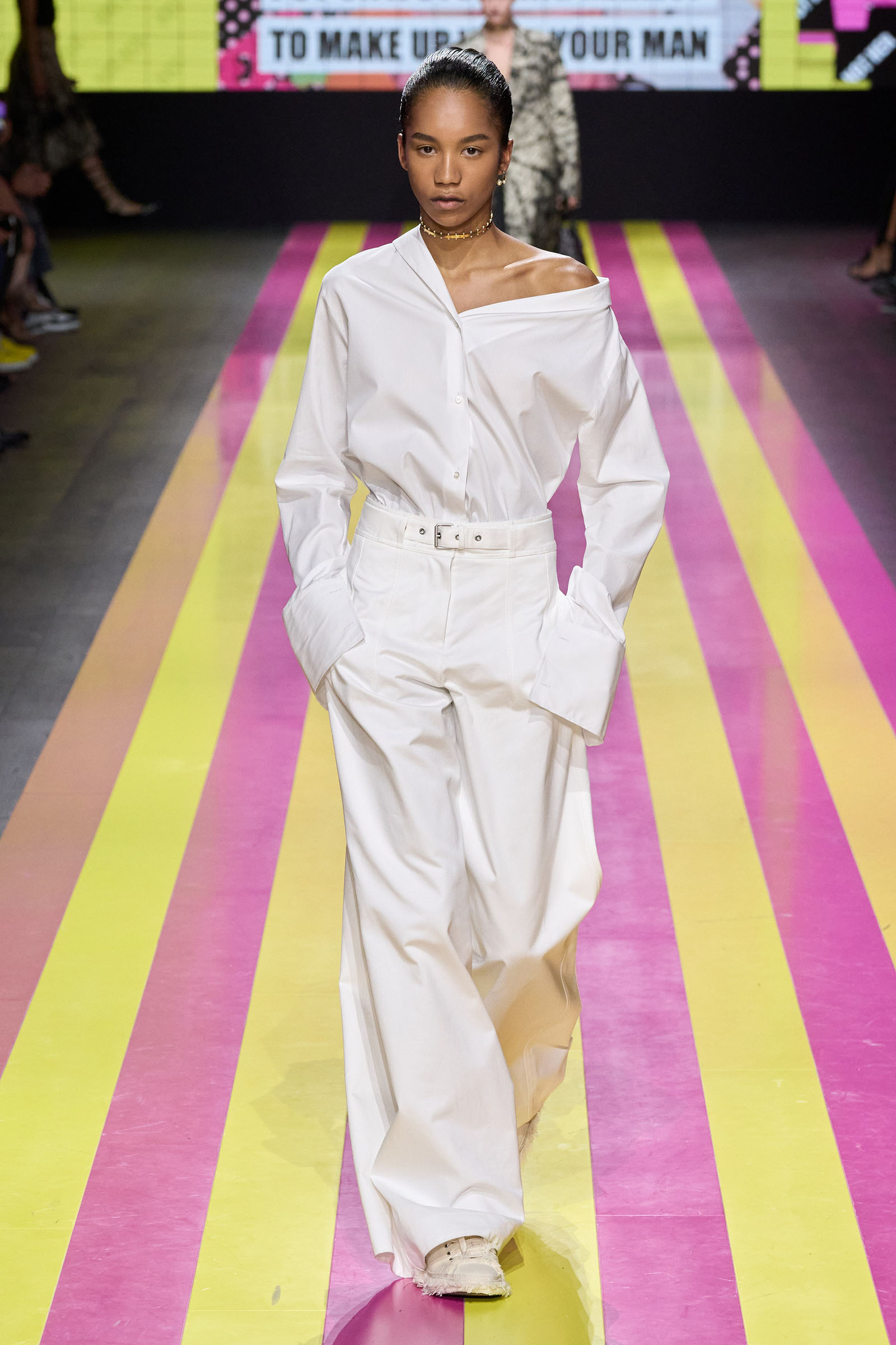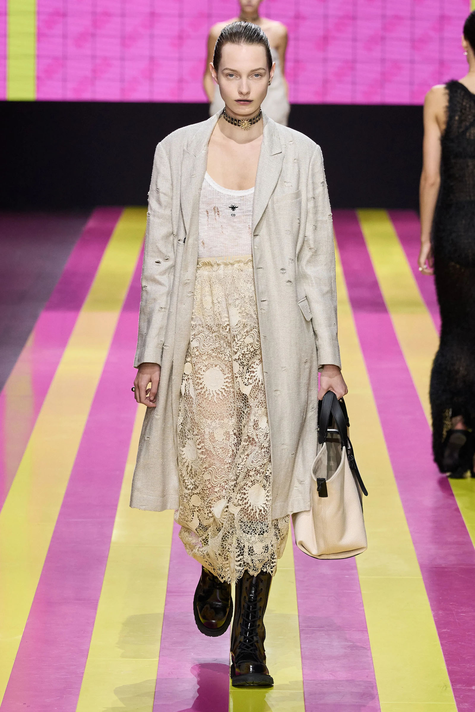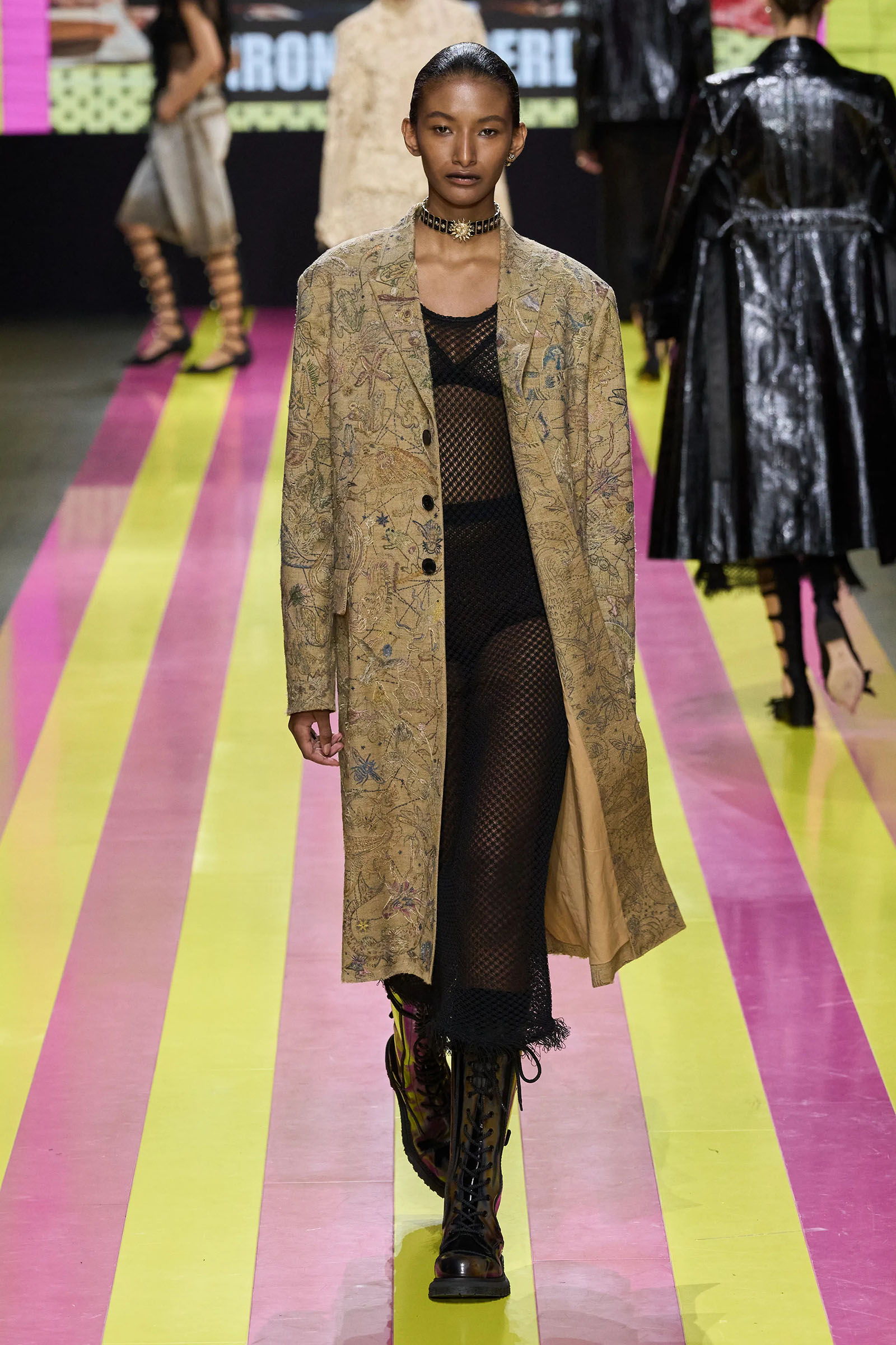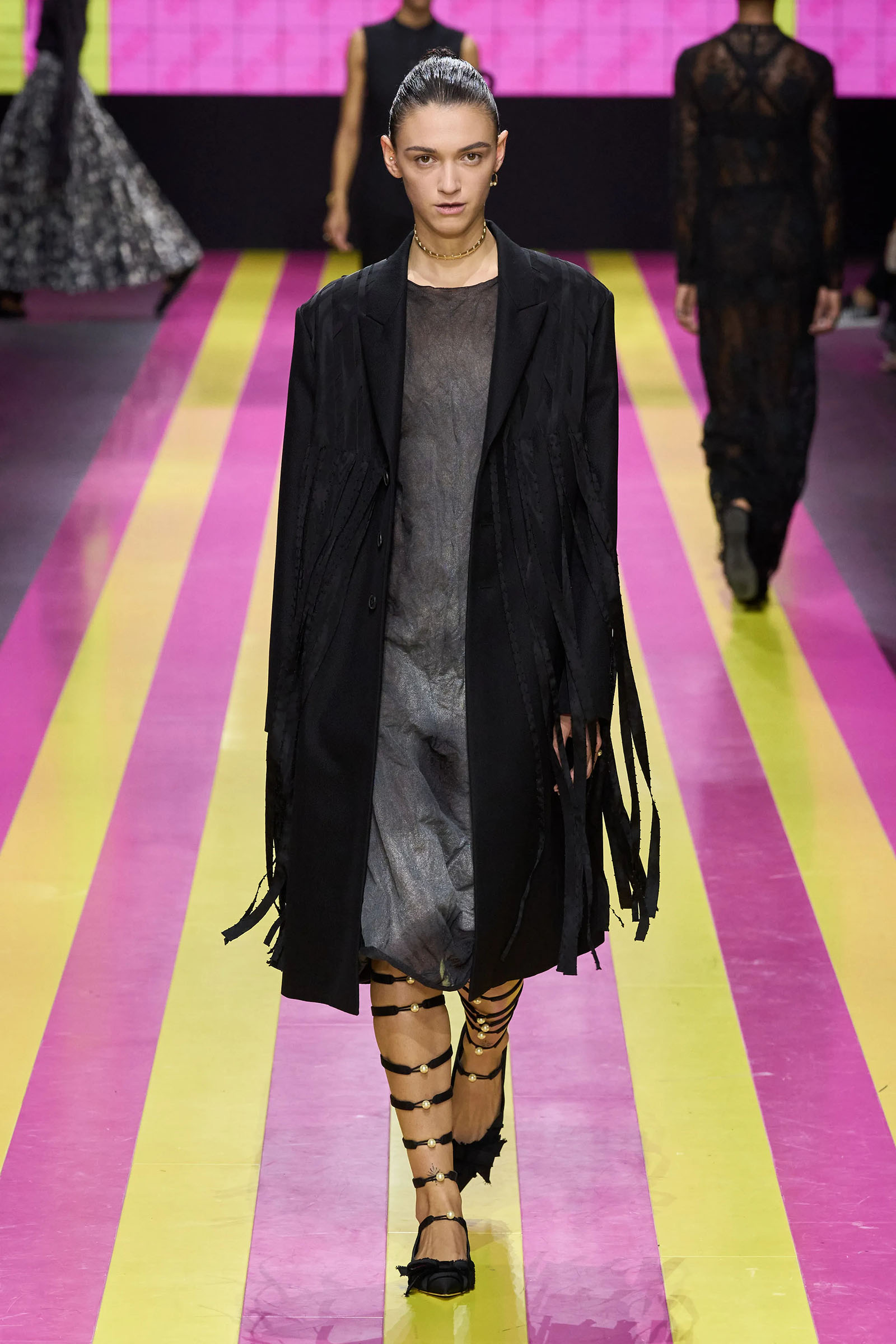 She’s persisted in pursuing that anti-stereotyping principle even more strongly. In this collection there were multiple threads and subtexts both woven together and physically unraveling in the clothes, and a blindingly obvious feminist art statement on the walls. In a post-Barbie world, the irony of the neon pink and yellow highlighting and rebutting sexist advertising (by the Italian artist Elena Bellantoni) wouldn’t be lost on a young audience. Nor would the contrasting darkness—a bit furious, a chic variety of Parisian neo-grunge, really—that came out on the runway.