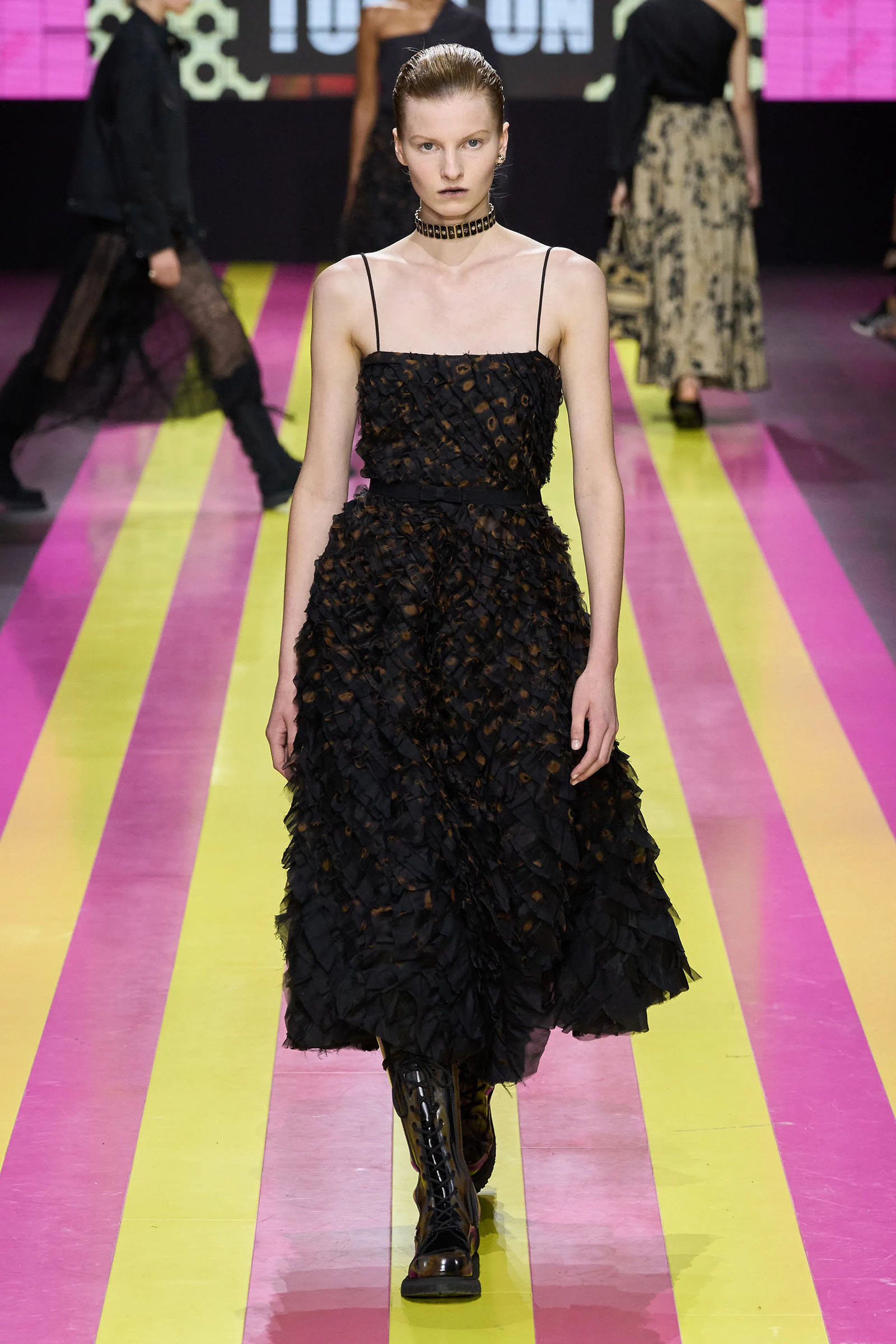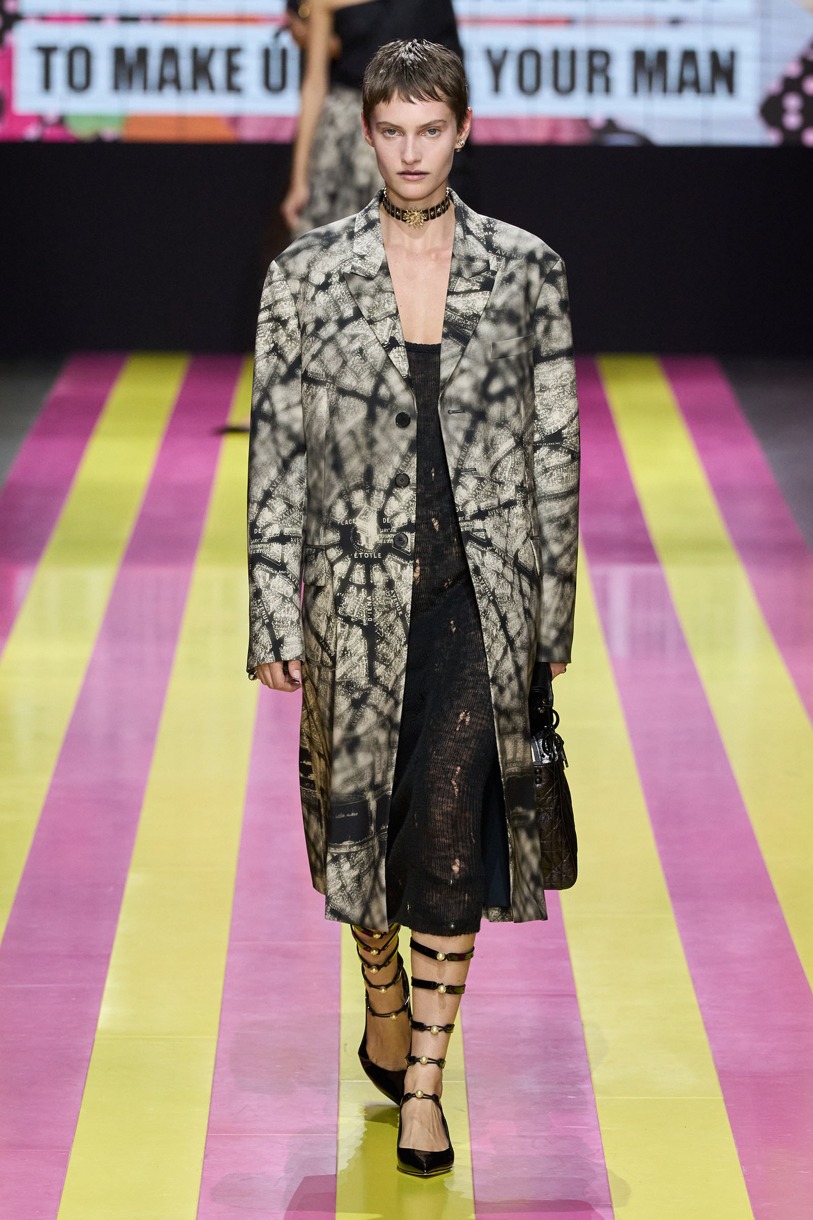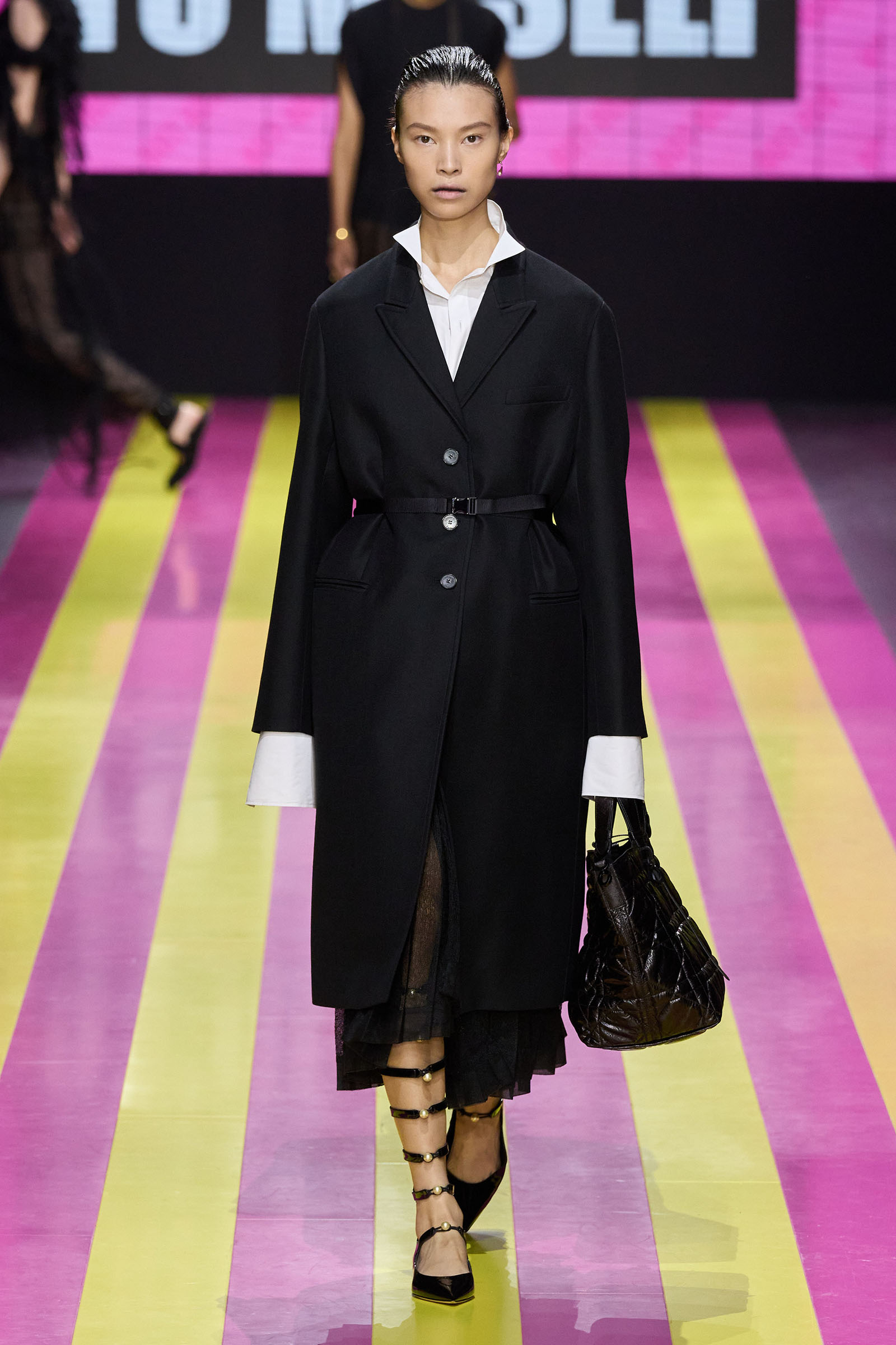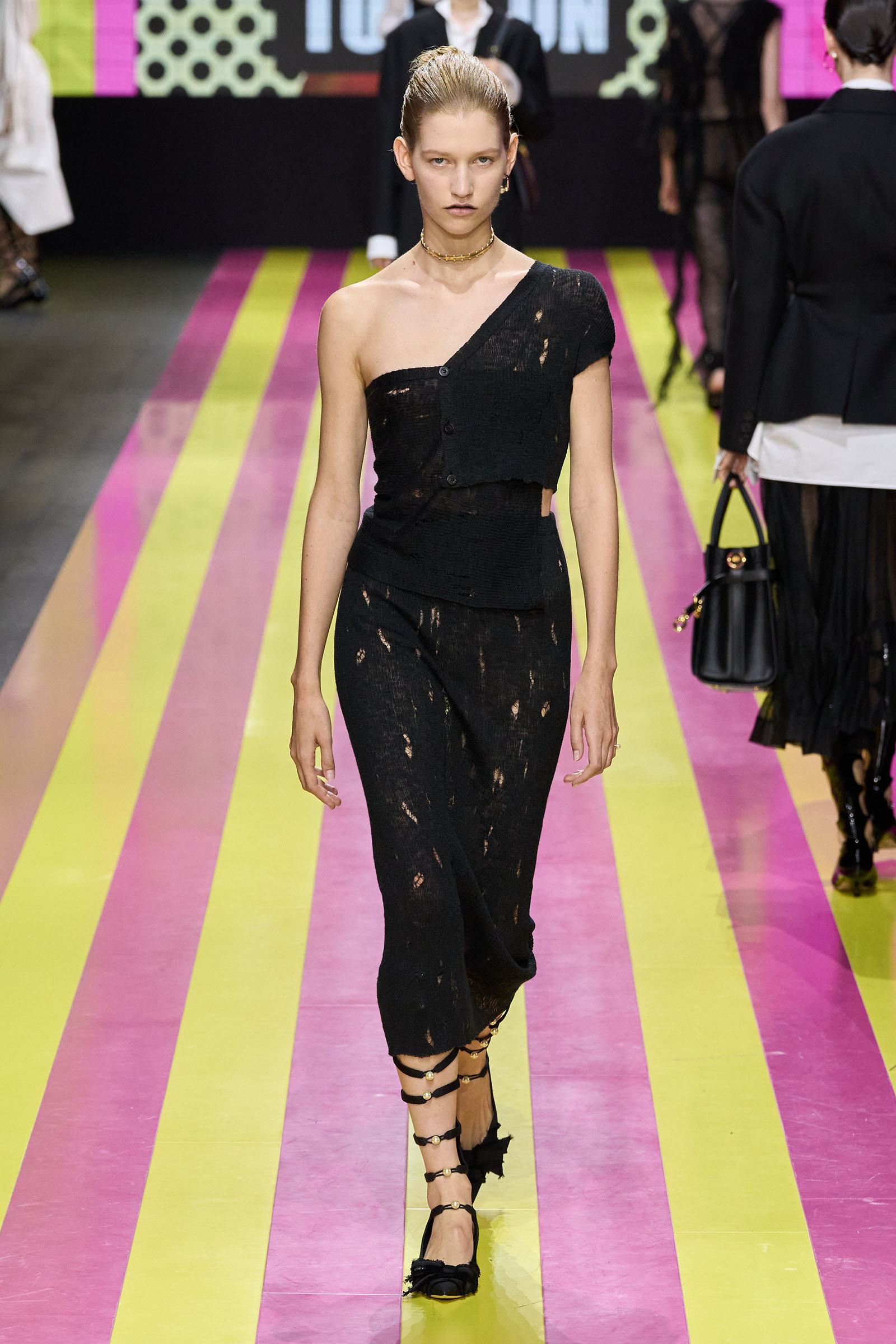 She’s persisted in pursuing that anti-stereotyping principle even more strongly. In this collection there were multiple threads and subtexts both woven together and physically unraveling in the clothes, and a blindingly obvious feminist art statement on the walls. In a post-Barbie world, the irony of the neon pink and yellow highlighting and rebutting sexist advertising (by the Italian artist Elena Bellantoni) wouldn’t be lost on a young audience. Nor would the contrasting darkness—a bit furious, a chic variety of Parisian neo-grunge, really—that came out on the runway.