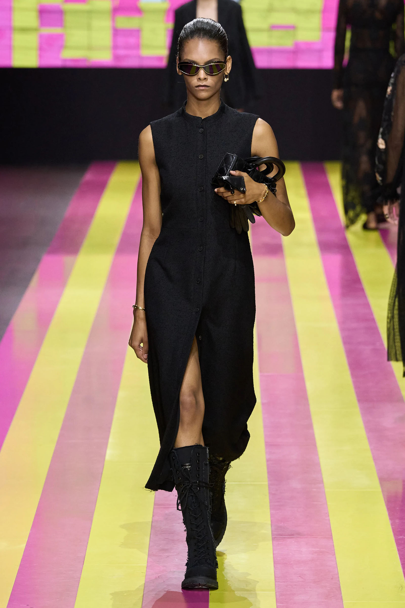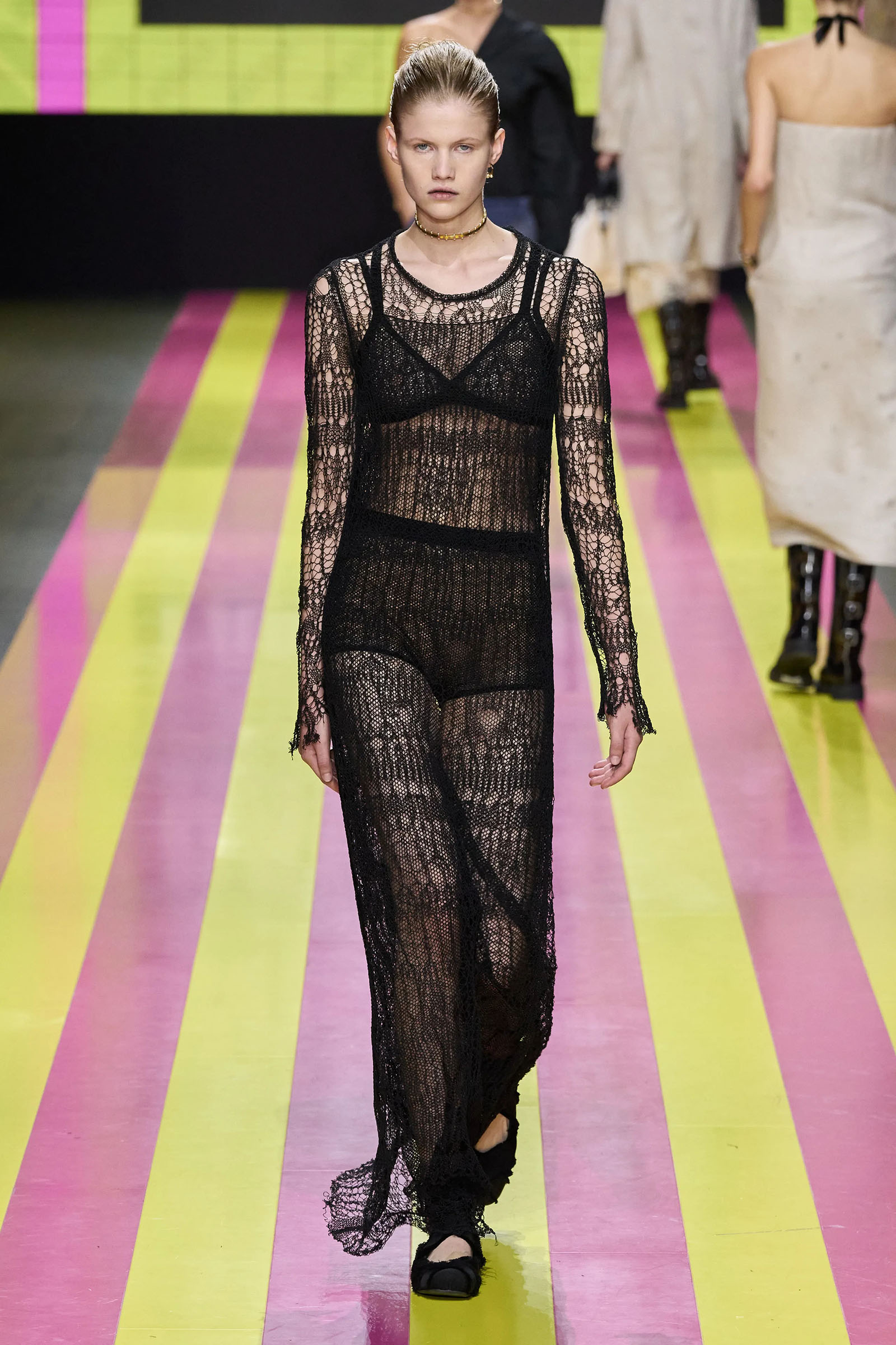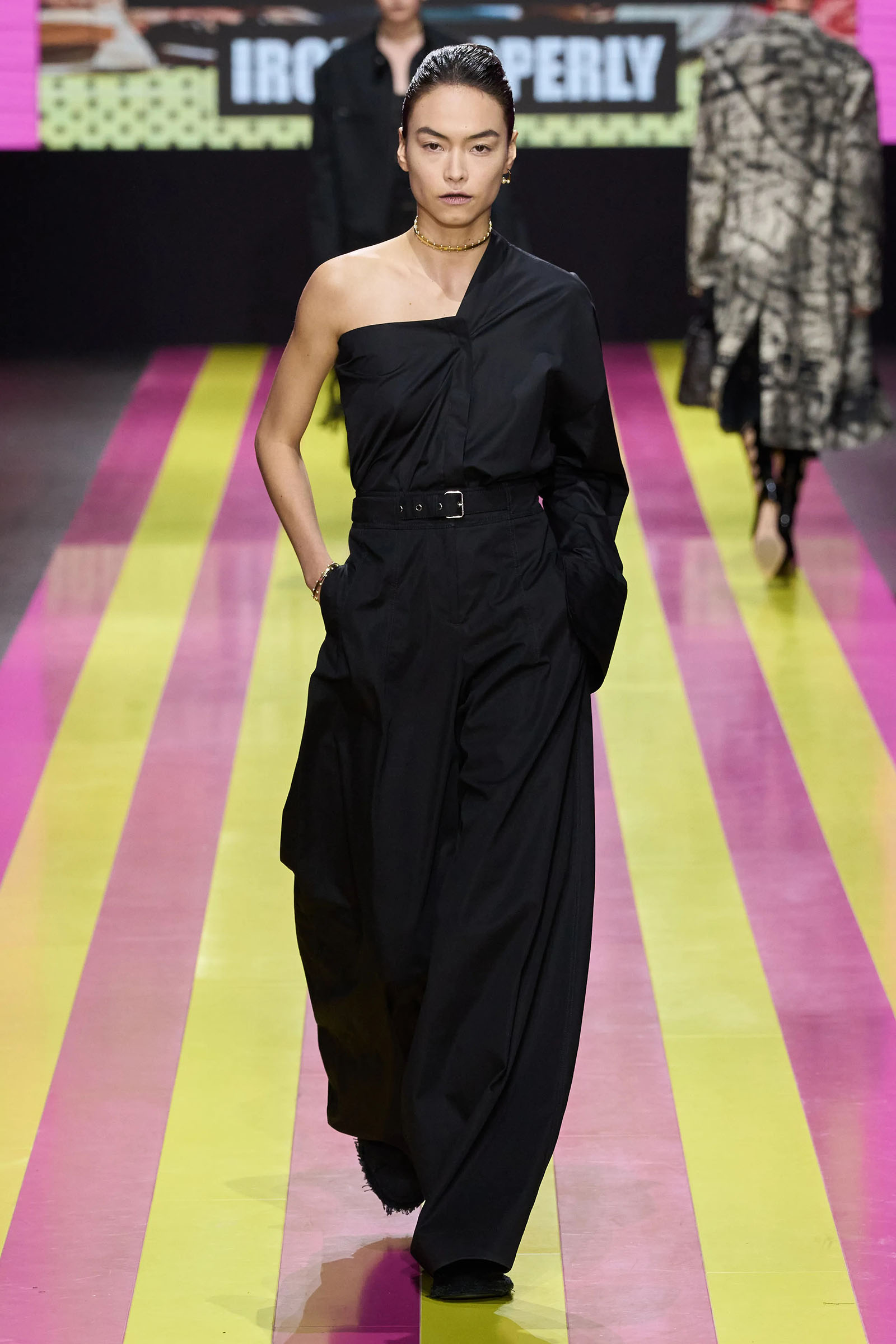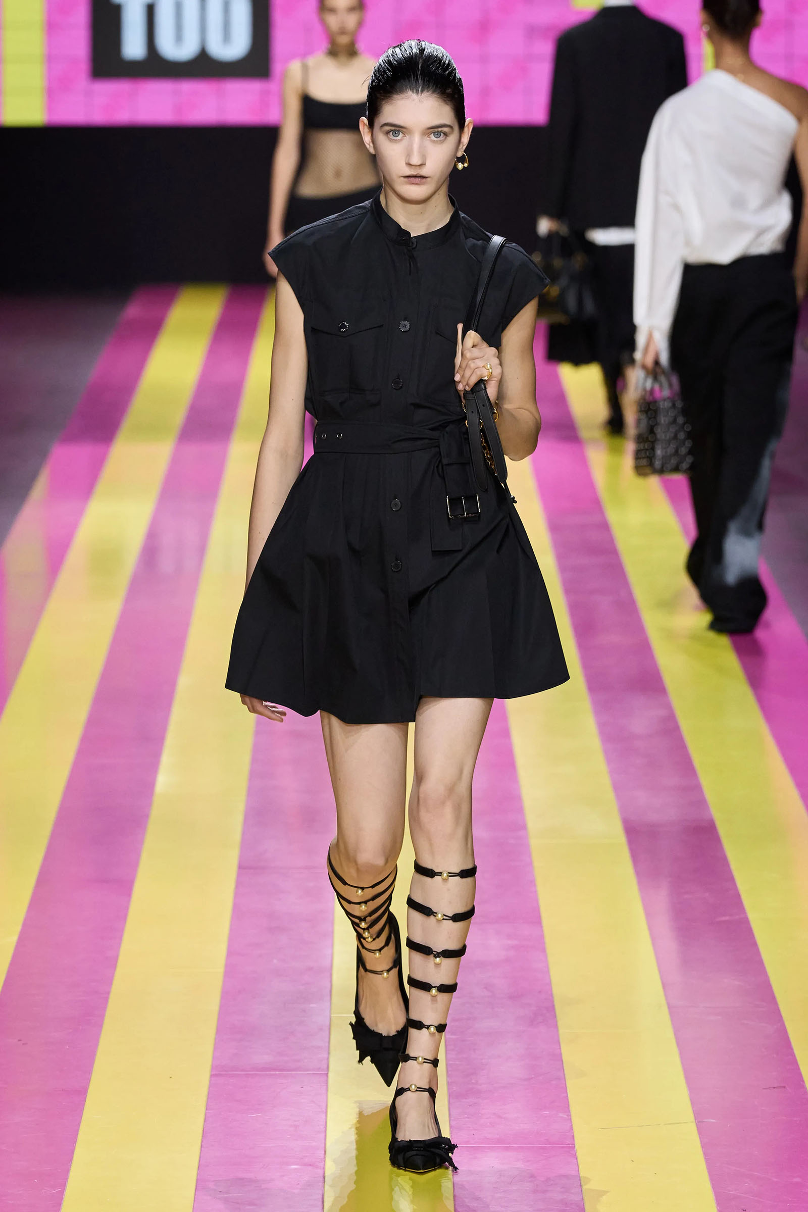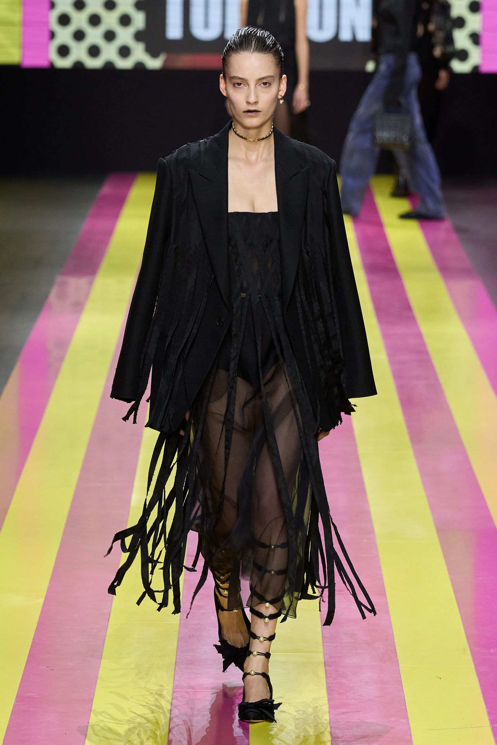 She’s persisted in pursuing that anti-stereotyping principle even more strongly. In this collection there were multiple threads and subtexts both woven together and physically unraveling in the clothes, and a blindingly obvious feminist art statement on the walls. In a post-Barbie world, the irony of the neon pink and yellow highlighting and rebutting sexist advertising (by the Italian artist Elena Bellantoni) wouldn’t be lost on a young audience. Nor would the contrasting darkness—a bit furious, a chic variety of Parisian neo-grunge, really—that came out on the runway.
