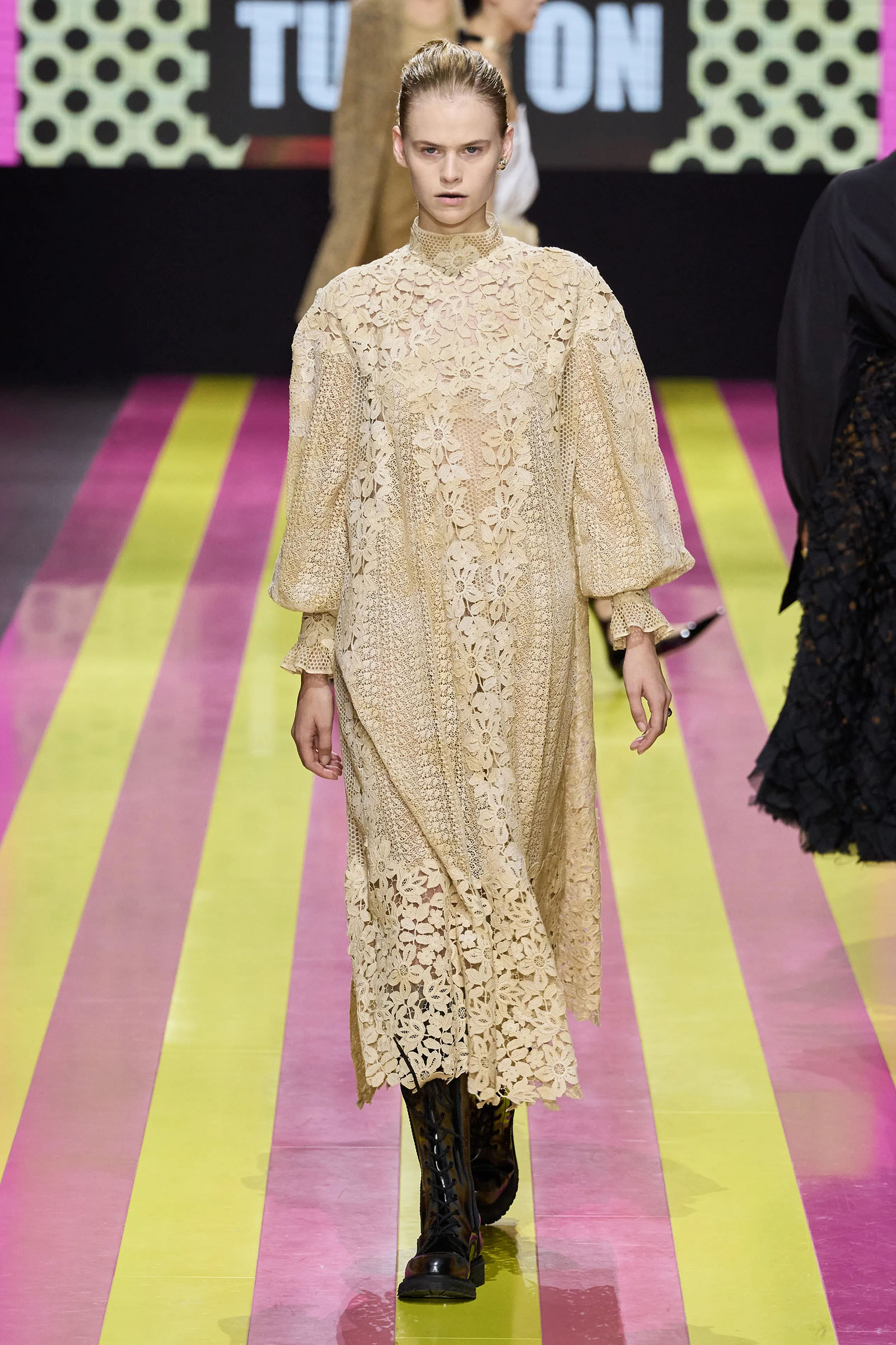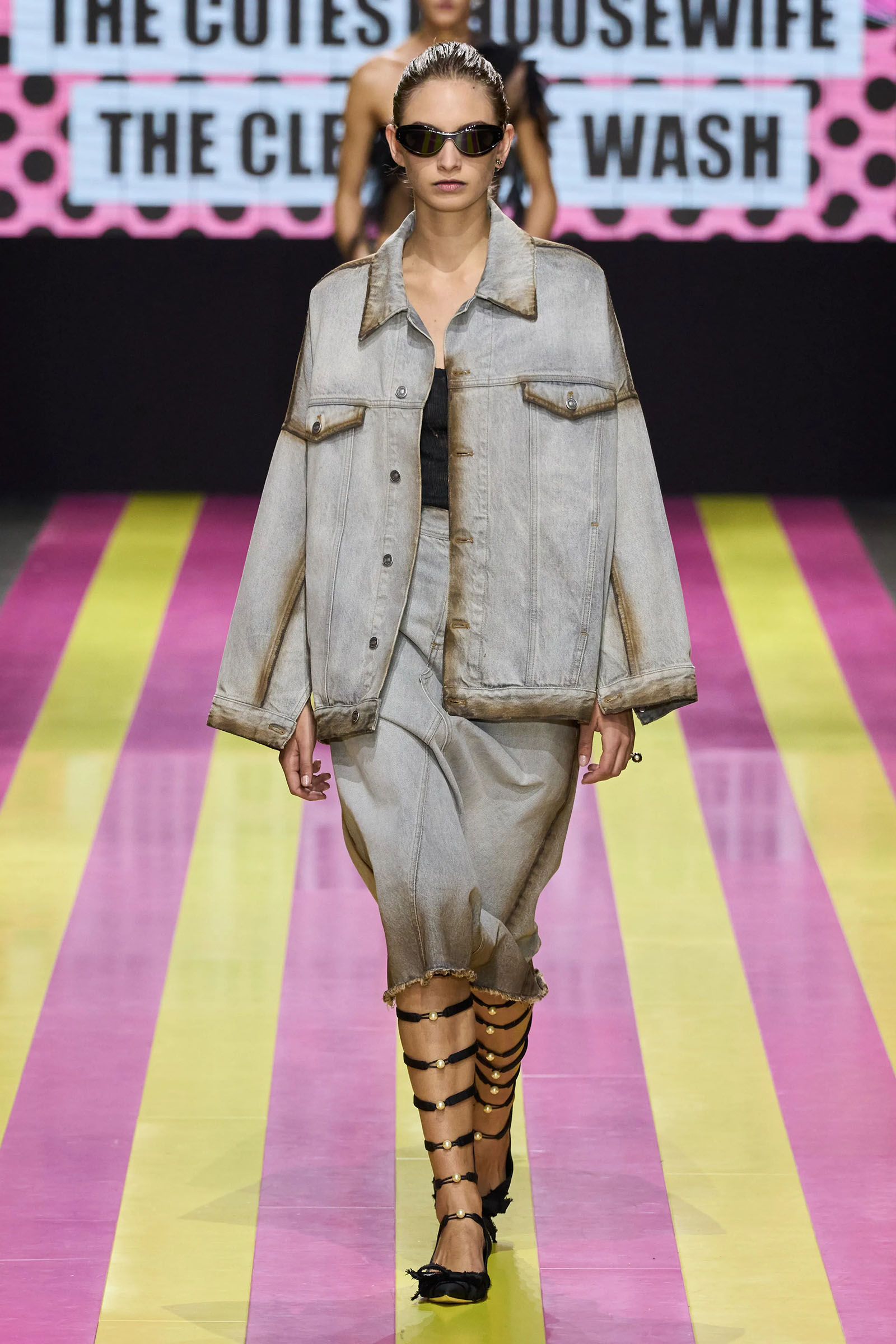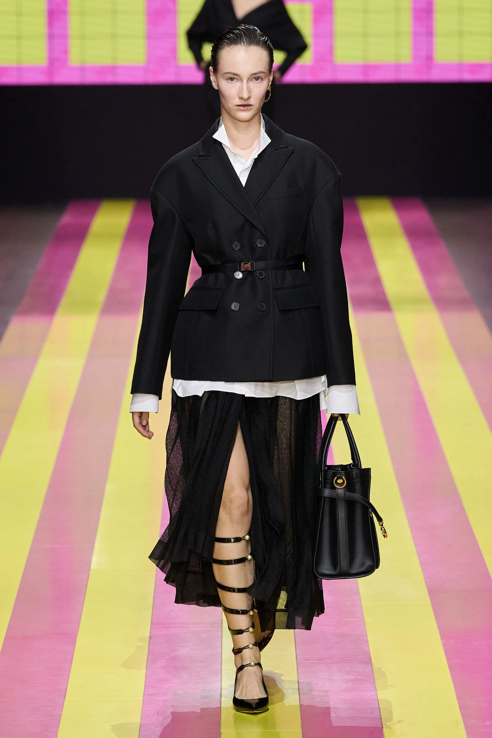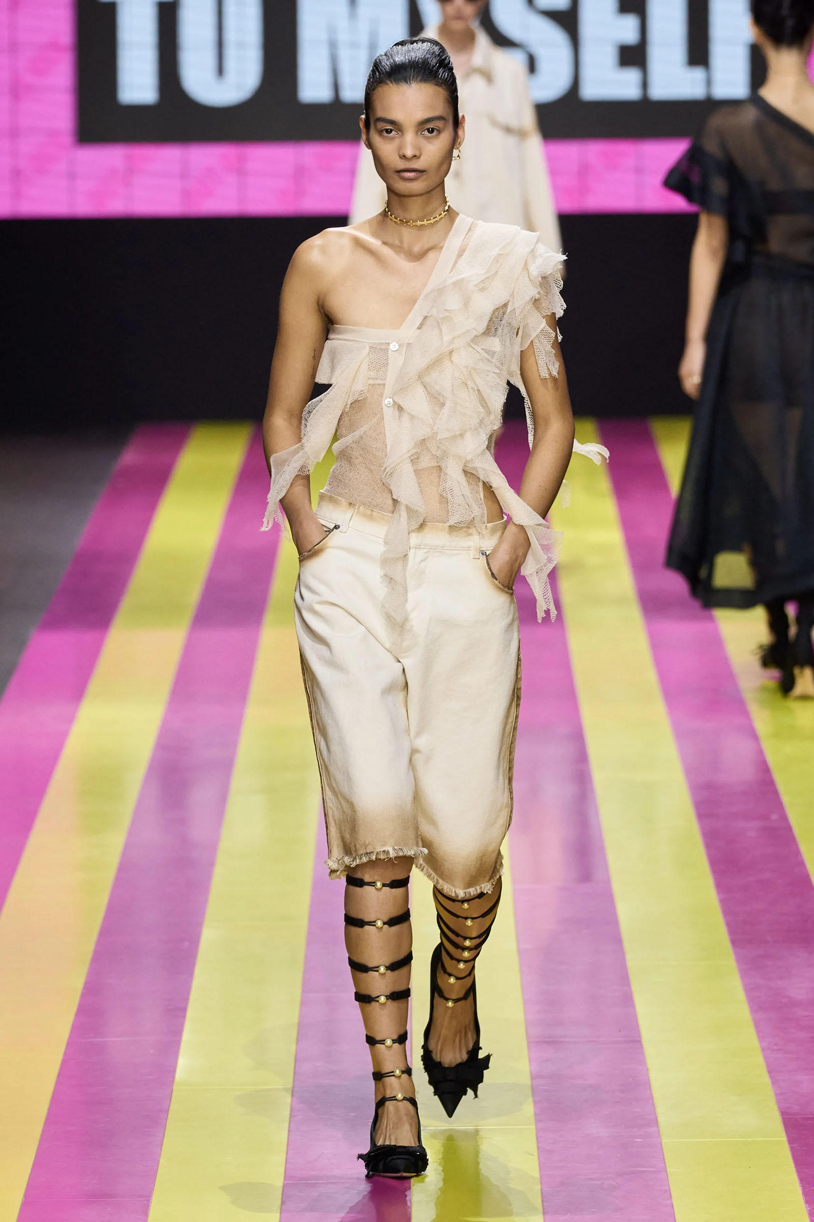 She’s persisted in pursuing that anti-stereotyping principle even more strongly. In this collection there were multiple threads and subtexts both woven together and physically unraveling in the clothes, and a blindingly obvious feminist art statement on the walls. In a post-Barbie world, the irony of the neon pink and yellow highlighting and rebutting sexist advertising (by the Italian artist Elena Bellantoni) wouldn’t be lost on a young audience. Nor would the contrasting darkness—a bit furious, a chic variety of Parisian neo-grunge, really—that came out on the runway.