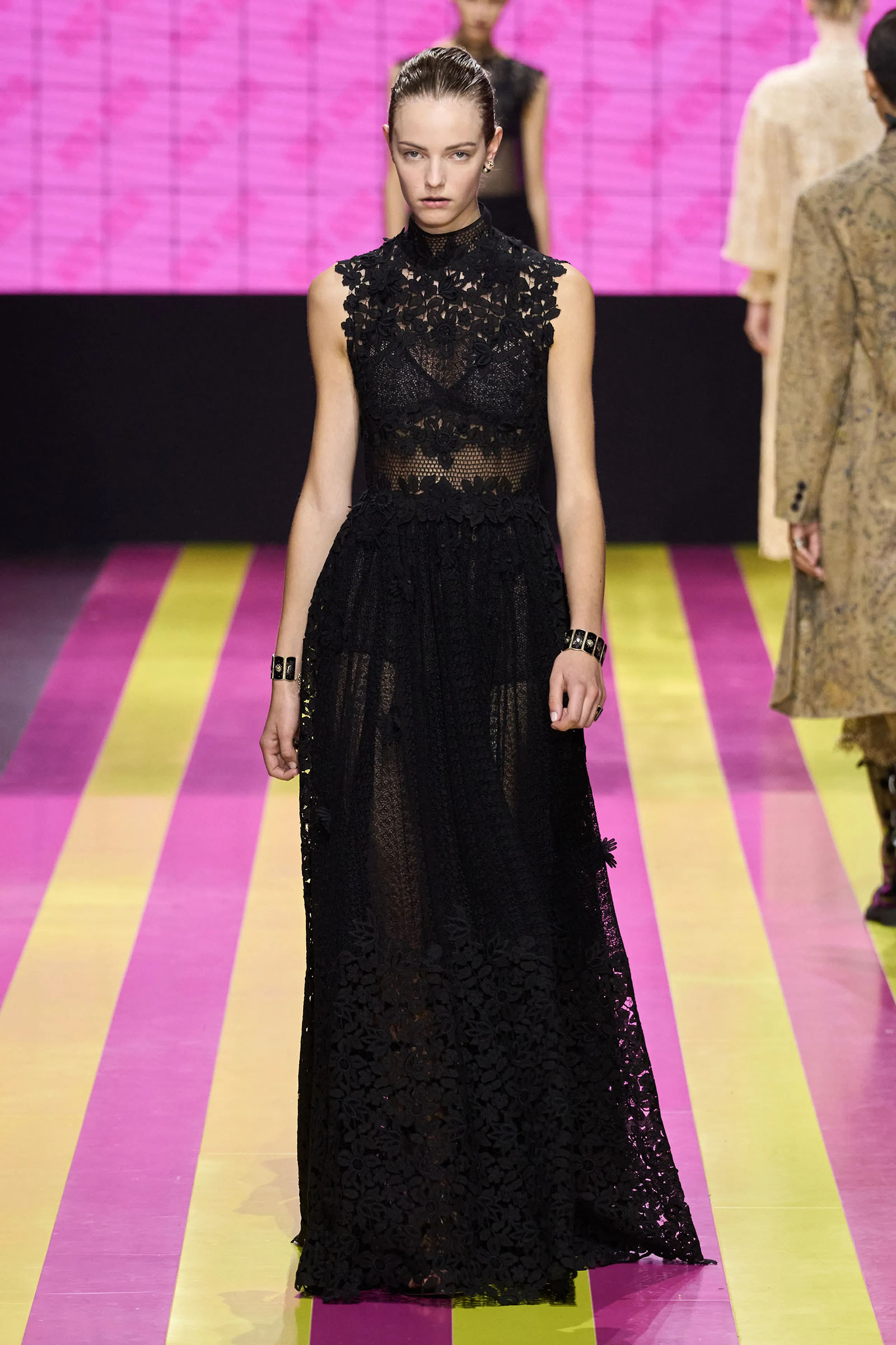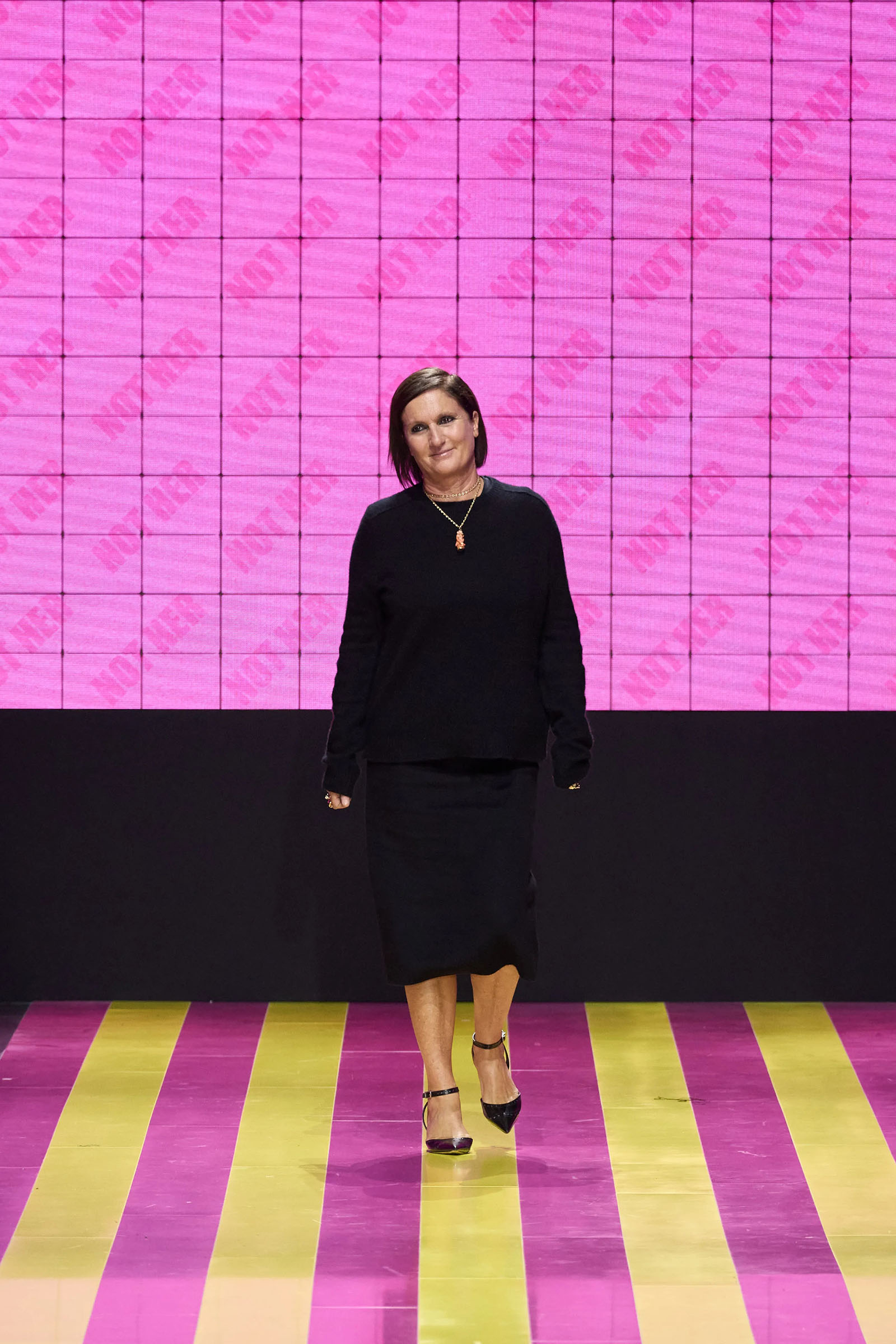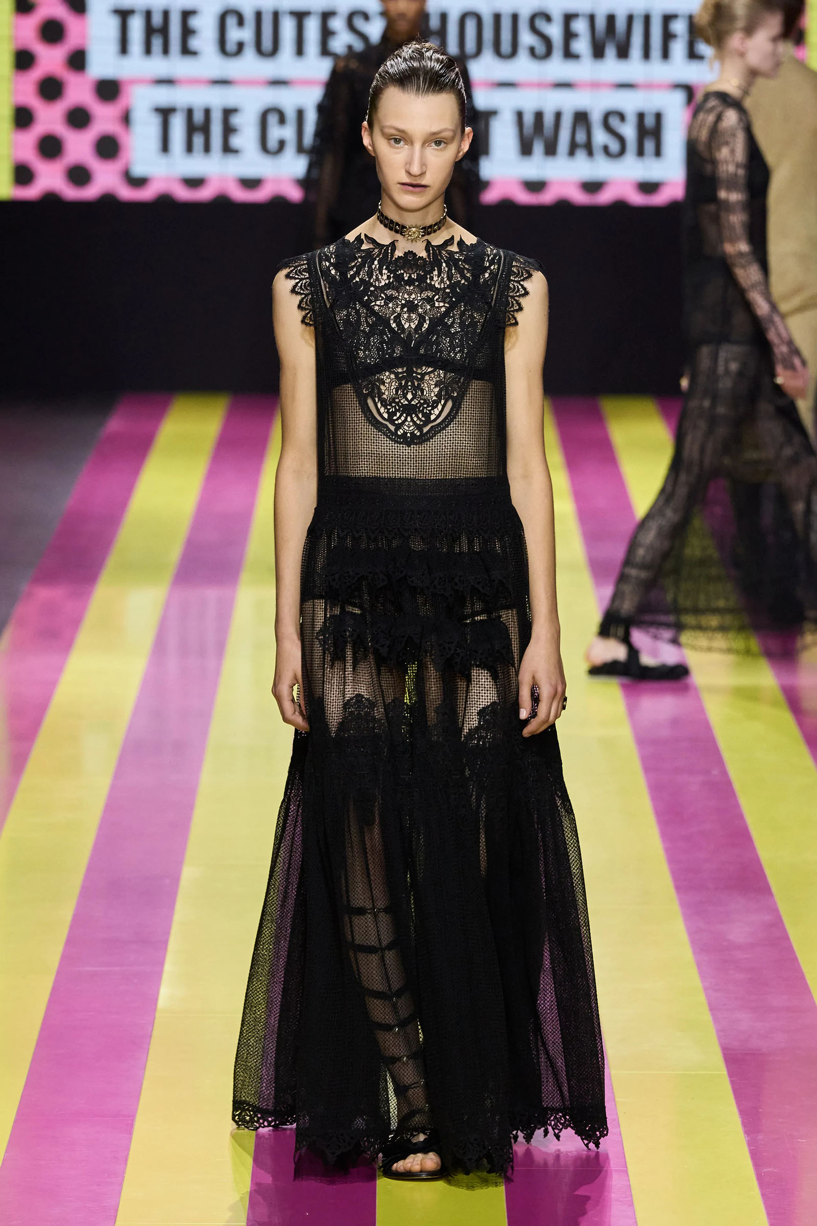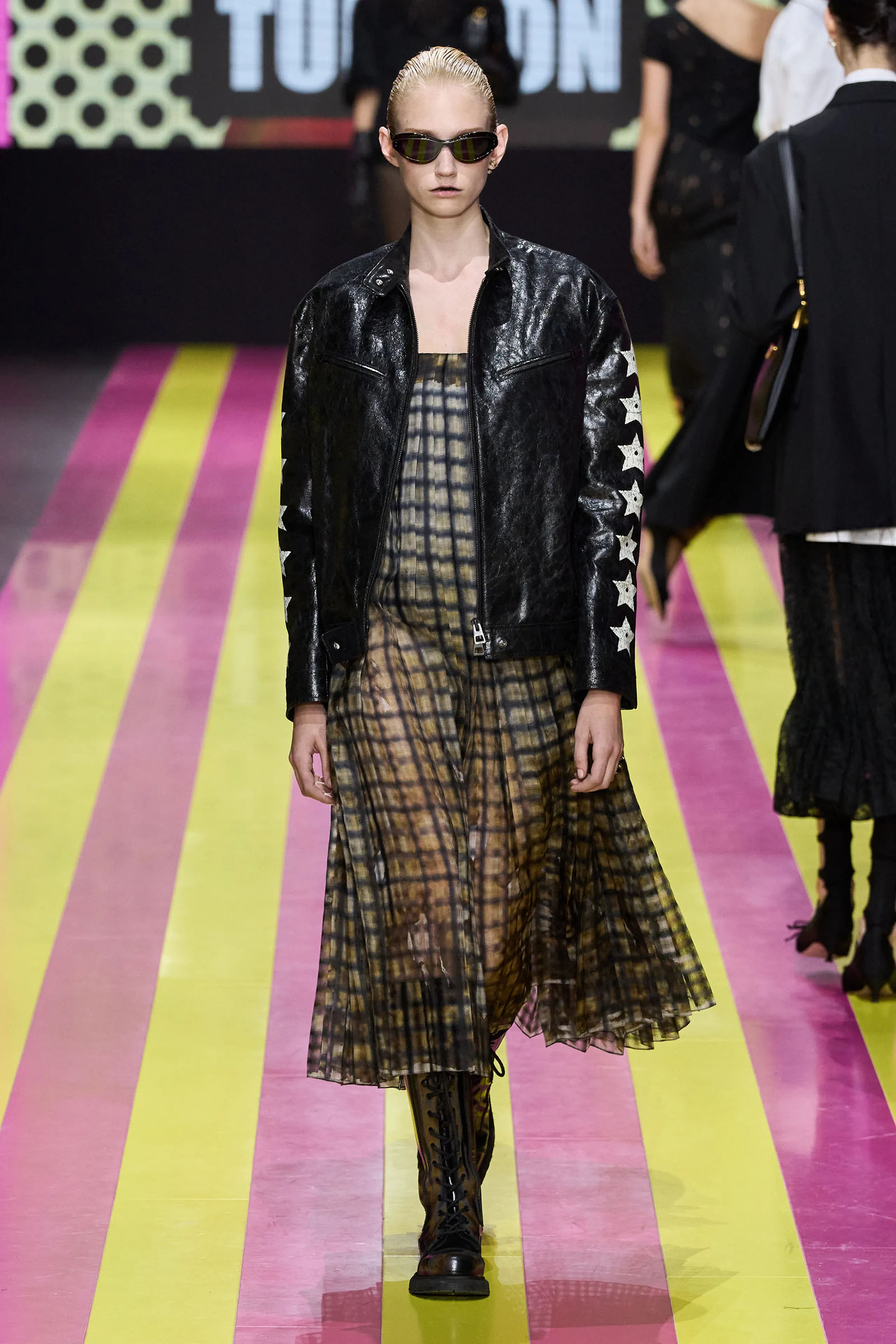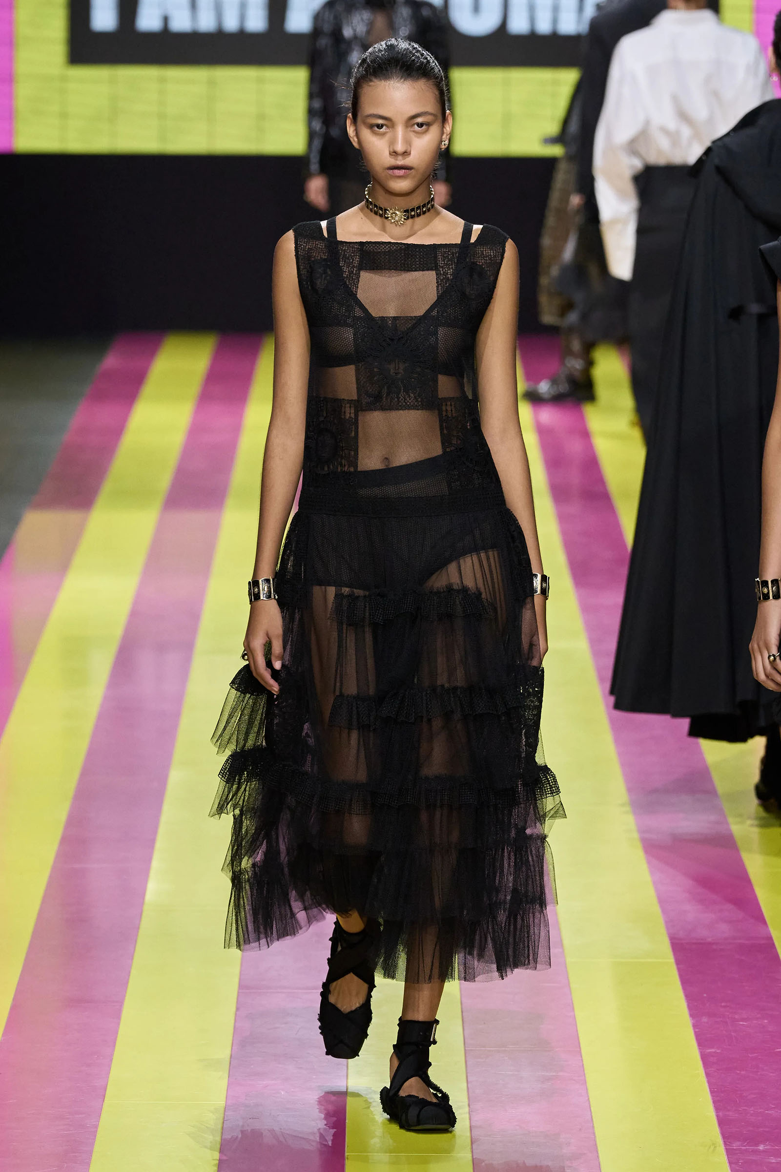 She’s persisted in pursuing that anti-stereotyping principle even more strongly. In this collection there were multiple threads and subtexts both woven together and physically unraveling in the clothes, and a blindingly obvious feminist art statement on the walls. In a post-Barbie world, the irony of the neon pink and yellow highlighting and rebutting sexist advertising (by the Italian artist Elena Bellantoni) wouldn’t be lost on a young audience. Nor would the contrasting darkness—a bit furious, a chic variety of Parisian neo-grunge, really—that came out on the runway.
