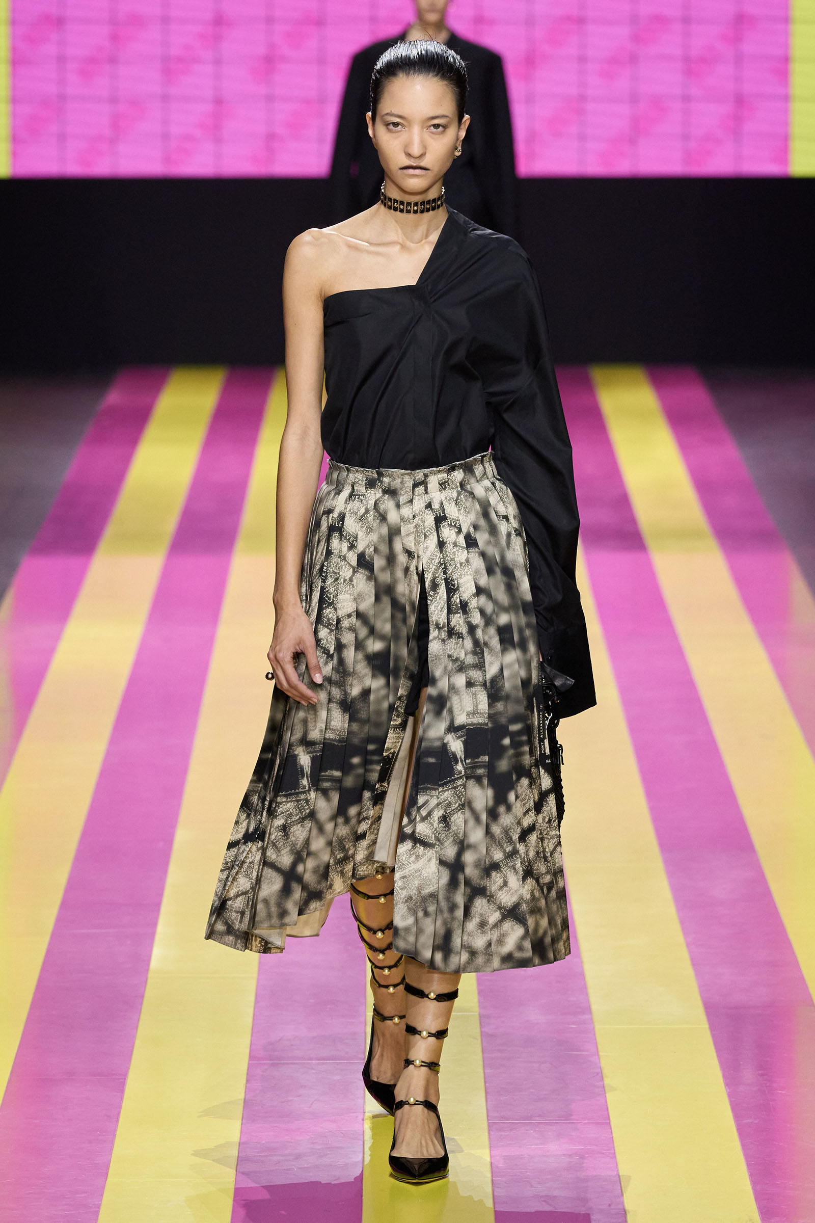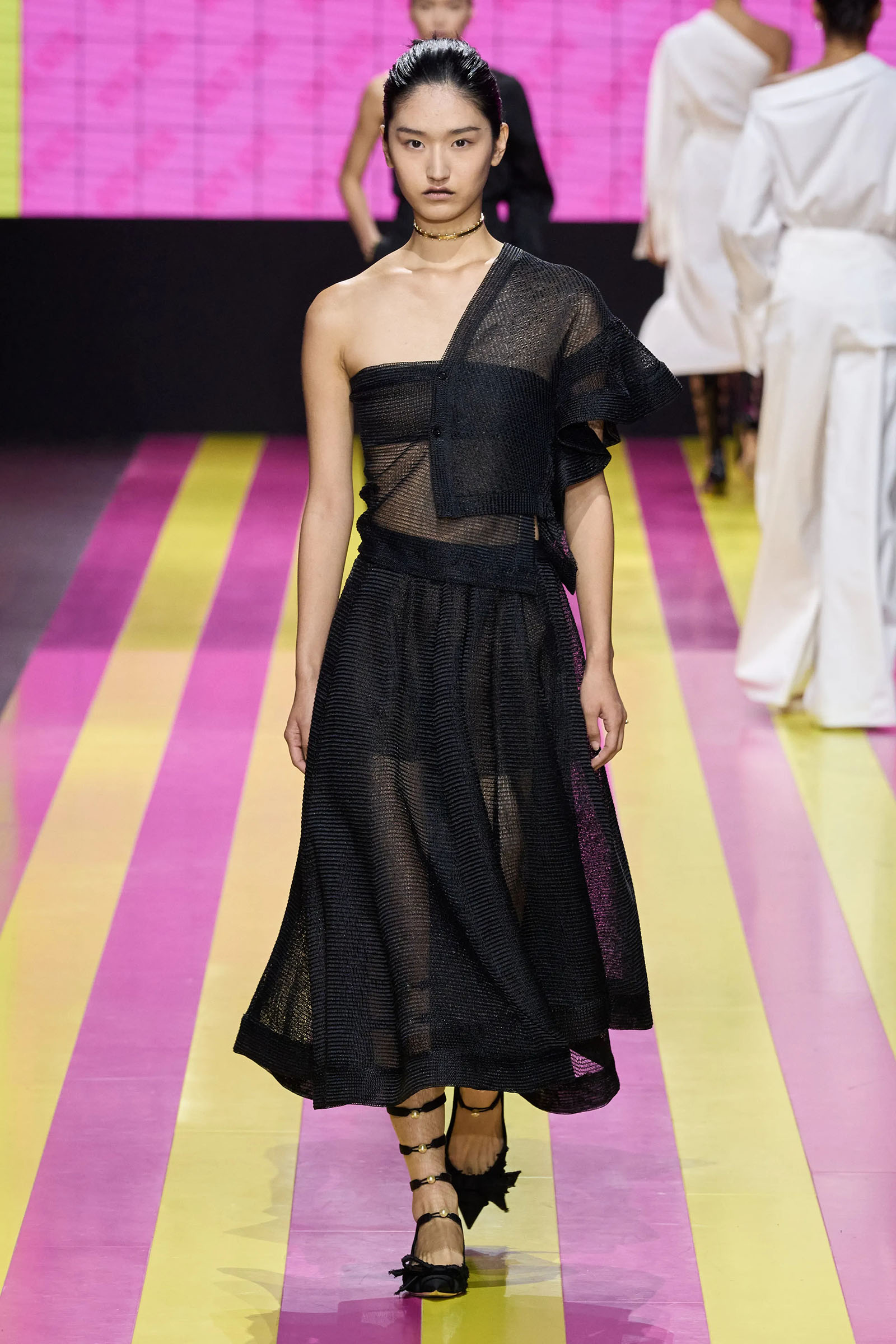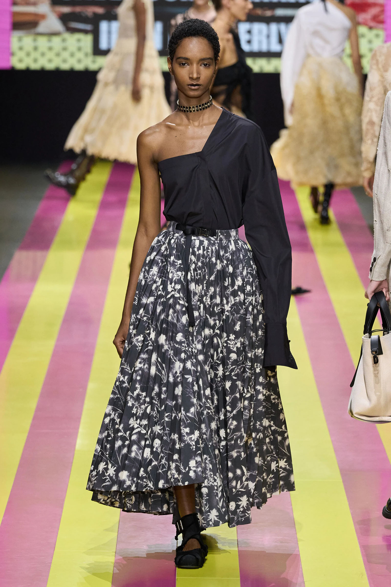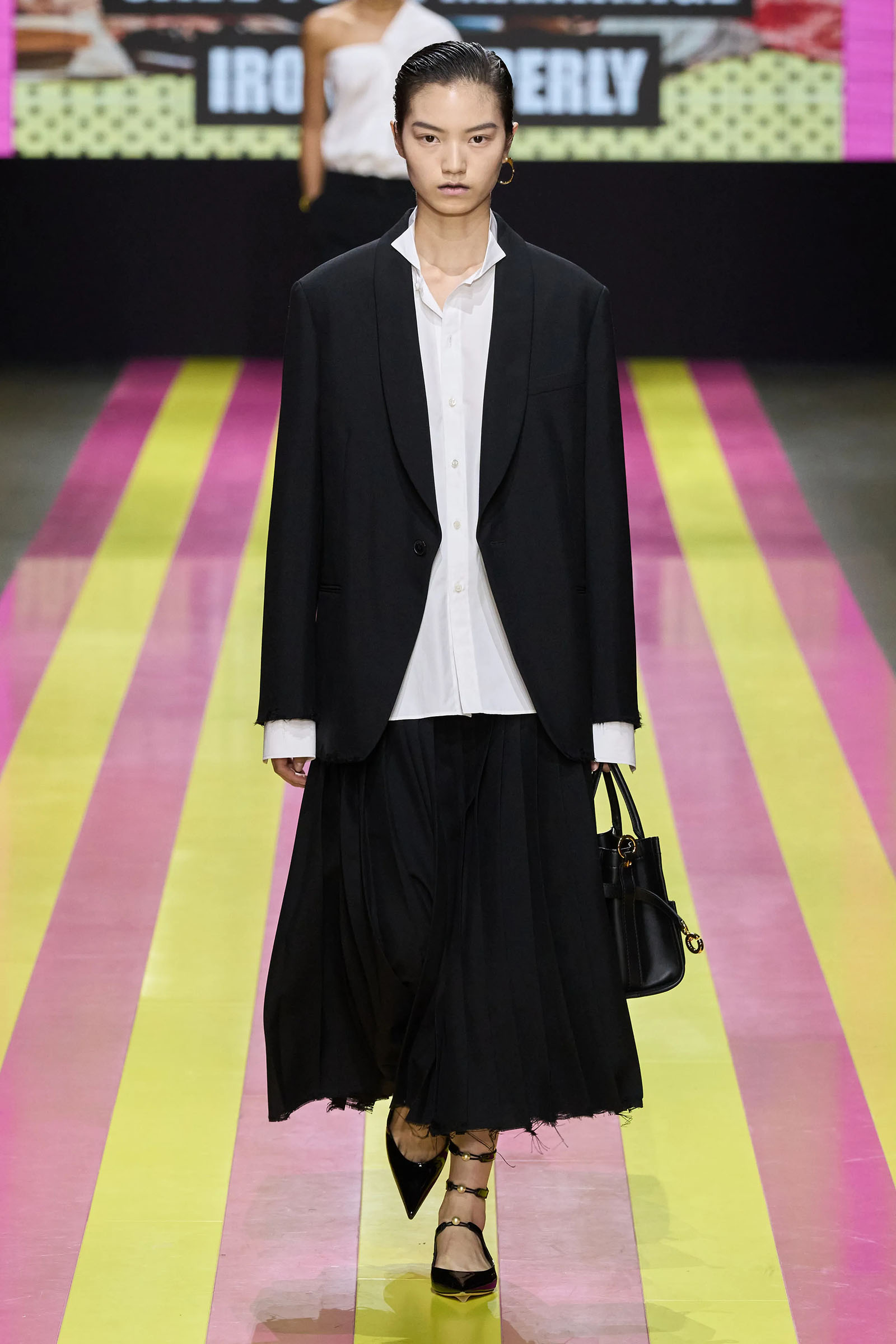The lodestar of the many successors who have worked for Dior—and perhaps the bane of their lives—is the Bar jacket, and the corseted constructs of the ’50s haute couture with which Christian Dior changed fashion. But Chiuri has found her peace with it. One thing that started her off this season was the asymmetrical, off-one-shoulder neckline swoop of a black 1948 dress named Abandon. It cued her work on white one-sleeve shirts, shirts styled under pinafore dresses, and suchlike. Where a Bar jacket appeared this season, it was eased at the waist, and frayed at the hem. The conventionality of the pleated New Look circle skirt was disrupted with leg-flashing slits and blurry black, white, and grayish prints.