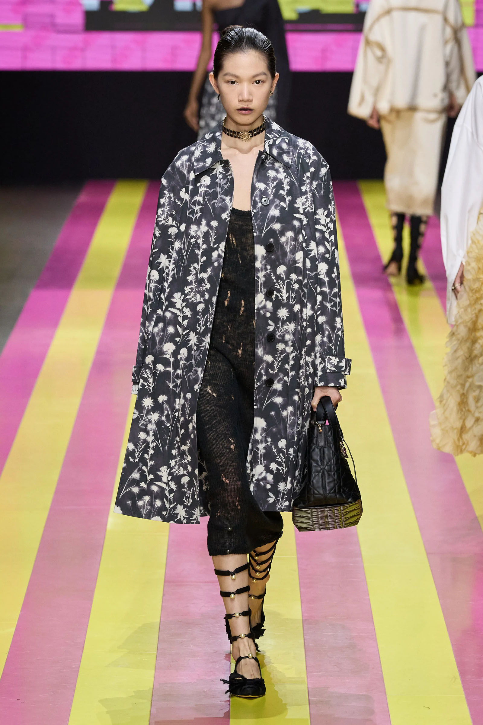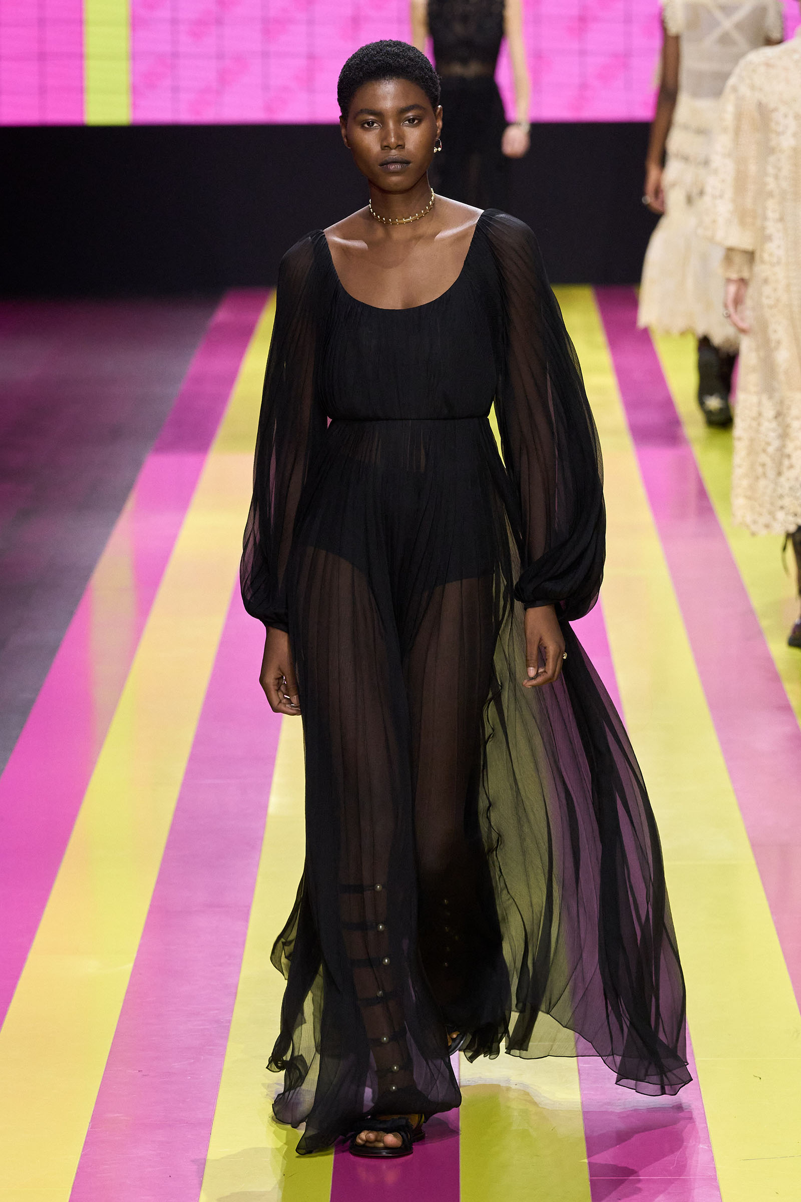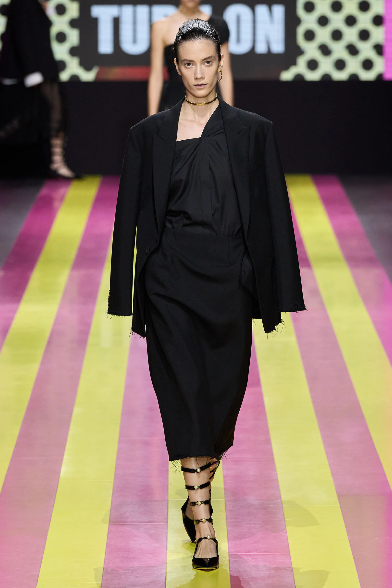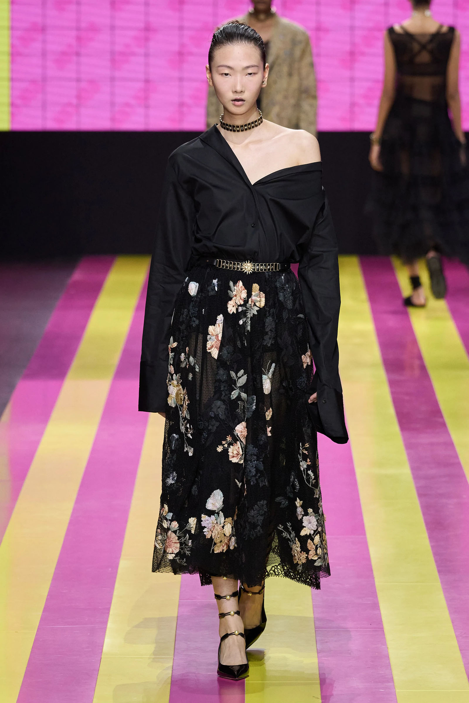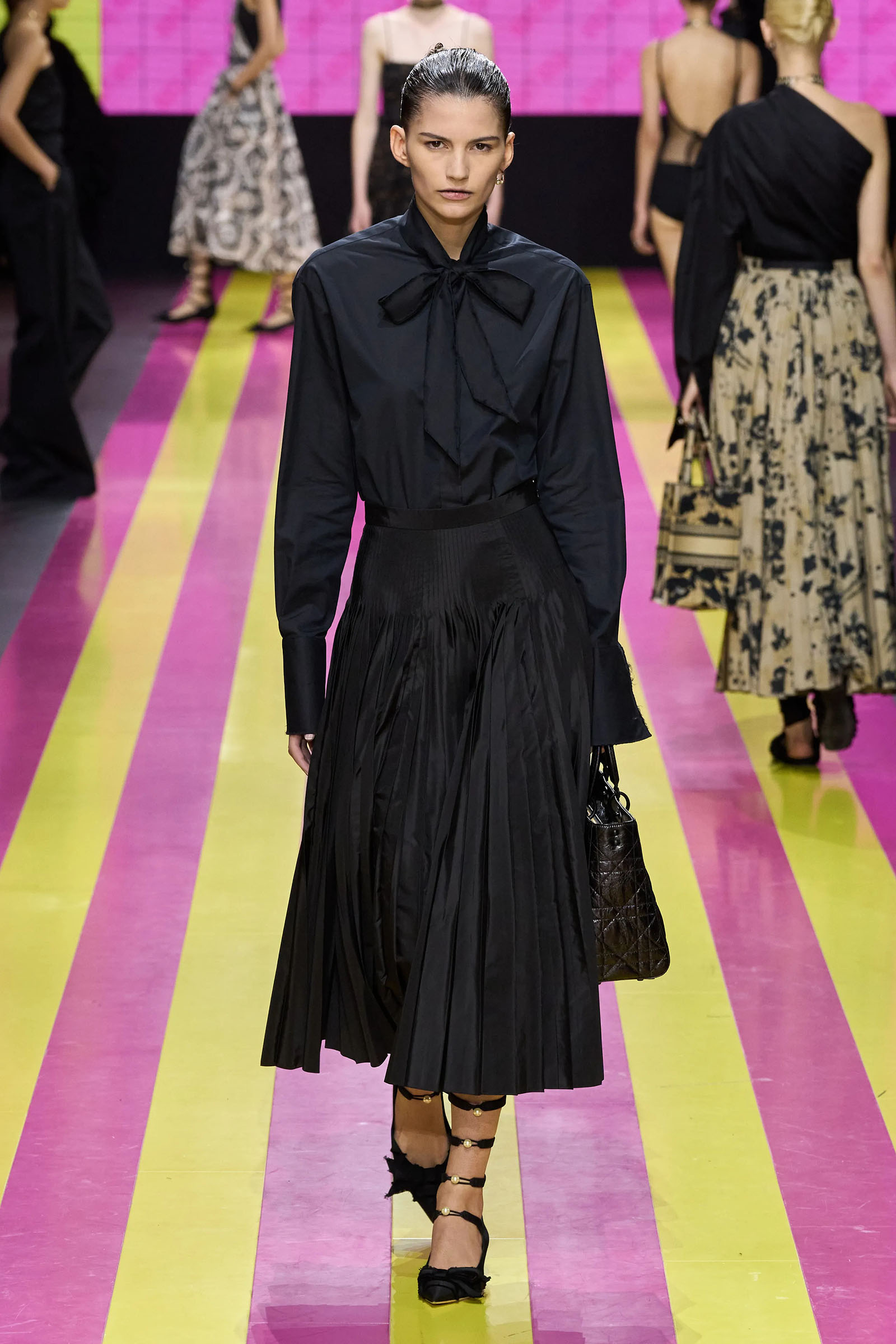 The lodestar of the many successors who have worked for Dior—and perhaps the bane of their lives—is the Bar jacket, and the corseted constructs of the ’50s haute couture with which Christian Dior changed fashion. But Chiuri has found her peace with it. One thing that started her off this season was the asymmetrical, off-one-shoulder neckline swoop of a black 1948 dress named Abandon. It cued her work on white one-sleeve shirts, shirts styled under pinafore dresses, and suchlike. Where a Bar jacket appeared this season, it was eased at the waist, and frayed at the hem. The conventionality of the pleated New Look circle skirt was disrupted with leg-flashing slits and blurry black, white, and grayish prints.