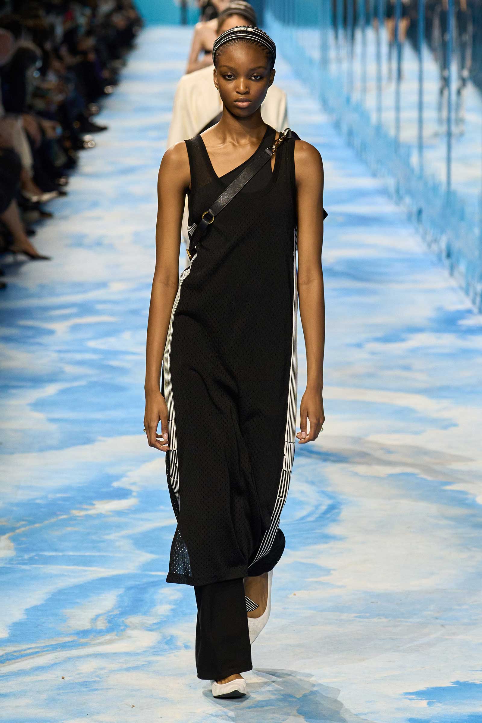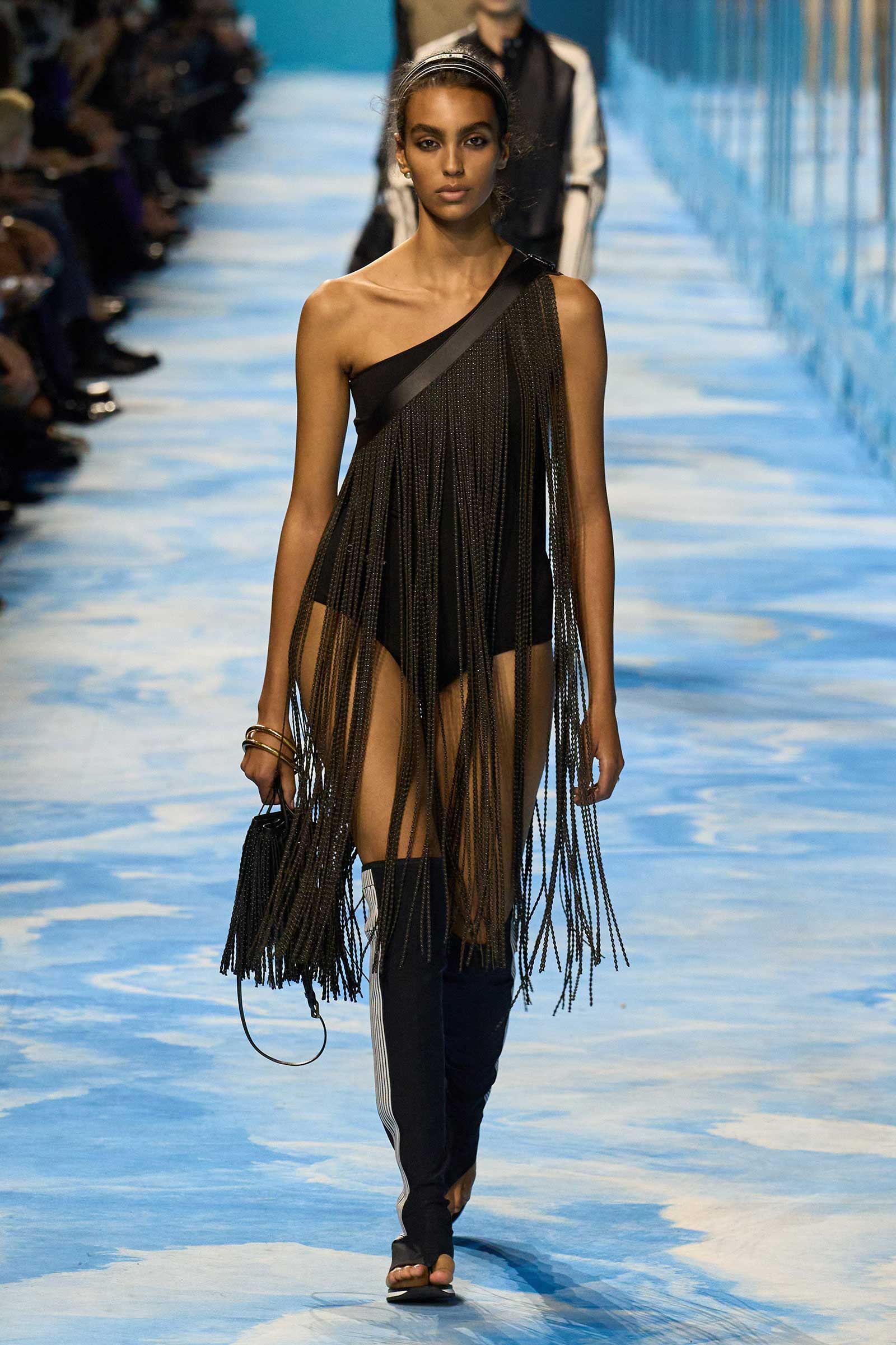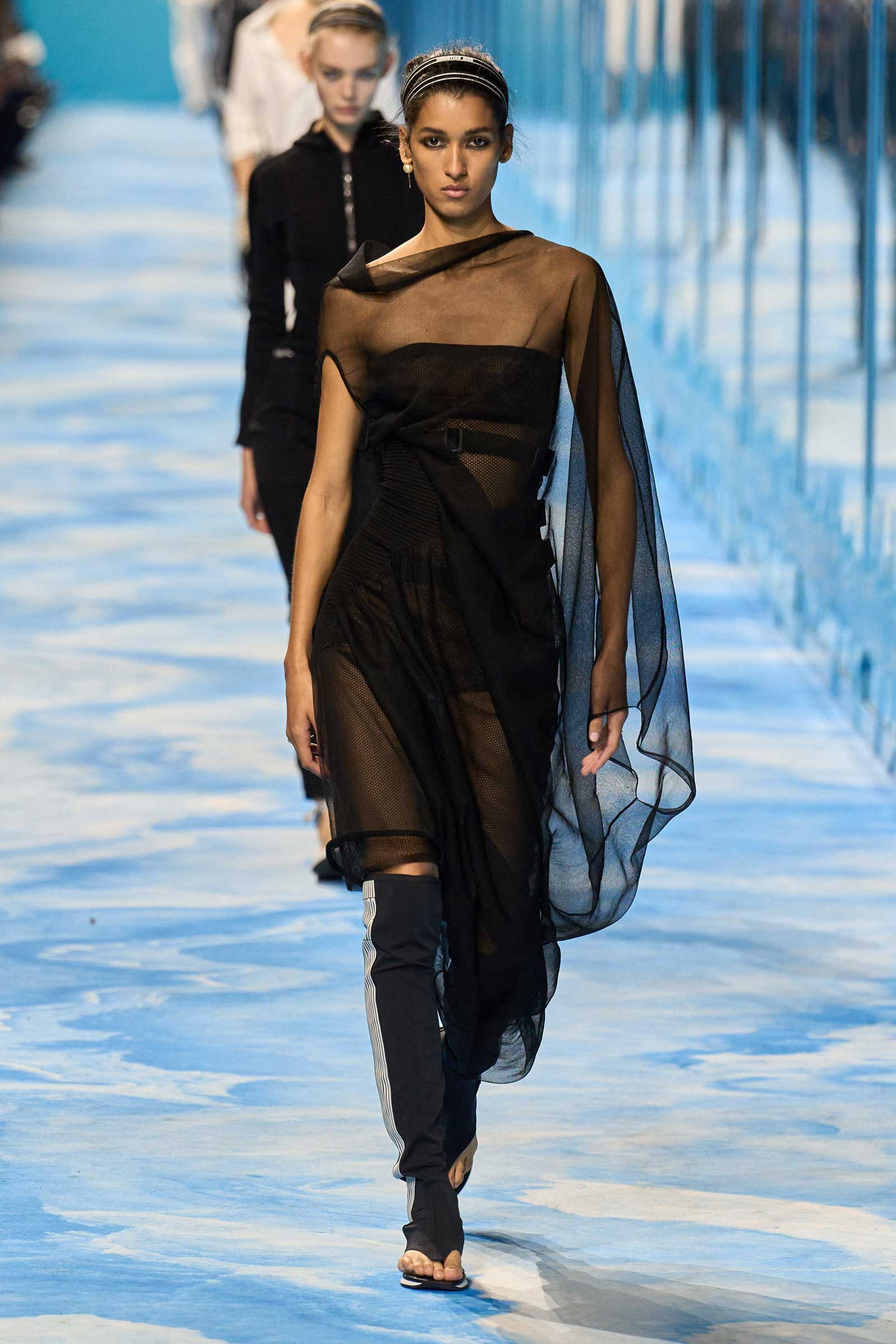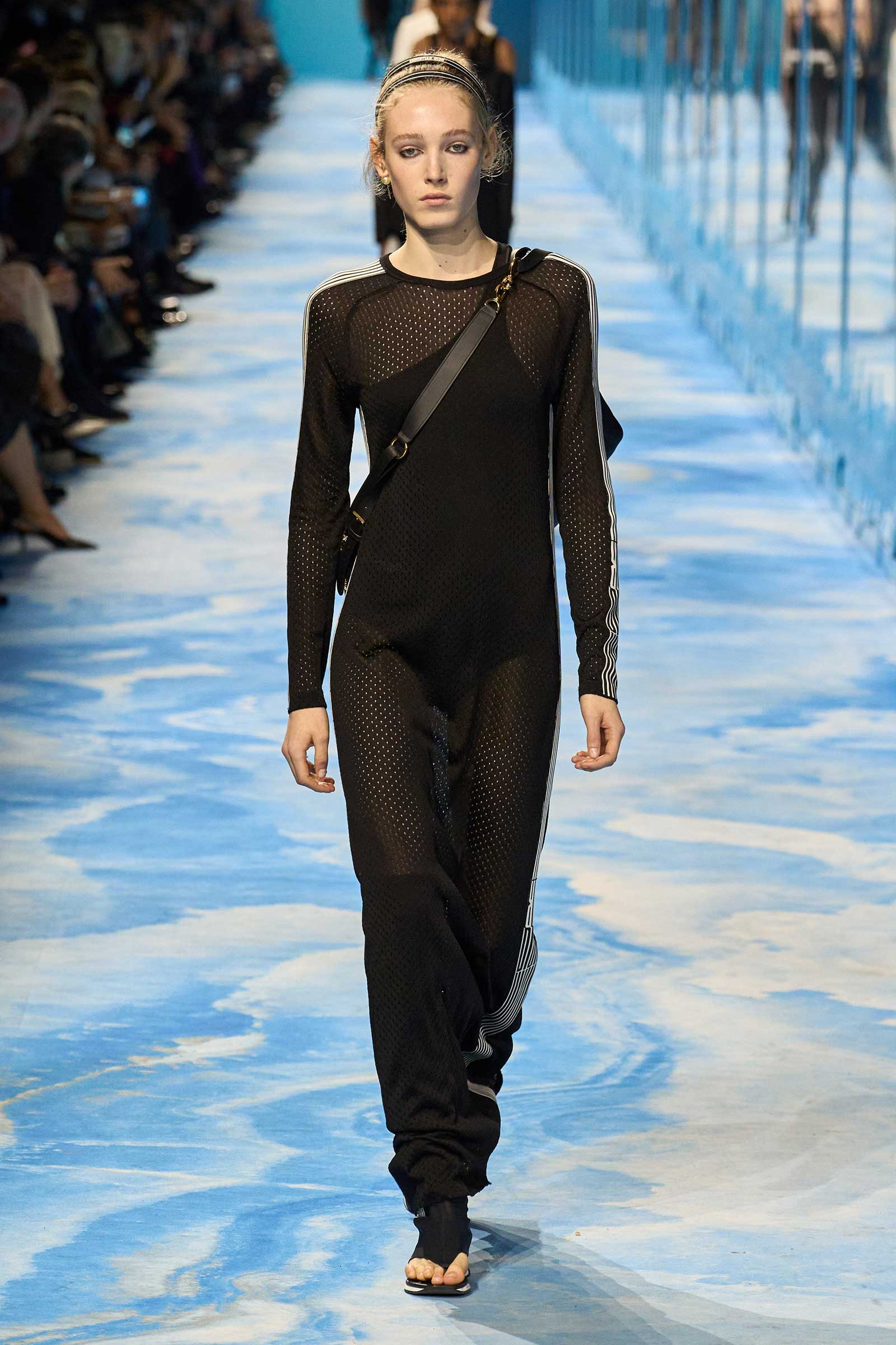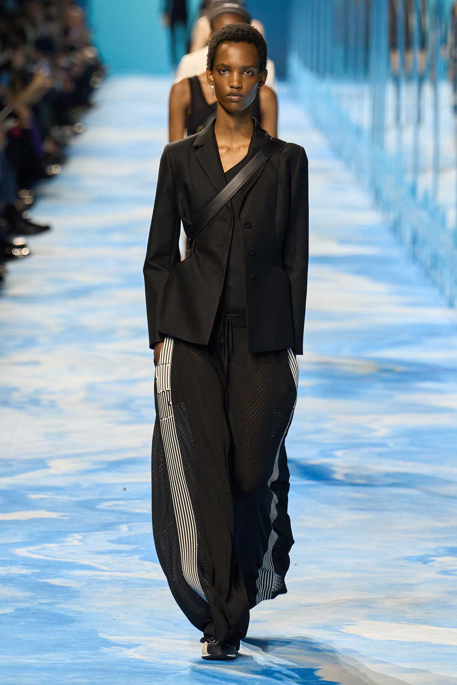 In some ways, this was a return to Chiuri’s debut for spring 2017, which used the language of sport to convey its sense of freedom and set the groundwork for her feminist project. Here, archery replaced fencing, but the athleticism of the clothes seemed mostly influenced by the street and the way modern women wear their exercise gear out of the gym and in the other parts of their lives, in part because nothing else is as comfortable. Here, bodysuits were styled under semi-transparent dresses, blazers were paired with mesh track pants, and jackets were crisscrossed with parachute straps. For shoes, many of the models wore knee-high gladiator boots.