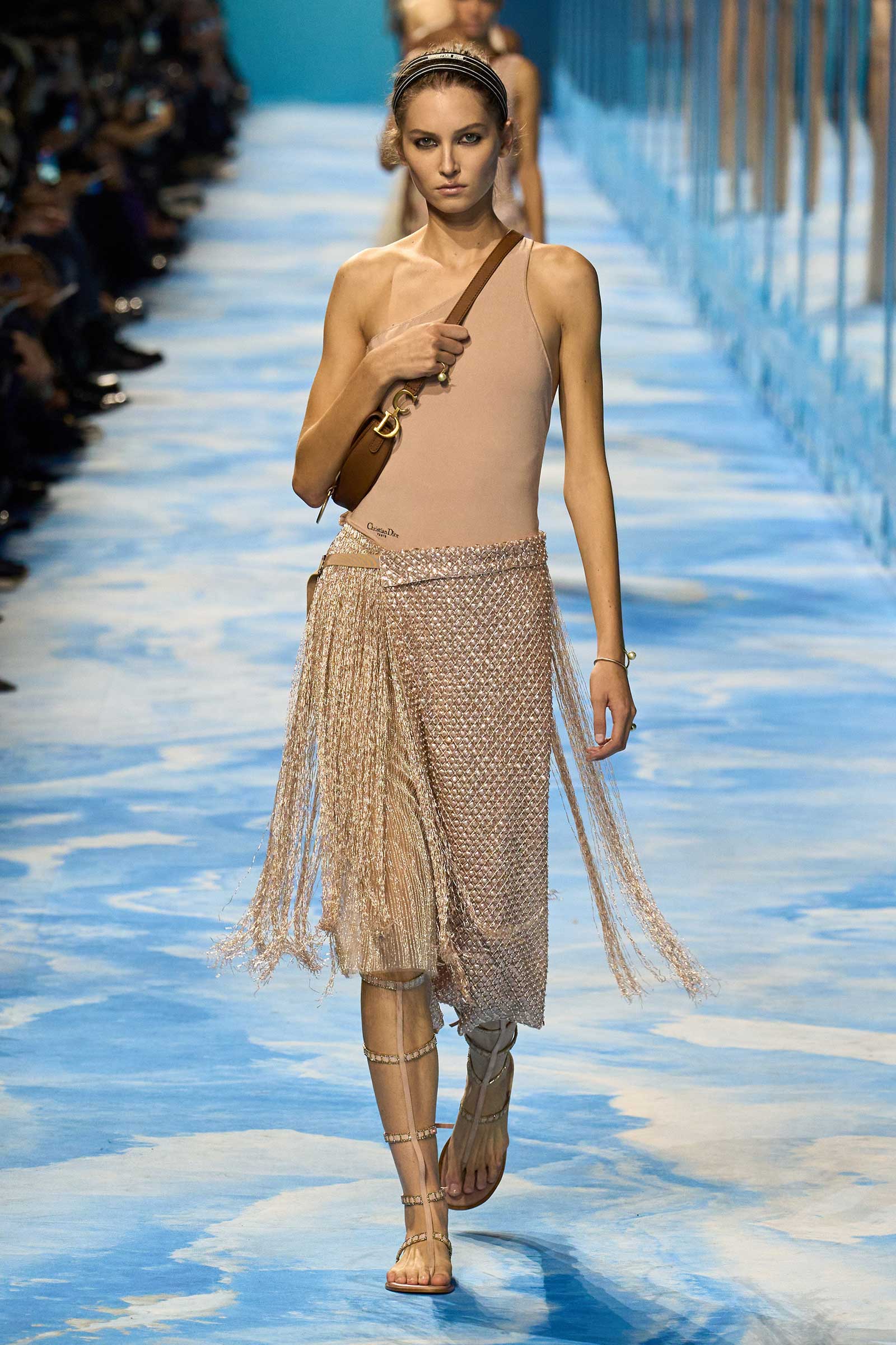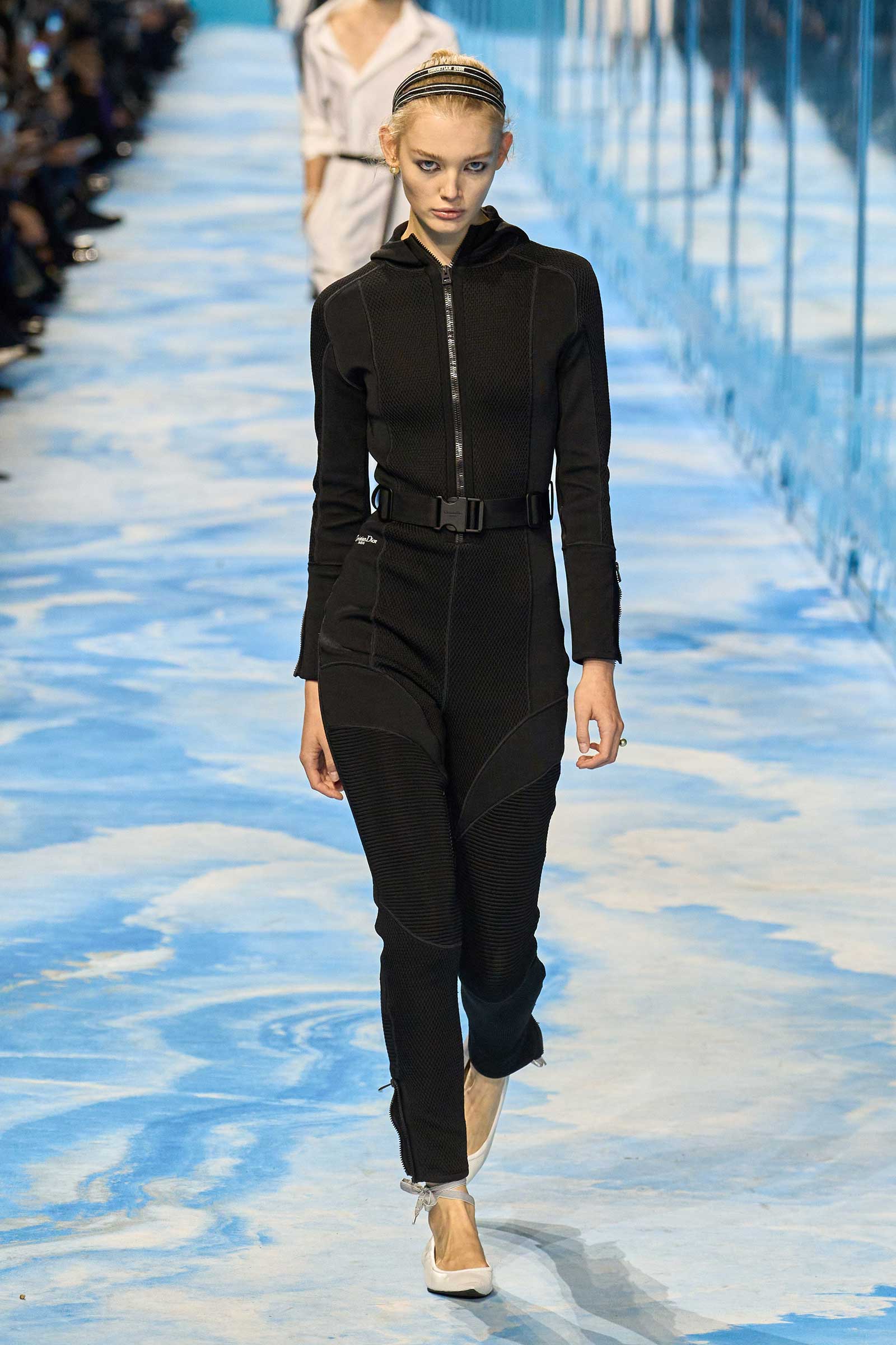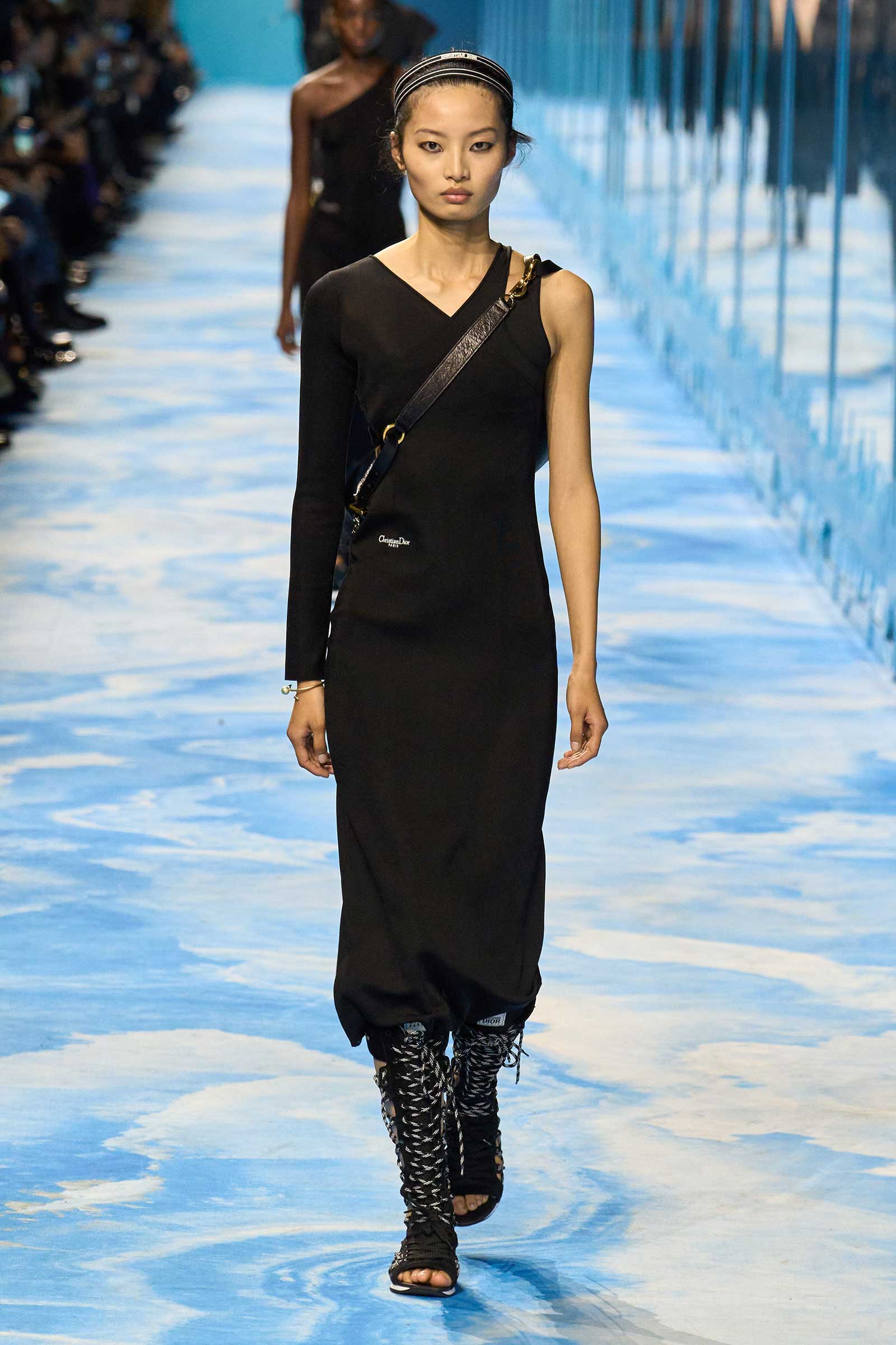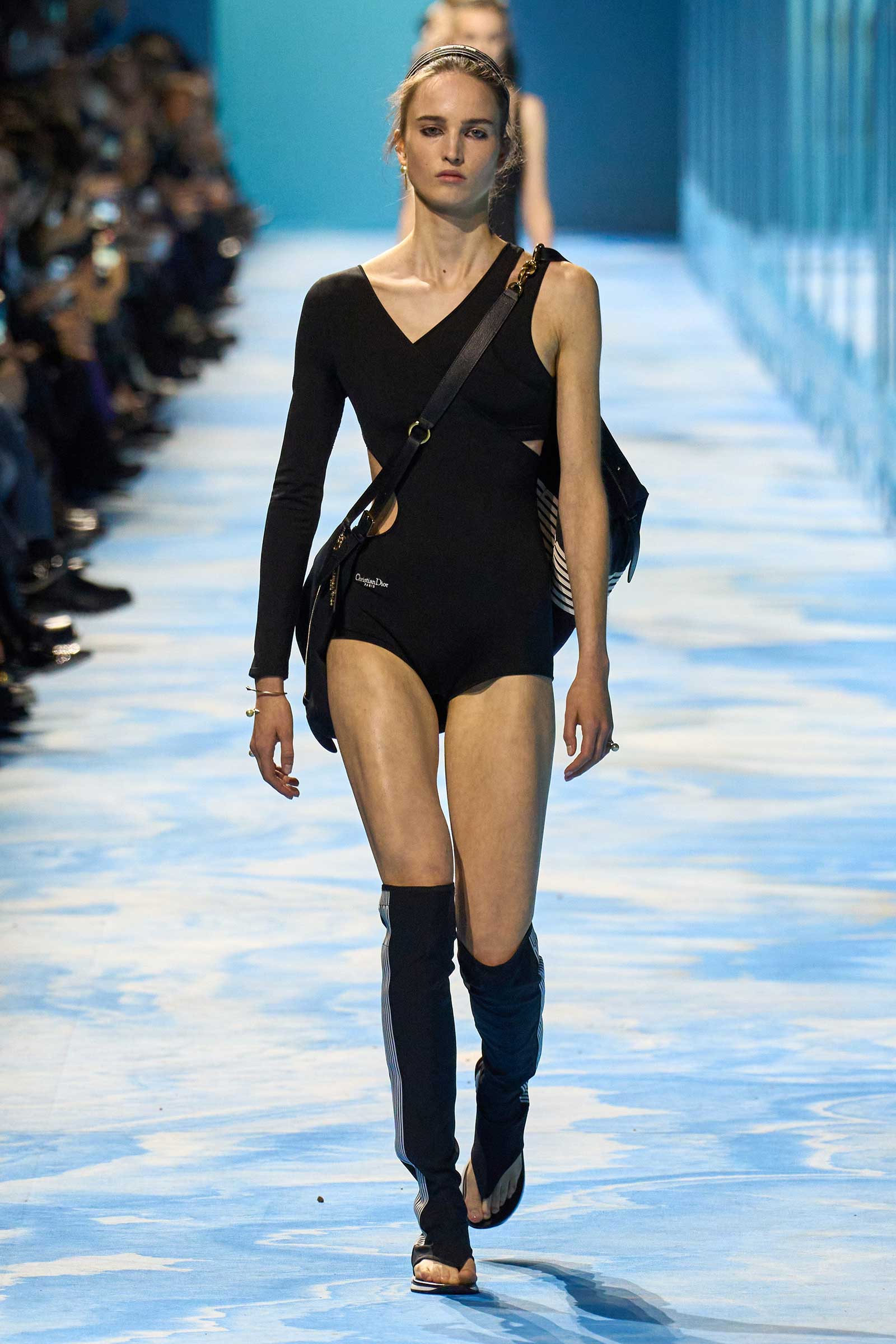 In some ways, this was a return to Chiuri’s debut for spring 2017, which used the language of sport to convey its sense of freedom and set the groundwork for her feminist project. Here, archery replaced fencing, but the athleticism of the clothes seemed mostly influenced by the street and the way modern women wear their exercise gear out of the gym and in the other parts of their lives, in part because nothing else is as comfortable. Here, bodysuits were styled under semi-transparent dresses, blazers were paired with mesh track pants, and jackets were crisscrossed with parachute straps. For shoes, many of the models wore knee-high gladiator boots.