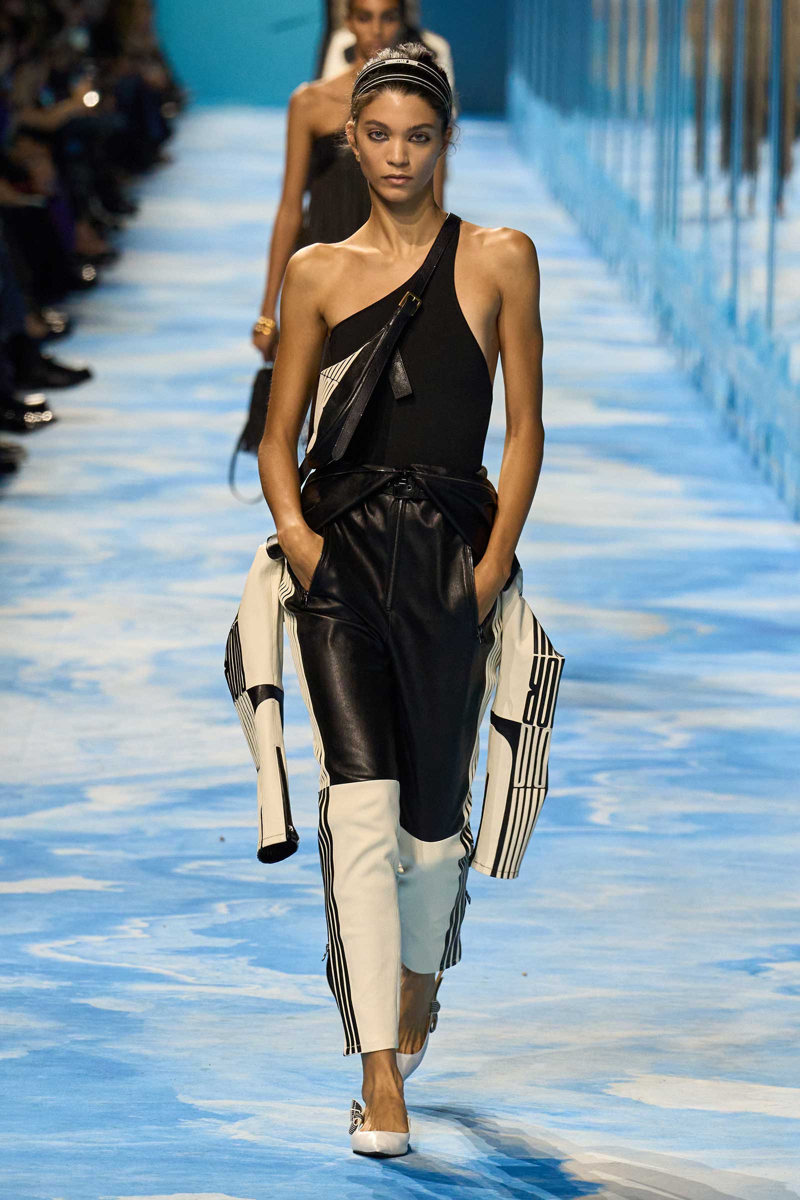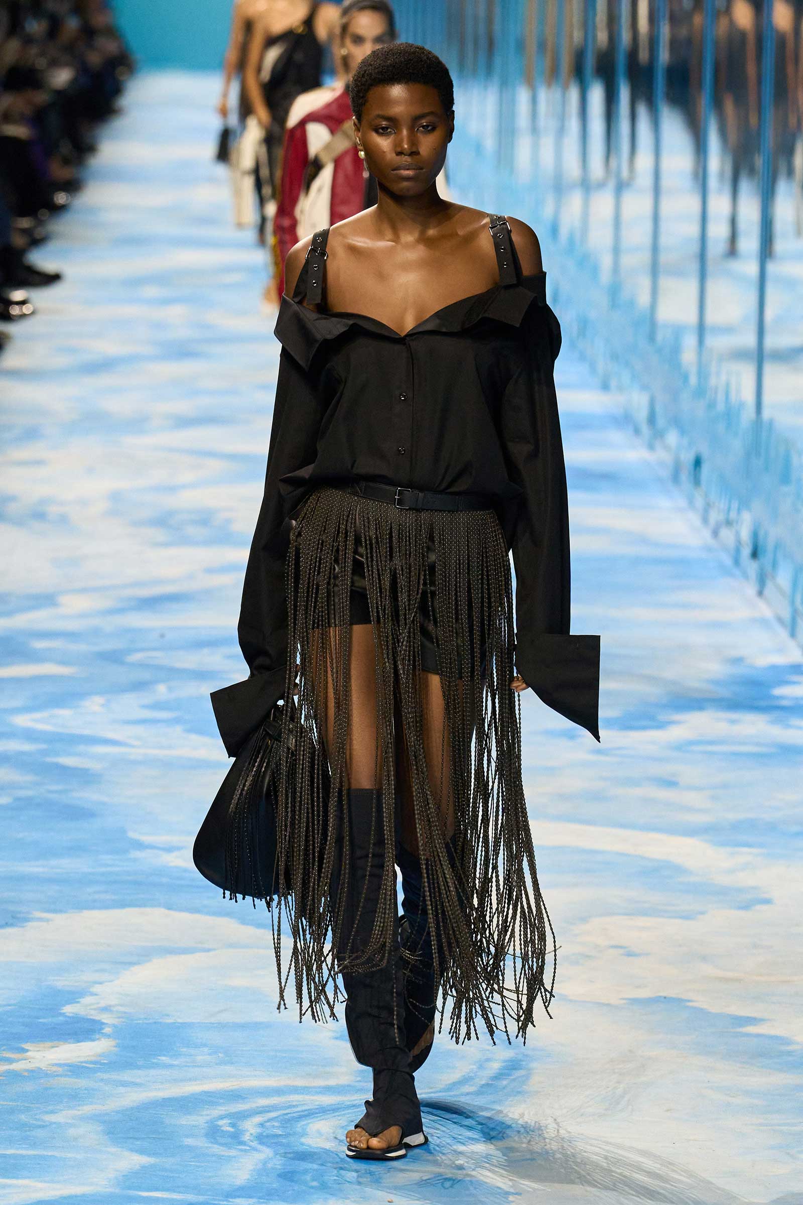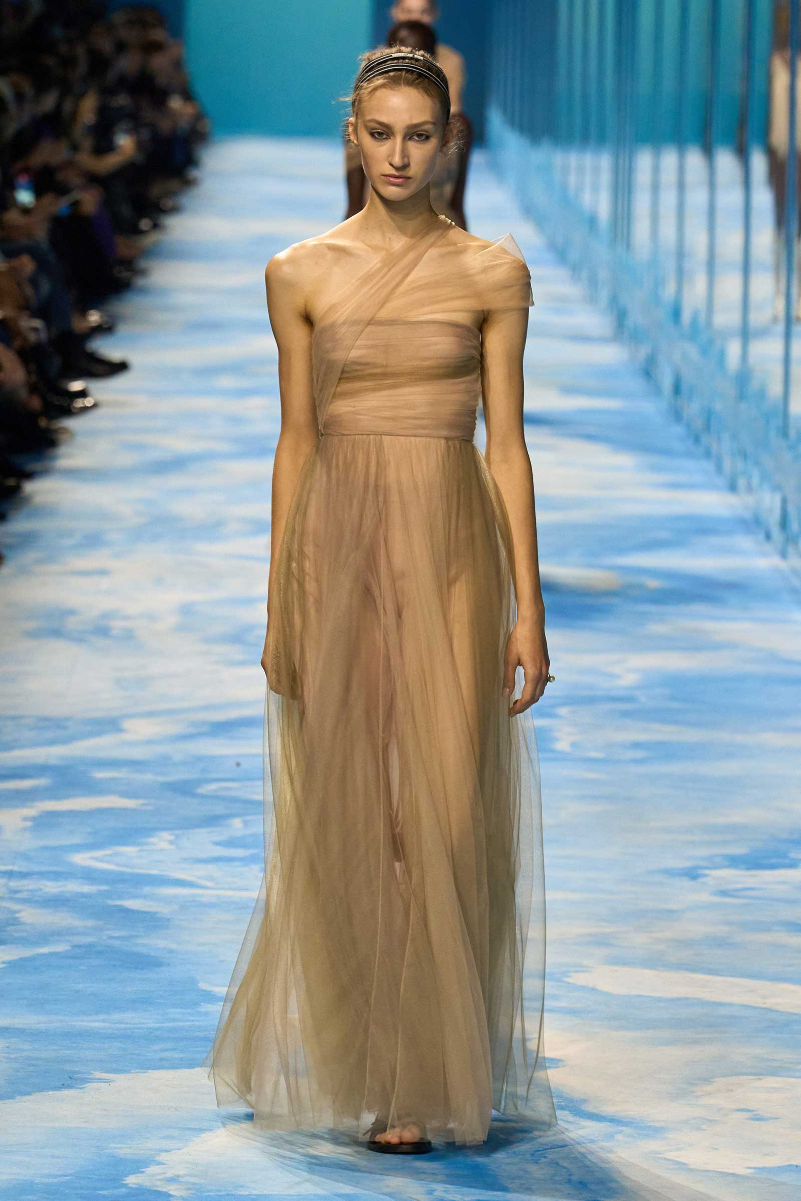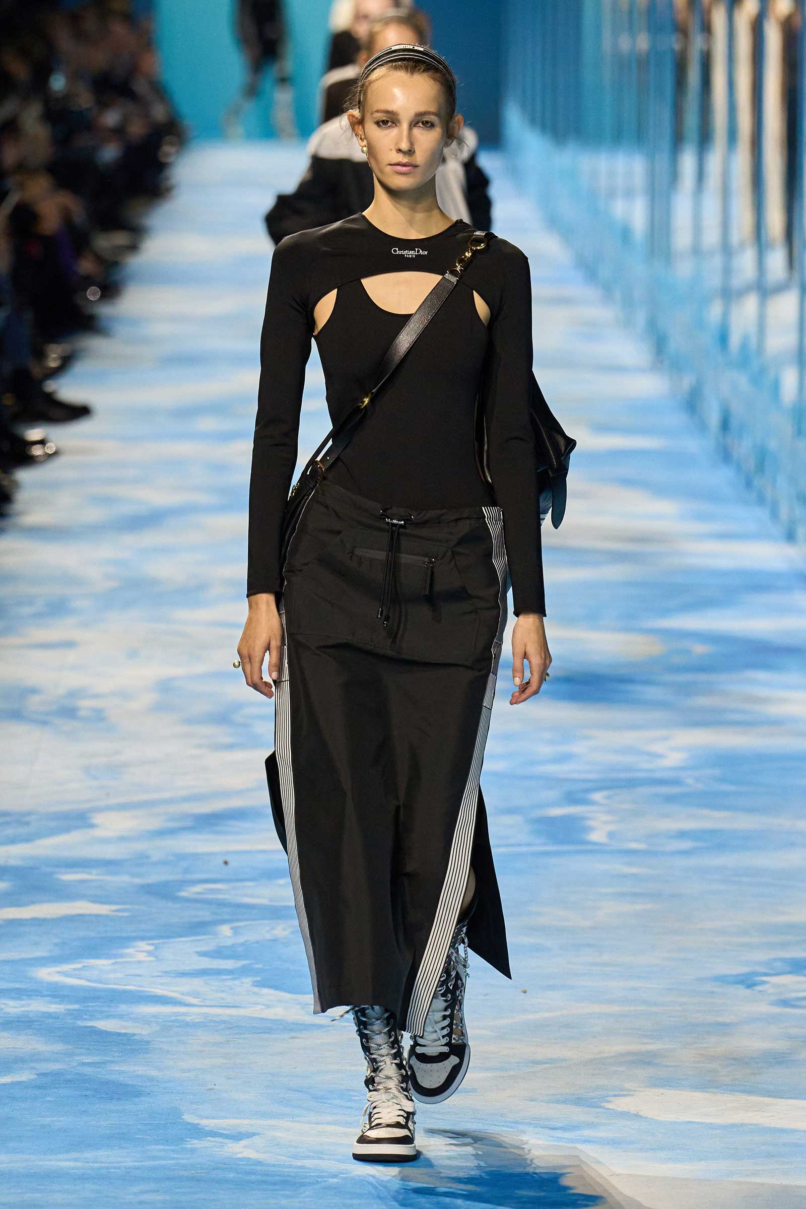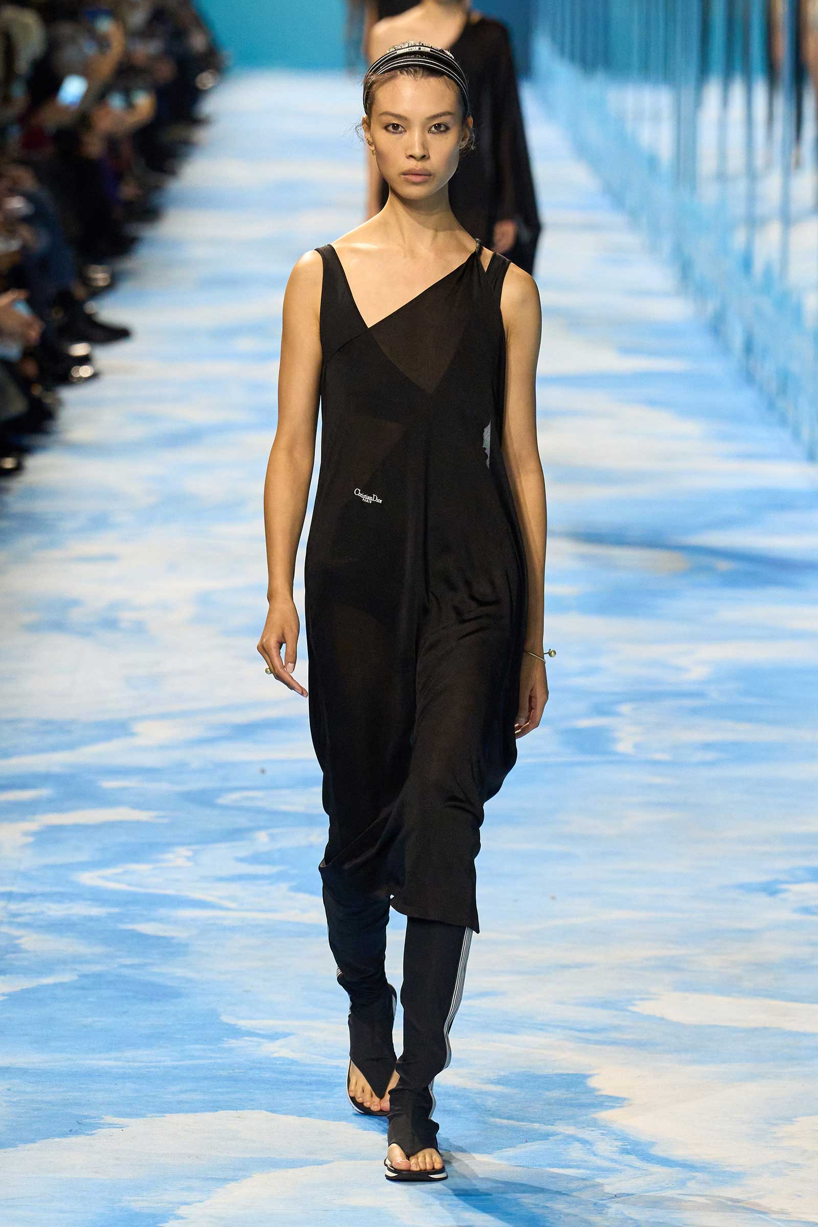 In some ways, this was a return to Chiuri’s debut for spring 2017, which used the language of sport to convey its sense of freedom and set the groundwork for her feminist project. Here, archery replaced fencing, but the athleticism of the clothes seemed mostly influenced by the street and the way modern women wear their exercise gear out of the gym and in the other parts of their lives, in part because nothing else is as comfortable. Here, bodysuits were styled under semi-transparent dresses, blazers were paired with mesh track pants, and jackets were crisscrossed with parachute straps. For shoes, many of the models wore knee-high gladiator boots.