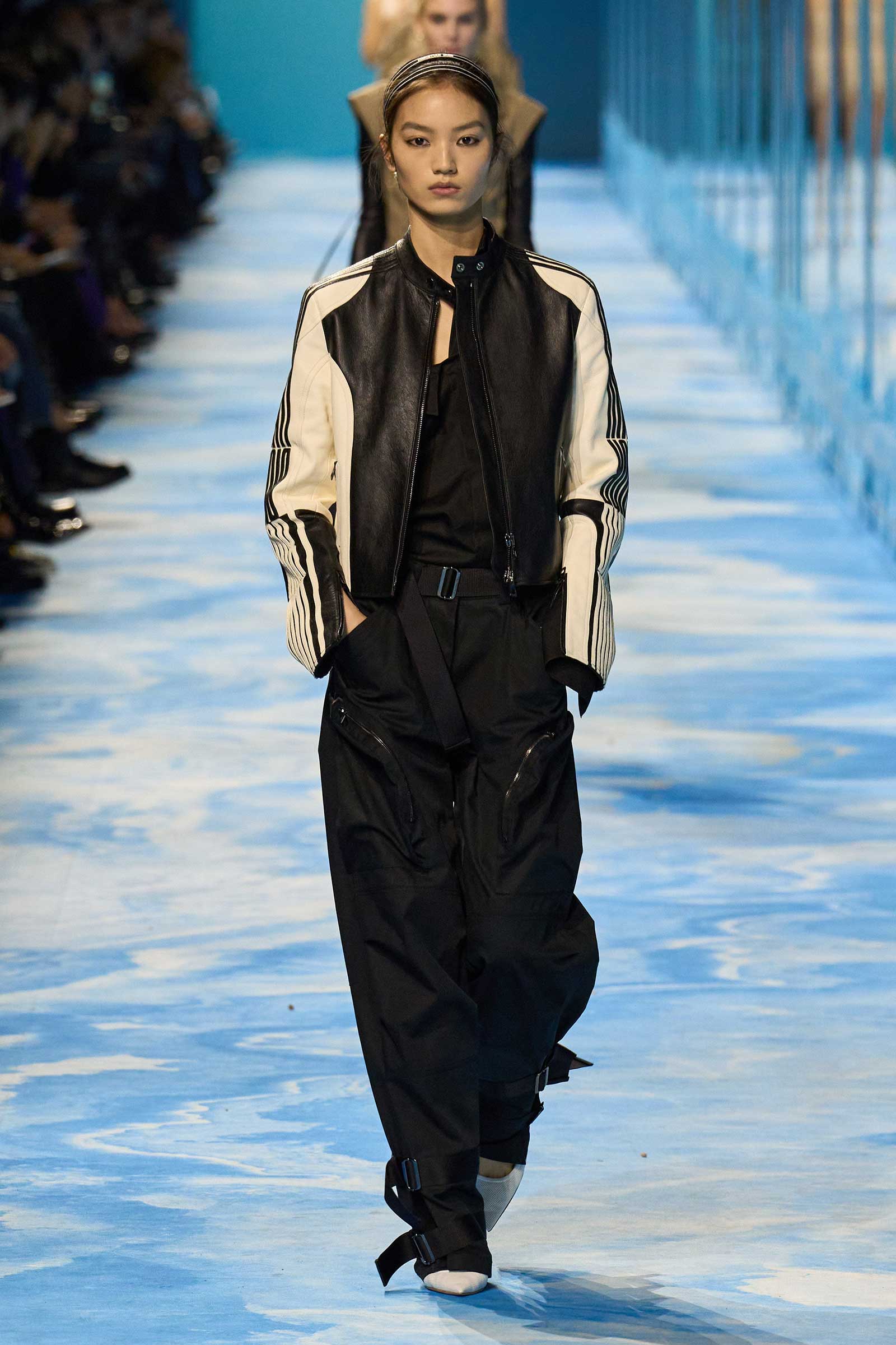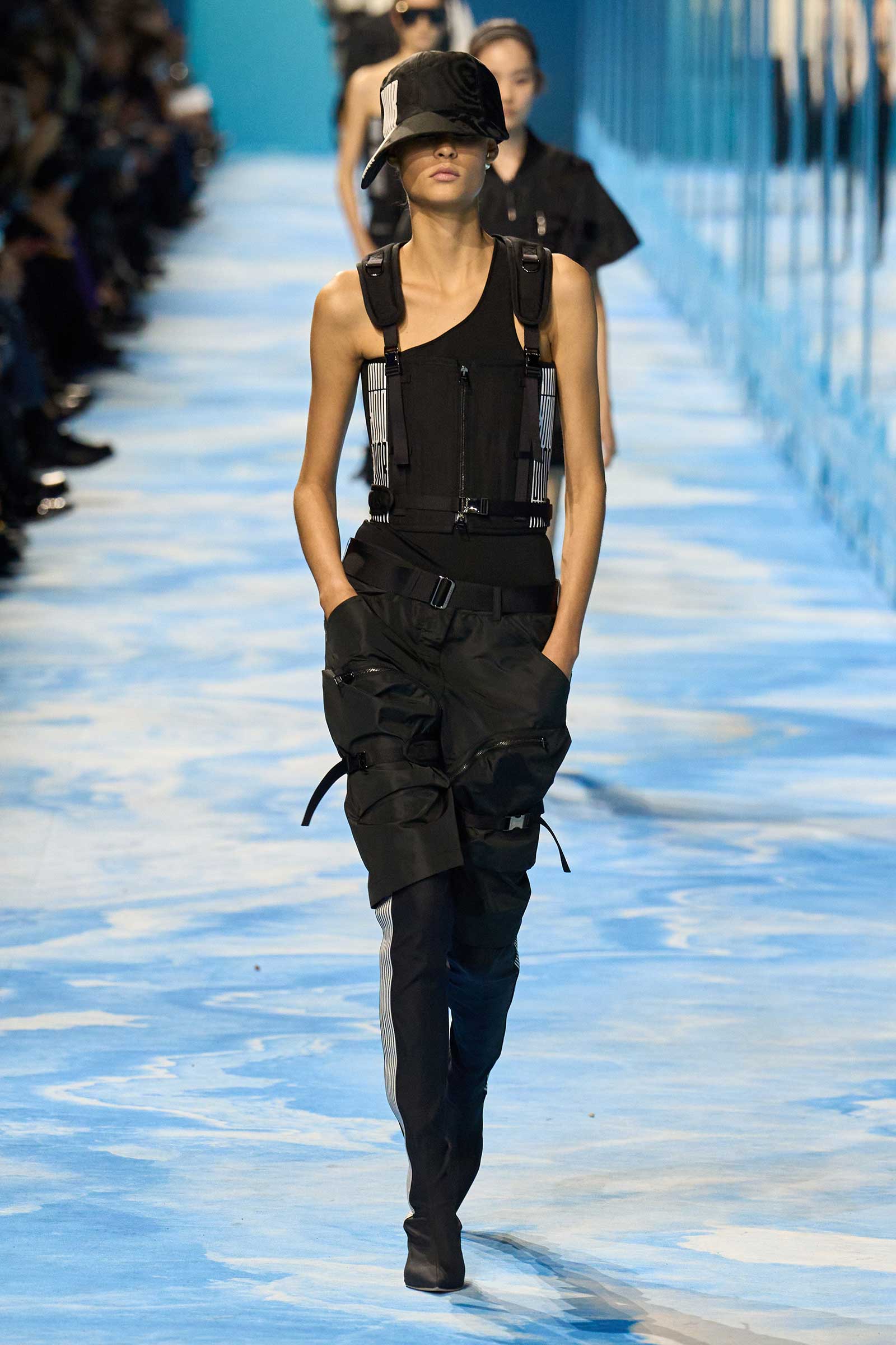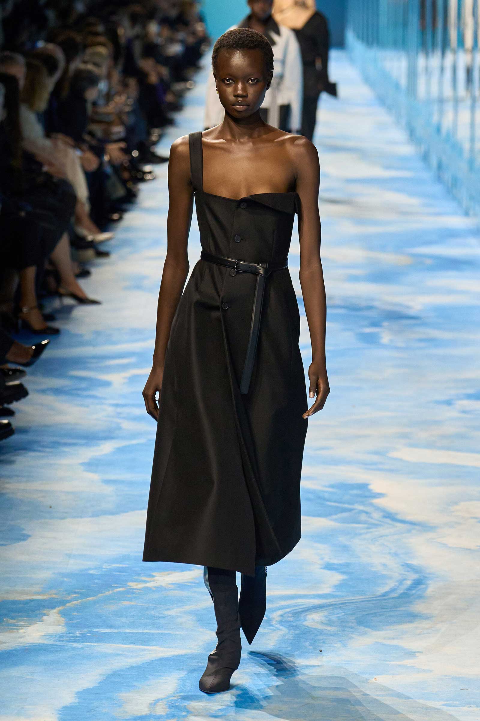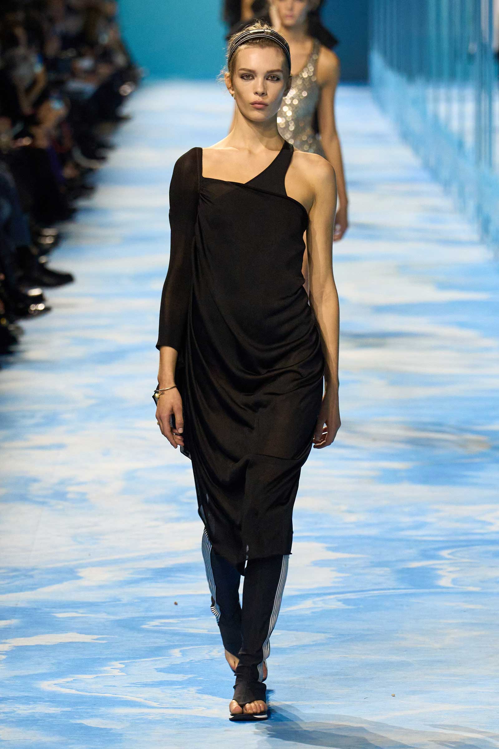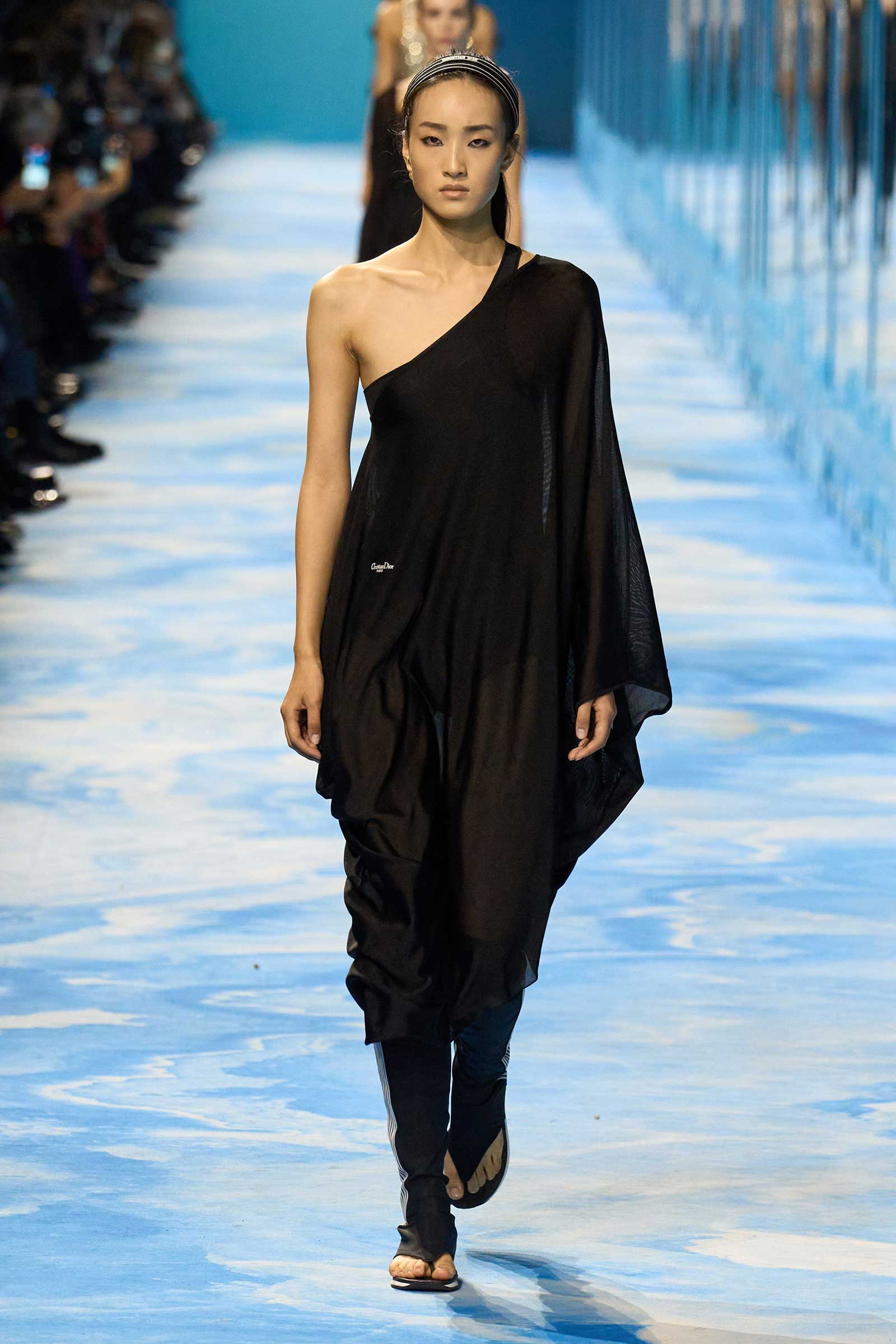 In some ways, this was a return to Chiuri’s debut for spring 2017, which used the language of sport to convey its sense of freedom and set the groundwork for her feminist project. Here, archery replaced fencing, but the athleticism of the clothes seemed mostly influenced by the street and the way modern women wear their exercise gear out of the gym and in the other parts of their lives, in part because nothing else is as comfortable. Here, bodysuits were styled under semi-transparent dresses, blazers were paired with mesh track pants, and jackets were crisscrossed with parachute straps. For shoes, many of the models wore knee-high gladiator boots.