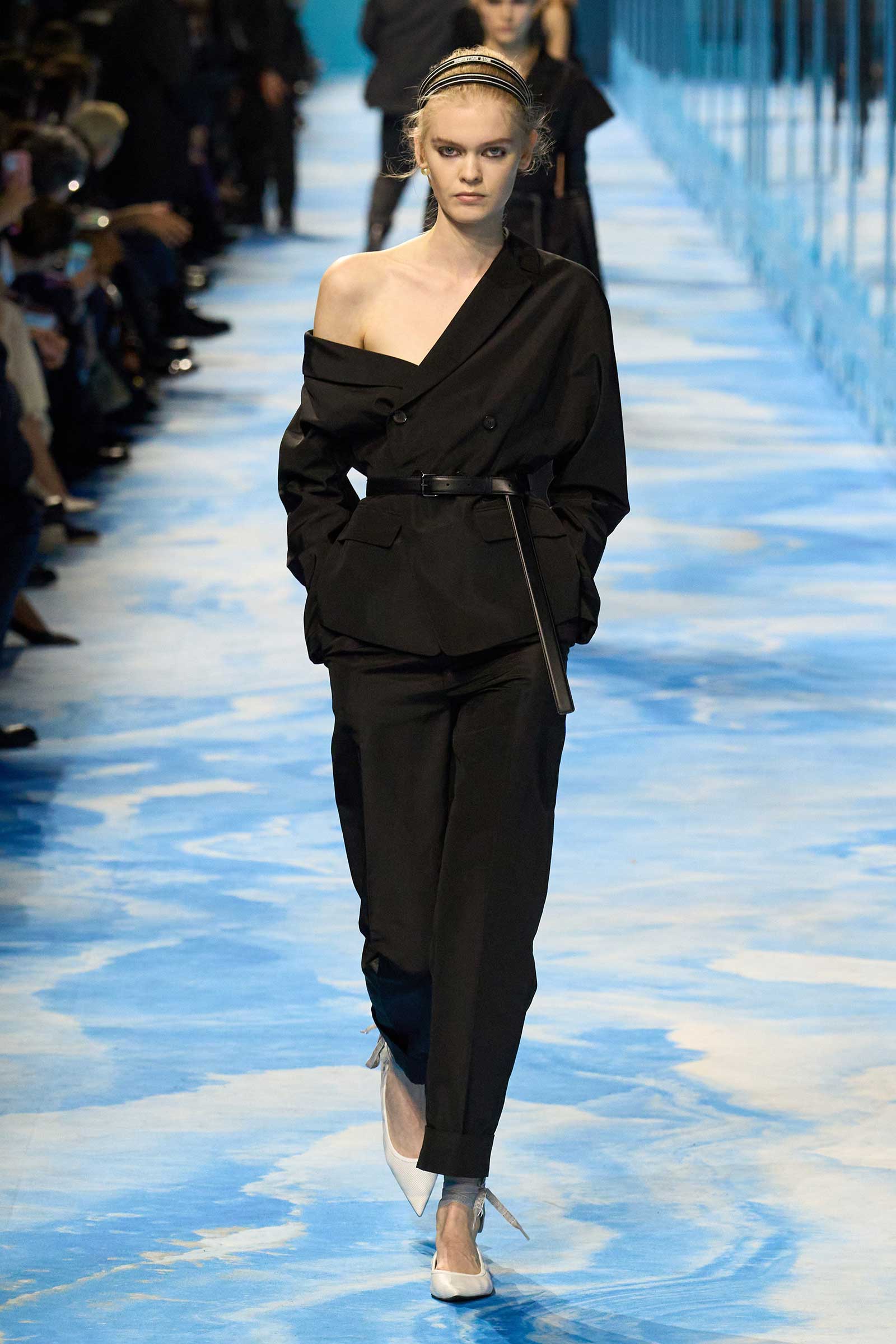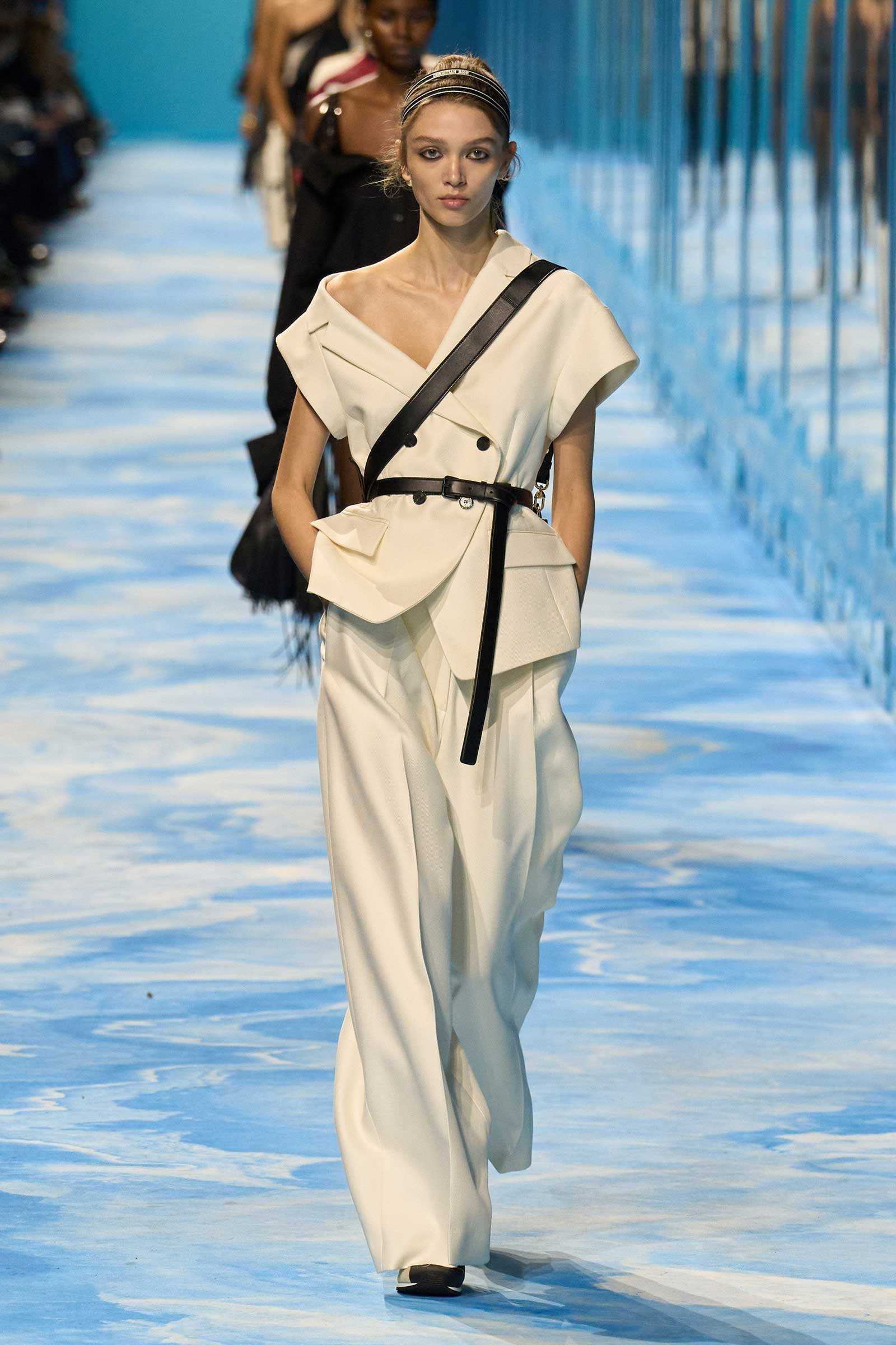 Representations of all of them were pinned to Chiuri’s moodboard in the Dior studio, along with an autumn 1951 look, with suggestions of formal riding attire, that Christian Dior dubbed the Amazone. Chiuri was making links between ancient Greece’s peplos, a simple draped garment she’s often referenced, and the house founder’s rigorous tailoring. The connective tissue was the slicing diagonal lines suggestive of movement and agility, qualities that have not often been connected with the idea of womanhood and femininity.