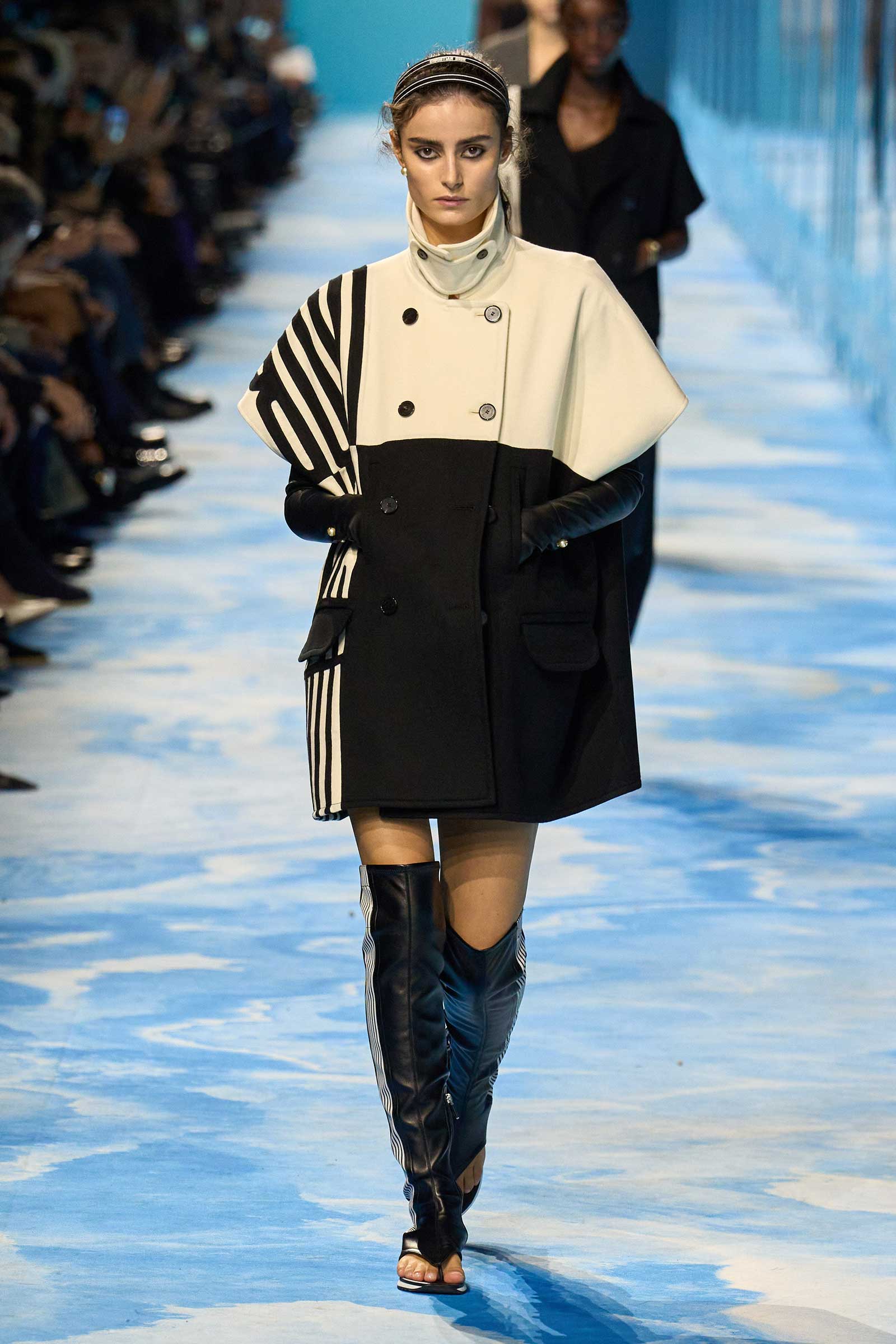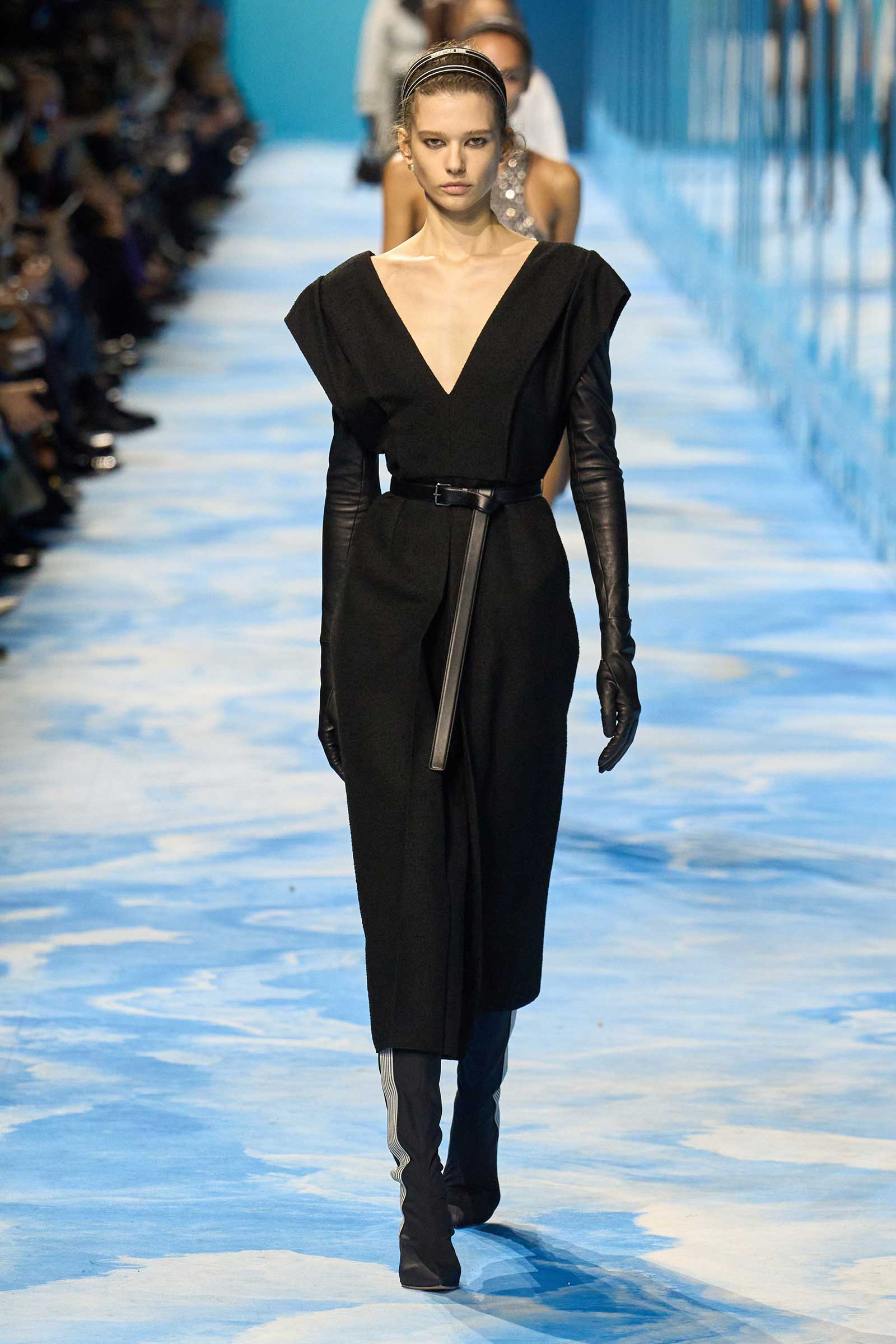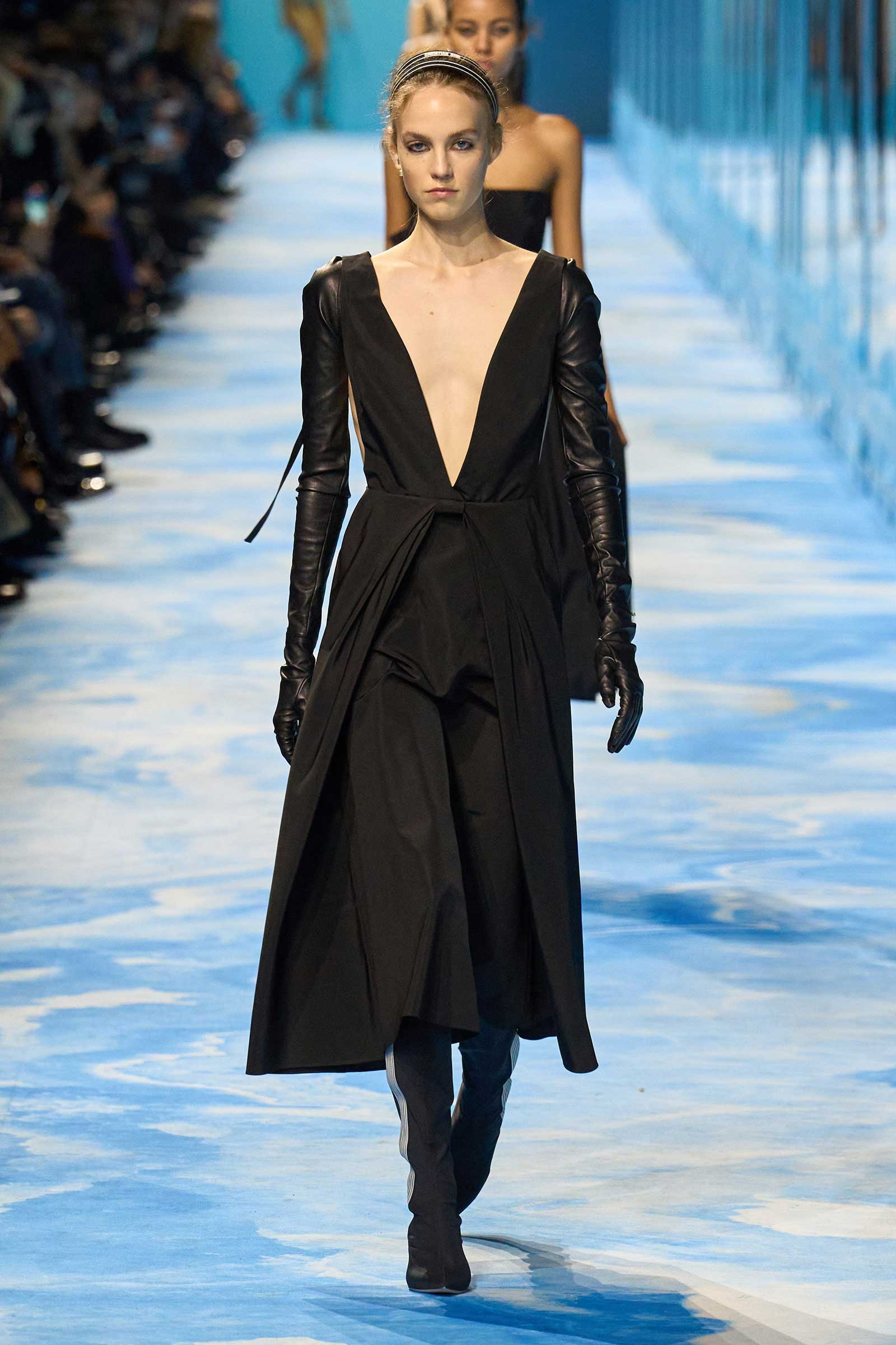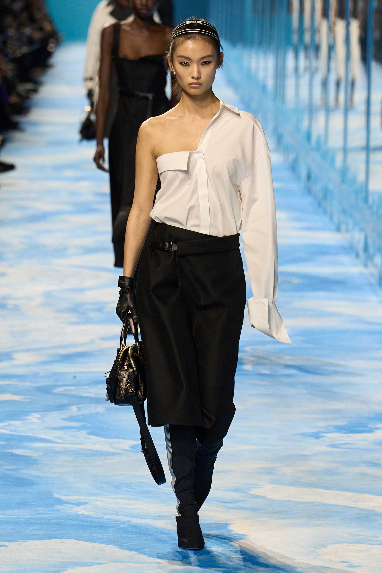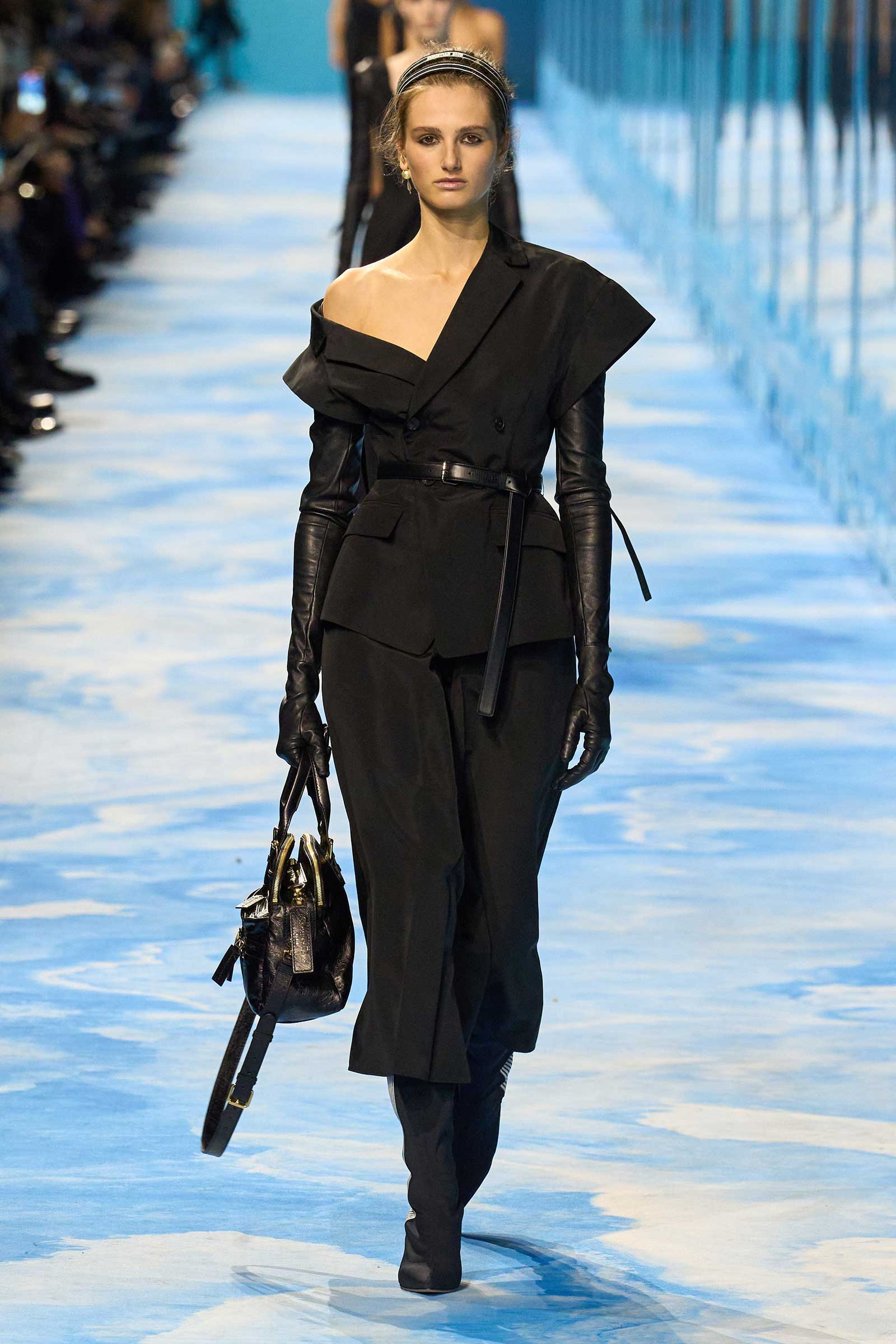 Accenting the collection’s more traditional ready-to-wear was a circa 1970-’71 graphic Dior logo. With its exaggerated vertical lines, somehow evocative of a movie title sequence, it conveyed aerodynamism and speed. The same goes for the jackets and shirts that were cut to fall off of one shoulder, with the added element of sexual allure. Some of these shoulder-exposing jackets and shirts were accessorized with gauntlet gloves that inched past the elbows to almost the shoulders, a look lifted—believe it or not—from a 1949 Dior show.