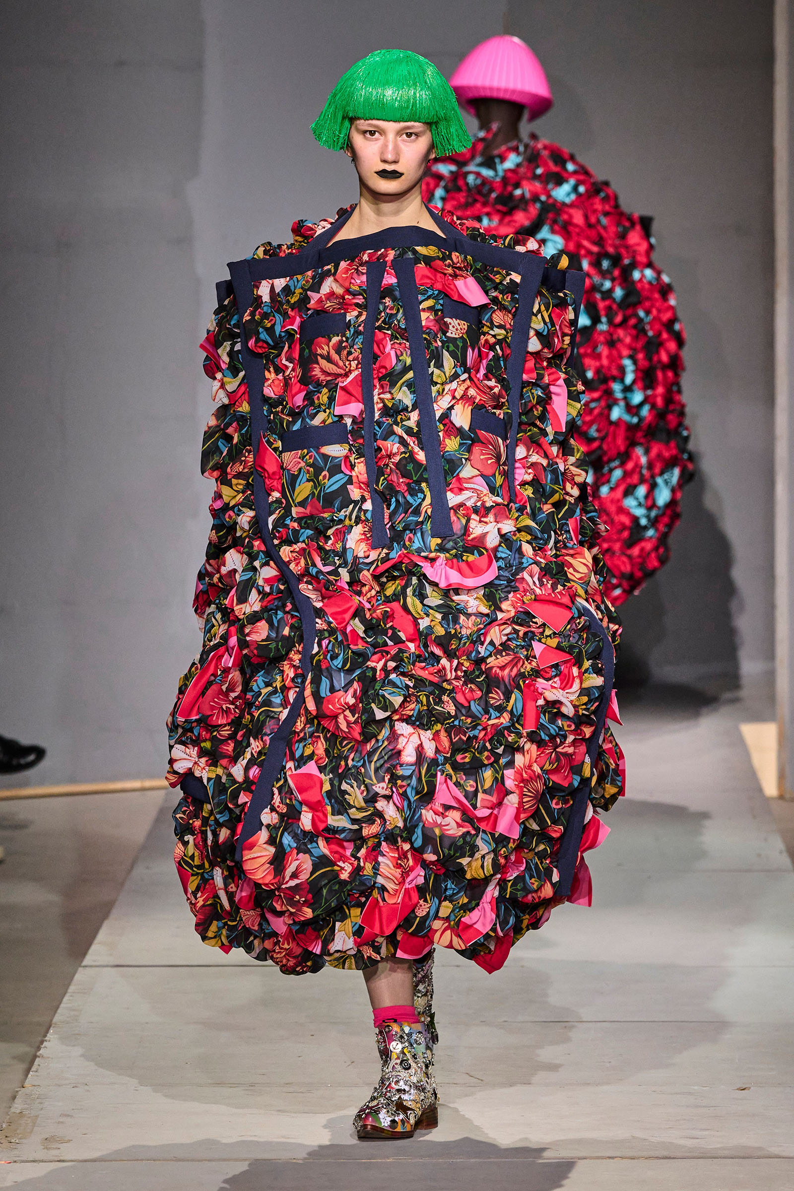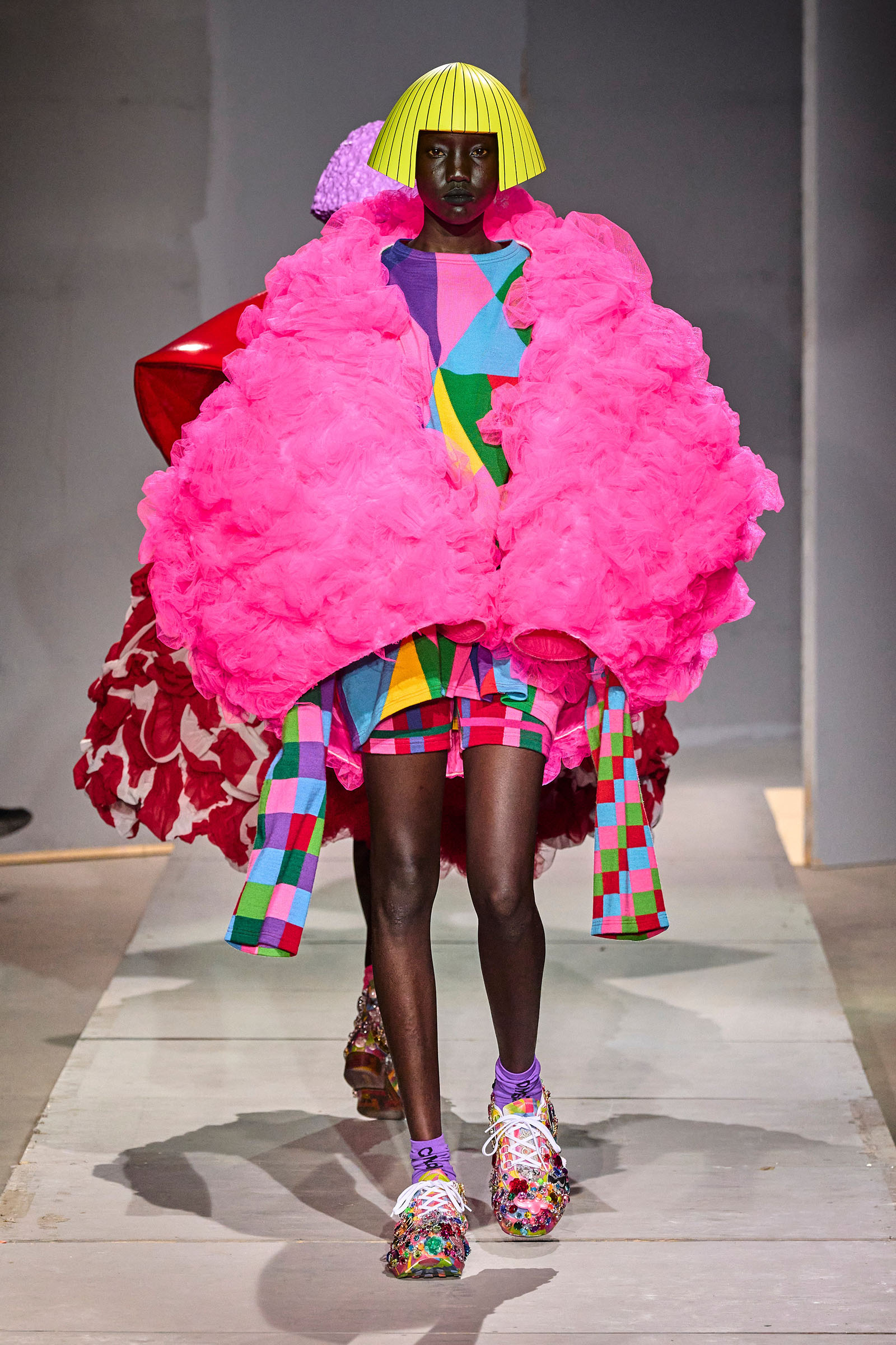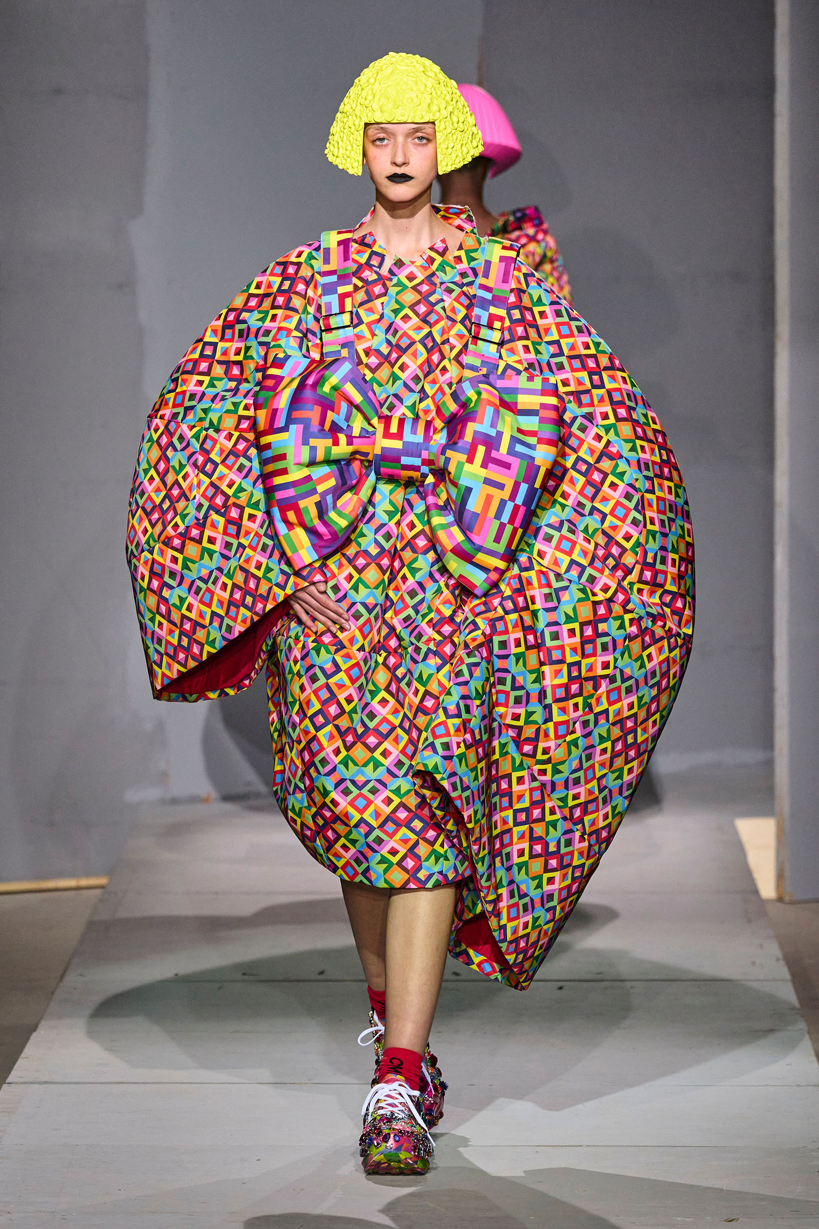 Playfulness and a sense of humor? These aren’t qualities that are often attributed to Kawakubo—or if they are, one’s always on guard for the catch. Visually, there didn’t seem to be one hidden among the bulky multicolored, bubbly fabric sculptures she sent out. There were neon graphics, tartan, Hawaiian hibiscus prints, and boots and trainers smothered with glittery stick-on gemstones. On the heads: plastic bob wigs in highlighter colors as if a child had drawn them. Or perhaps as a salute to Kawakubo’s great compatriot sister artist, Yayoi Kusama.