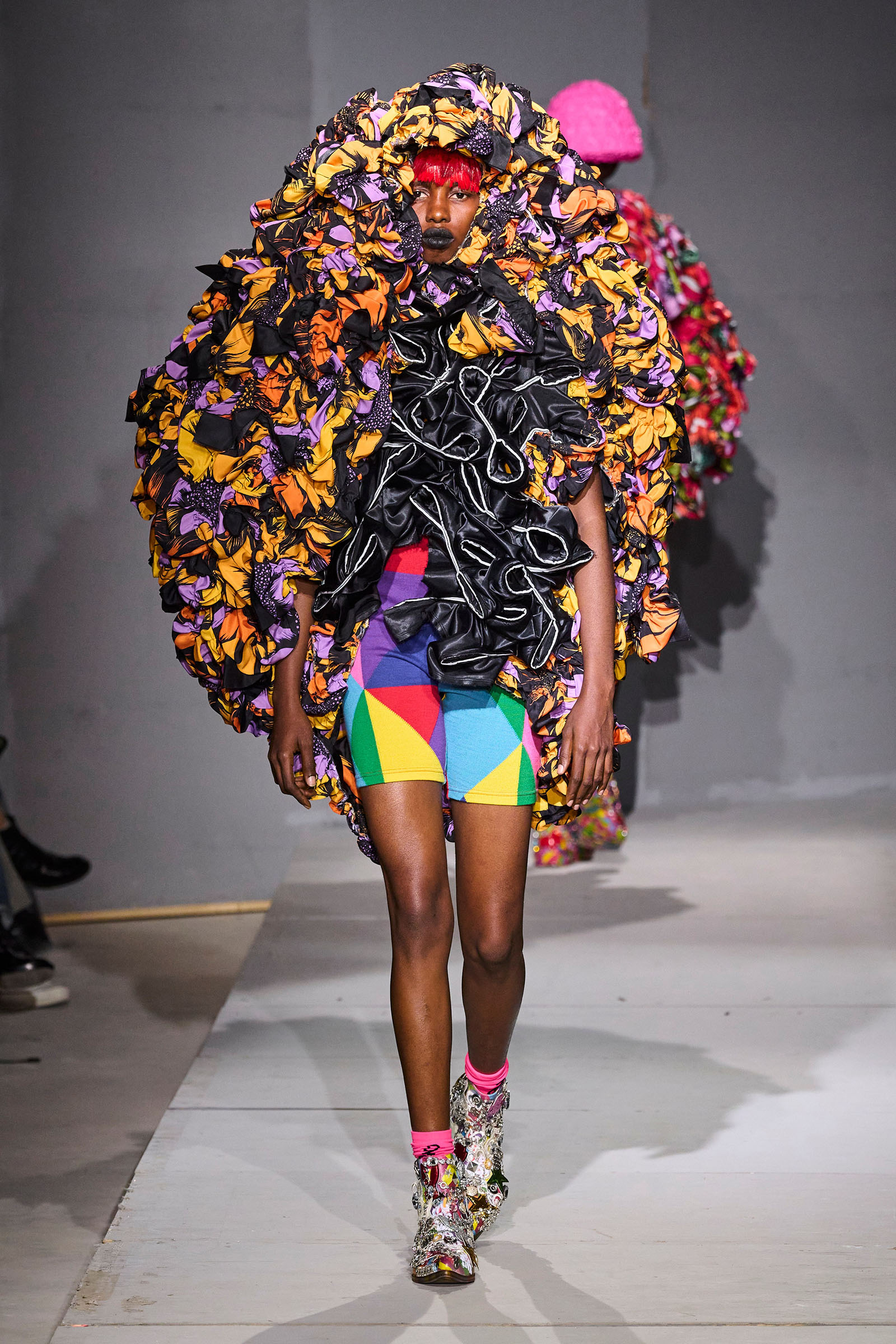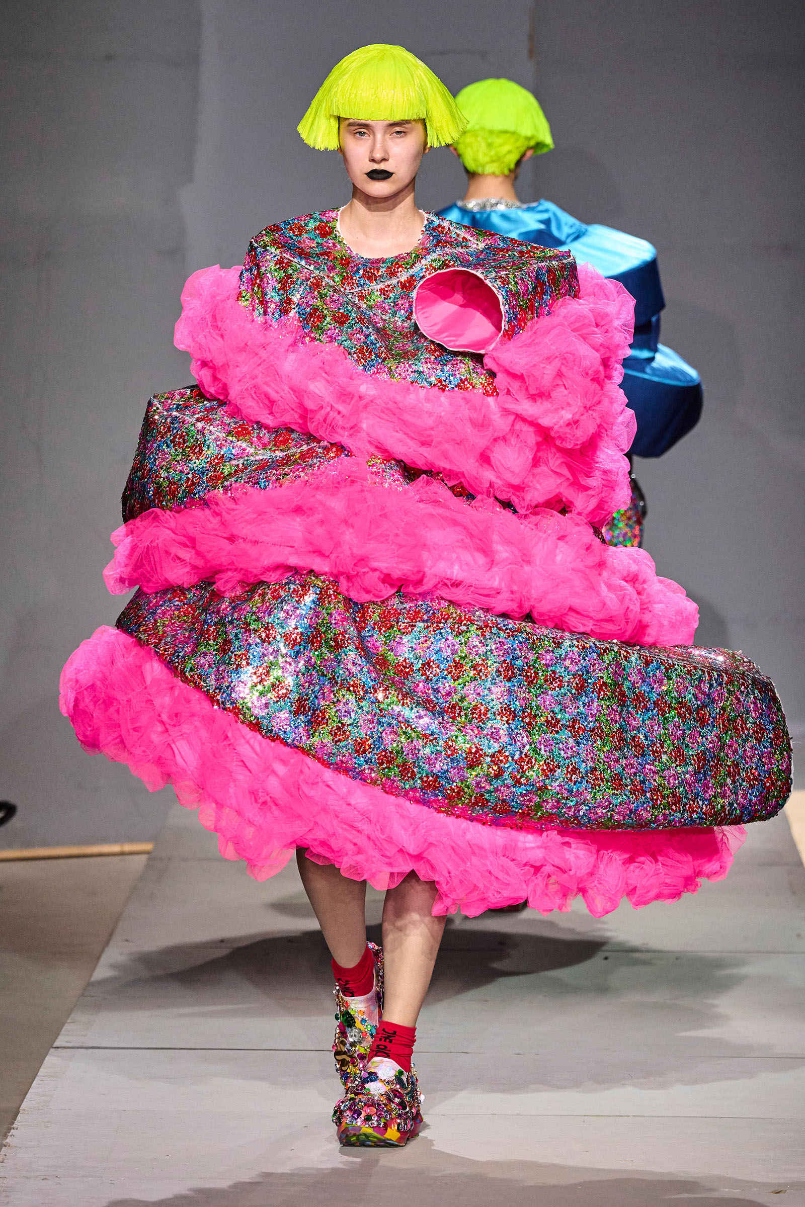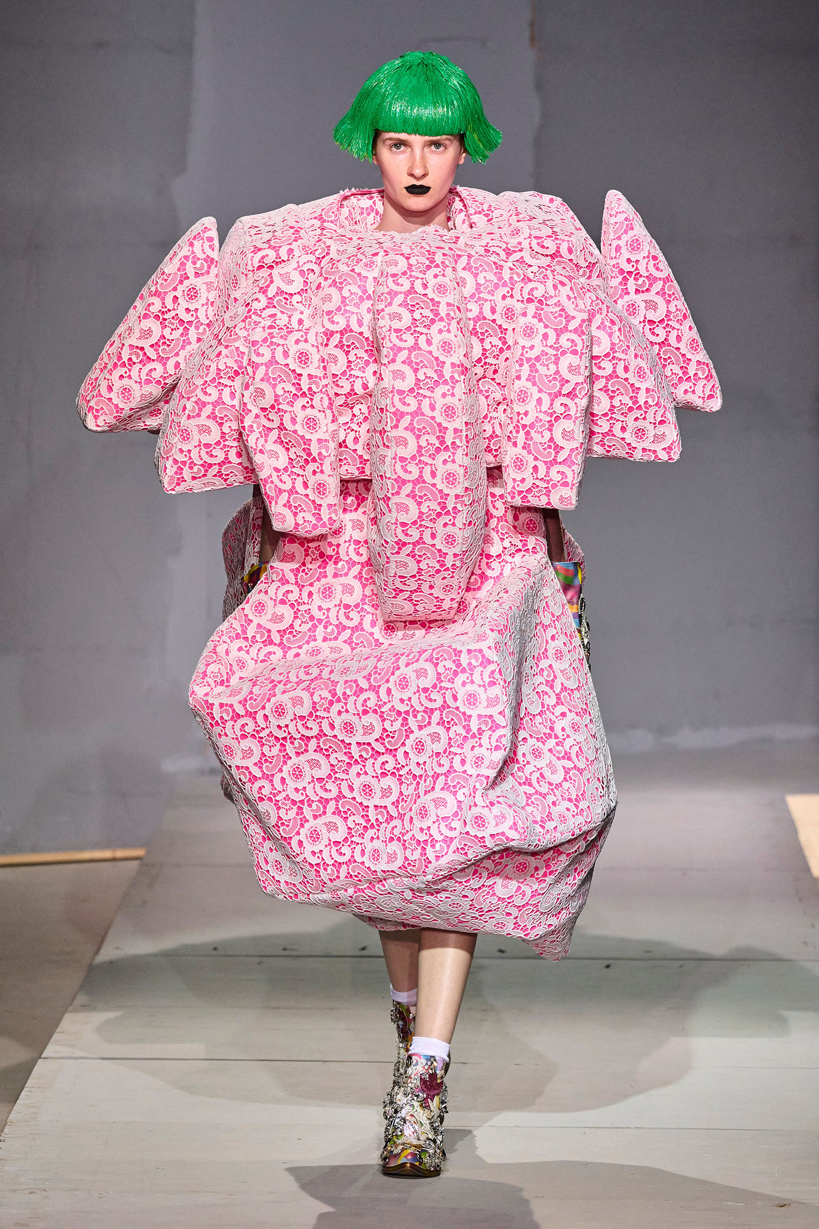 Playfulness and a sense of humor? These aren’t qualities that are often attributed to Kawakubo—or if they are, one’s always on guard for the catch. Visually, there didn’t seem to be one hidden among the bulky multicolored, bubbly fabric sculptures she sent out. There were neon graphics, tartan, Hawaiian hibiscus prints, and boots and trainers smothered with glittery stick-on gemstones. On the heads: plastic bob wigs in highlighter colors as if a child had drawn them. Or perhaps as a salute to Kawakubo’s great compatriot sister artist, Yayoi Kusama.