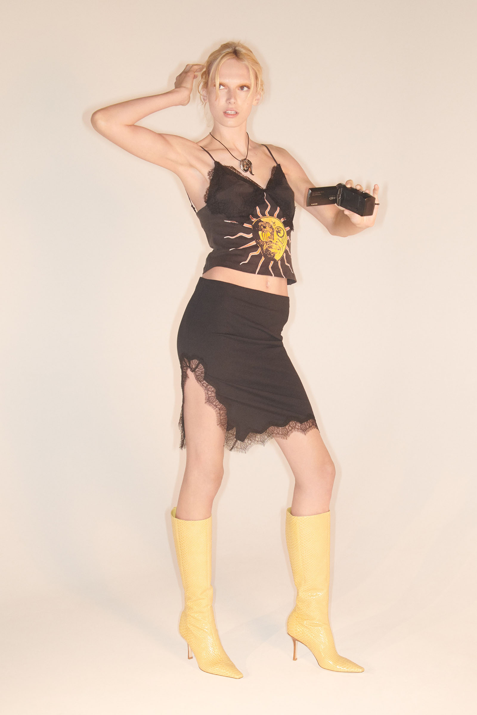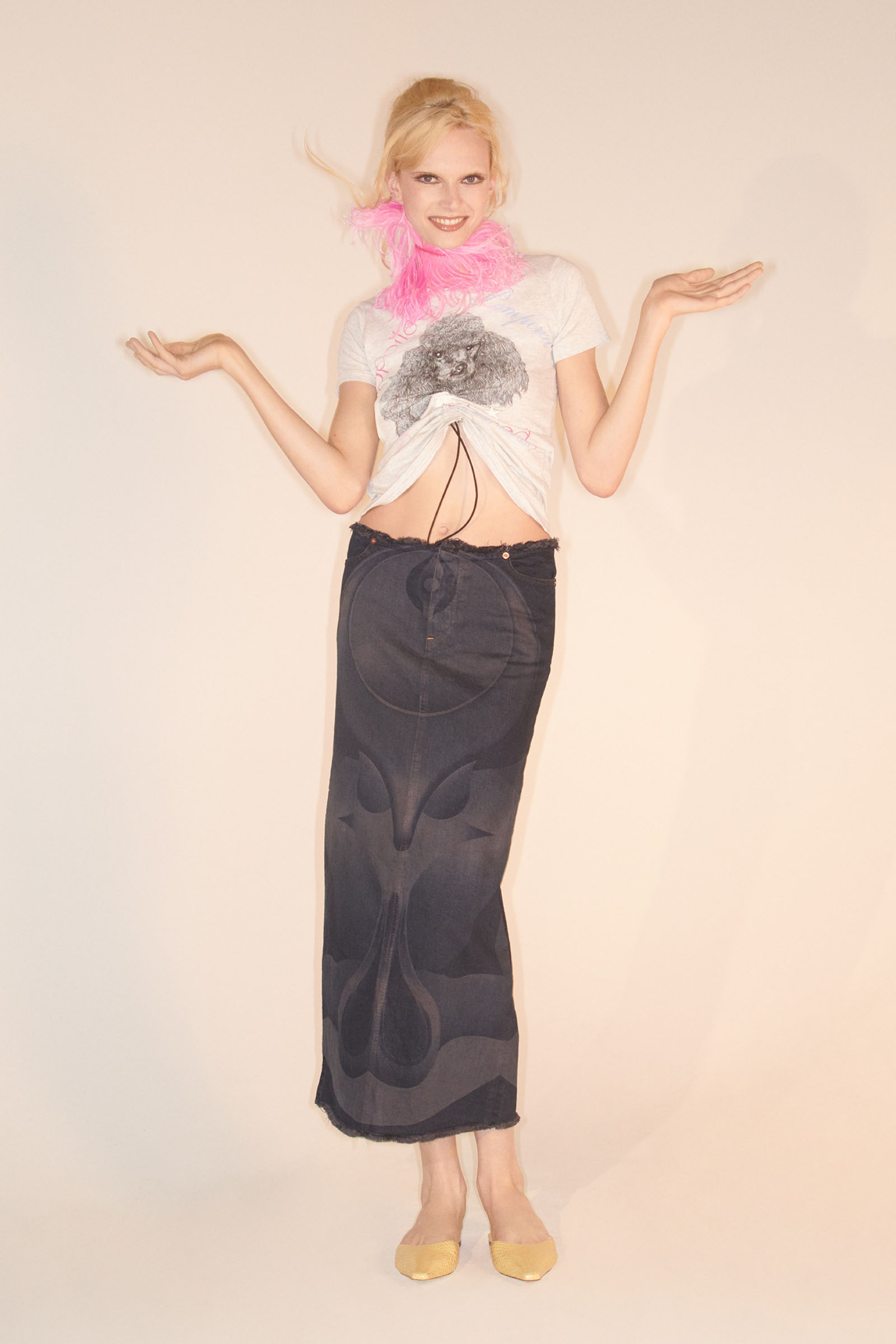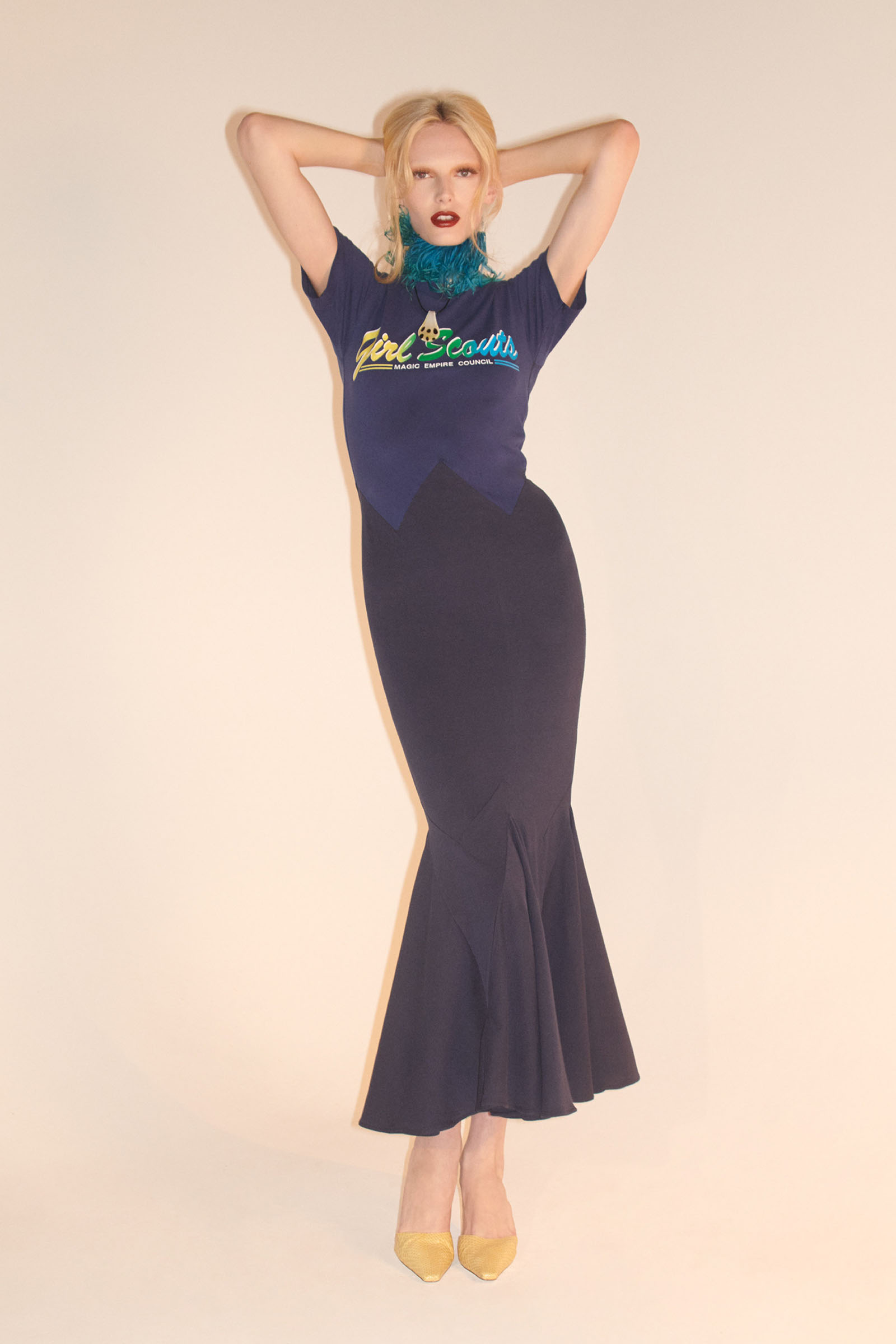So, then, to the clothes. In his signature spirit of character-driven styling, Ives’s lookbook—photographed by Johnny Dufort, and starring the TikTok-favorite model of the moment Alex Consani—began with one of his “archetypes,” a T-shirt and skirt decorated with a swan motif as an ode to Natalie Portman’s doomed ballerina in Black Swan. Once again, there was plenty of fun to be had identifying the various figures he was paying homage to, from Charlotte York to Carmela Soprano to the English soccer WAGs Coleen Rooney and Rebekah Vardy in a shirred sports tee. (Another favorite was the “woo!” girl—in Ives’s words, “it’s her birthday, she’s having drinks with the girls, and she’s gonna scream ‘woo!’ intermittently throughout the entire evening.”)
