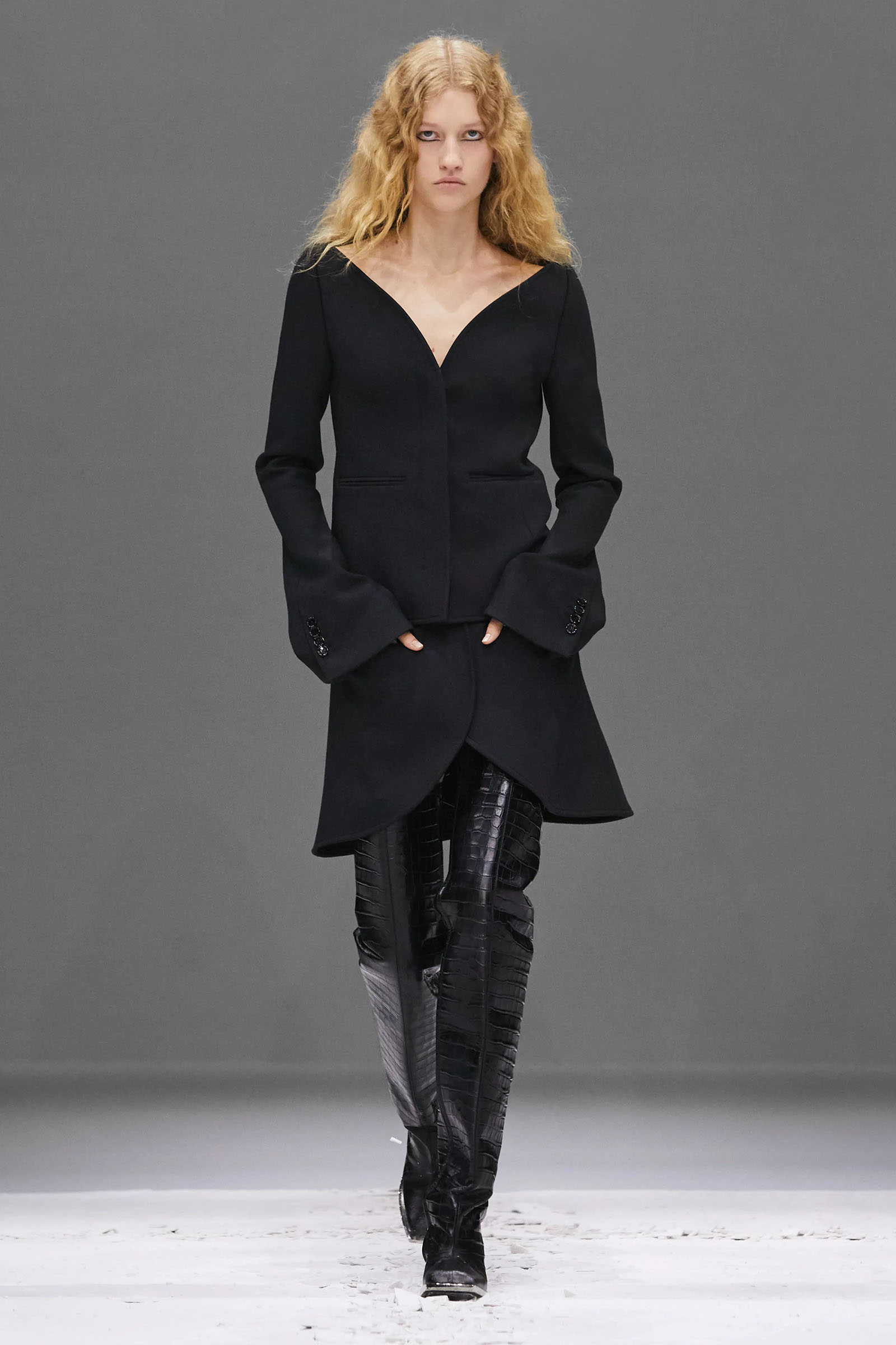 Then, funnily enough, the ground literally did move. As the models stalked the perimeter of a flat, sand-and-plaster quadrangle—Di Felice’s ‘desert’—the surface began to pop and crack before our eyes. A seismic fashion happening? If there’s a quake of significant talent on the way, Di Felice is clearly in its vanguard.