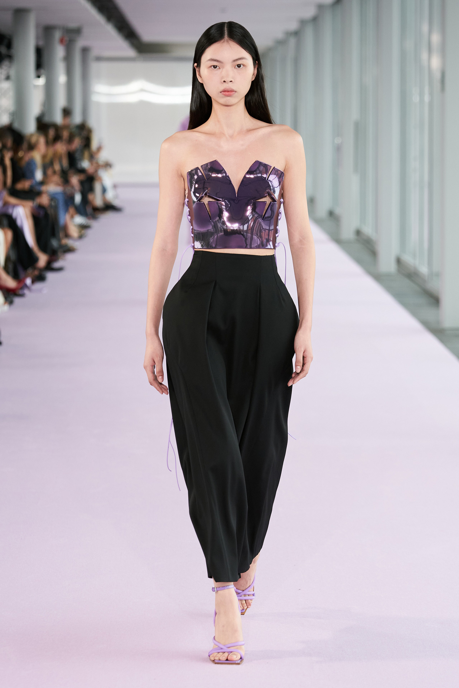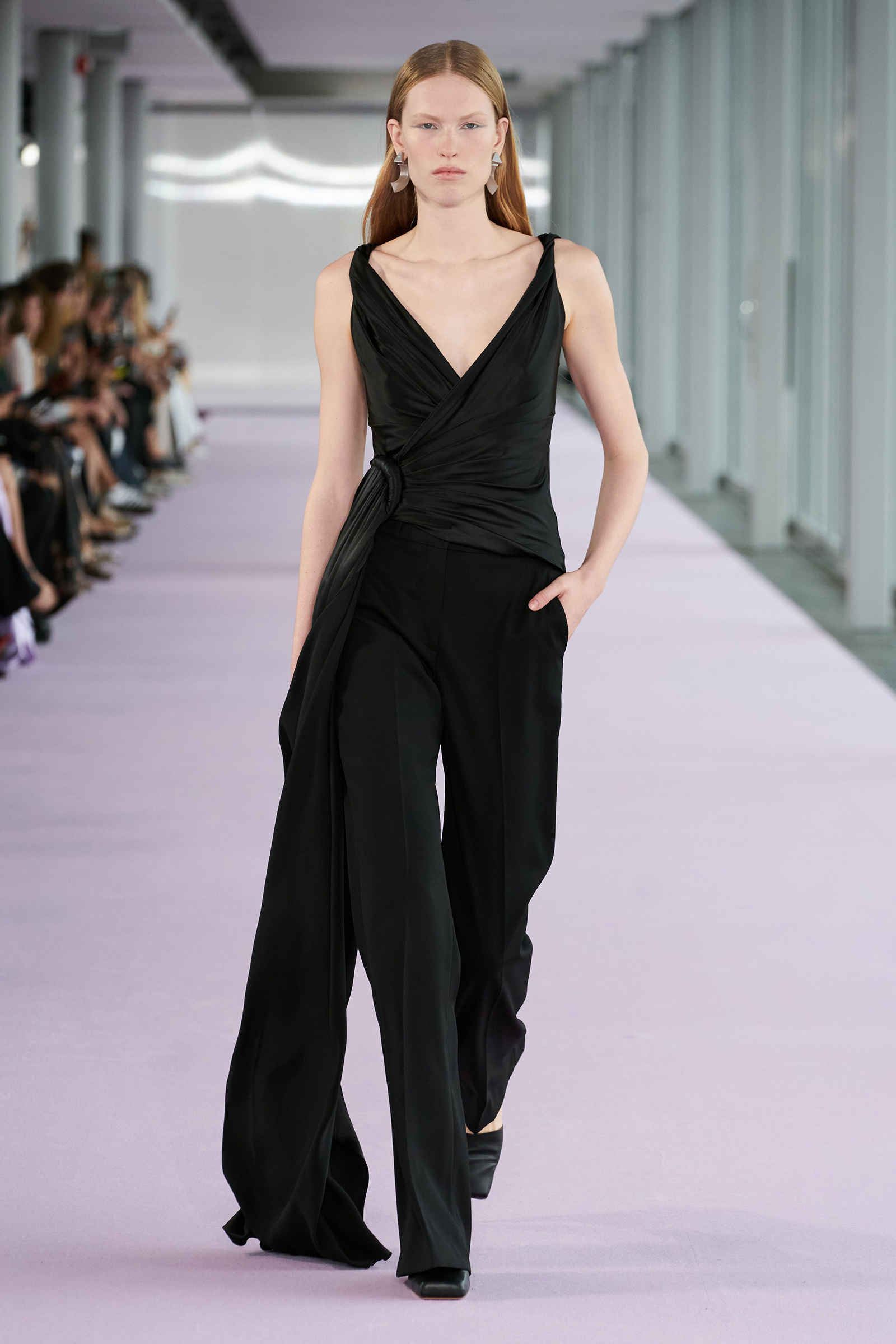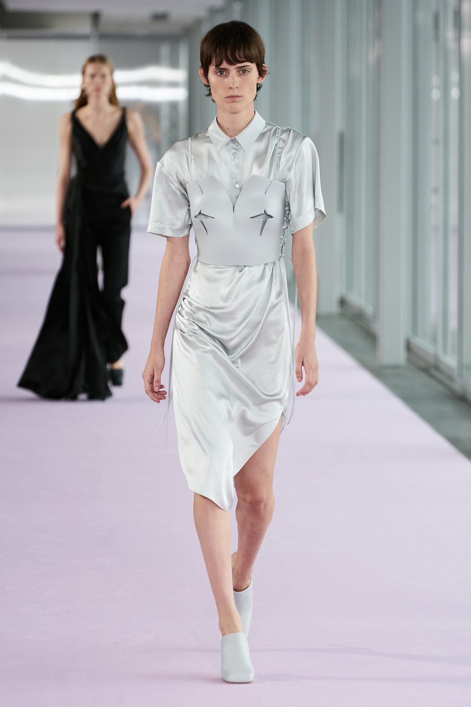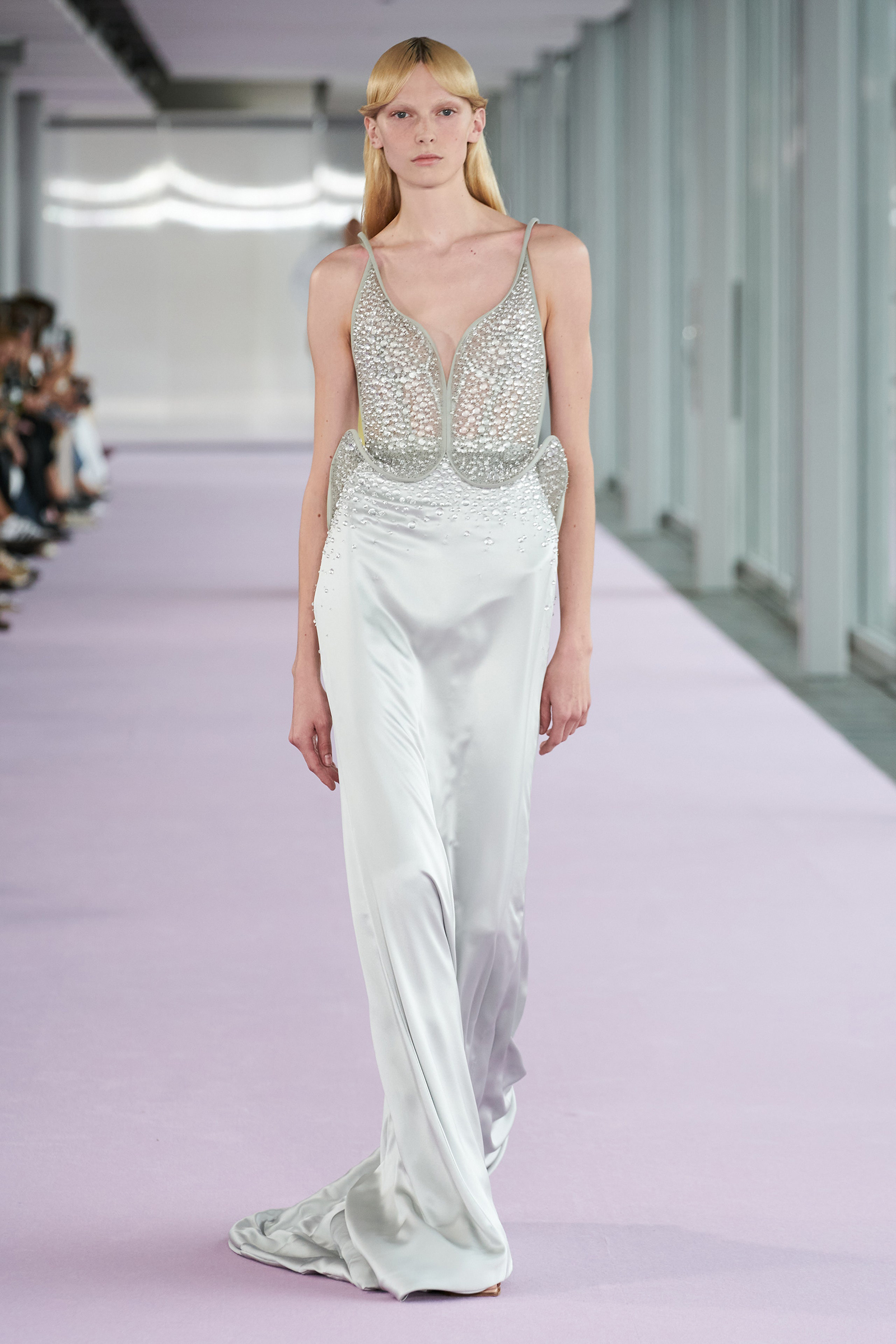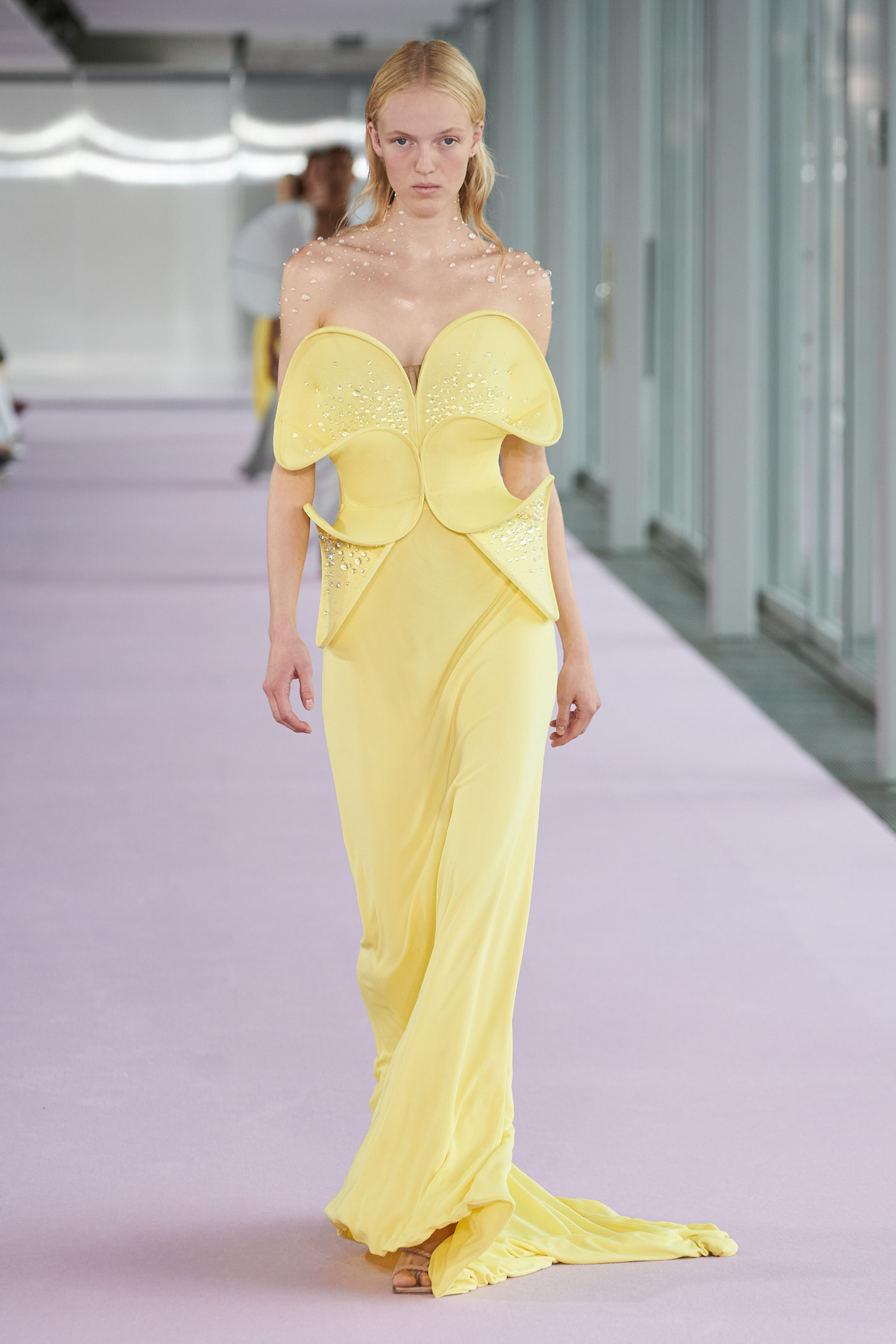 Playing on the same organic/sculptural dissonance, pointy corseted bustiers were lacquered in a lustrous black glow, made with the same technique that gives Steinway pianofortes their patina, or were polished to achieve the chrome shine of race cars. They looked slightly dangerous, like poisonous blooms sprouting from liquid long skirts. On a less disquieting note, draped dresses in flimsy jersey highlighted Del Core’s skilled understanding of the intricacies of fluid construction, which he honed worked alongside Alessandro Michele on special pieces for a coterie of celebrities. This is an arena where he feels comfortable: his loyal following of megastars—Florence Welch, Beyoncé, Björk, Anya Taylor-Joy—enjoys the theatricality of his designs.