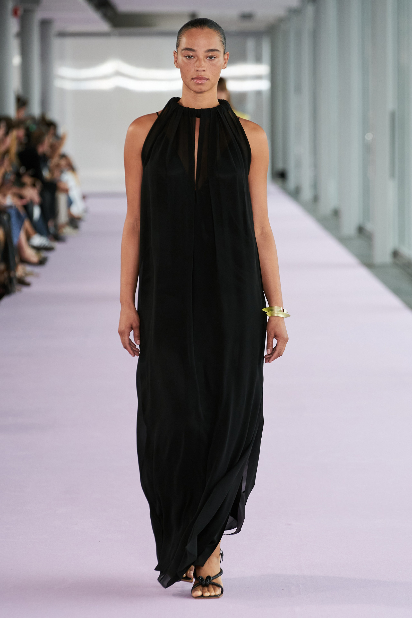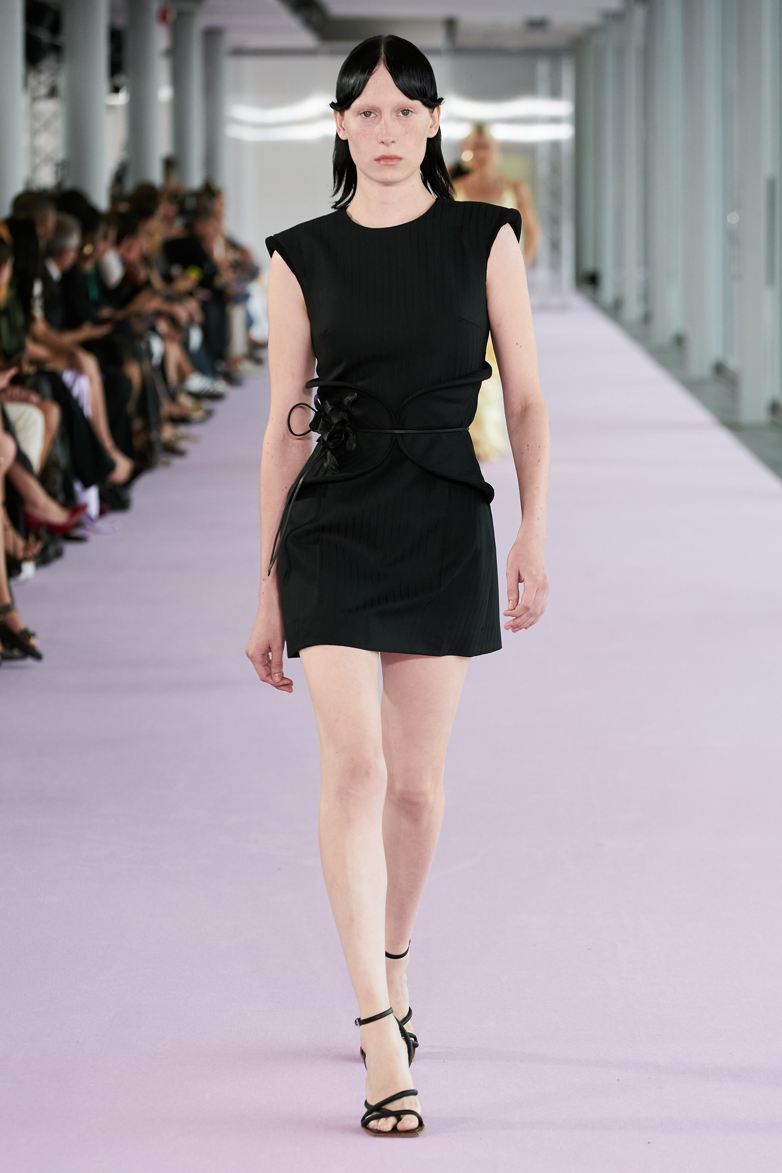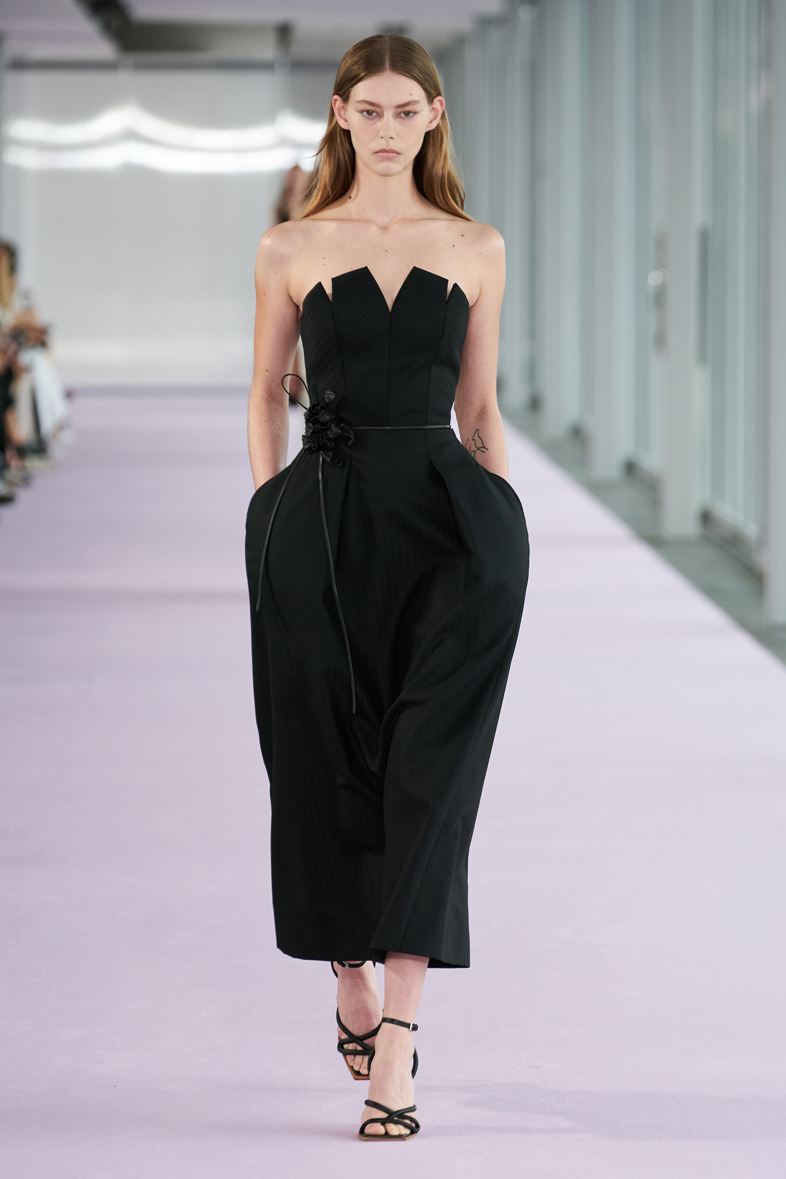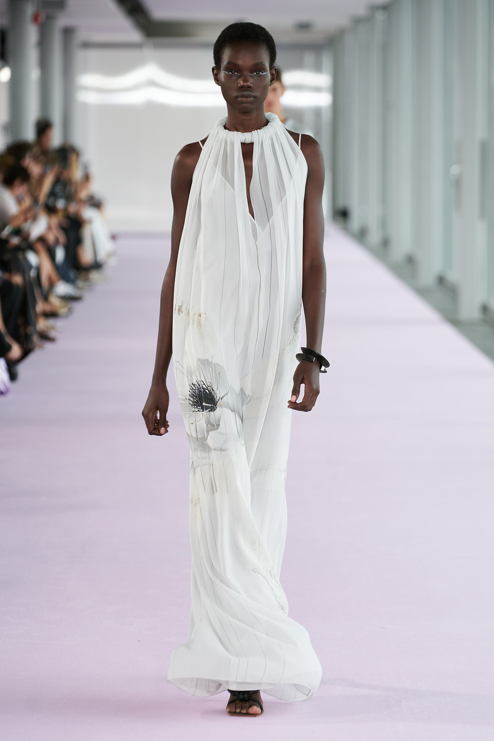 Playing on the same organic/sculptural dissonance, pointy corseted bustiers were lacquered in a lustrous black glow, made with the same technique that gives Steinway pianofortes their patina, or were polished to achieve the chrome shine of race cars. They looked slightly dangerous, like poisonous blooms sprouting from liquid long skirts. On a less disquieting note, draped dresses in flimsy jersey highlighted Del Core’s skilled understanding of the intricacies of fluid construction, which he honed worked alongside Alessandro Michele on special pieces for a coterie of celebrities. This is an arena where he feels comfortable: his loyal following of megastars—Florence Welch, Beyoncé, Björk, Anya Taylor-Joy—enjoys the theatricality of his designs.